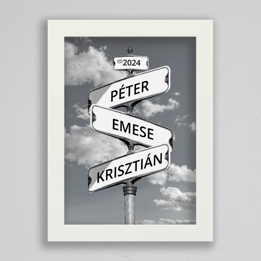Utcanévtábla stílusú fotó kollázs családoknak 3-5 névvel - többféle háttérrel