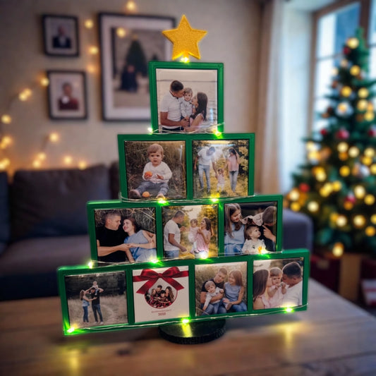 Egyedi fényképes 10 db-os hűtőmágnes csomag 3D-s karácsonyfa tartóval + tündérfénnyel (5×5 cm saját fotóval)