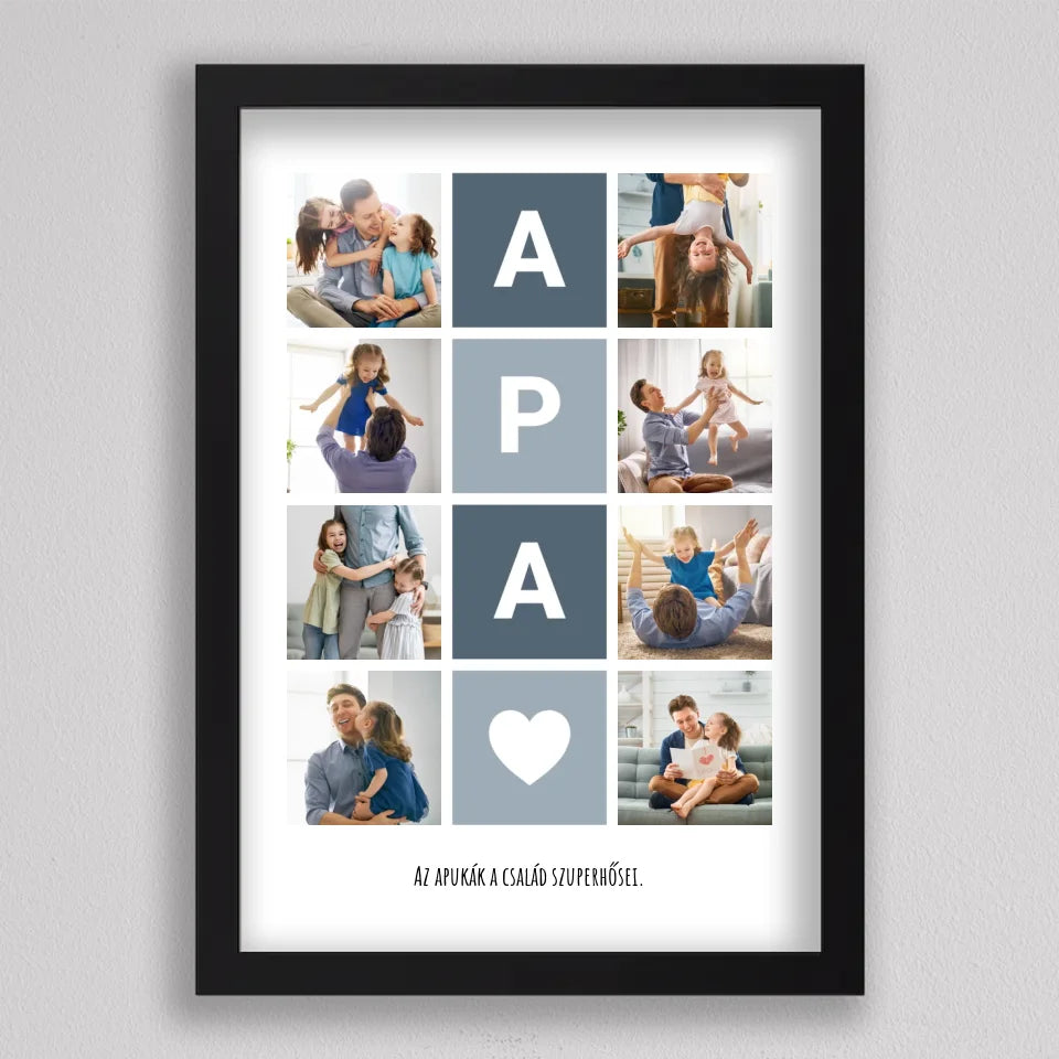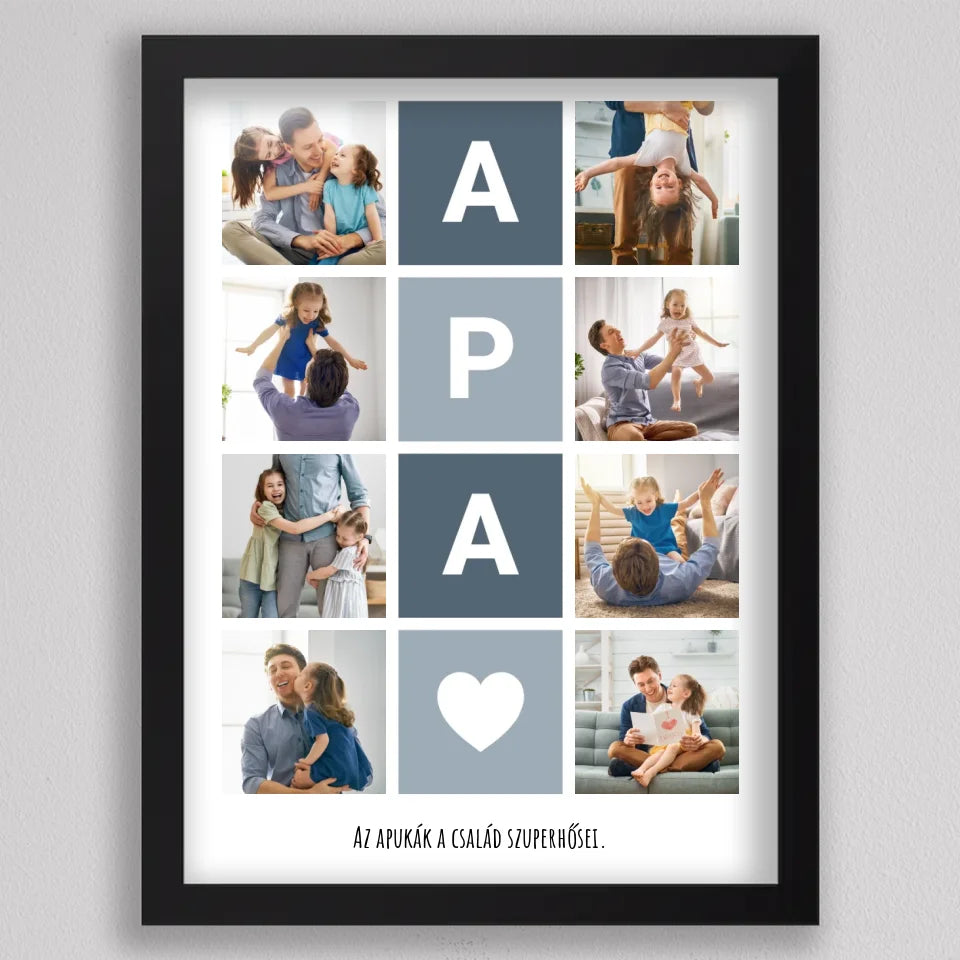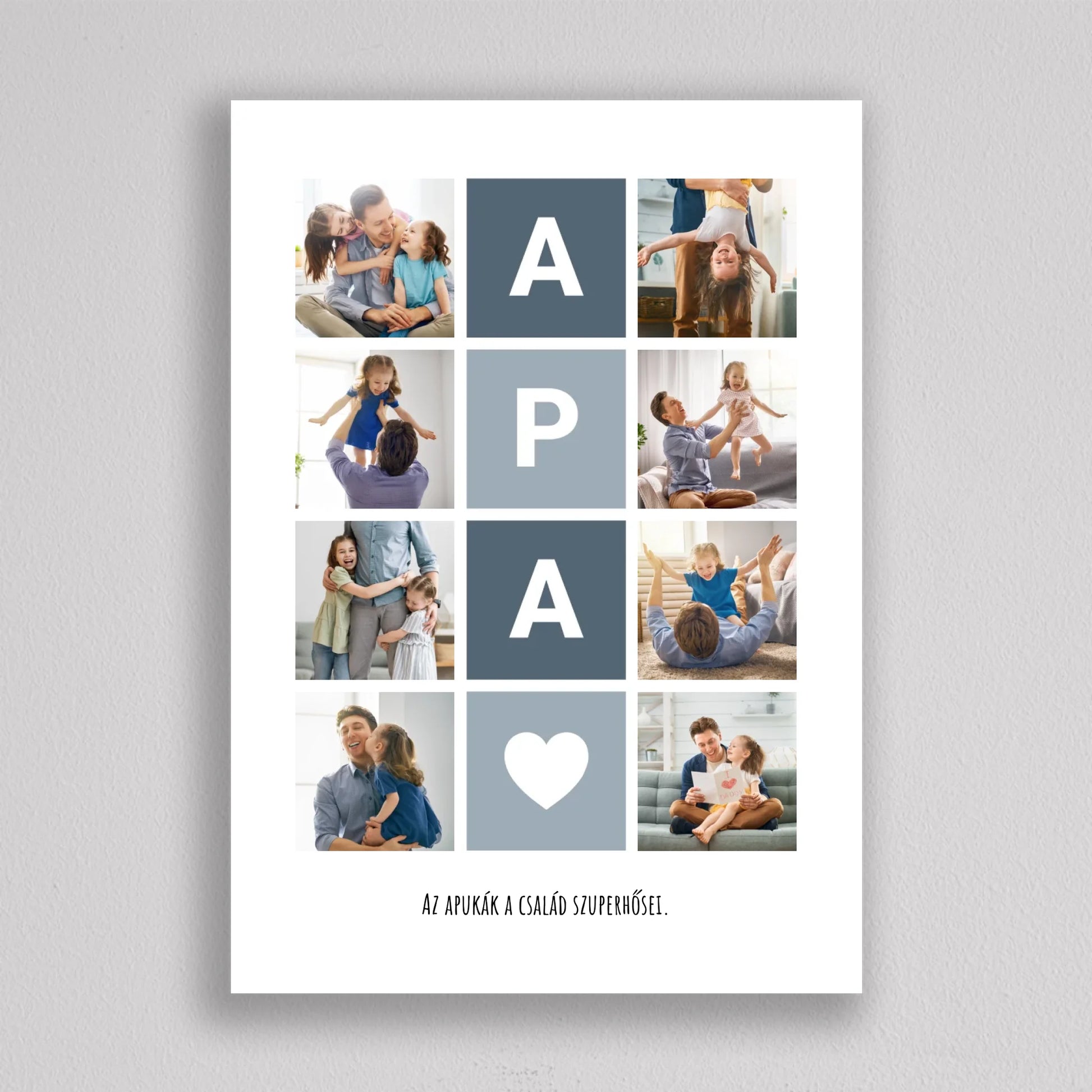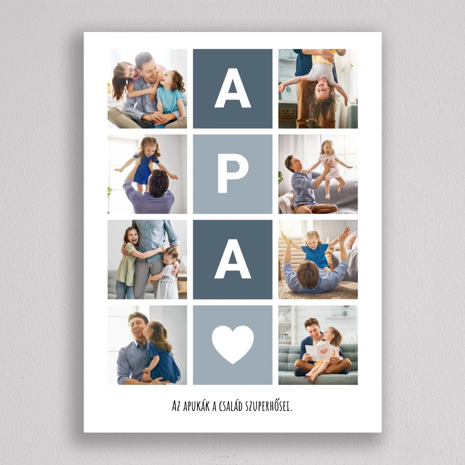 Az APA kedvenc pillanatai fotó kollázs tökéletes ajándék az apukáknak, akik minden nap a család igazi szuperhősei. Ez a személyre szabható fotó kollázs kiválóan alkalmas arra, hogy a legkedvesebb családi emlékeket egyetlen keretbe foglalva őrizzük meg. A modern, letisztult dizájn és a gondosan válogatott képek együttese egyedi ajándékká teszi, amely bármely otthonban jól mutat. Az apa szó egyszerű, mégis erőteljes megjelenítése és a képek elrendezése hangsúlyozza a család fontosságát, és örök emléket állít az apai szeretetnek. Tedd még személyesebbé a kollázst a saját fotóiddal és szövegeiddel!