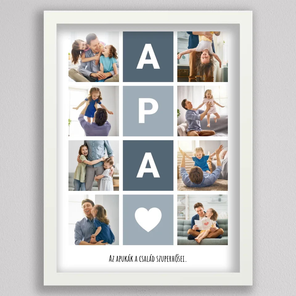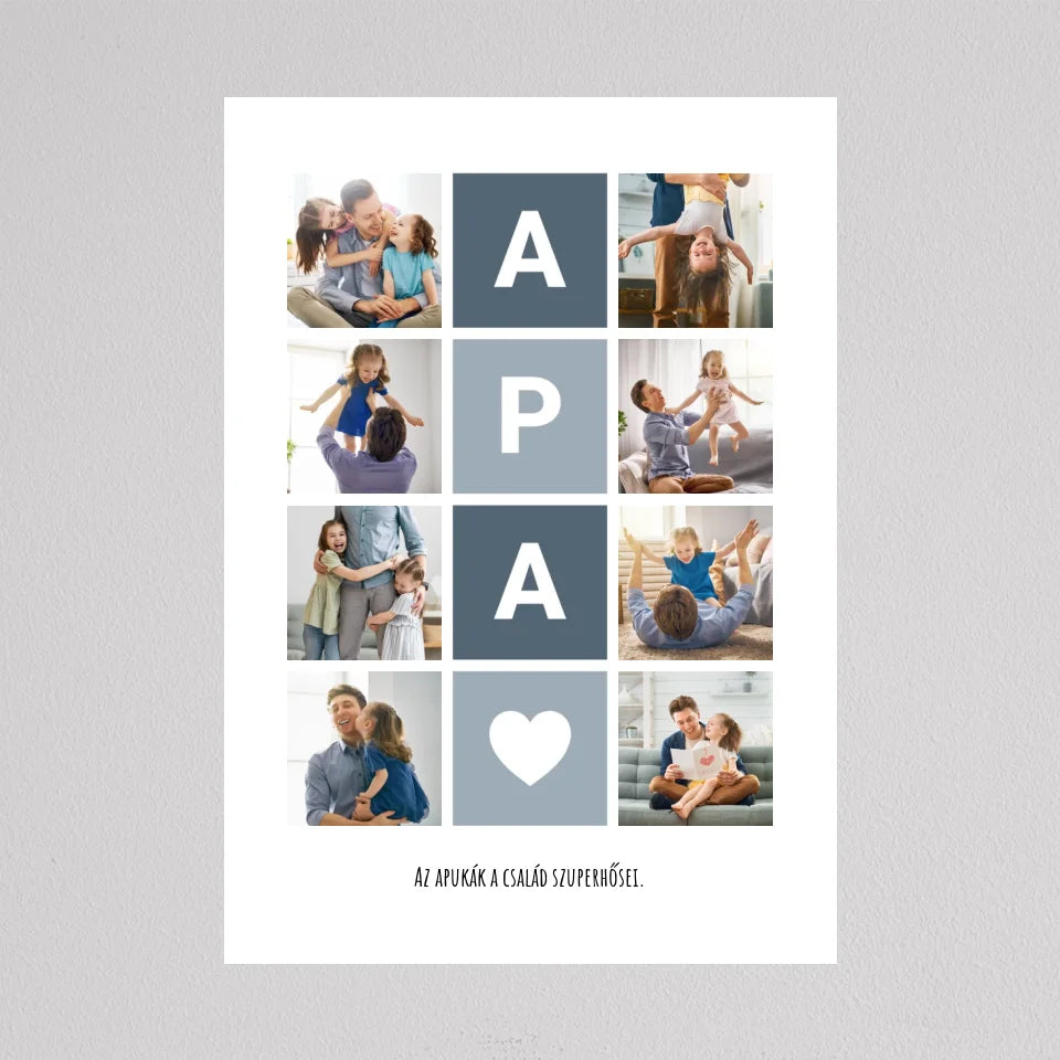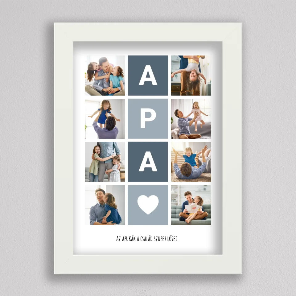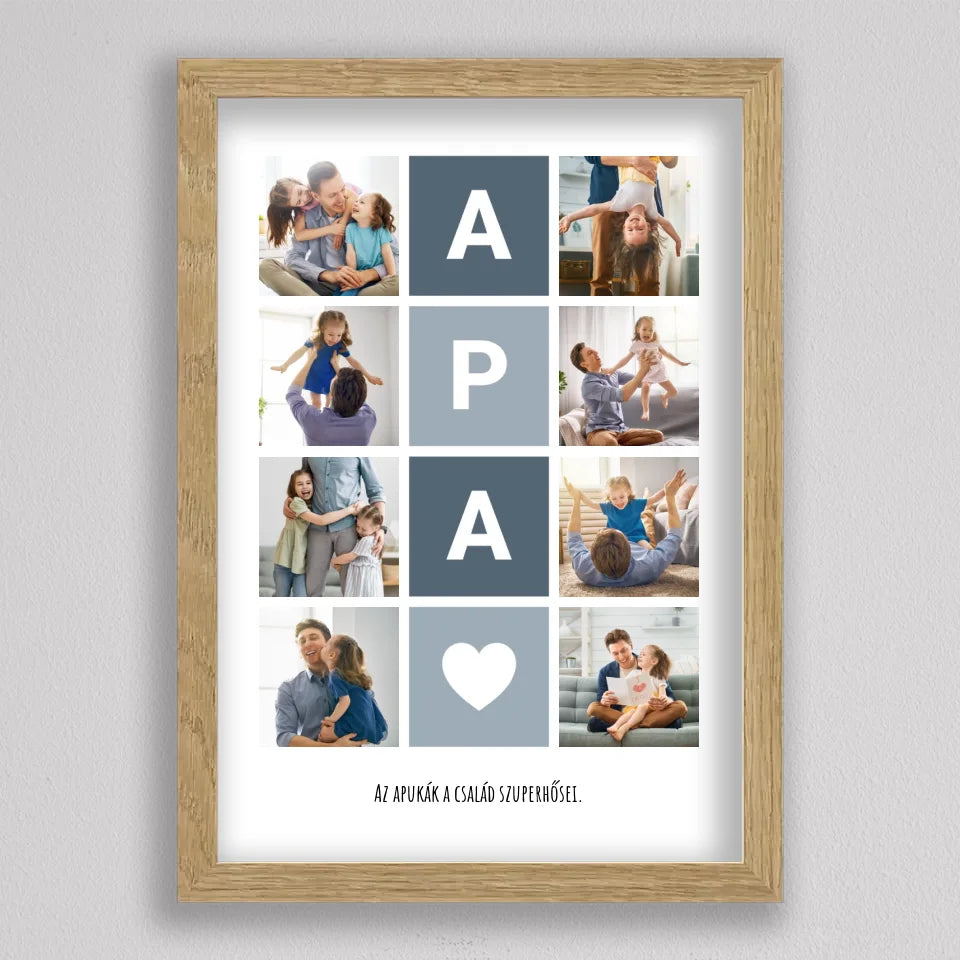 Az APA kedvenc pillanatai fotó kollázs tökéletes ajándék az apukáknak, akik minden nap a család igazi szuperhősei. Ez a személyre szabható fotó kollázs kiválóan alkalmas arra, hogy a legkedvesebb családi emlékeket egyetlen keretbe foglalva őrizzük meg. A modern, letisztult dizájn és a gondosan válogatott képek együttese egyedi ajándékká teszi, amely bármely otthonban jól mutat. Az apa szó egyszerű, mégis erőteljes megjelenítése és a képek elrendezése hangsúlyozza a család fontosságát, és örök emléket állít az apai szeretetnek. Tedd még személyesebbé a kollázst a saját fotóiddal és szövegeiddel!