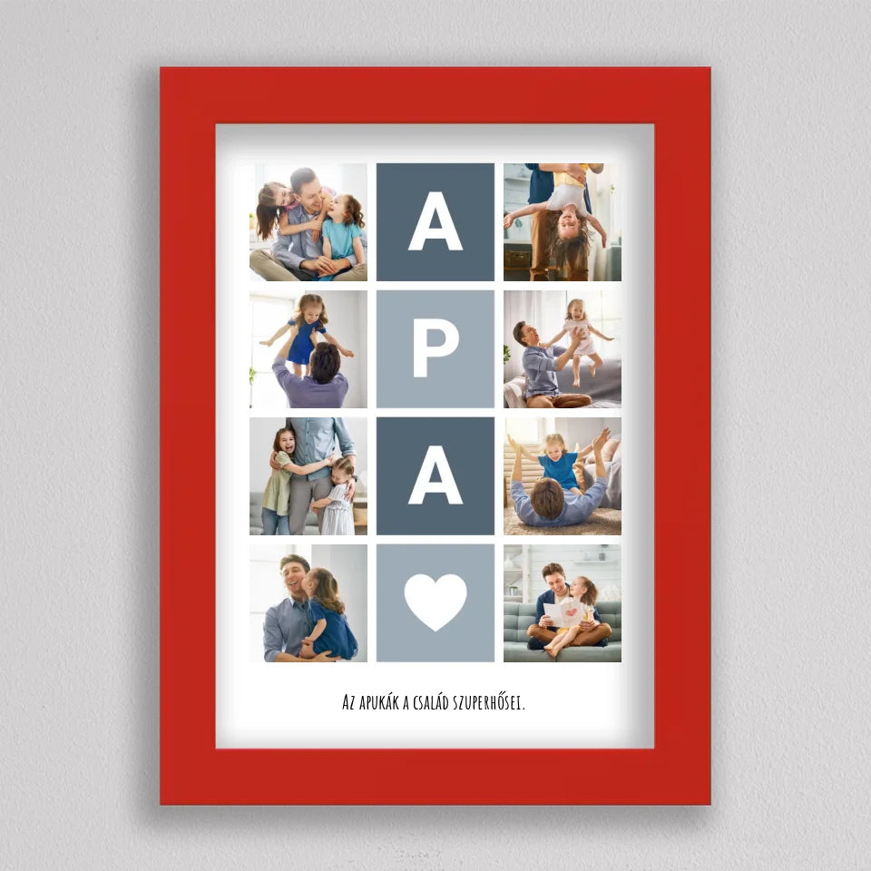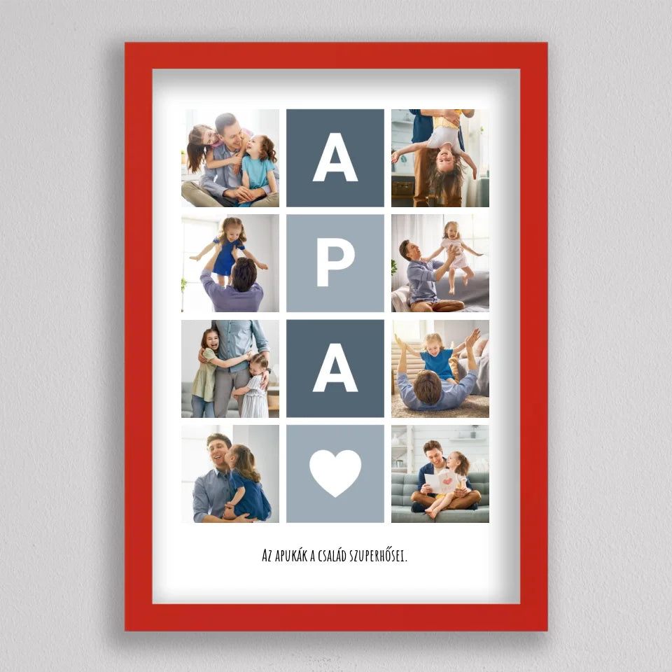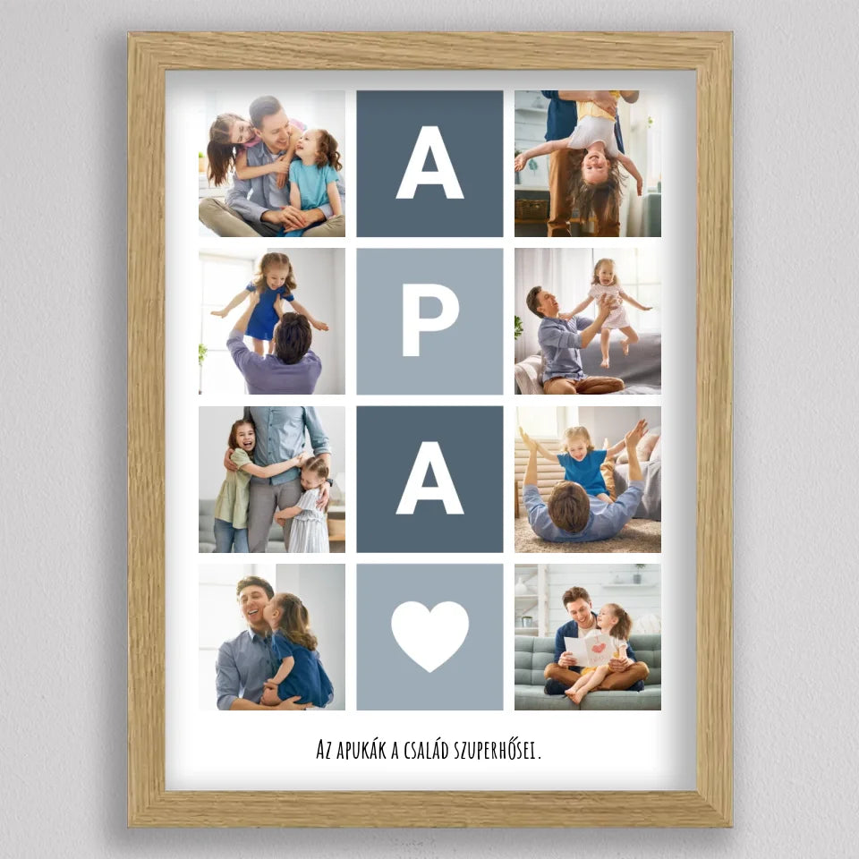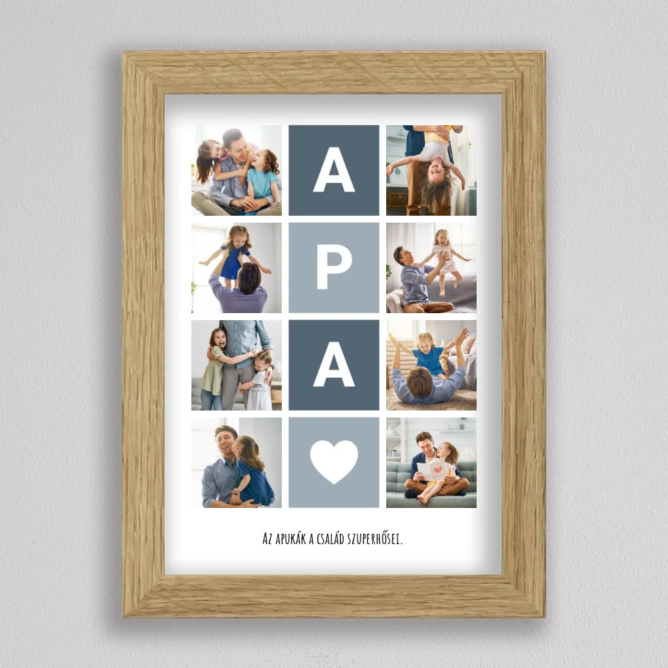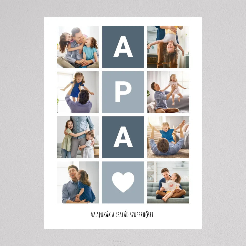 Az APA kedvenc pillanatai fotó kollázs tökéletes ajándék az apukáknak, akik minden nap a család igazi szuperhősei. Ez a személyre szabható fotó kollázs kiválóan alkalmas arra, hogy a legkedvesebb családi emlékeket egyetlen keretbe foglalva őrizzük meg. A modern, letisztult dizájn és a gondosan válogatott képek együttese egyedi ajándékká teszi, amely bármely otthonban jól mutat. Az apa szó egyszerű, mégis erőteljes megjelenítése és a képek elrendezése hangsúlyozza a család fontosságát, és örök emléket állít az apai szeretetnek. Tedd még személyesebbé a kollázst a saját fotóiddal és szövegeiddel!
