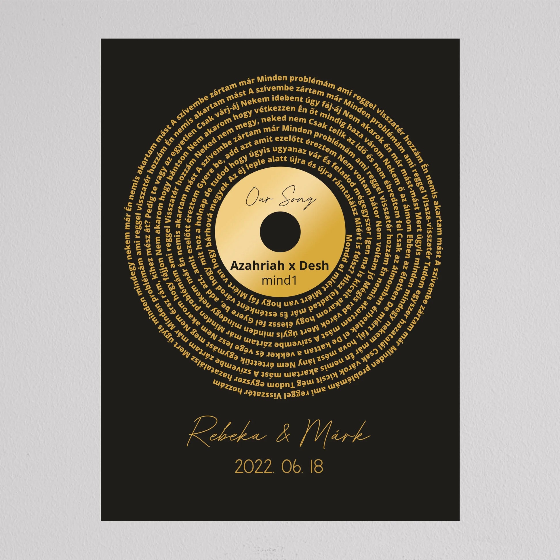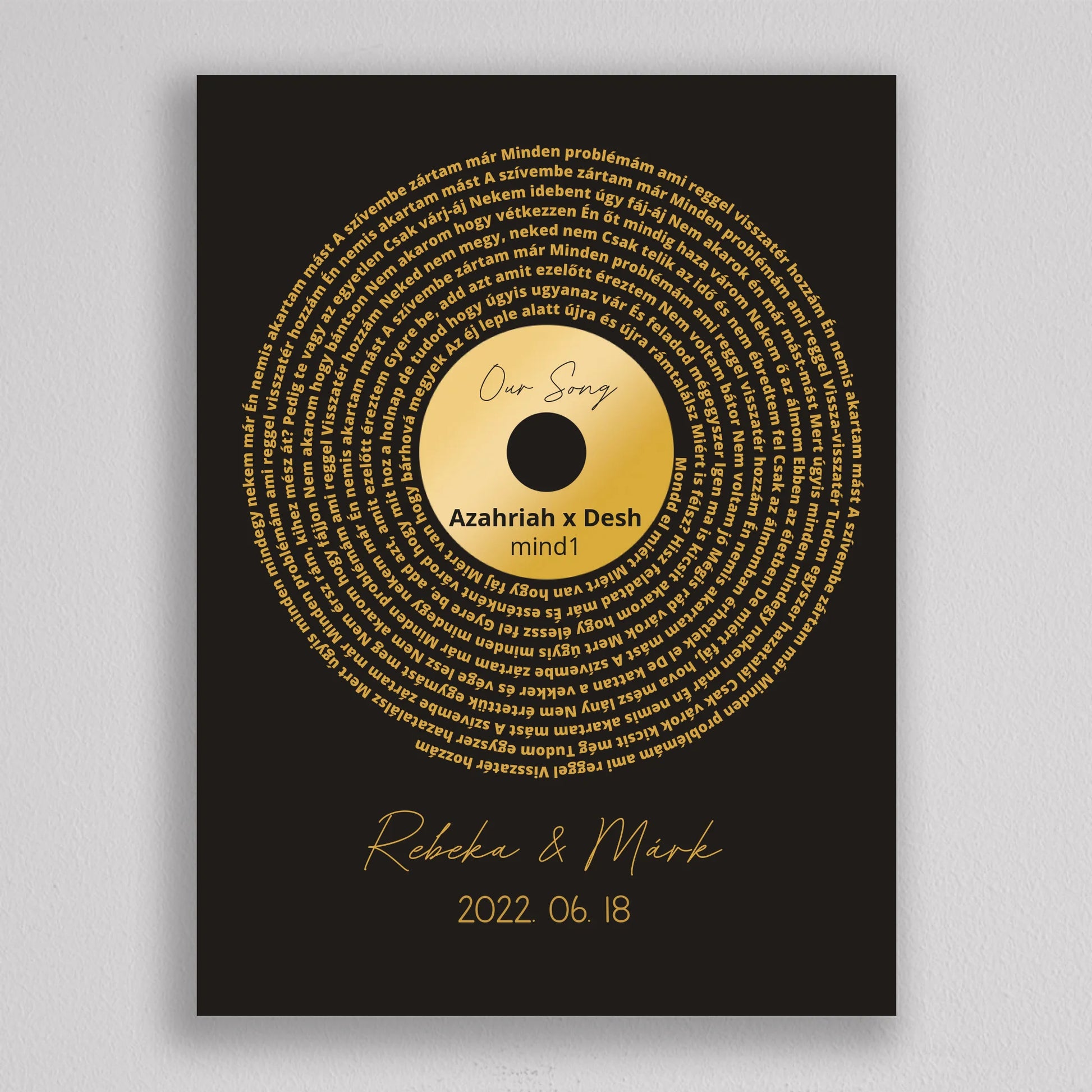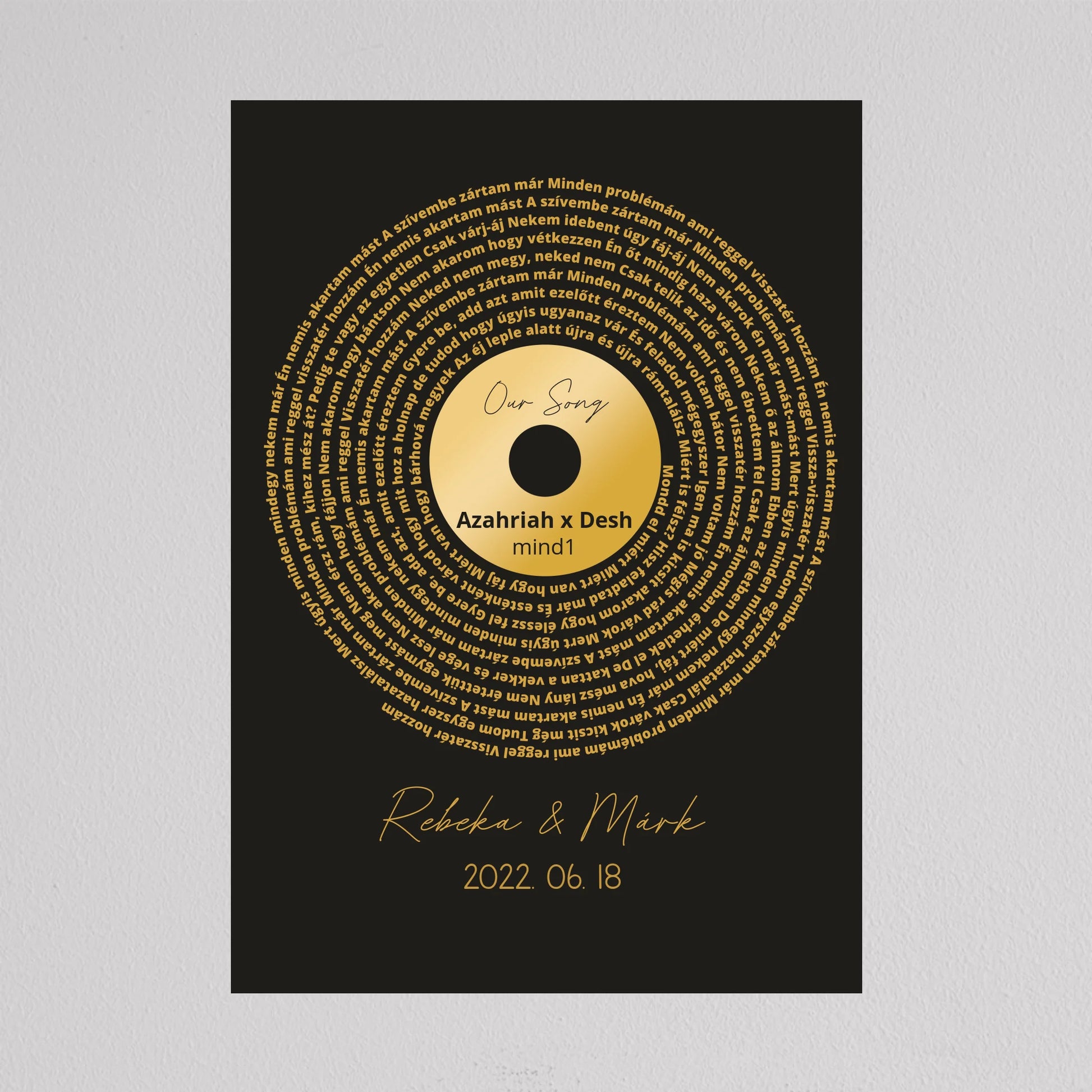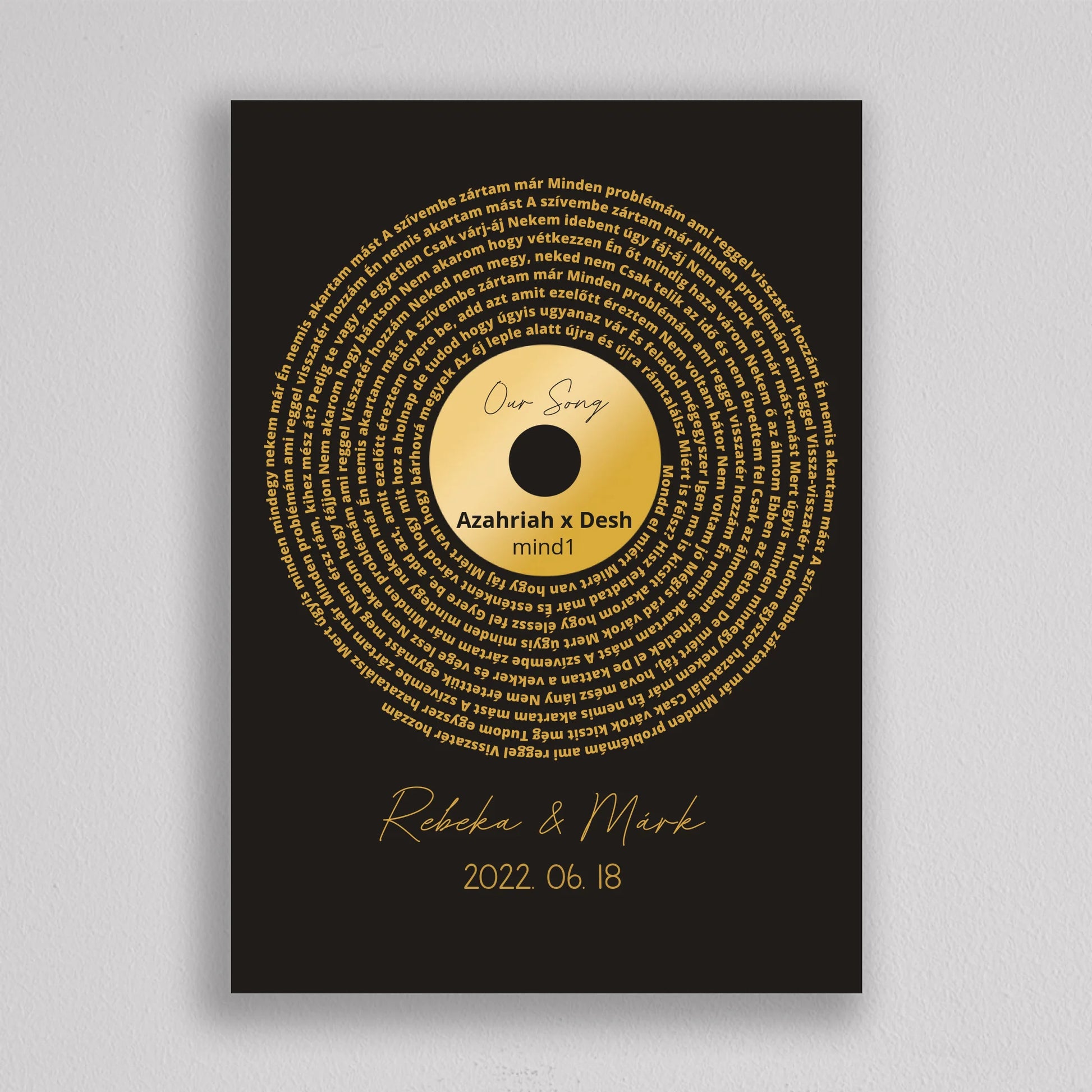 Az Aranylemez Személyre szabott bakelit spirál dalszöveggel tökéletes ajándék a zene és az emlékek szerelmeseinek. Egy elegáns, arany bakelit lemez stílusú illusztráció, amely spirálisan elrendezett dalszövegekkel örökíti meg kedvenc dalotok sorait, ezzel kifejezve az érzelmi kötődést és az egyedi stílust. A termék teljes mértékben személyre szabható: kiválaszthatod a dalt, a dalszöveget, a dátumot és akár a neveket is, így igazán különleges és személyes ajándékká válik. Ez a dekoráció tökéletes választás lehet évfordulóra, esküvői ajándékként, vagy egyedülálló lakásdekorációként. A prémium kivitelnek köszönhetően az illusztráció modern és stílusos dísze lehet bármely otthonnak.