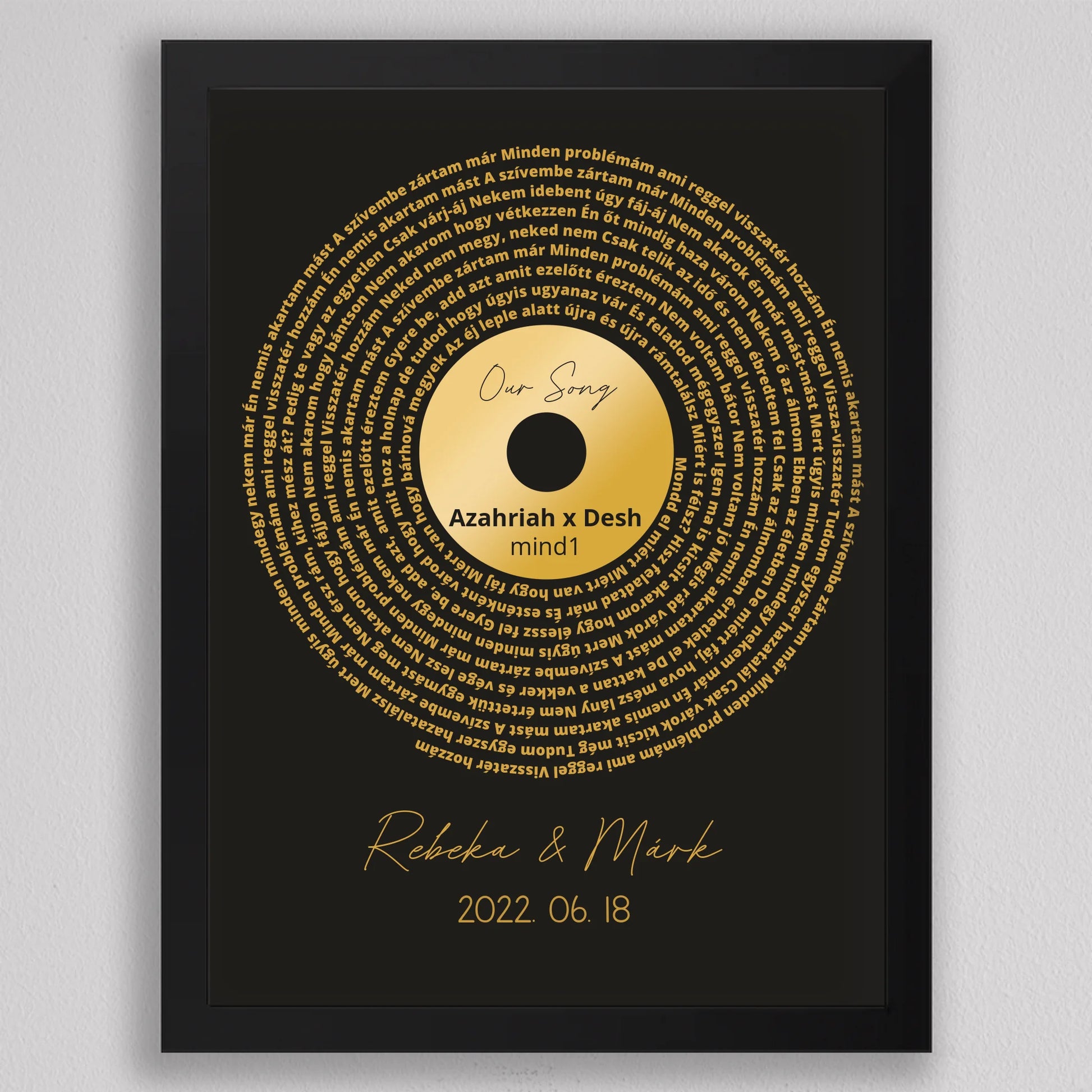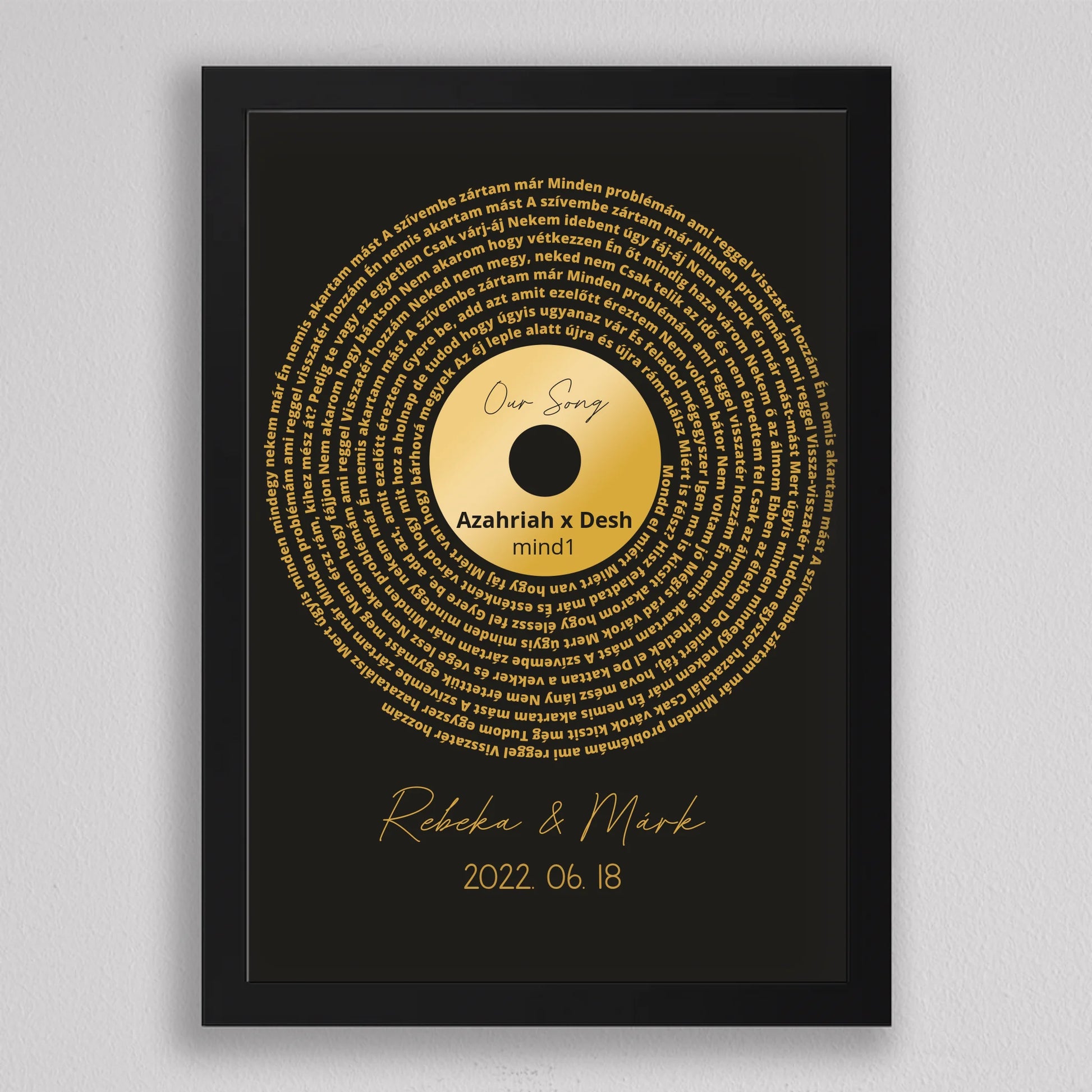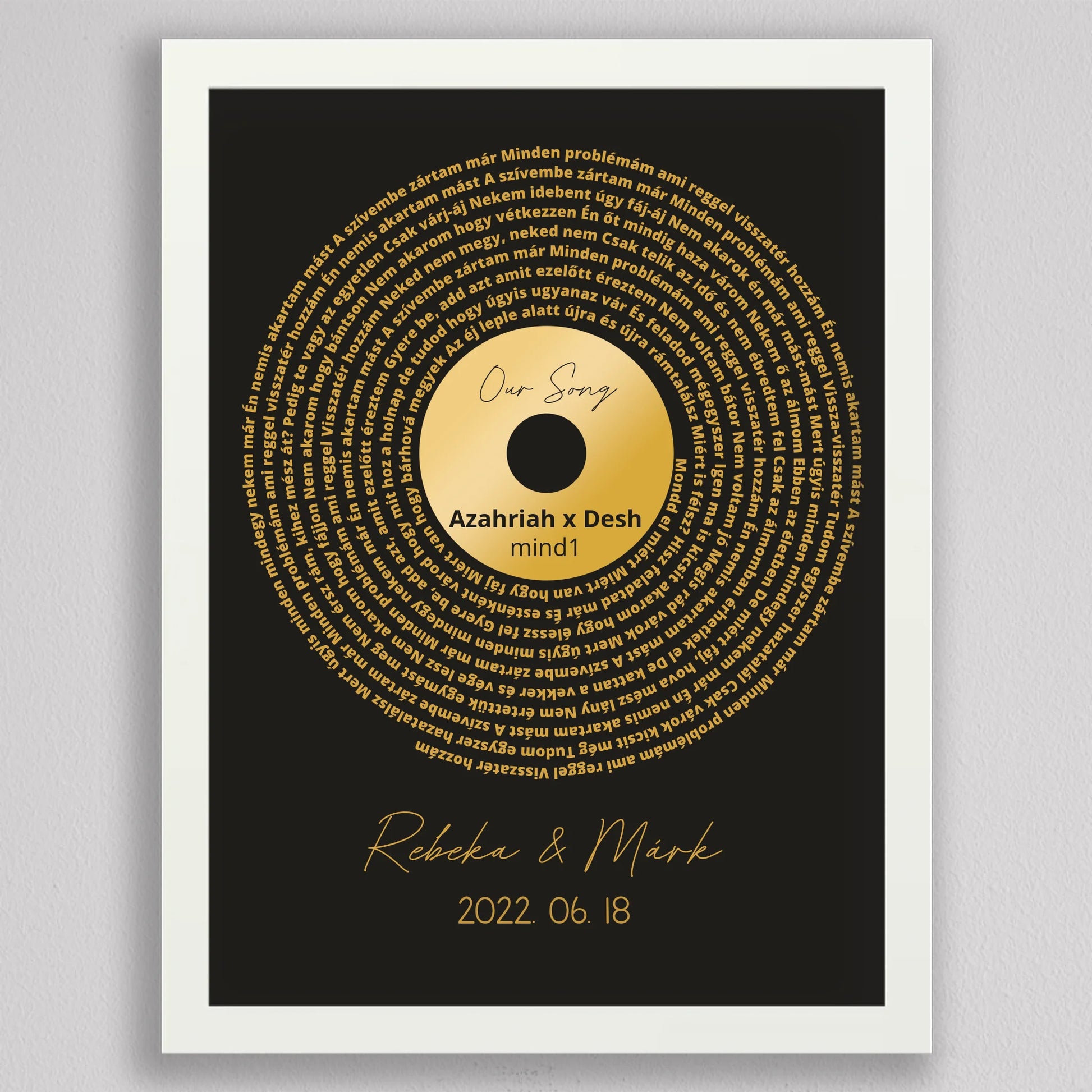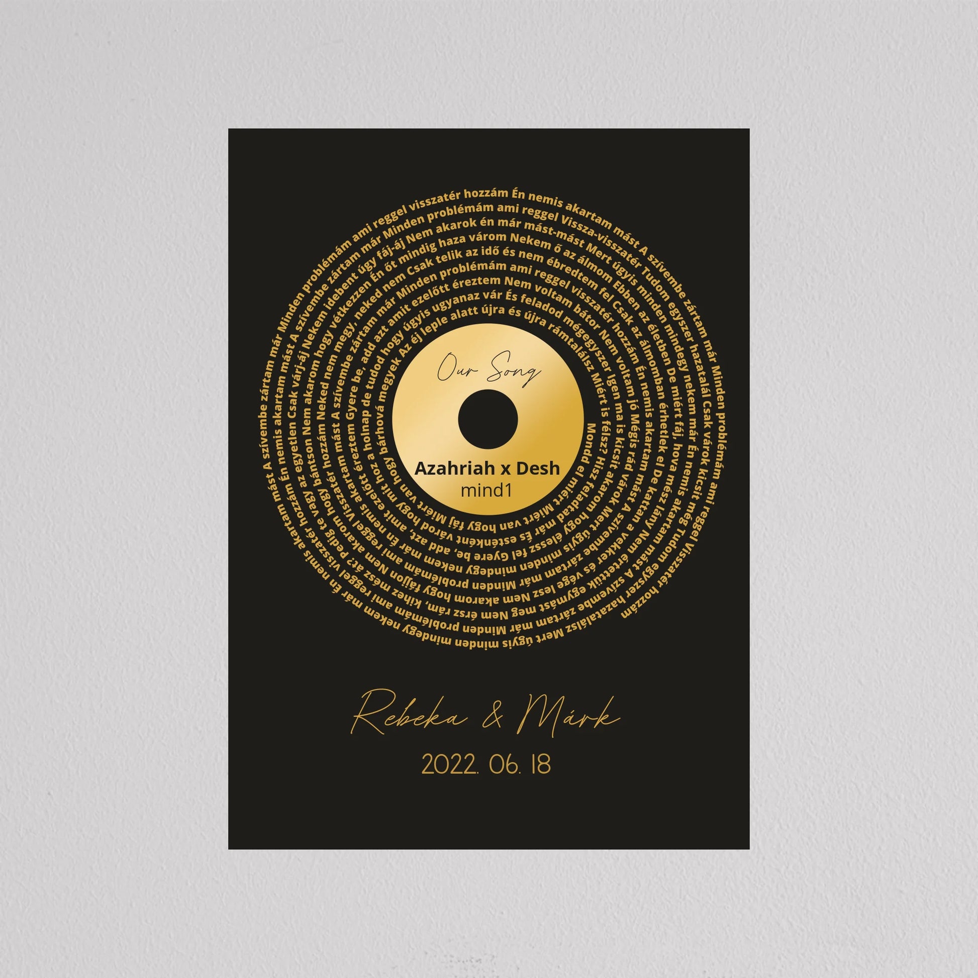 Az Aranylemez Személyre szabott bakelit spirál dalszöveggel tökéletes ajándék a zene és az emlékek szerelmeseinek. Egy elegáns, arany bakelit lemez stílusú illusztráció, amely spirálisan elrendezett dalszövegekkel örökíti meg kedvenc dalotok sorait, ezzel kifejezve az érzelmi kötődést és az egyedi stílust. A termék teljes mértékben személyre szabható: kiválaszthatod a dalt, a dalszöveget, a dátumot és akár a neveket is, így igazán különleges és személyes ajándékká válik. Ez a dekoráció tökéletes választás lehet évfordulóra, esküvői ajándékként, vagy egyedülálló lakásdekorációként. A prémium kivitelnek köszönhetően az illusztráció modern és stílusos dísze lehet bármely otthonnak.