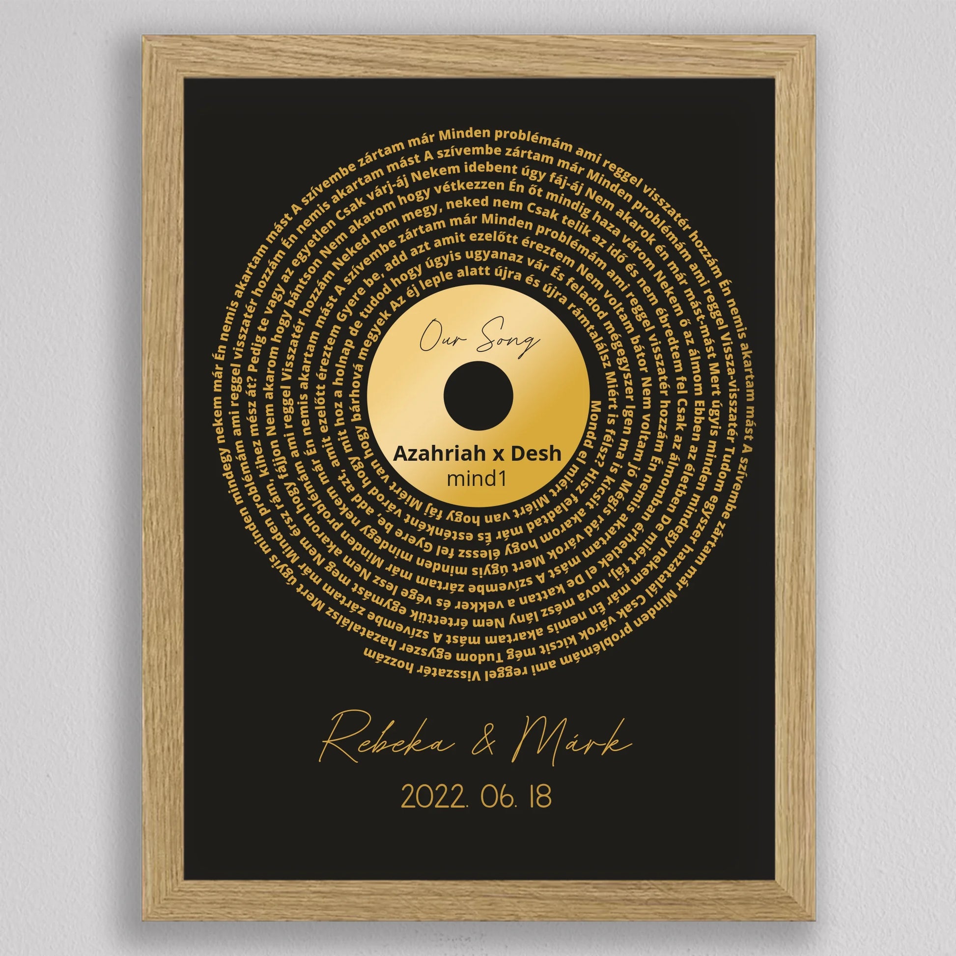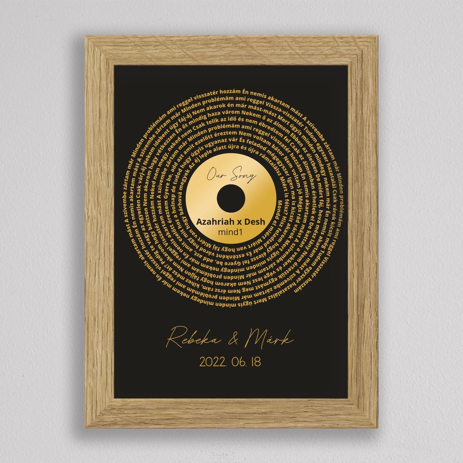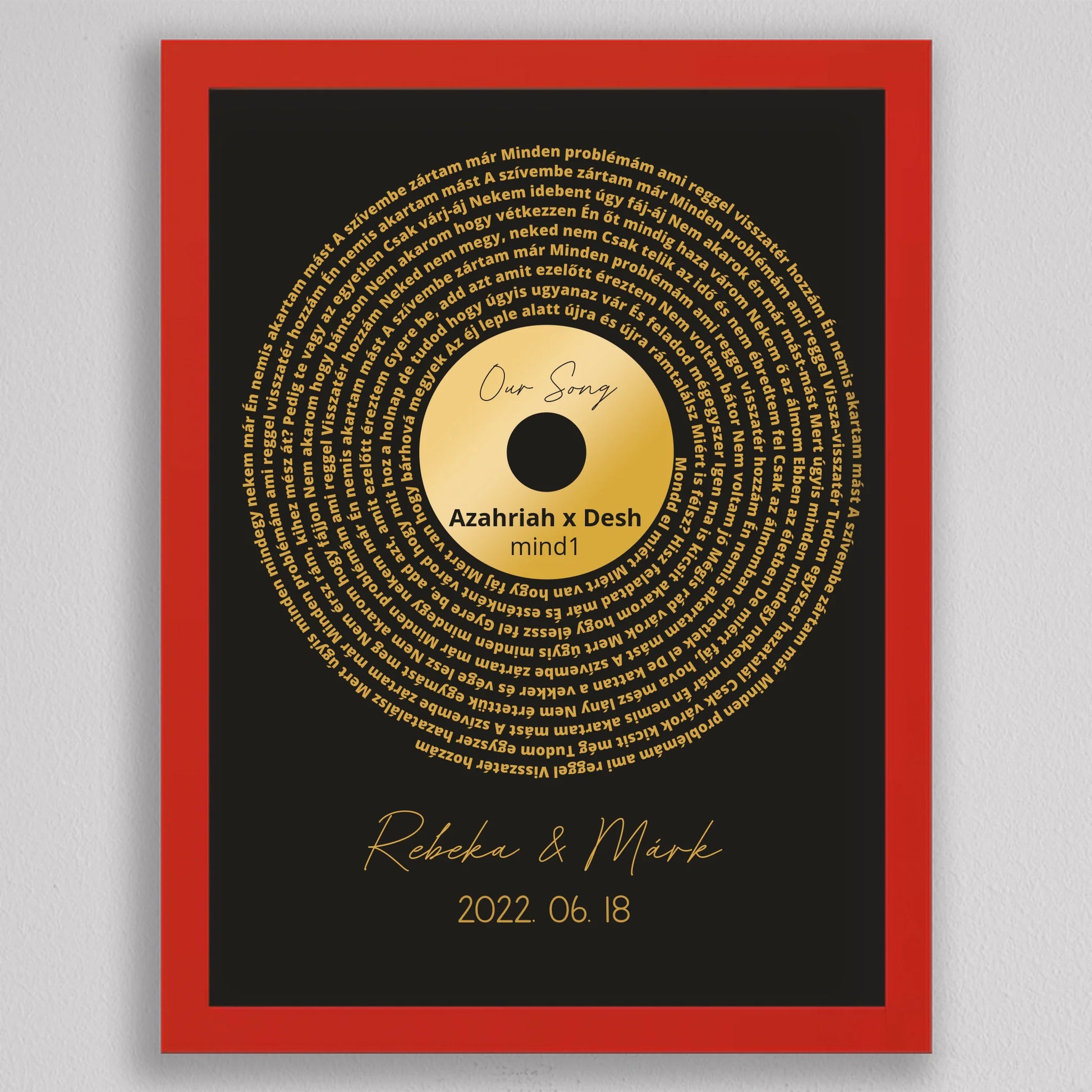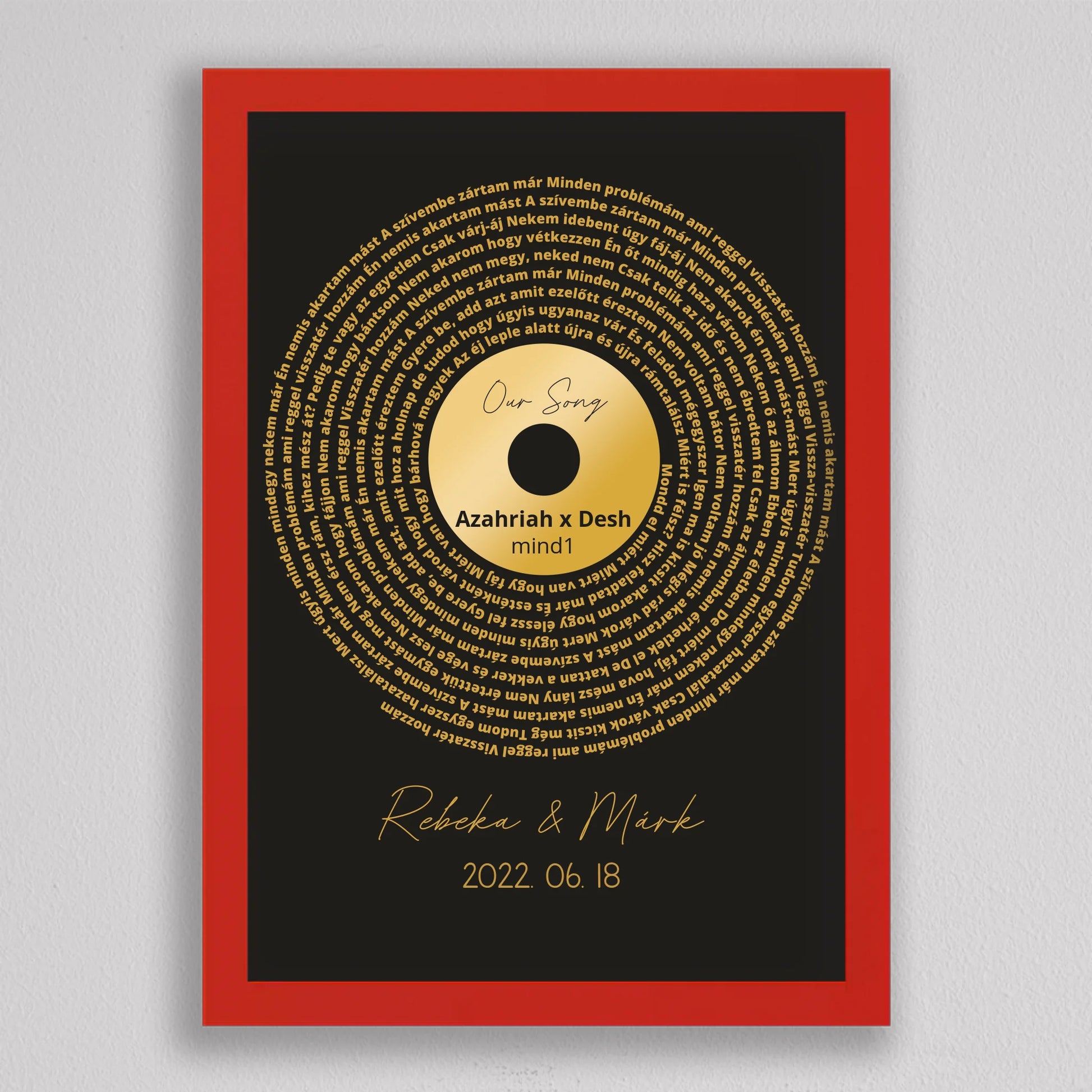 Az Aranylemez Személyre szabott bakelit spirál dalszöveggel tökéletes ajándék a zene és az emlékek szerelmeseinek. Egy elegáns, arany bakelit lemez stílusú illusztráció, amely spirálisan elrendezett dalszövegekkel örökíti meg kedvenc dalotok sorait, ezzel kifejezve az érzelmi kötődést és az egyedi stílust. A termék teljes mértékben személyre szabható: kiválaszthatod a dalt, a dalszöveget, a dátumot és akár a neveket is, így igazán különleges és személyes ajándékká válik. Ez a dekoráció tökéletes választás lehet évfordulóra, esküvői ajándékként, vagy egyedülálló lakásdekorációként. A prémium kivitelnek köszönhetően az illusztráció modern és stílusos dísze lehet bármely otthonnak.