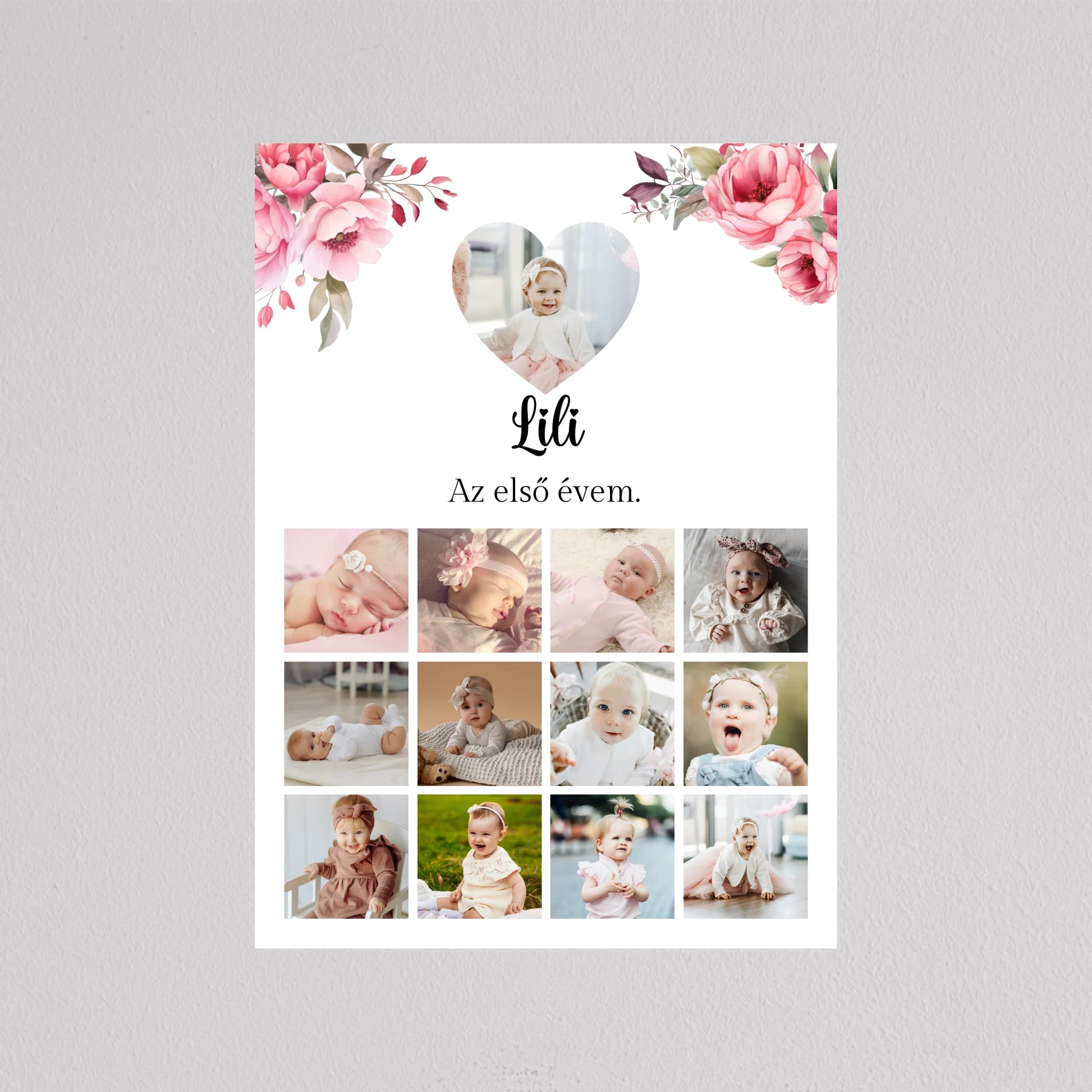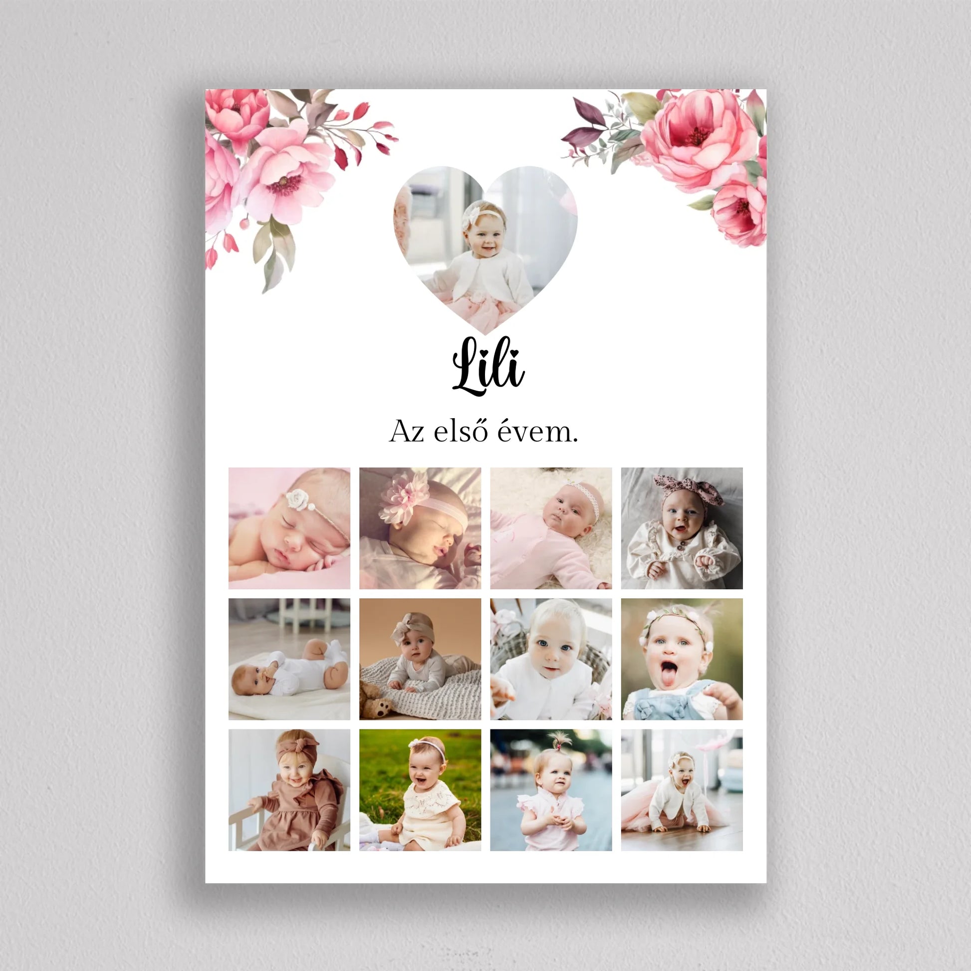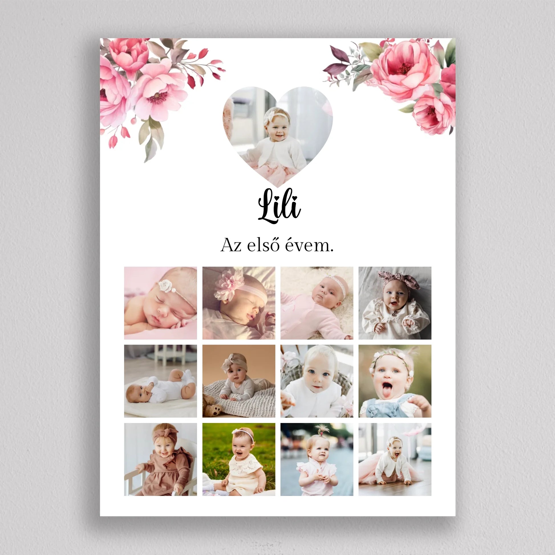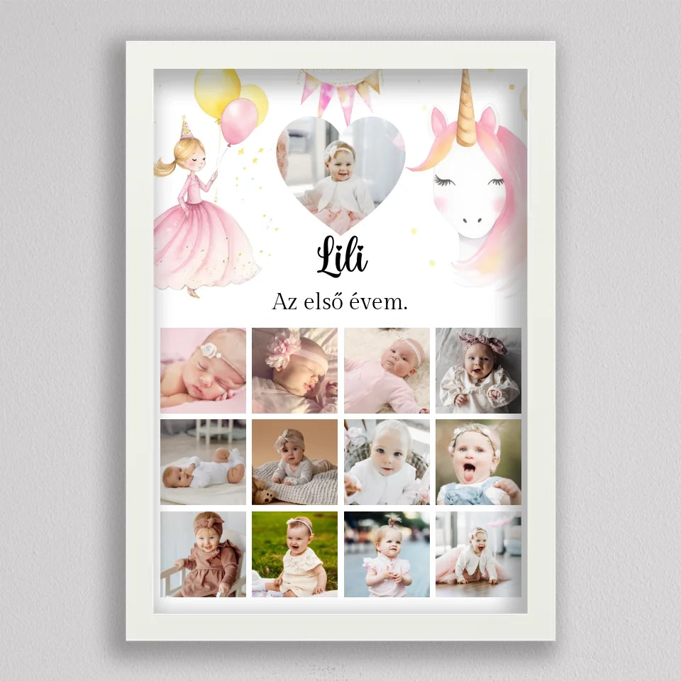 Az “Az első évem - Egy éves szülinapi fotó kollázs - lány” tökéletes módja annak, hogy megörökítsd és emlékezetessé tedd gyermeked első évének legszebb pillanatait. Az egyedi és személyre szabható kollázs minden részletében a te igényeidhez igazítható, így választhatsz virágos vagy hercegnős hátteret, amely tovább fokozza a különleges hangulatot. A képek gyönyörű elrendezése és a gondosan megválasztott dizájn garantáltan mosolyt csal mindenki arcára, aki rápillant. Tökéletes ajándék születésnapra, keresztelőre vagy akár dekorációként is gyermekszobába. A prémium minőségű anyaghasználatnak köszönhetően hosszú éveken át megőrzi szépségét és értékét. Add meg gyermekednek vagy szeretteidnek azt az örömöt, hogy ezek a különleges emlékek méltó helyet kapnak otthonotokban!