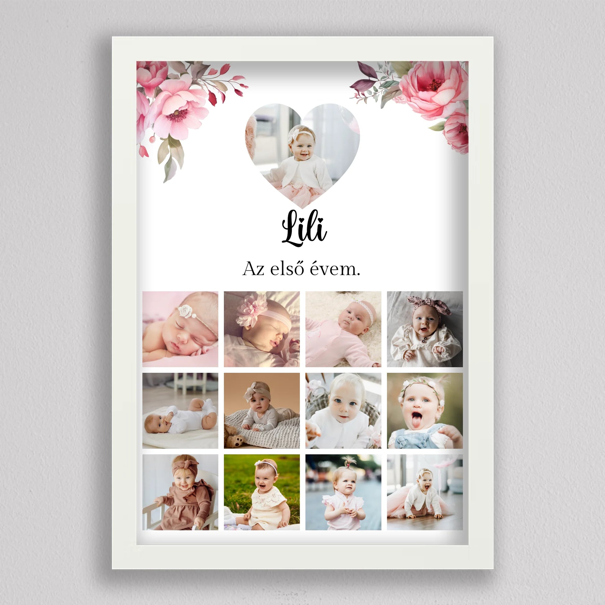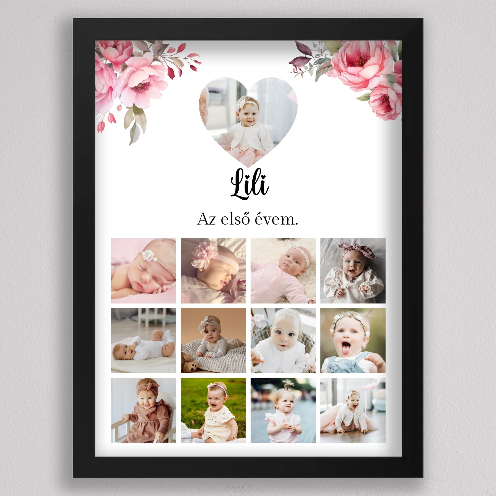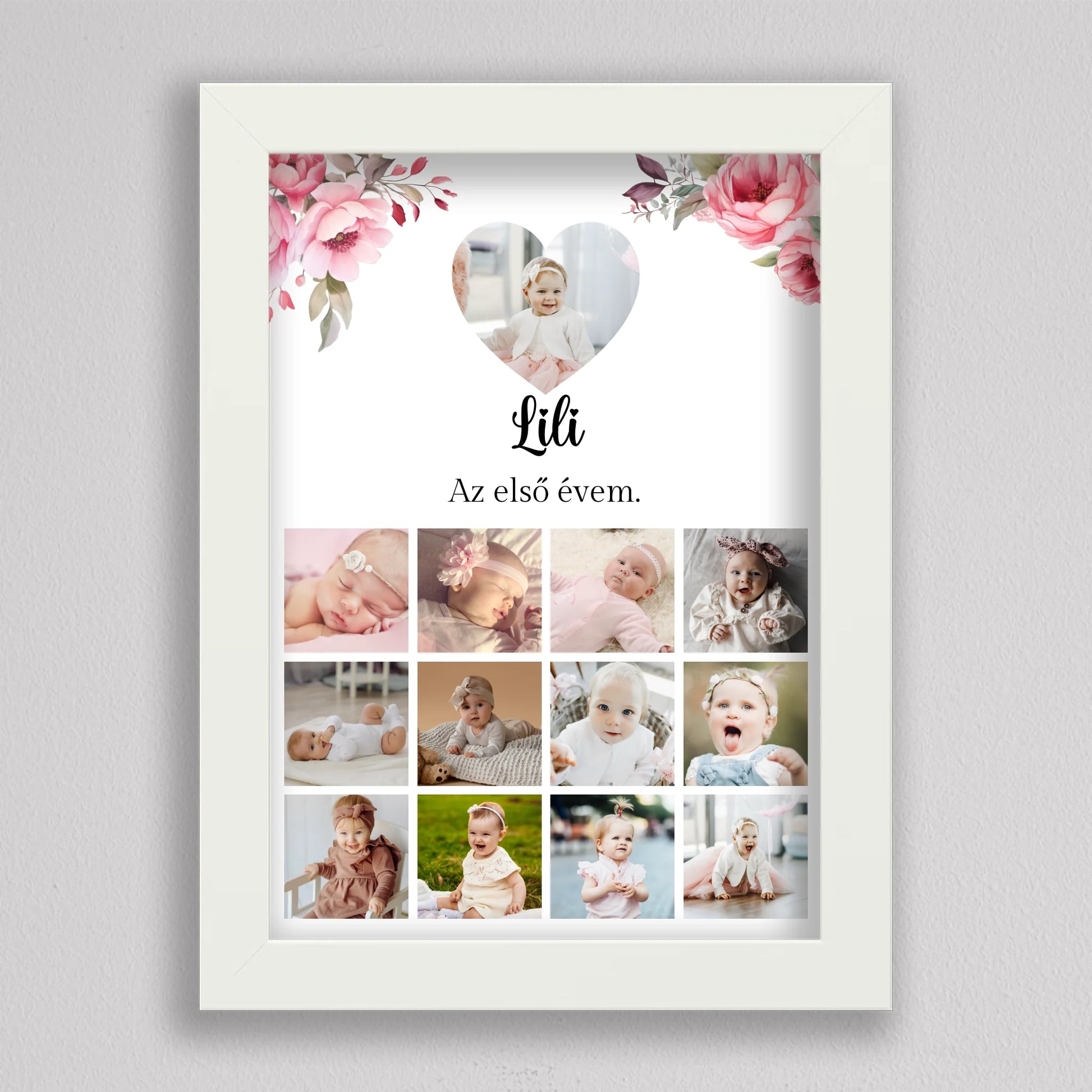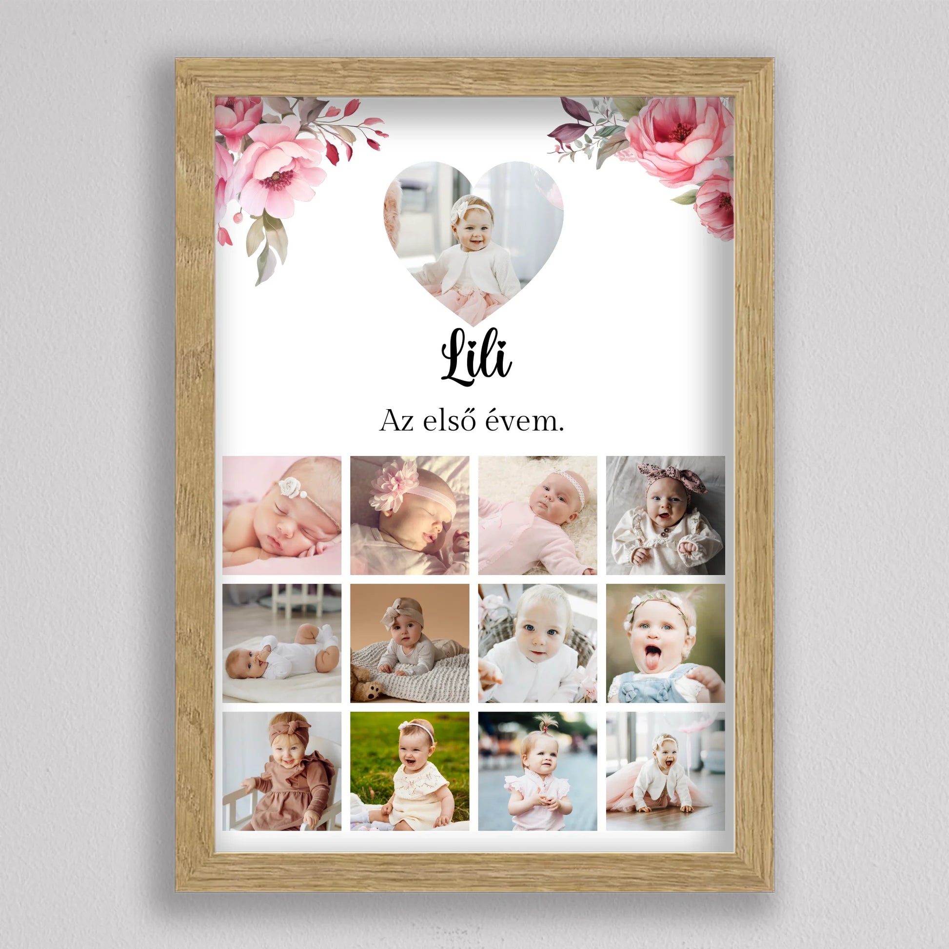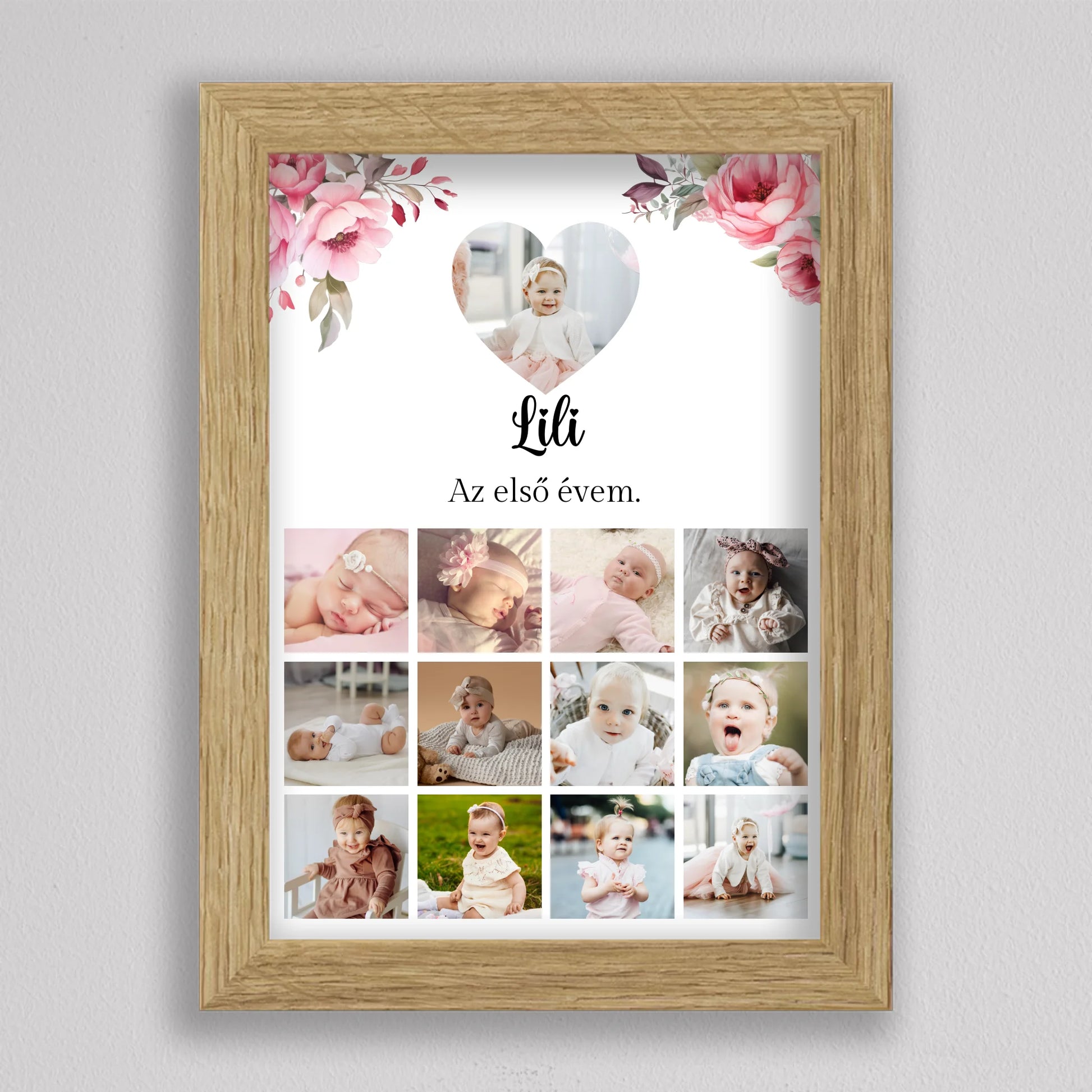 Az “Az első évem - Egy éves szülinapi fotó kollázs - lány” tökéletes módja annak, hogy megörökítsd és emlékezetessé tedd gyermeked első évének legszebb pillanatait. Az egyedi és személyre szabható kollázs minden részletében a te igényeidhez igazítható, így választhatsz virágos vagy hercegnős hátteret, amely tovább fokozza a különleges hangulatot. A képek gyönyörű elrendezése és a gondosan megválasztott dizájn garantáltan mosolyt csal mindenki arcára, aki rápillant. Tökéletes ajándék születésnapra, keresztelőre vagy akár dekorációként is gyermekszobába. A prémium minőségű anyaghasználatnak köszönhetően hosszú éveken át megőrzi szépségét és értékét. Add meg gyermekednek vagy szeretteidnek azt az örömöt, hogy ezek a különleges emlékek méltó helyet kapnak otthonotokban!