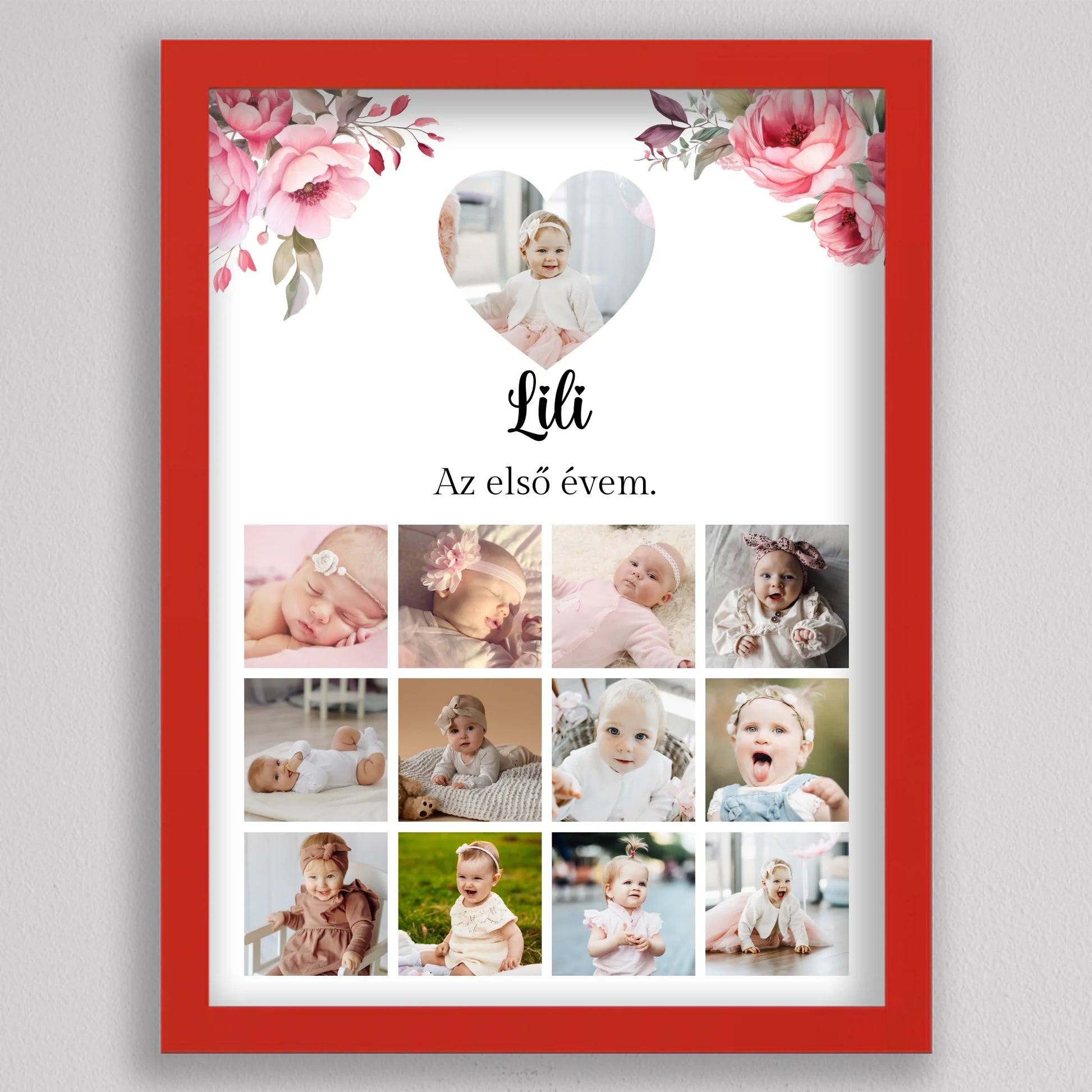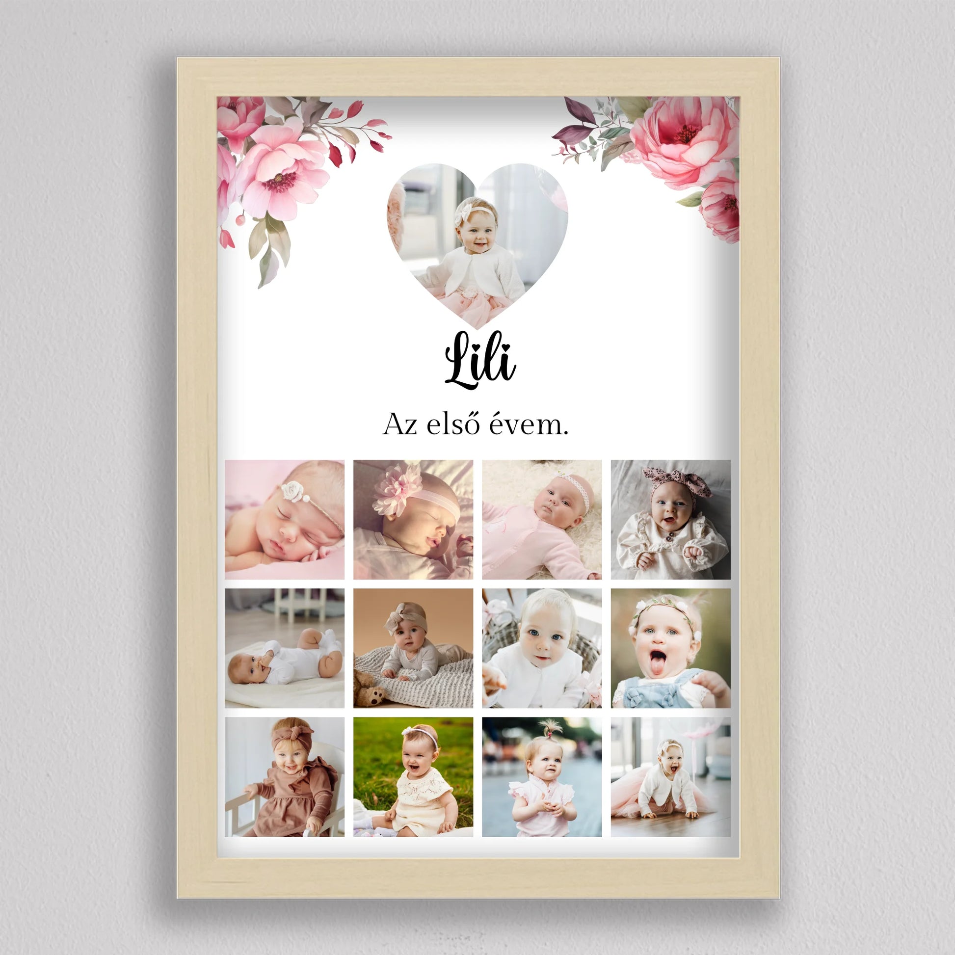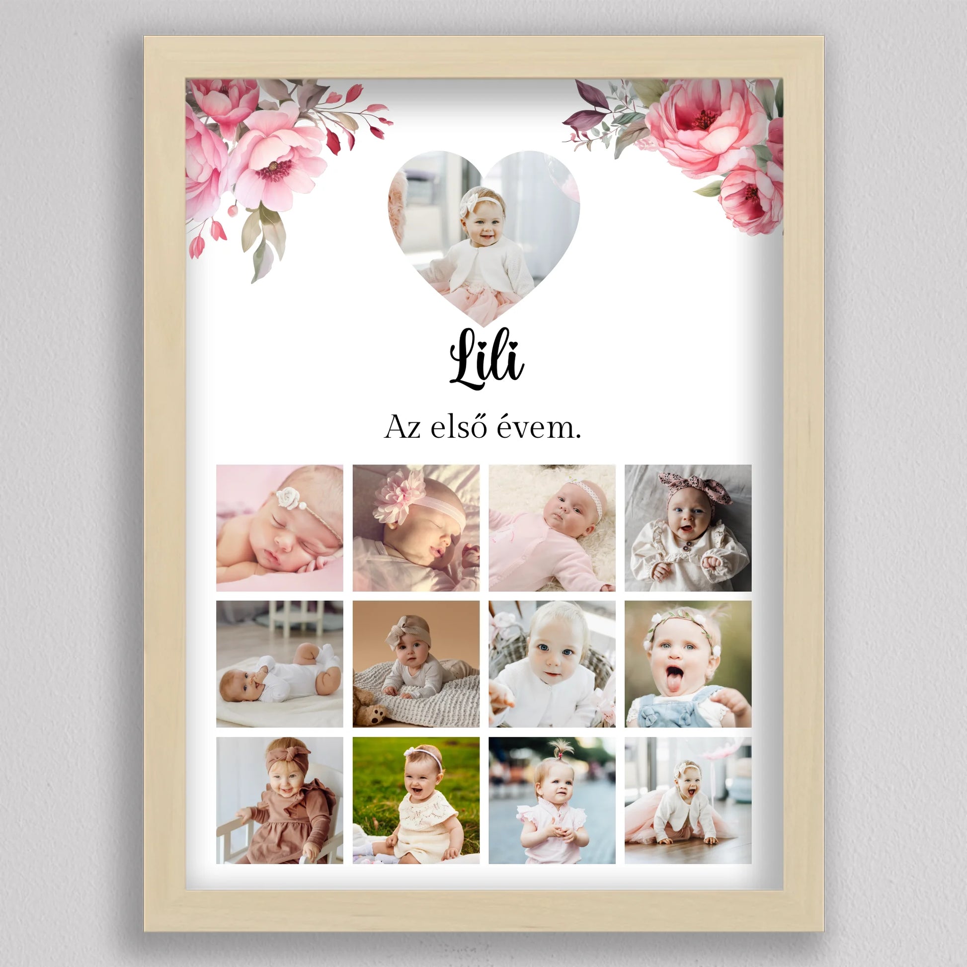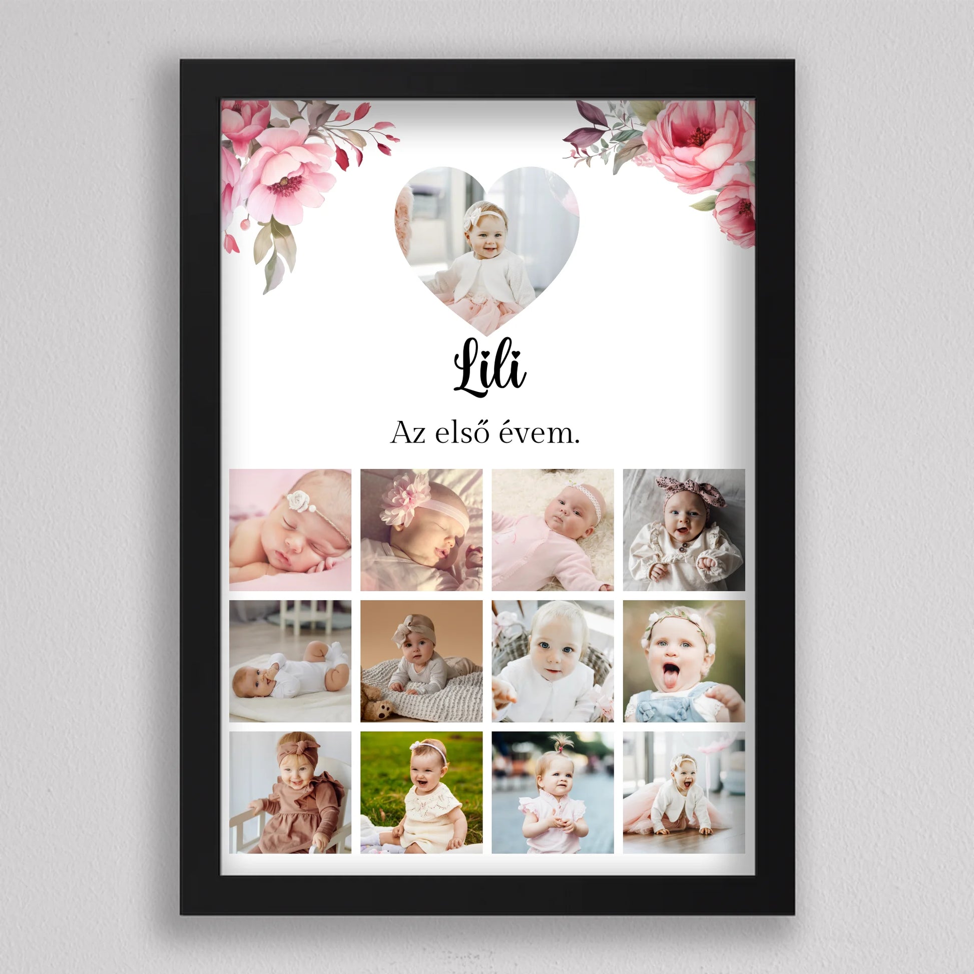 Az “Az első évem - Egy éves szülinapi fotó kollázs - lány” tökéletes módja annak, hogy megörökítsd és emlékezetessé tedd gyermeked első évének legszebb pillanatait. Az egyedi és személyre szabható kollázs minden részletében a te igényeidhez igazítható, így választhatsz virágos vagy hercegnős hátteret, amely tovább fokozza a különleges hangulatot. A képek gyönyörű elrendezése és a gondosan megválasztott dizájn garantáltan mosolyt csal mindenki arcára, aki rápillant. Tökéletes ajándék születésnapra, keresztelőre vagy akár dekorációként is gyermekszobába. A prémium minőségű anyaghasználatnak köszönhetően hosszú éveken át megőrzi szépségét és értékét. Add meg gyermekednek vagy szeretteidnek azt az örömöt, hogy ezek a különleges emlékek méltó helyet kapnak otthonotokban!