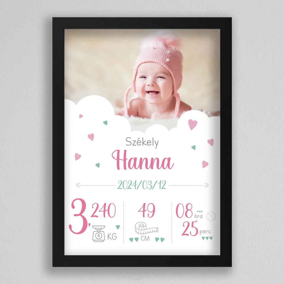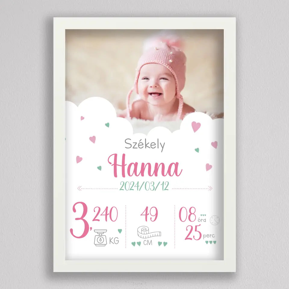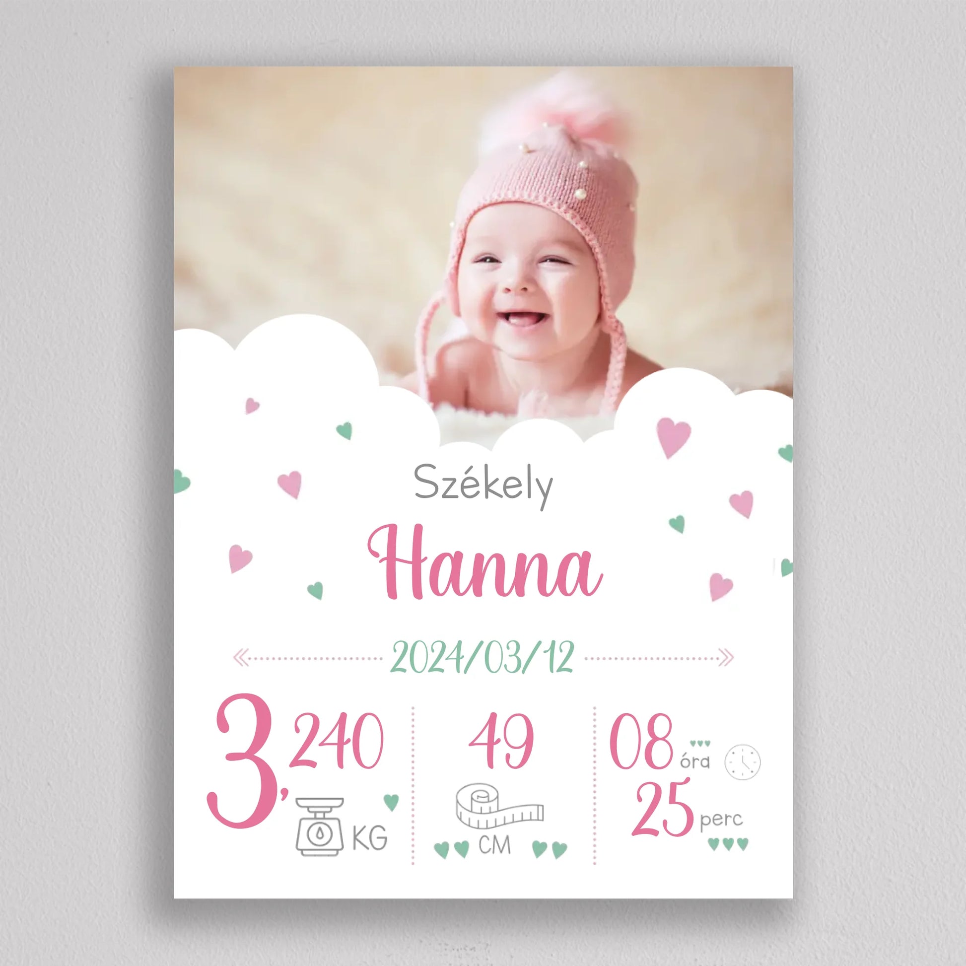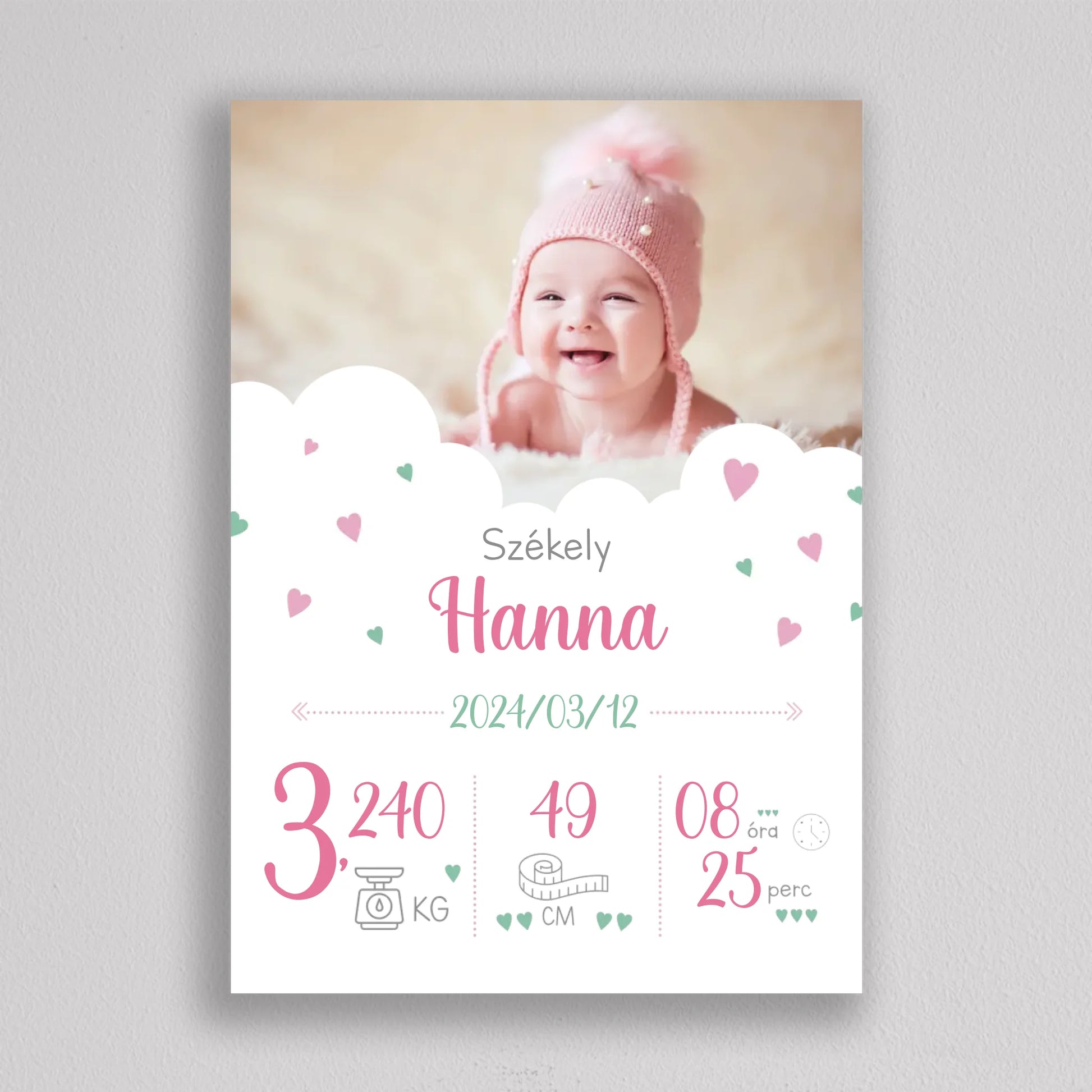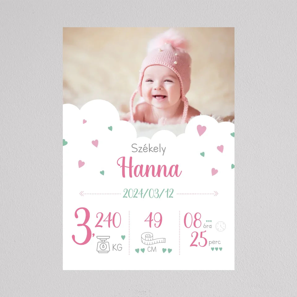 Fogadd szeretettel ezt az elragadóan bájos Baba Köszöntő Emlékplakátot, amely tökéletesen megörökíti a kislányod érkezésének minden fontos pillanatát! A plakáton a baba neve, születési dátuma, súlya, hossza és a pontos születési idő is feltüntetésre kerül, így egy örök emlék marad az egész család számára. A szívmelengető dizájn kiváló választás lehet a gyerekszoba falának díszítésére, valamint egyedi ajándékként is megállja a helyét keresztelőre vagy babalátogatóra, nagyszülőknek és rokonoknak is. A plakát teljesen személyre szabható, hogy igazán különleges és egyedi meglepetést nyújtson a Nektek.