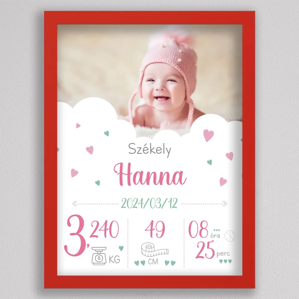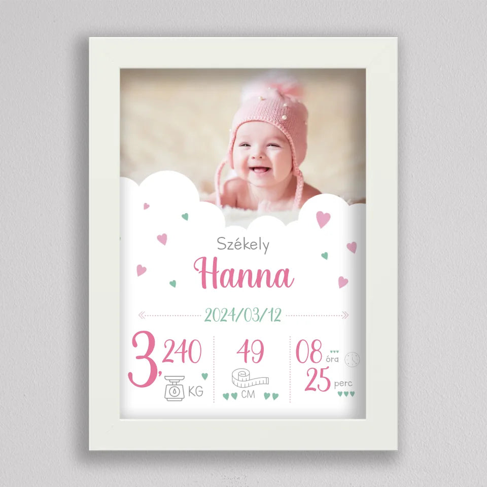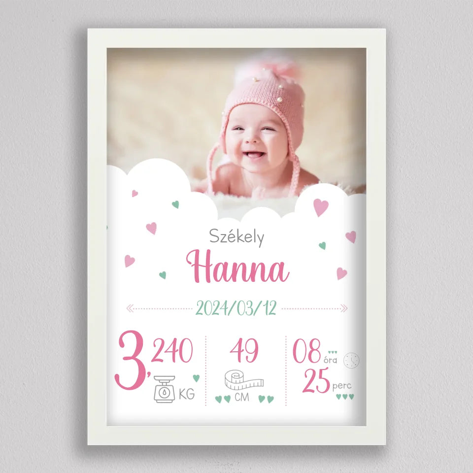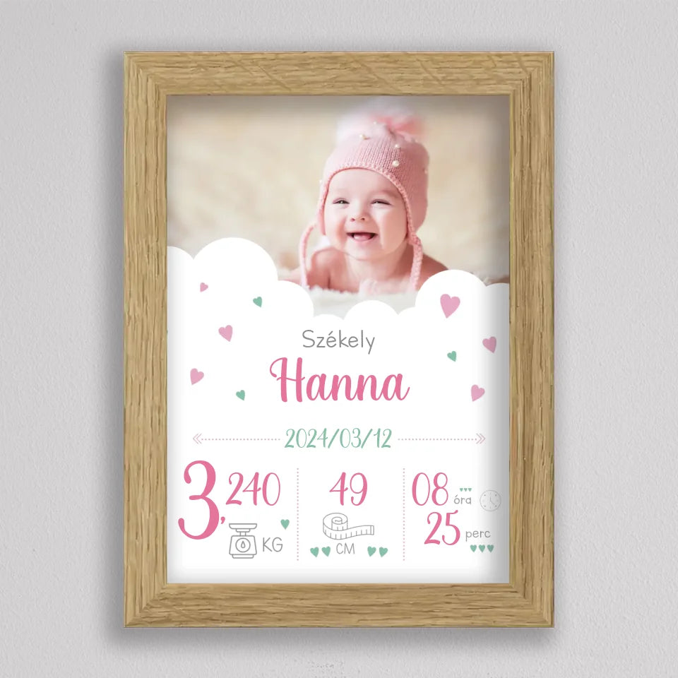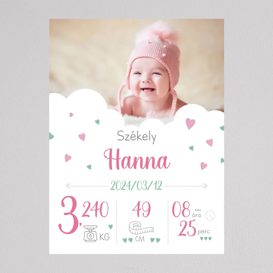 Fogadd szeretettel ezt az elragadóan bájos Baba Köszöntő Emlékplakátot, amely tökéletesen megörökíti a kislányod érkezésének minden fontos pillanatát! A plakáton a baba neve, születési dátuma, súlya, hossza és a pontos születési idő is feltüntetésre kerül, így egy örök emlék marad az egész család számára. A szívmelengető dizájn kiváló választás lehet a gyerekszoba falának díszítésére, valamint egyedi ajándékként is megállja a helyét keresztelőre vagy babalátogatóra, nagyszülőknek és rokonoknak is. A plakát teljesen személyre szabható, hogy igazán különleges és egyedi meglepetést nyújtson a Nektek.