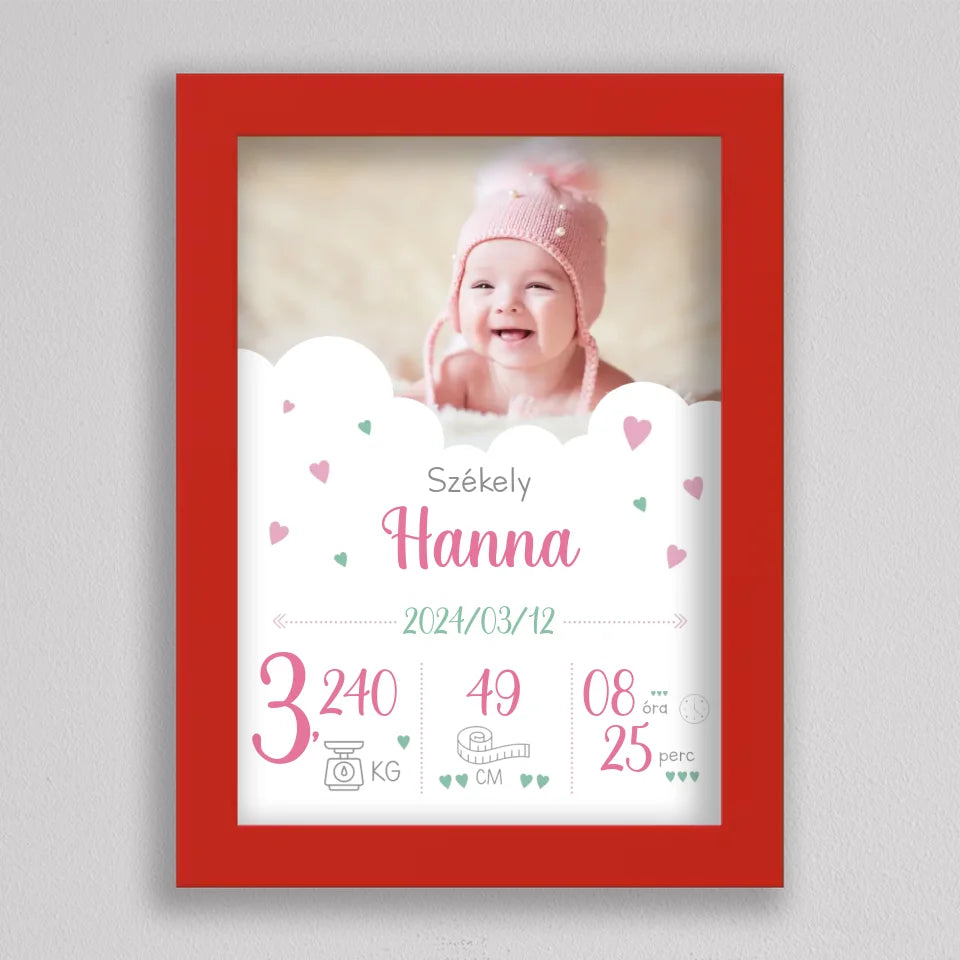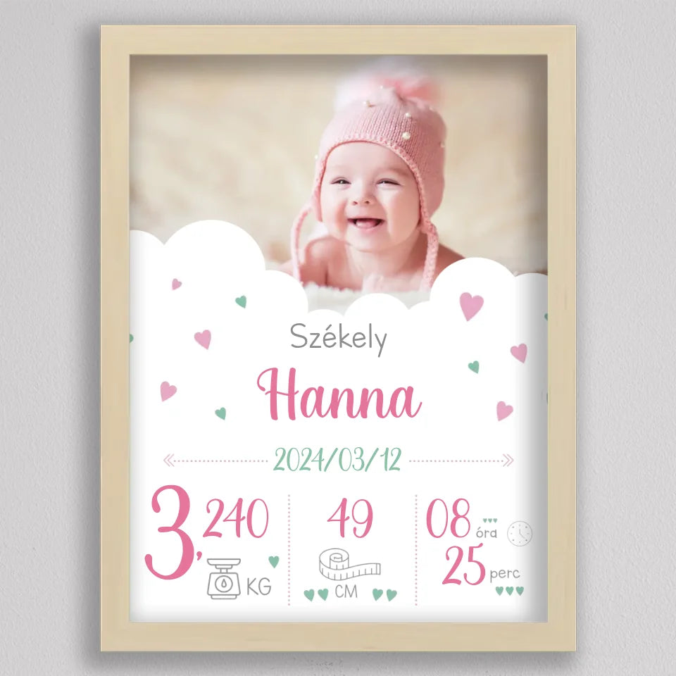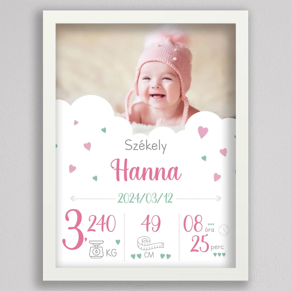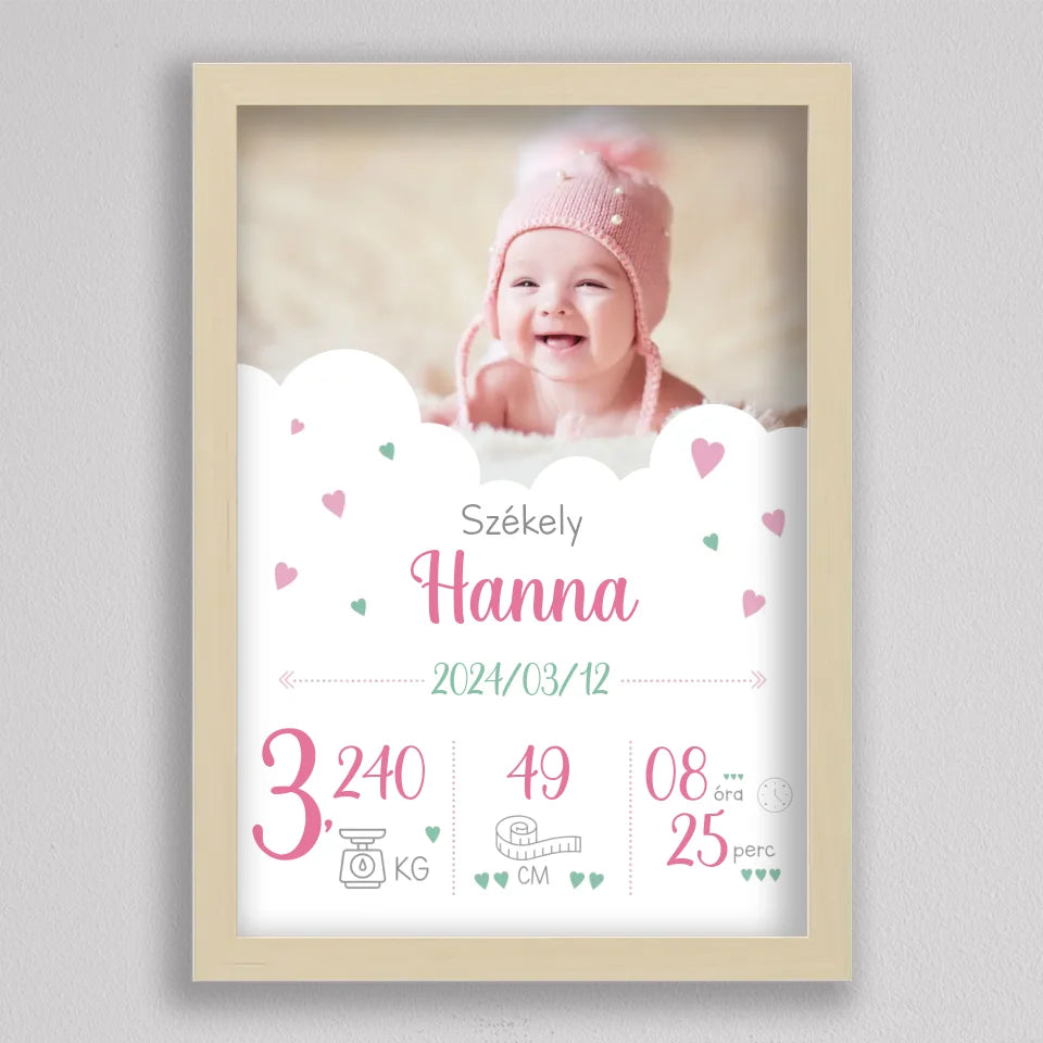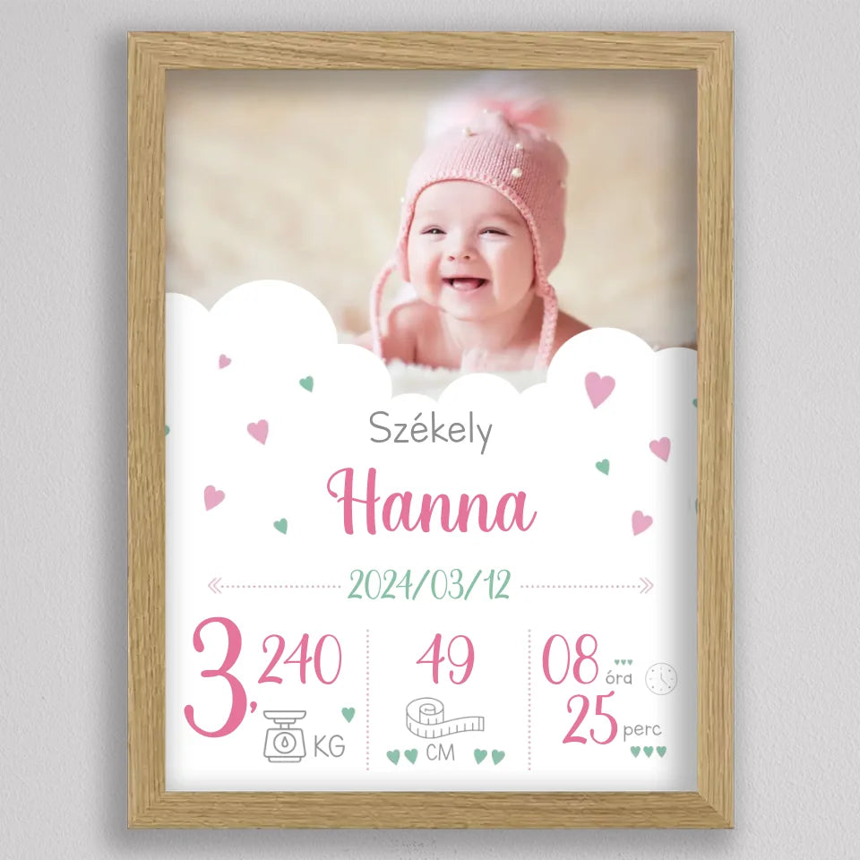 Fogadd szeretettel ezt az elragadóan bájos Baba Köszöntő Emlékplakátot, amely tökéletesen megörökíti a kislányod érkezésének minden fontos pillanatát! A plakáton a baba neve, születési dátuma, súlya, hossza és a pontos születési idő is feltüntetésre kerül, így egy örök emlék marad az egész család számára. A szívmelengető dizájn kiváló választás lehet a gyerekszoba falának díszítésére, valamint egyedi ajándékként is megállja a helyét keresztelőre vagy babalátogatóra, nagyszülőknek és rokonoknak is. A plakát teljesen személyre szabható, hogy igazán különleges és egyedi meglepetést nyújtson a Nektek.