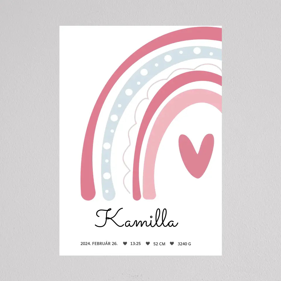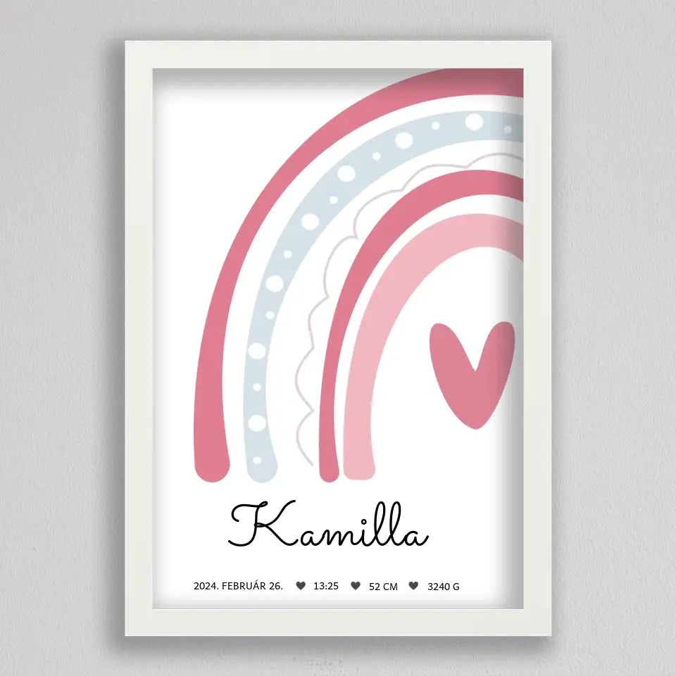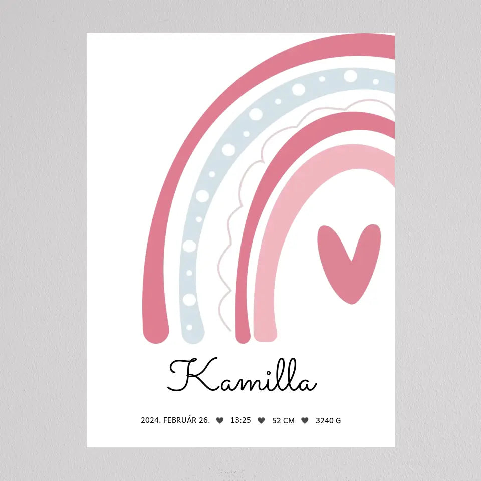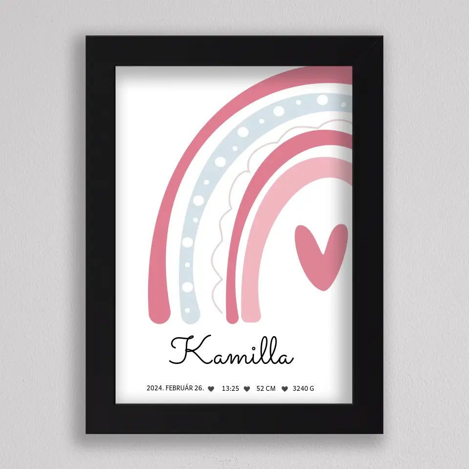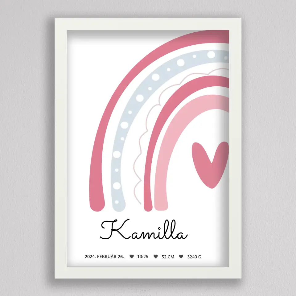 Köszöntsd a kislányod érkezését ezzel a bájos SzivárványosBaba Köszöntő Emlékplakáttal, amely minden fontos születési adatot megjelenít egy édes, szivárványos dizájnon. Ez a modern és kifinomult plakát tökéletes dísze lehet a gyerekszobának, és örök emlék marad a család számára. A termék teljesen személyre szabható, így a baba nevét, születési idejét, súlyát és hosszát is megadhatod rajta. Több színkombinációban elérhető, hogy még jobban passzoljon az otthonod stílusához. Tökéletes ajándék keresztelőre, babaváró bulira, vagy saját gyermeked születésének megörökítésére.