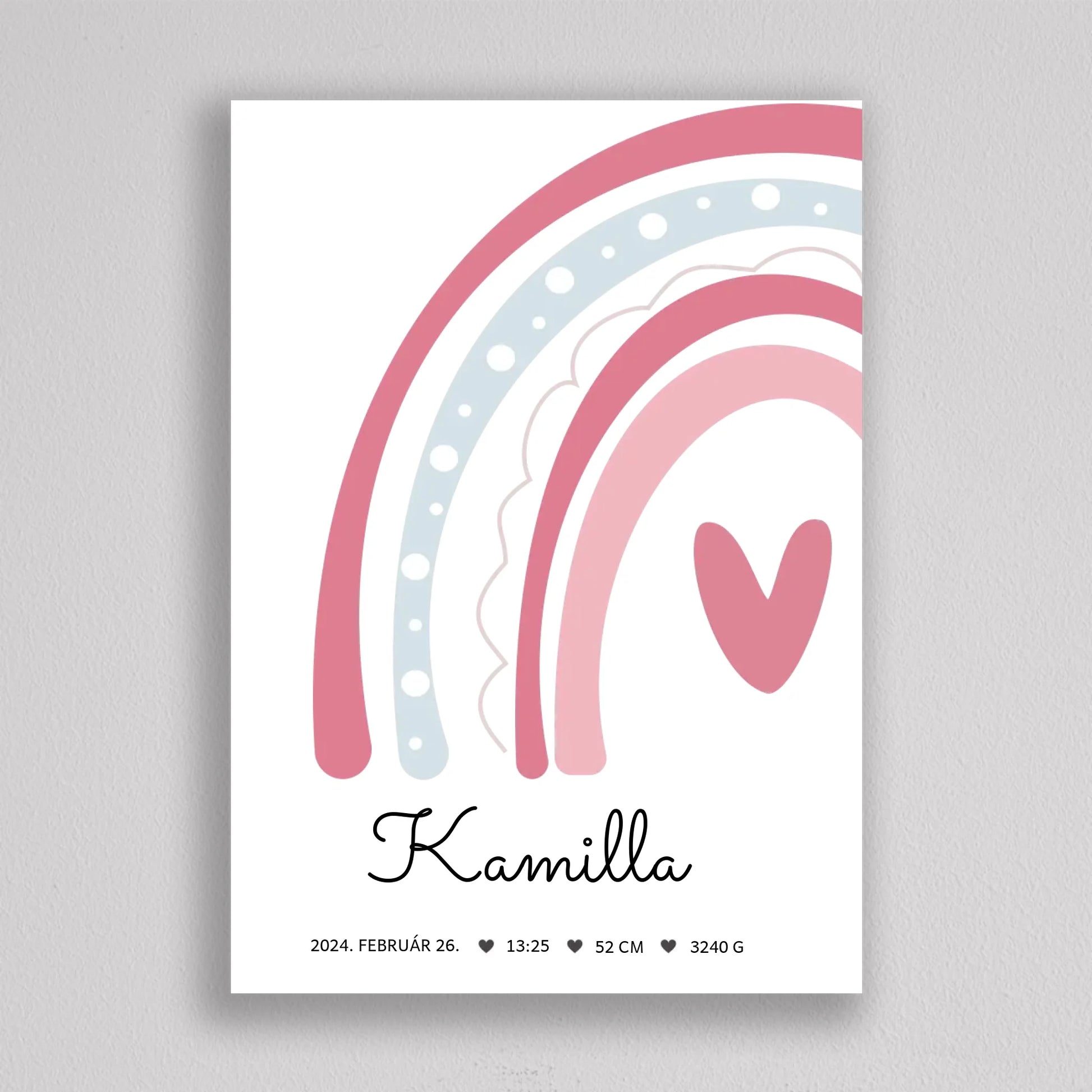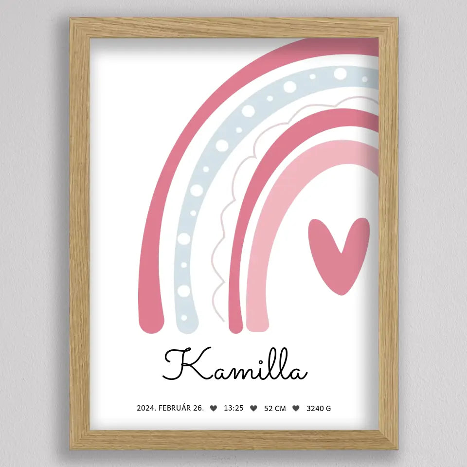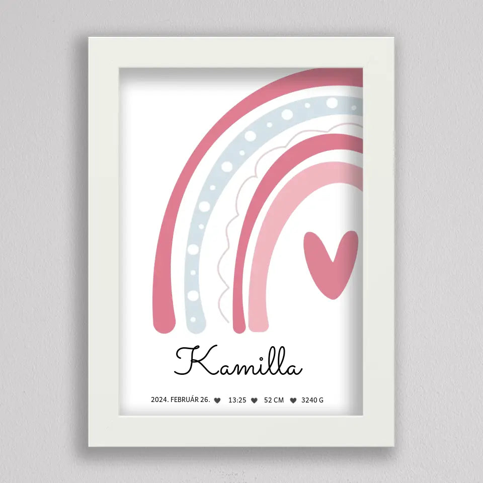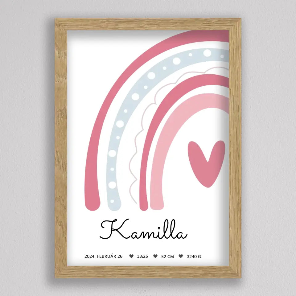 Köszöntsd a kislányod érkezését ezzel a bájos SzivárványosBaba Köszöntő Emlékplakáttal, amely minden fontos születési adatot megjelenít egy édes, szivárványos dizájnon. Ez a modern és kifinomult plakát tökéletes dísze lehet a gyerekszobának, és örök emlék marad a család számára. A termék teljesen személyre szabható, így a baba nevét, születési idejét, súlyát és hosszát is megadhatod rajta. Több színkombinációban elérhető, hogy még jobban passzoljon az otthonod stílusához. Tökéletes ajándék keresztelőre, babaváró bulira, vagy saját gyermeked születésének megörökítésére.