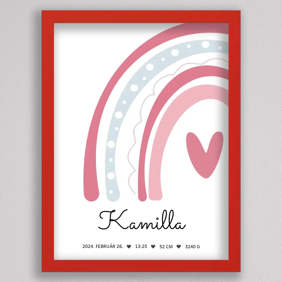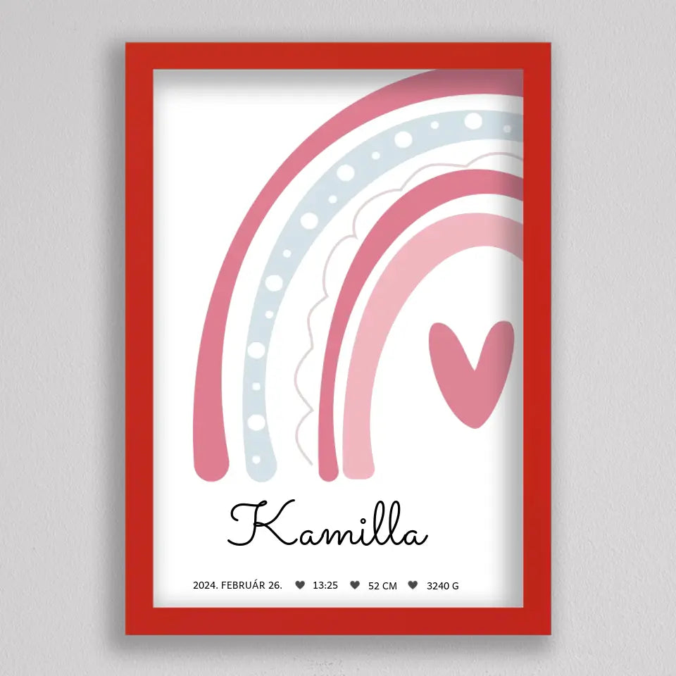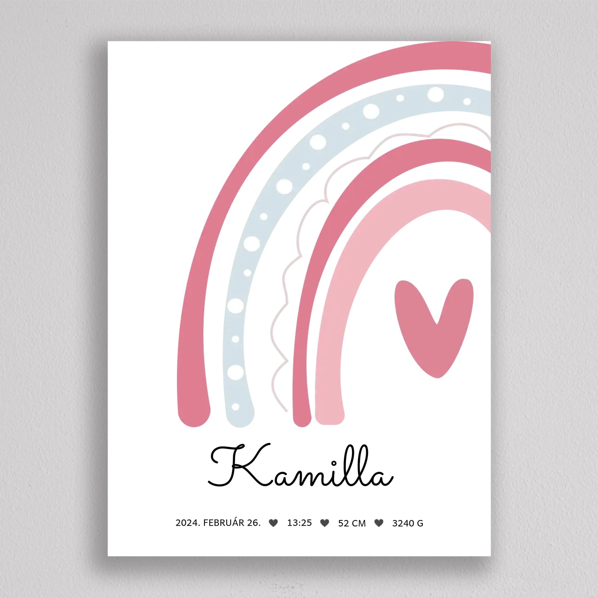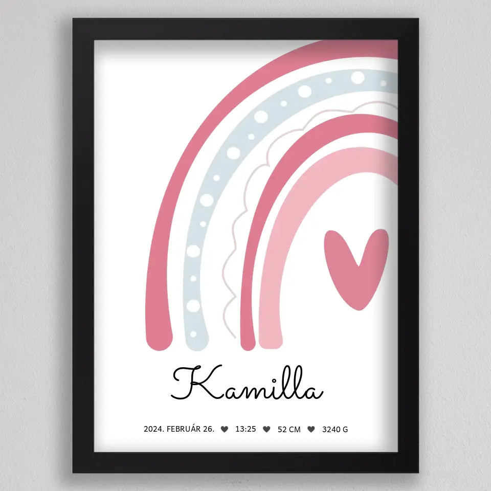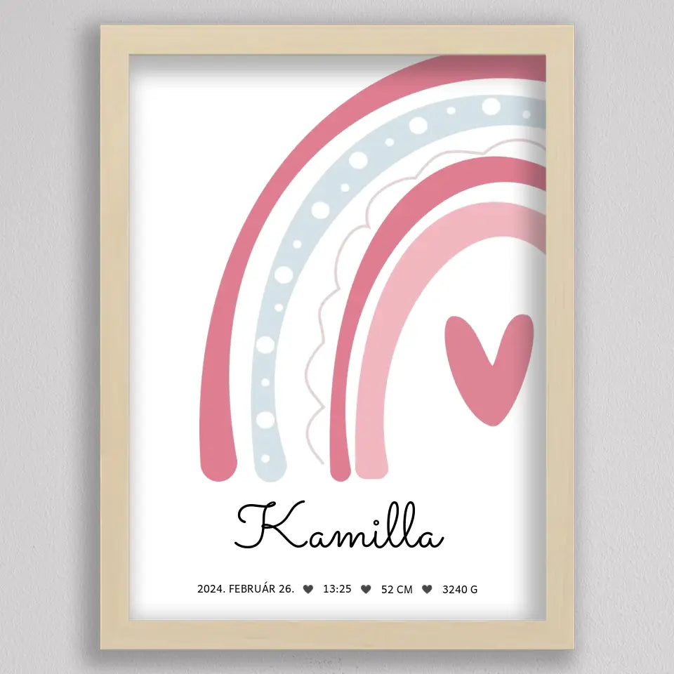Köszöntsd a kislányod érkezését ezzel a bájos SzivárványosBaba Köszöntő Emlékplakáttal, amely minden fontos születési adatot megjelenít egy édes, szivárványos dizájnon. Ez a modern és kifinomult plakát tökéletes dísze lehet a gyerekszobának, és örök emlék marad a család számára. A termék teljesen személyre szabható, így a baba nevét, születési idejét, súlyát és hosszát is megadhatod rajta. Több színkombinációban elérhető, hogy még jobban passzoljon az otthonod stílusához. Tökéletes ajándék keresztelőre, babaváró bulira, vagy saját gyermeked születésének megörökítésére.