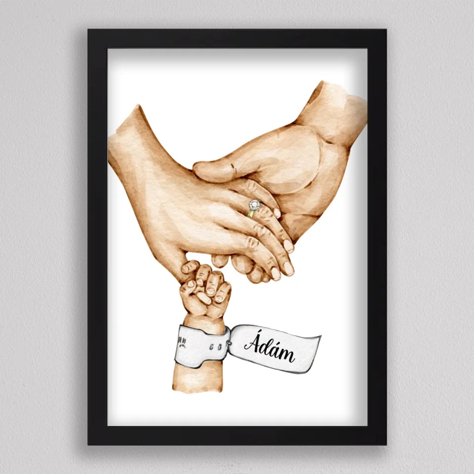 Az Egyedi babaköszöntő családi kezek illusztráció egy gyönyörű, érzelmekkel teli alkotás, amely tökéletes ajándék újszülöttek érkezésekor. Az illusztráció a szülők és az újszülött kézfogását ábrázolja, amit teljesen személyre szabható a baba nevével és születési adataival. Ez az egyedi műalkotás prémium minőségű papírra kerül nyomtatásra, ami hosszú éveken át megőrzi a különleges pillanatok emlékét. Kiváló ajándék babaköszöntőre vagy keresztelőre, és garantáltan mosolyt csal a szülők arcára, miközben otthonuk dísze lesz.