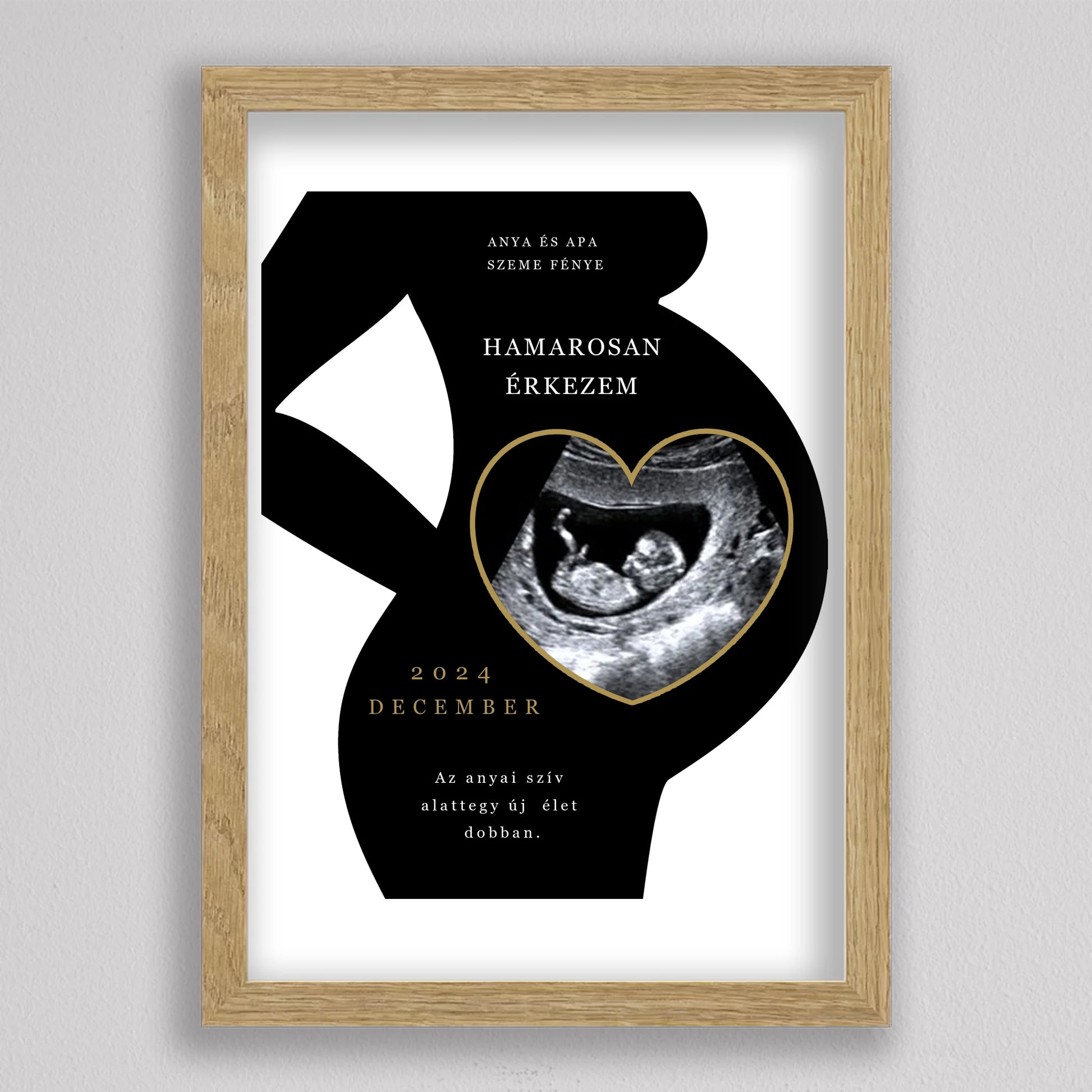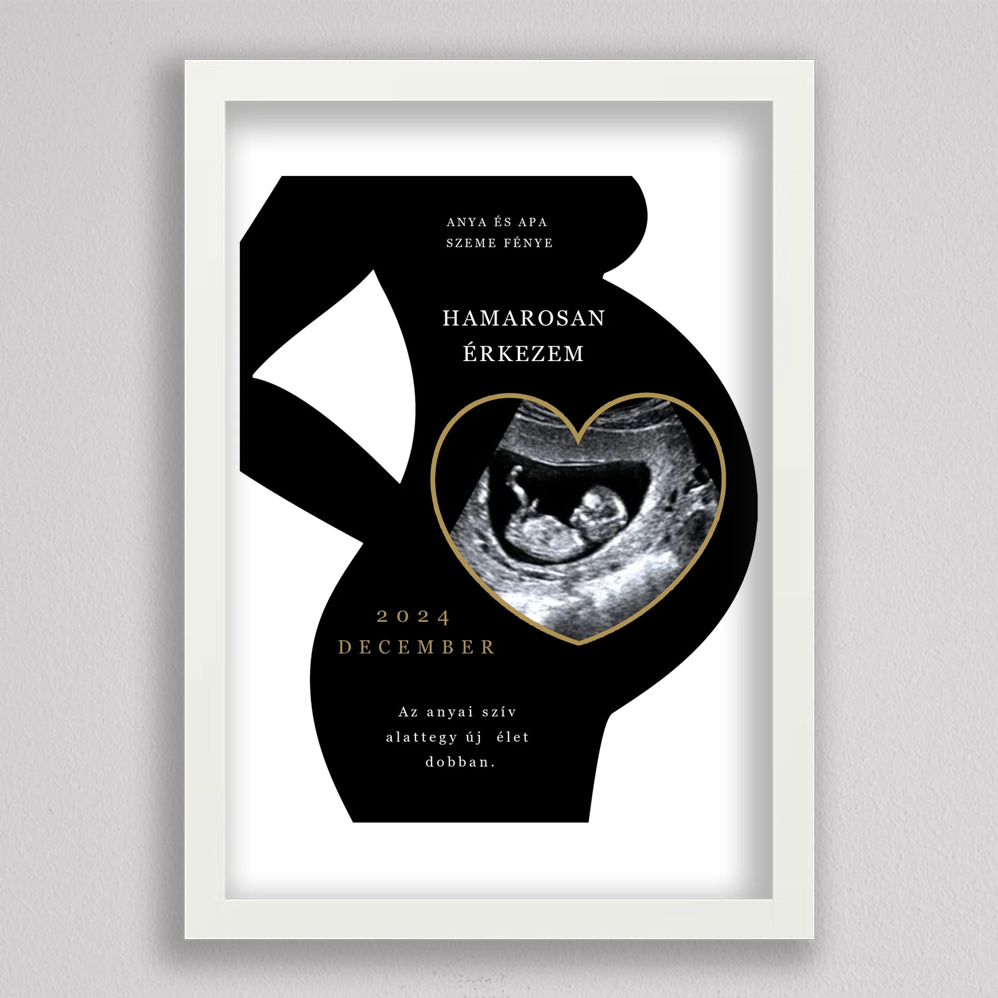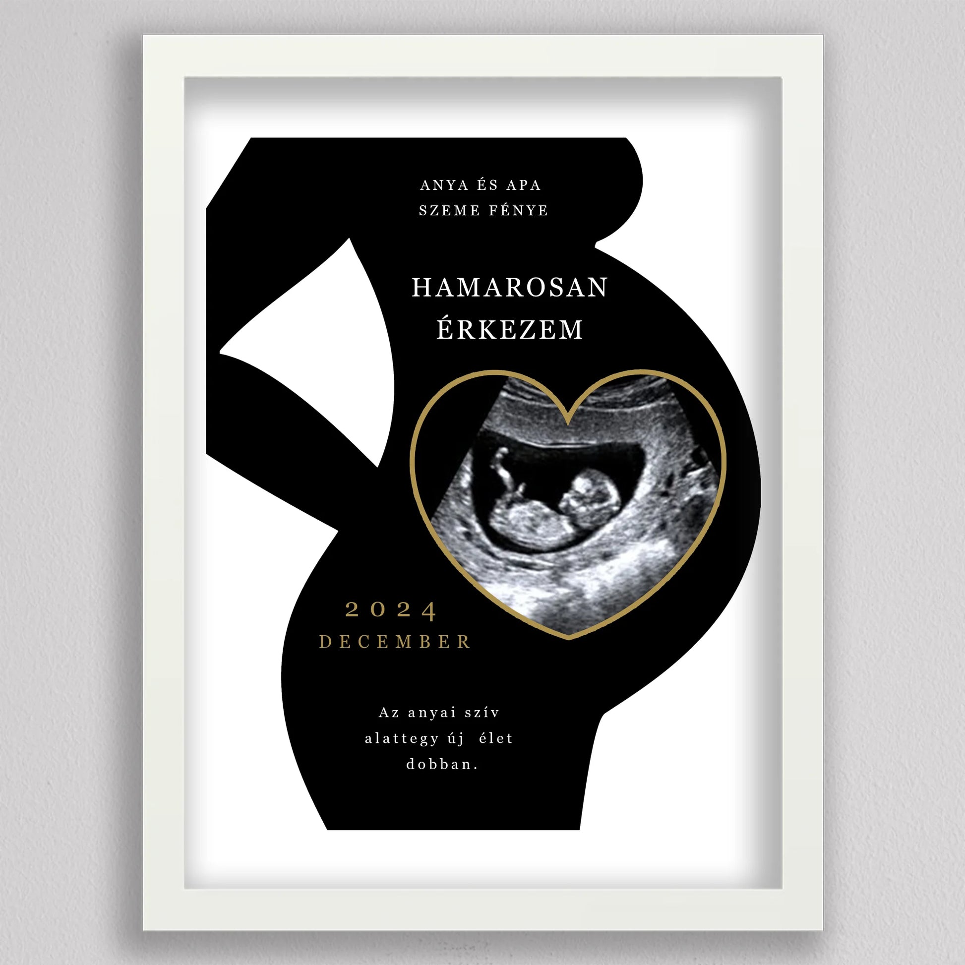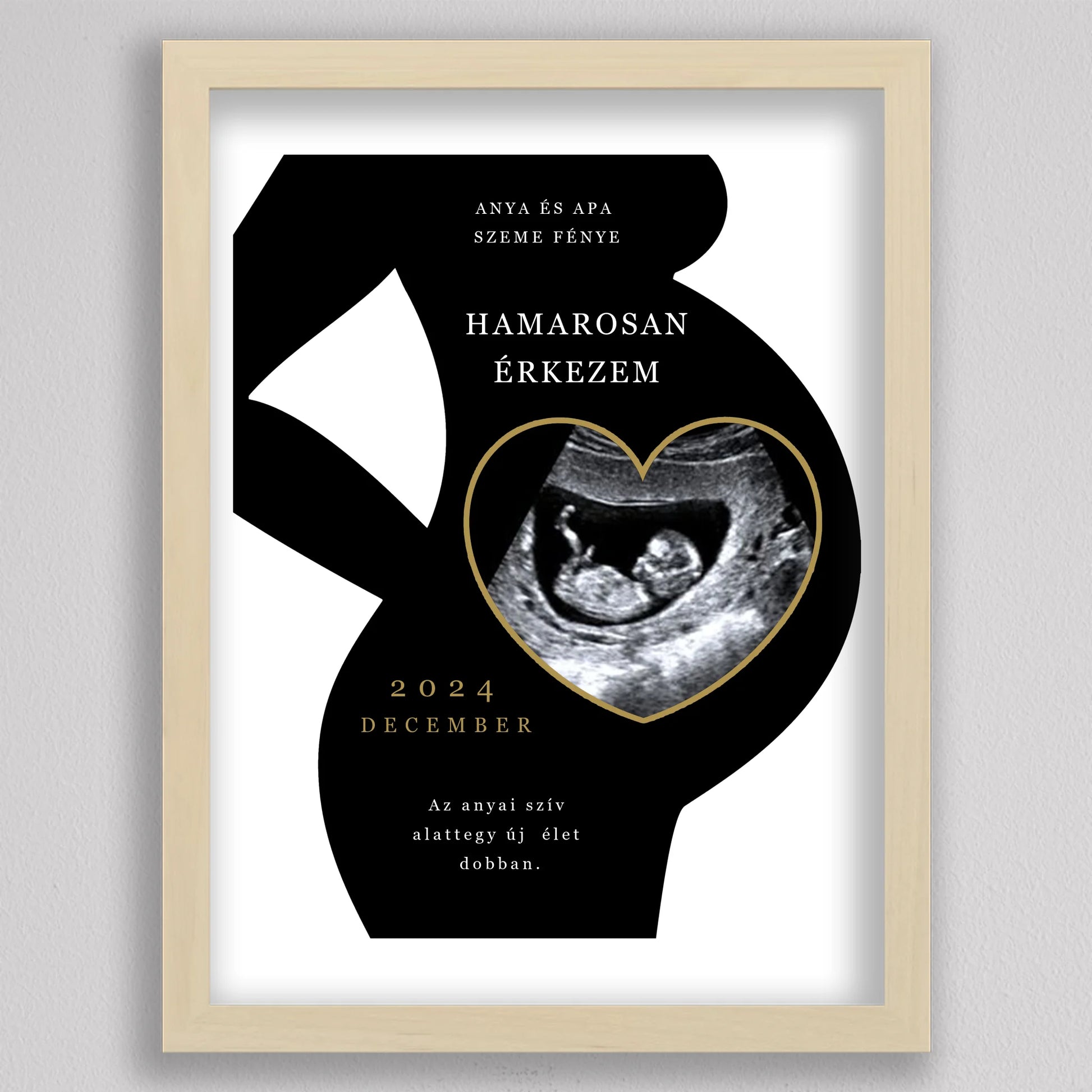 Babaváró Kismama fotó kollázs egy különleges és személyre szabható emlék, amely megörökíti a várandósság legcsodálatosabb pillanatait. A kollázs középpontjában a kisbaba ultrahangképe áll, amelyet a kismama sziluettje ölel körül, szív alakú keretben. Ez az elegáns és érzelmekkel teli dizájn tökéletesen kifejezi a szülői szeretet és az új élet várakozásának szépségét. Kiváló ajándék babaváró bulikra vagy emlékül a szülők számára, amely örökre megőrzi ezt a különleges időszakot. A kollázs teljes mértékben testreszabható, beleértve a szövegek, dátumok kiválasztását is, így tökéletesen illeszkedik a család ízléséhez.
