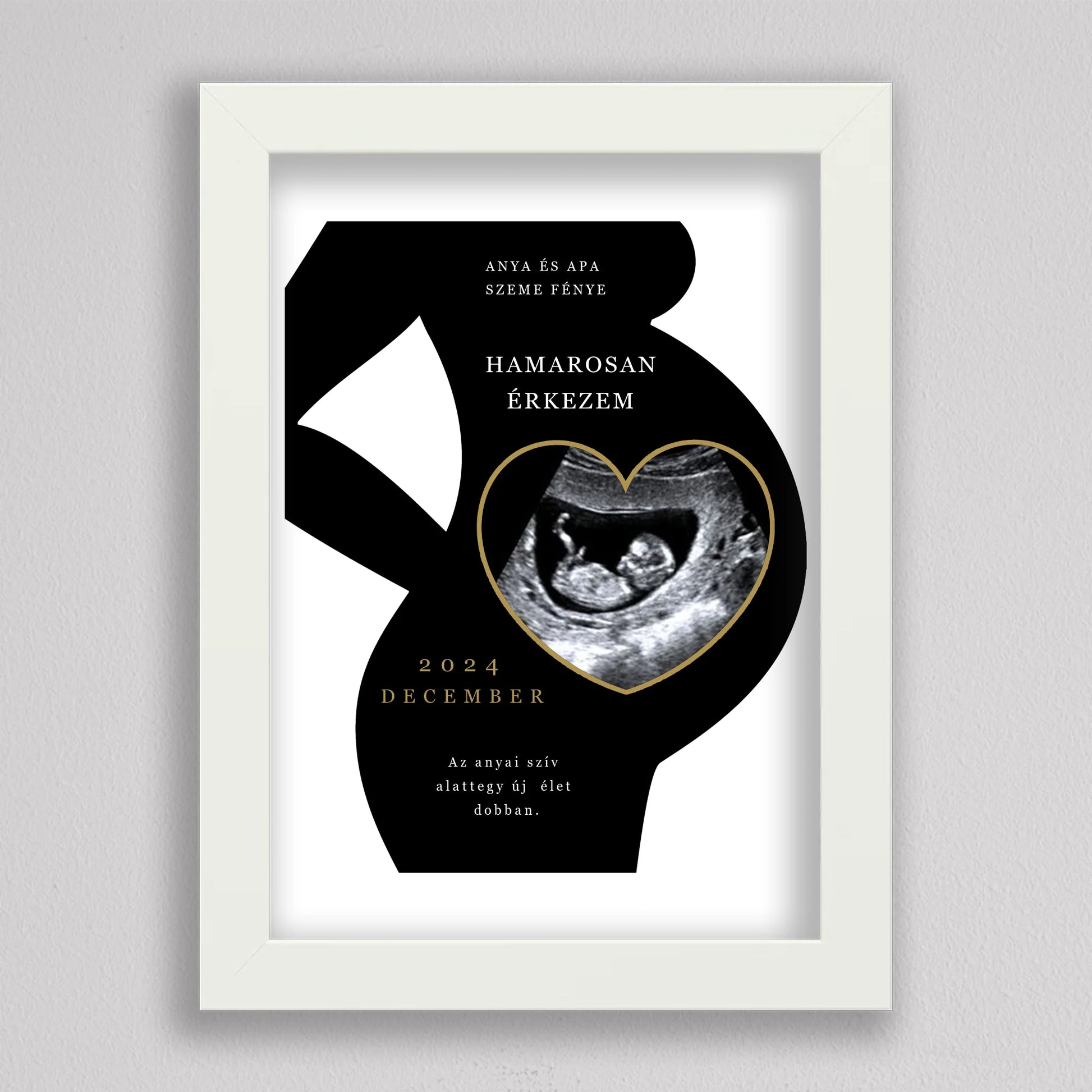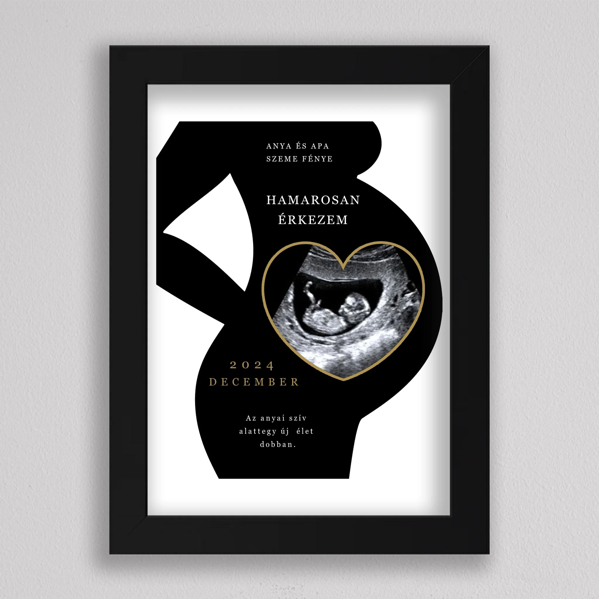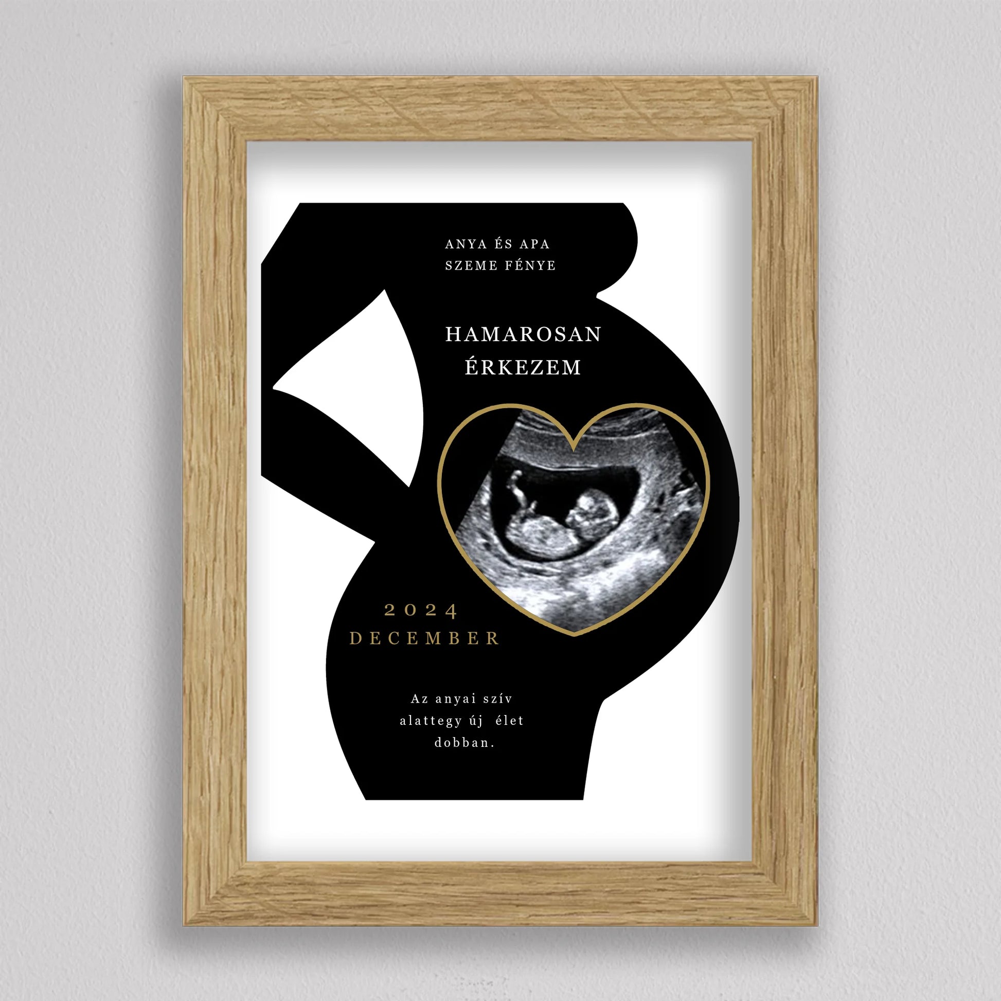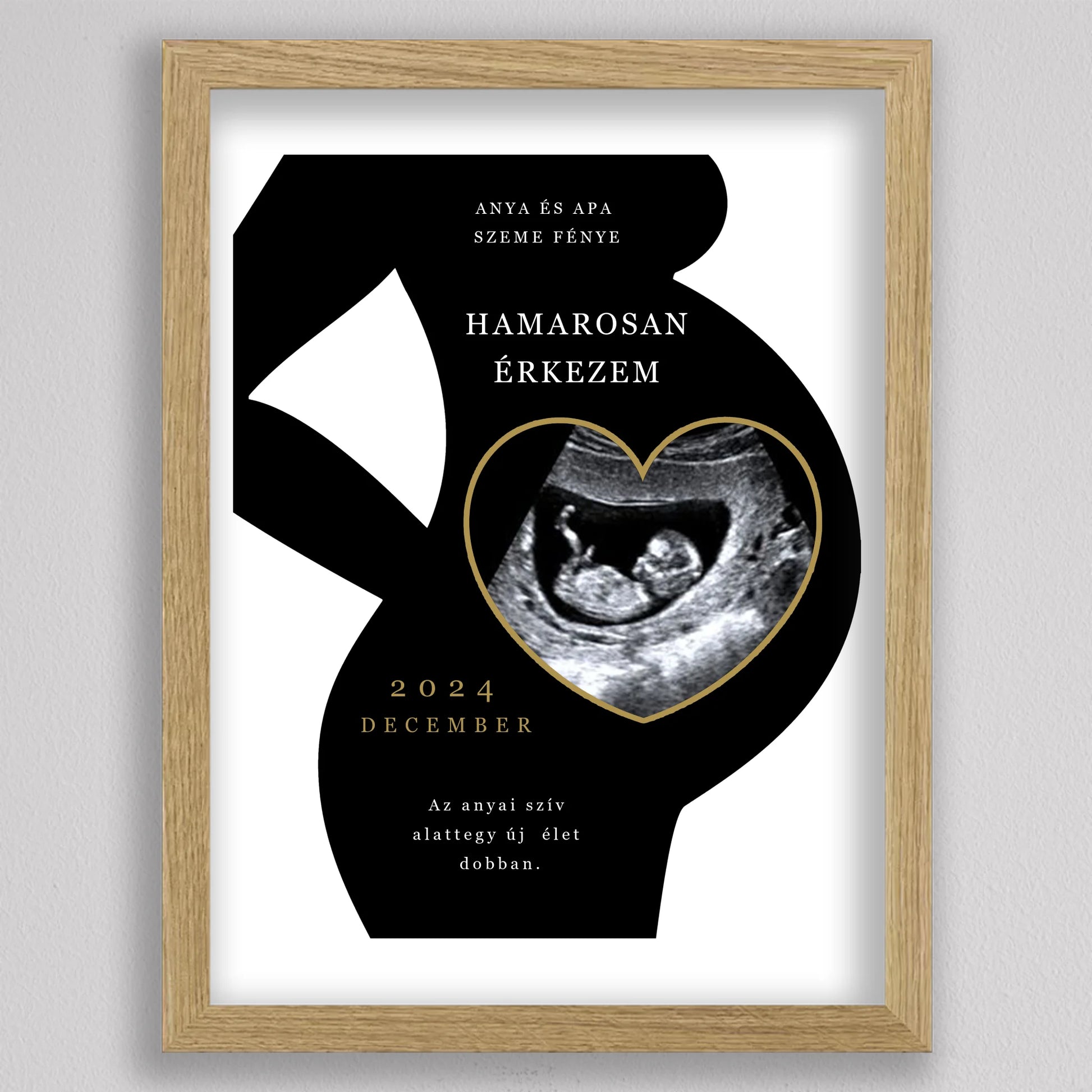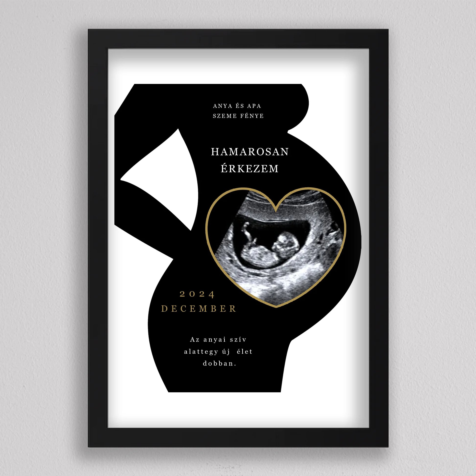 Babaváró Kismama fotó kollázs egy különleges és személyre szabható emlék, amely megörökíti a várandósság legcsodálatosabb pillanatait. A kollázs középpontjában a kisbaba ultrahangképe áll, amelyet a kismama sziluettje ölel körül, szív alakú keretben. Ez az elegáns és érzelmekkel teli dizájn tökéletesen kifejezi a szülői szeretet és az új élet várakozásának szépségét. Kiváló ajándék babaváró bulikra vagy emlékül a szülők számára, amely örökre megőrzi ezt a különleges időszakot. A kollázs teljes mértékben testreszabható, beleértve a szövegek, dátumok kiválasztását is, így tökéletesen illeszkedik a család ízléséhez.