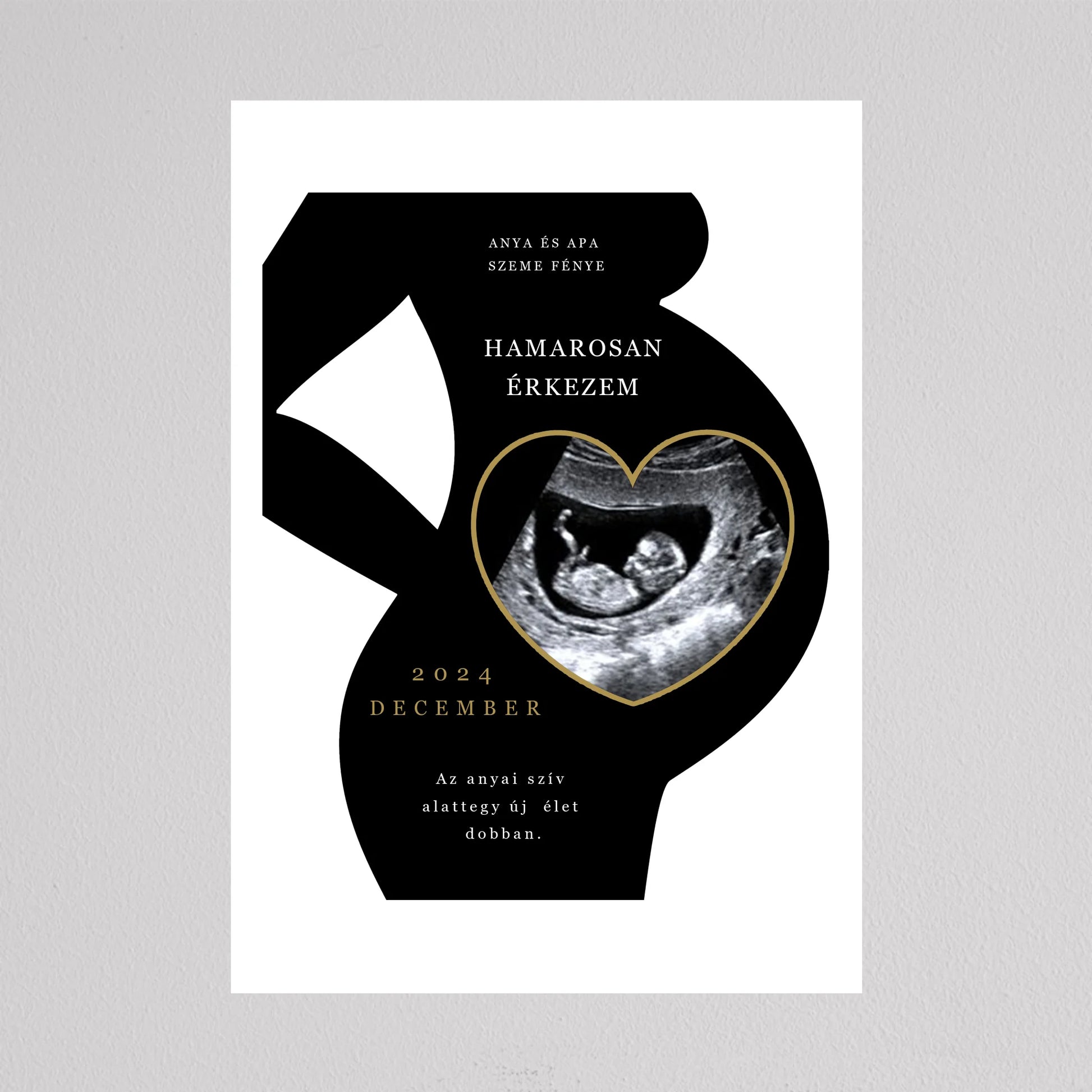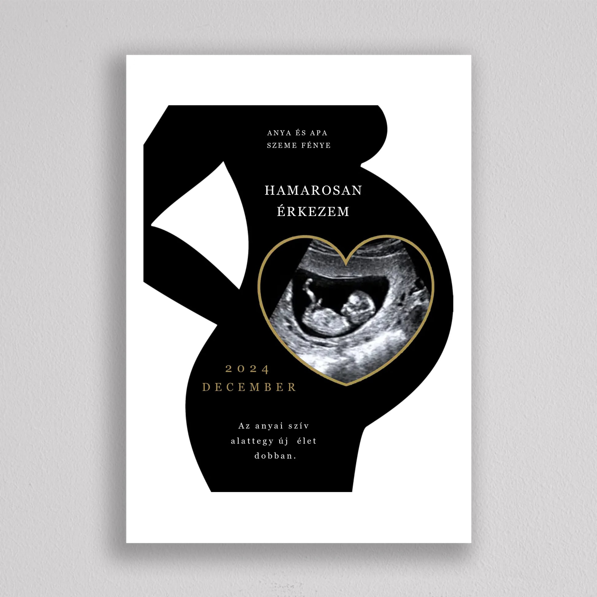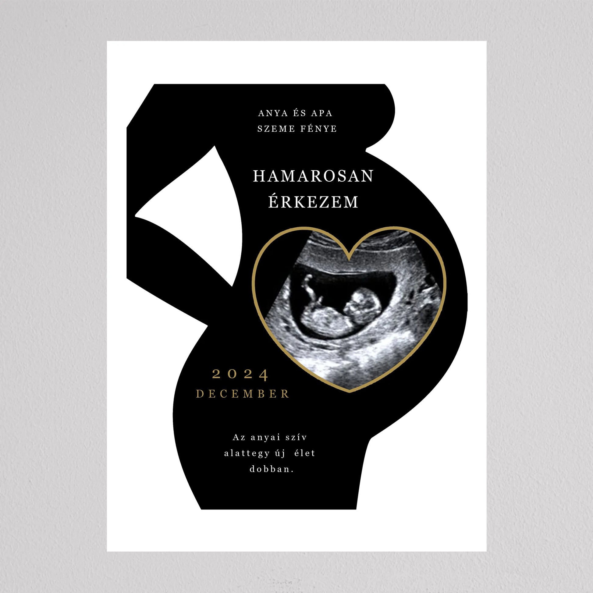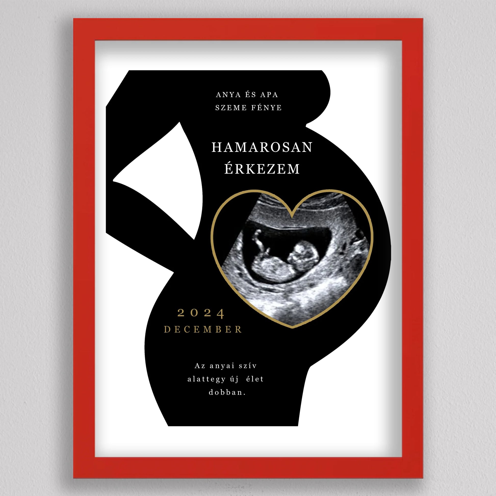 Babaváró Kismama fotó kollázs egy különleges és személyre szabható emlék, amely megörökíti a várandósság legcsodálatosabb pillanatait. A kollázs középpontjában a kisbaba ultrahangképe áll, amelyet a kismama sziluettje ölel körül, szív alakú keretben. Ez az elegáns és érzelmekkel teli dizájn tökéletesen kifejezi a szülői szeretet és az új élet várakozásának szépségét. Kiváló ajándék babaváró bulikra vagy emlékül a szülők számára, amely örökre megőrzi ezt a különleges időszakot. A kollázs teljes mértékben testreszabható, beleértve a szövegek, dátumok kiválasztását is, így tökéletesen illeszkedik a család ízléséhez.