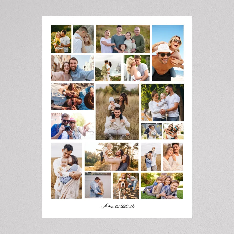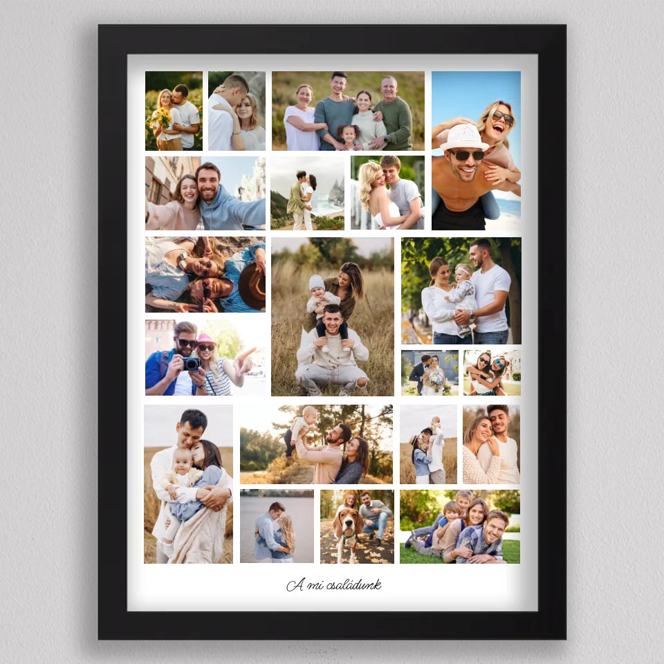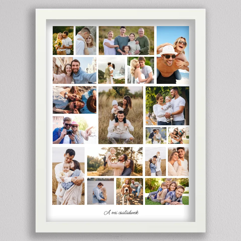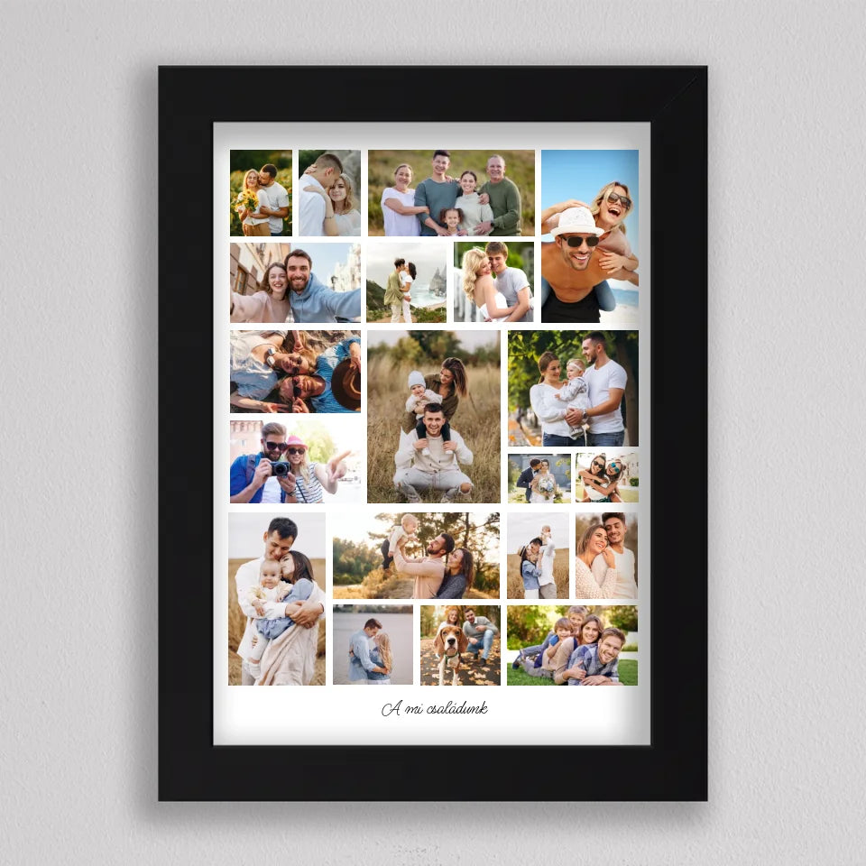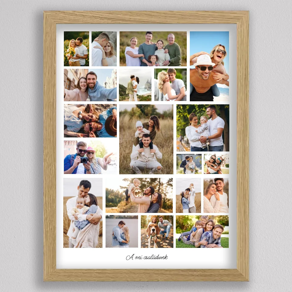 Egyedi Családi fotó kollázs - 20 képpel ideális választás minden olyan család számára, akik szeretnék egyetlen gyönyörű dekorációban megörökíteni legkedvesebb pillanataikat. A 20 képből álló kollázs személyre szabható, így minden fotó helyet kap a különleges pillanatok megőrzésére, legyen szó nyaralásról, születésnapokról, vagy családi ünnepekről. Az egyedi háttér évszak szerint változtatható, így mindig harmóniában lesz az otthonod aktuális dekorációjával. A prémium minőségű nyomtatás és elegáns keret garantálja, hogy a kollázs kiemelt helyet kapjon a nappaliban vagy a családi szobában. Ez az esztétikus és személyes dekoráció tökéletes ajándék lehet bármelyik családtag számára, aki szereti az emlékek ápolását.