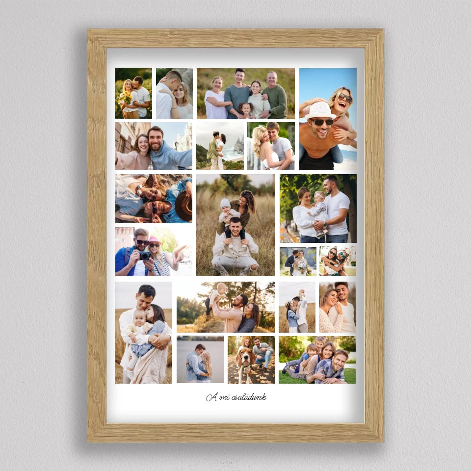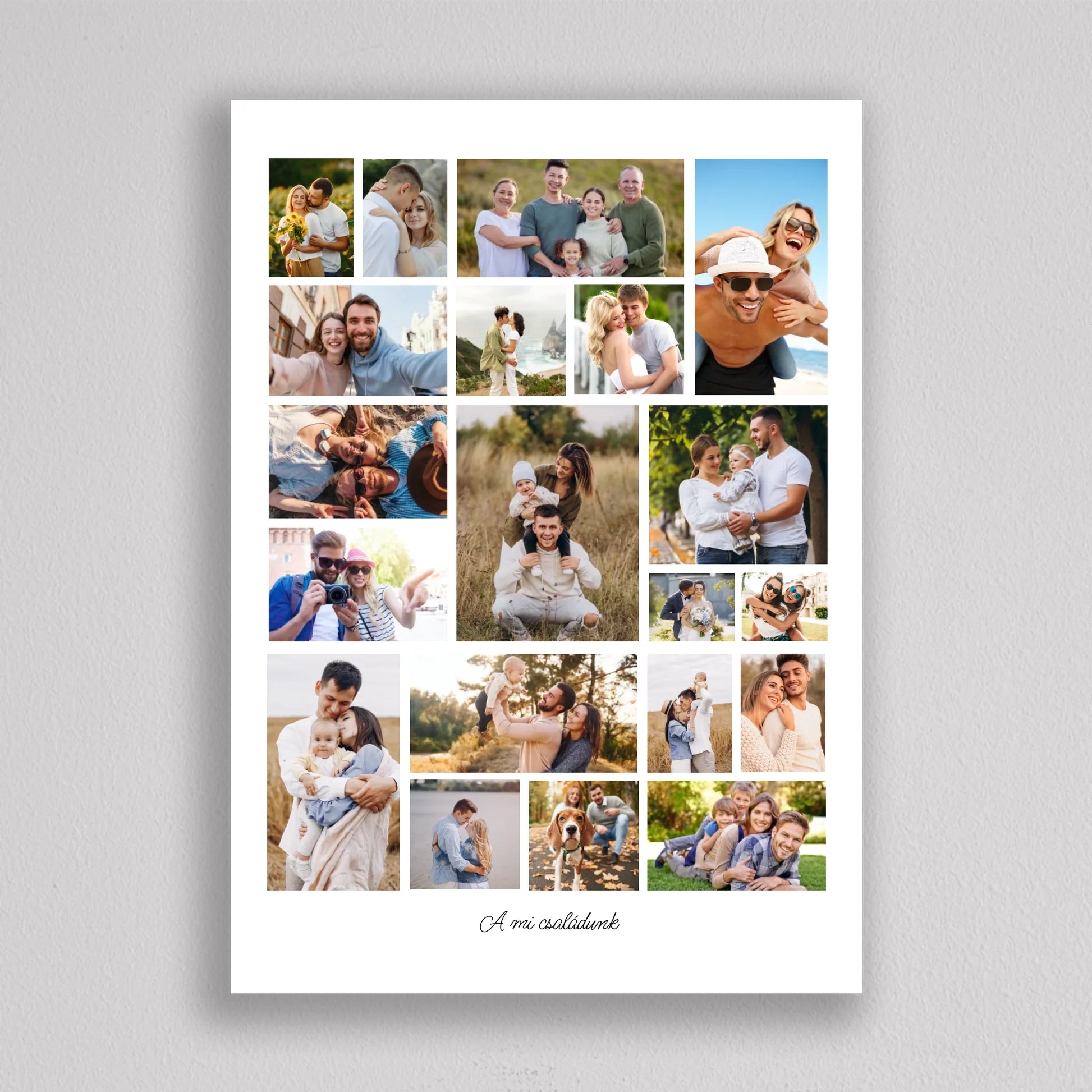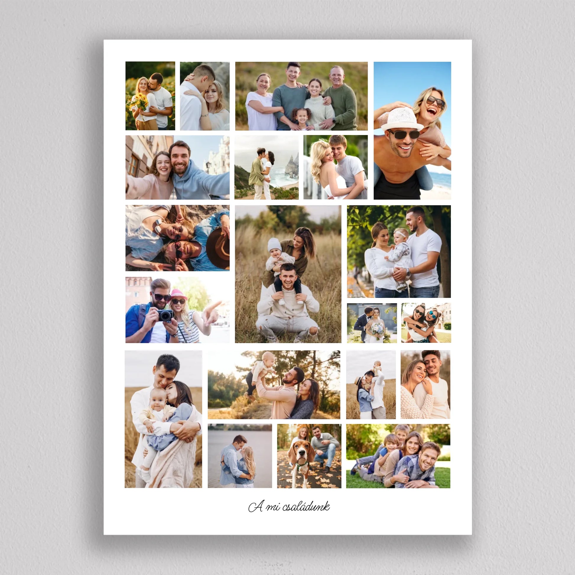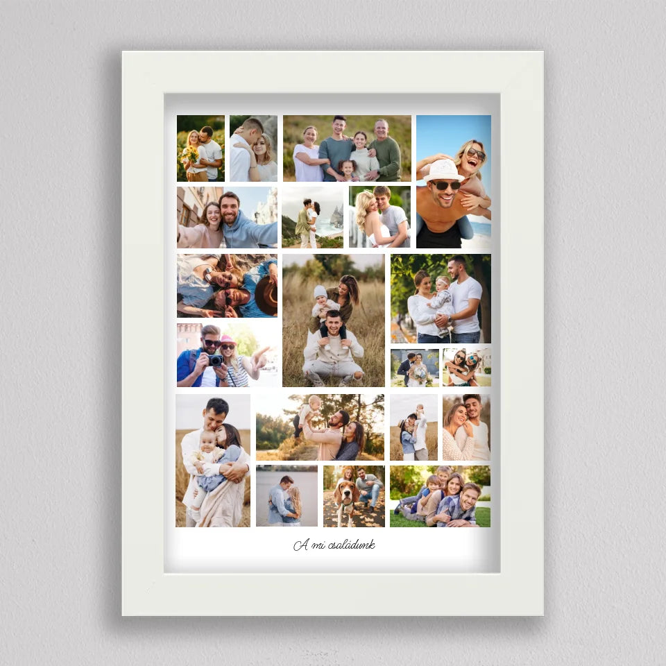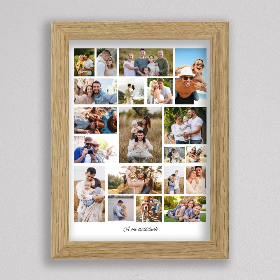 Egyedi Családi fotó kollázs - 20 képpel ideális választás minden olyan család számára, akik szeretnék egyetlen gyönyörű dekorációban megörökíteni legkedvesebb pillanataikat. A 20 képből álló kollázs személyre szabható, így minden fotó helyet kap a különleges pillanatok megőrzésére, legyen szó nyaralásról, születésnapokról, vagy családi ünnepekről. Az egyedi háttér évszak szerint változtatható, így mindig harmóniában lesz az otthonod aktuális dekorációjával. A prémium minőségű nyomtatás és elegáns keret garantálja, hogy a kollázs kiemelt helyet kapjon a nappaliban vagy a családi szobában. Ez az esztétikus és személyes dekoráció tökéletes ajándék lehet bármelyik családtag számára, aki szereti az emlékek ápolását.