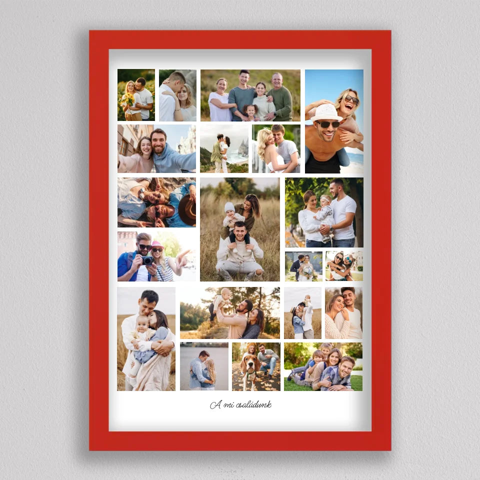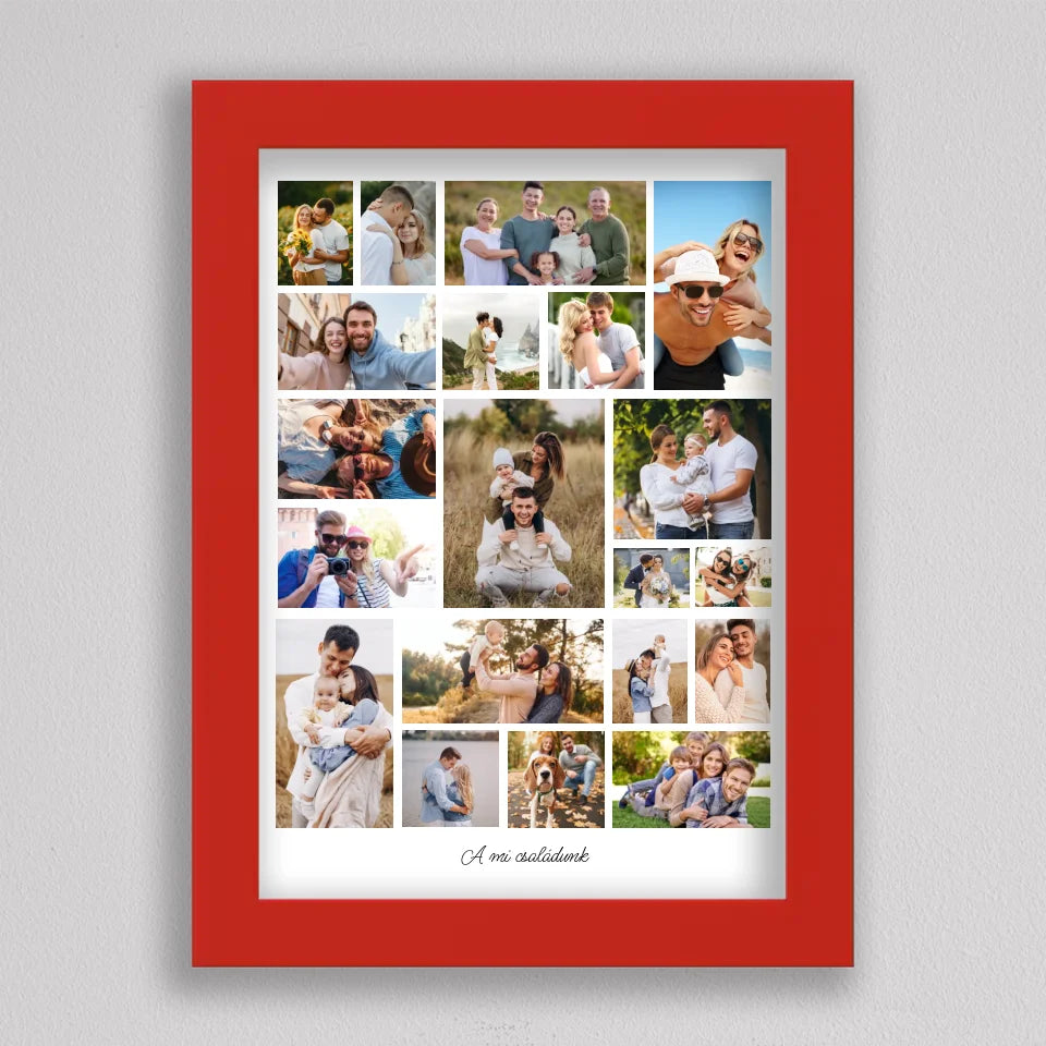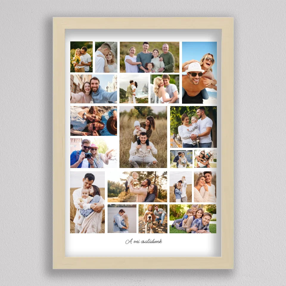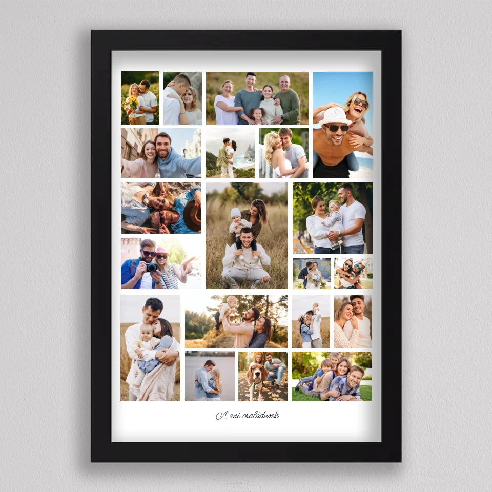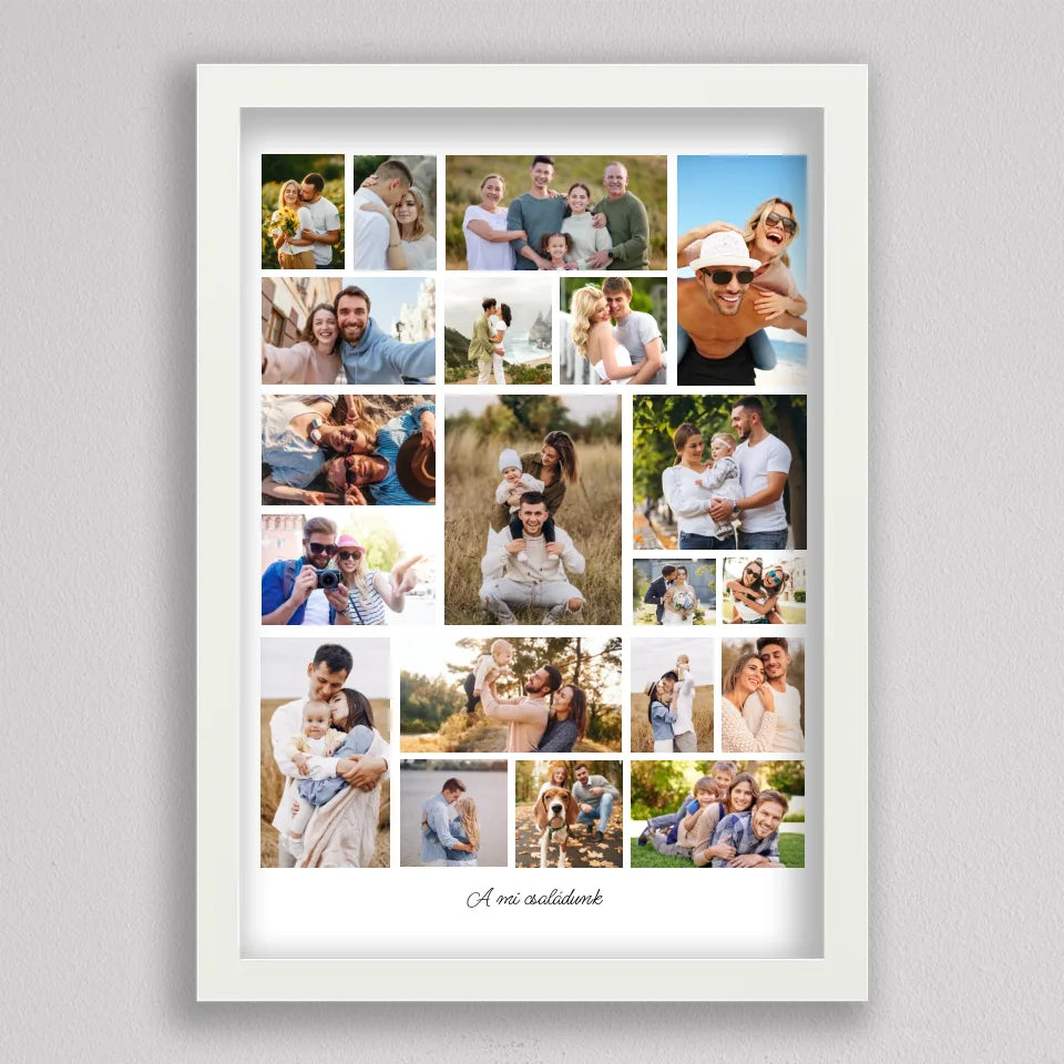 Egyedi Családi fotó kollázs - 20 képpel ideális választás minden olyan család számára, akik szeretnék egyetlen gyönyörű dekorációban megörökíteni legkedvesebb pillanataikat. A 20 képből álló kollázs személyre szabható, így minden fotó helyet kap a különleges pillanatok megőrzésére, legyen szó nyaralásról, születésnapokról, vagy családi ünnepekről. Az egyedi háttér évszak szerint változtatható, így mindig harmóniában lesz az otthonod aktuális dekorációjával. A prémium minőségű nyomtatás és elegáns keret garantálja, hogy a kollázs kiemelt helyet kapjon a nappaliban vagy a családi szobában. Ez az esztétikus és személyes dekoráció tökéletes ajándék lehet bármelyik családtag számára, aki szereti az emlékek ápolását.