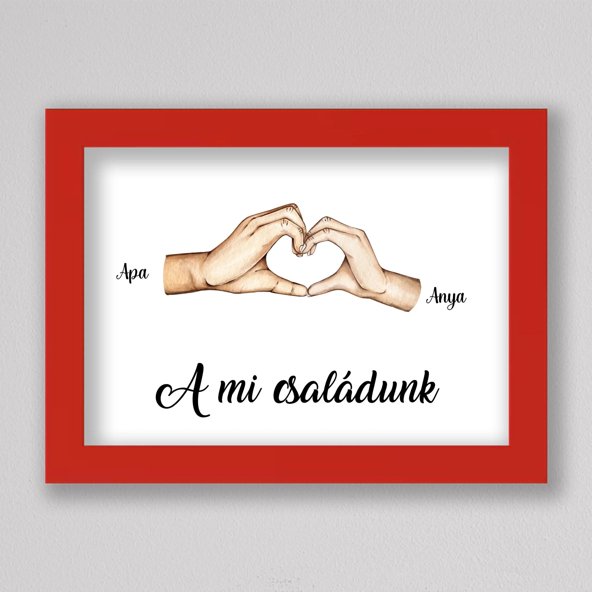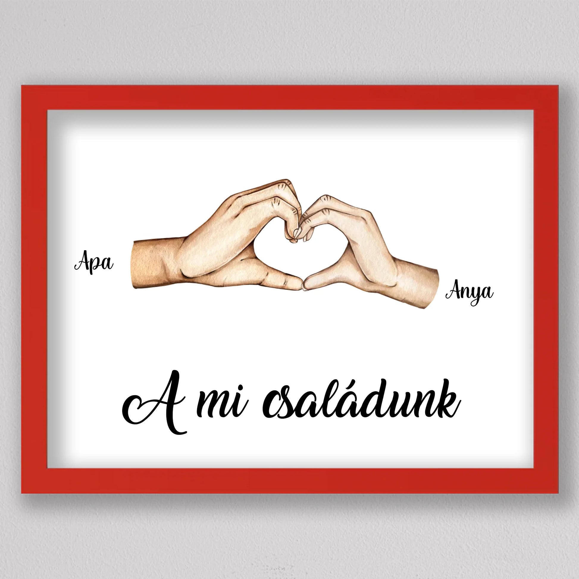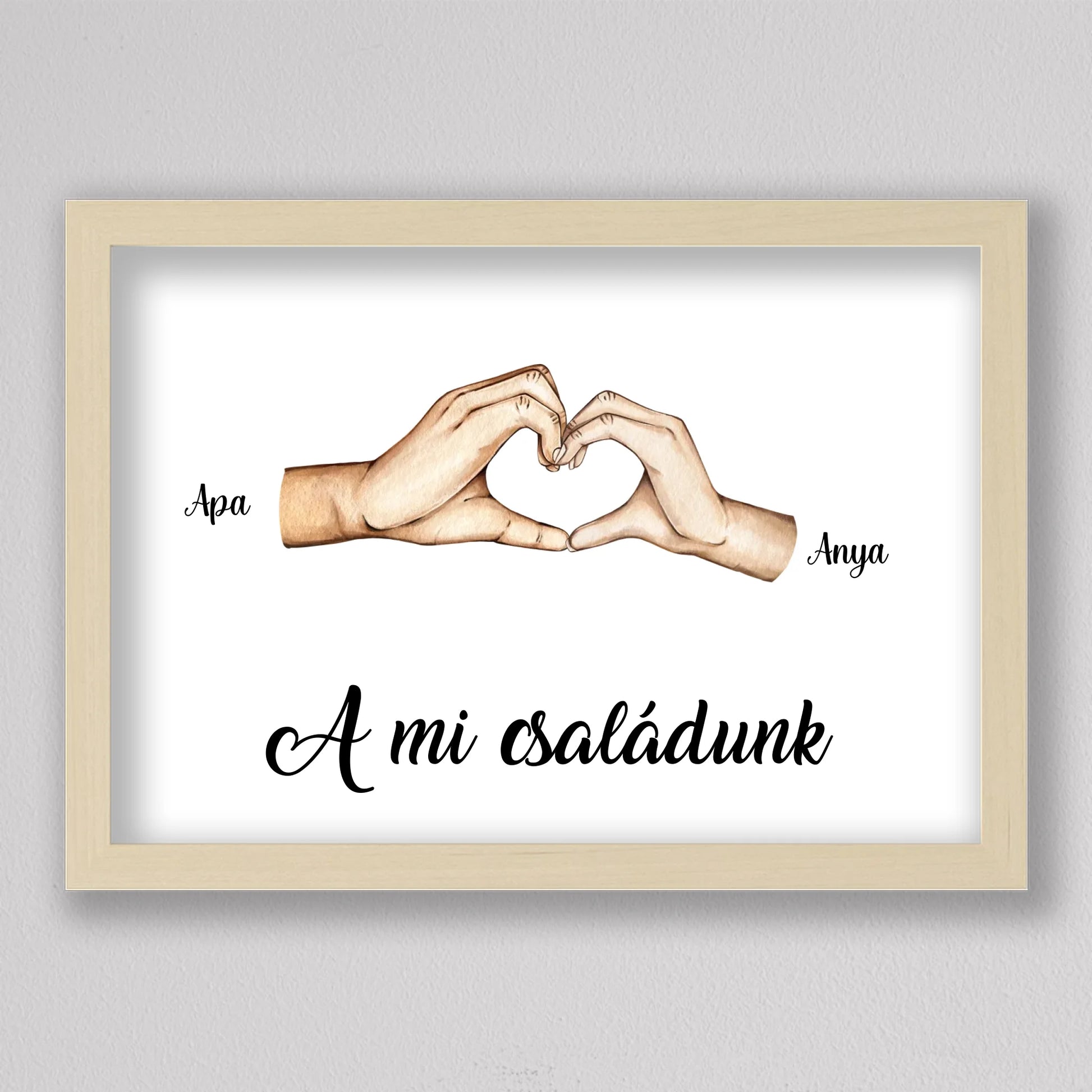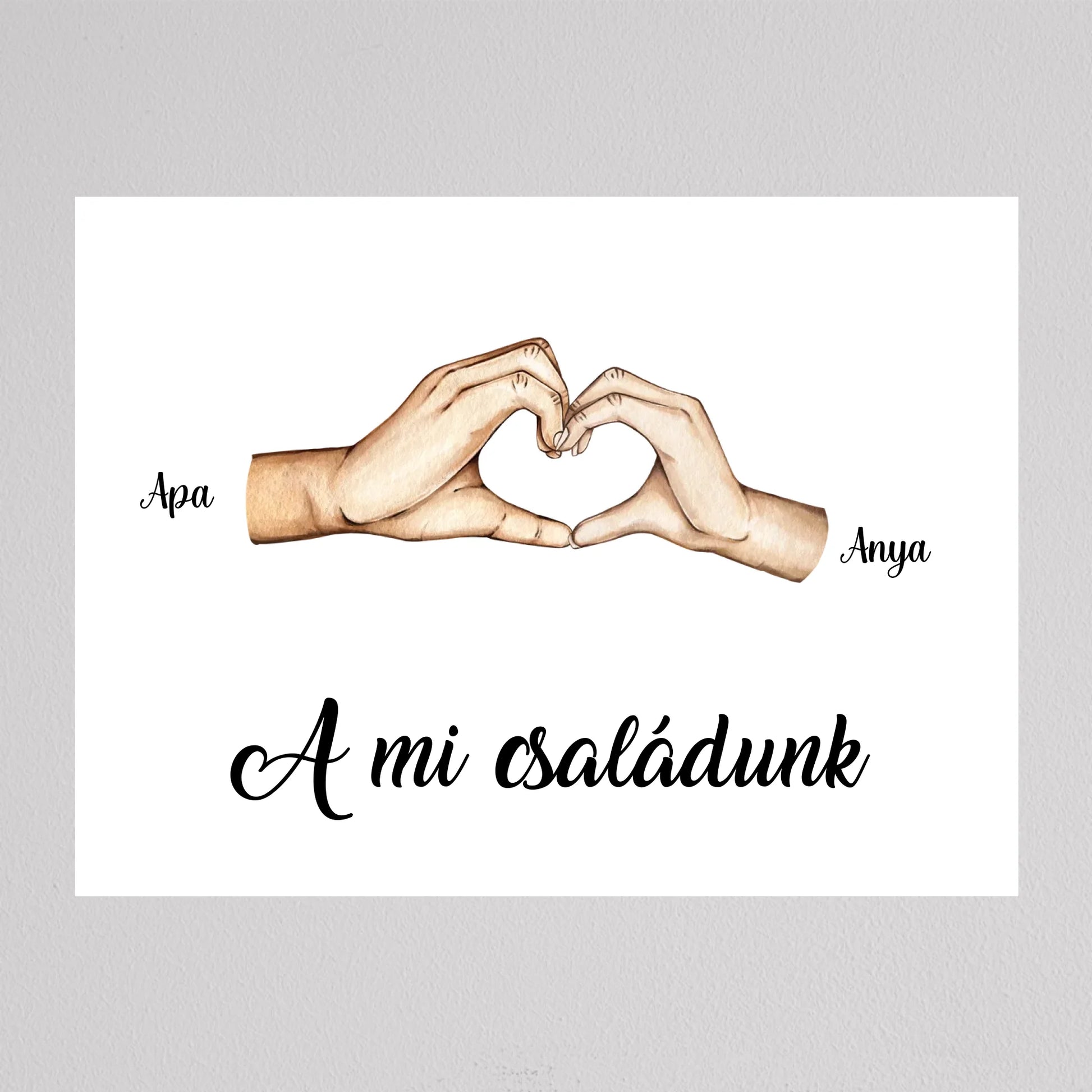 Egy különleges illusztráció, amely szívet melengető módon örökíti meg a család összetartozását. A Családi kezek illusztráció gyönyörű, kézzel rajzolt hatású grafika, ahol a szülők és gyermekek kezei egy szív formát alkotnak – szimbolizálva a szeretetet és az egységet. A termék teljesen személyre szabható: a családtagok neveit te adod meg, így igazán egyedi ajándék lehet születésnapra, anyák napjára vagy karácsonyra. Letisztult, esztétikus stílusa miatt bármilyen otthon méltó dísze lehet, ráadásul többféle méretben és akár keretezve is rendelhető. Ha olyan faliképet keresel, amely nemcsak szép, de mély érzelmi töltettel is bír, akkor ez a tökéletes választás.