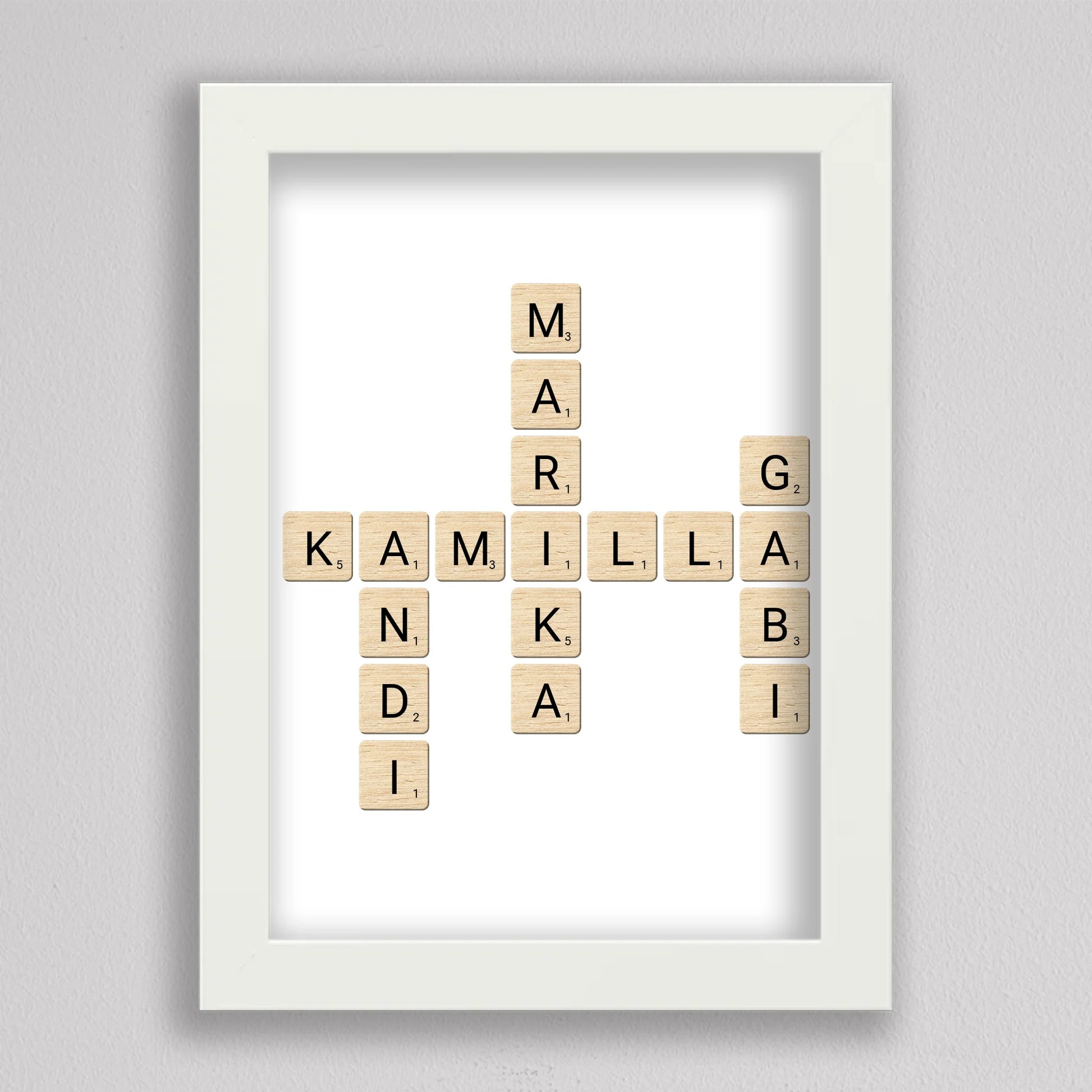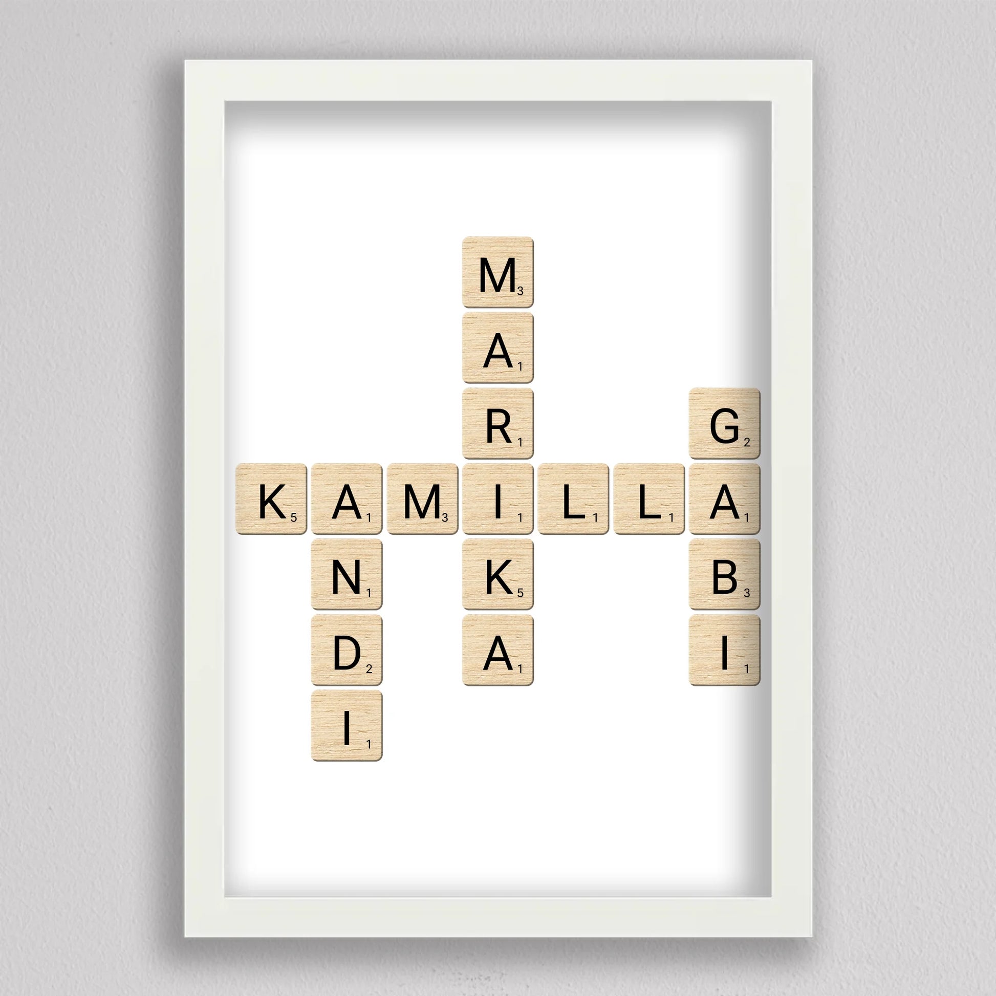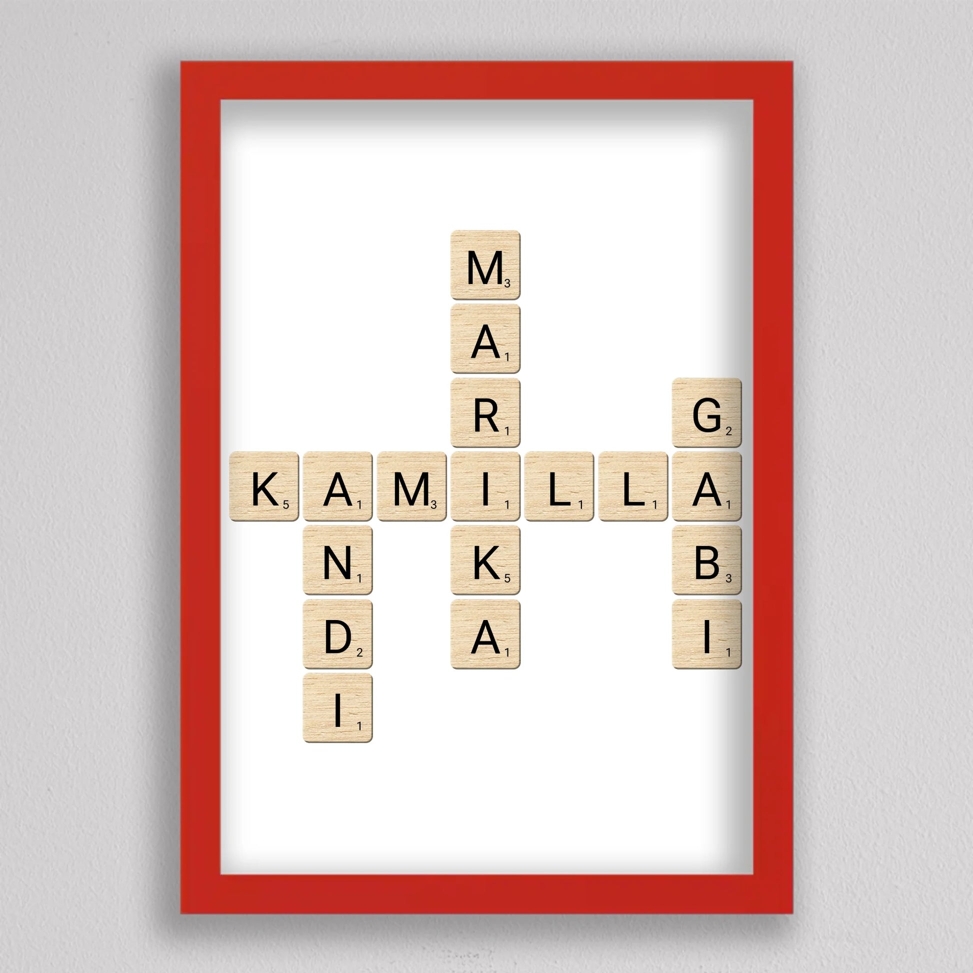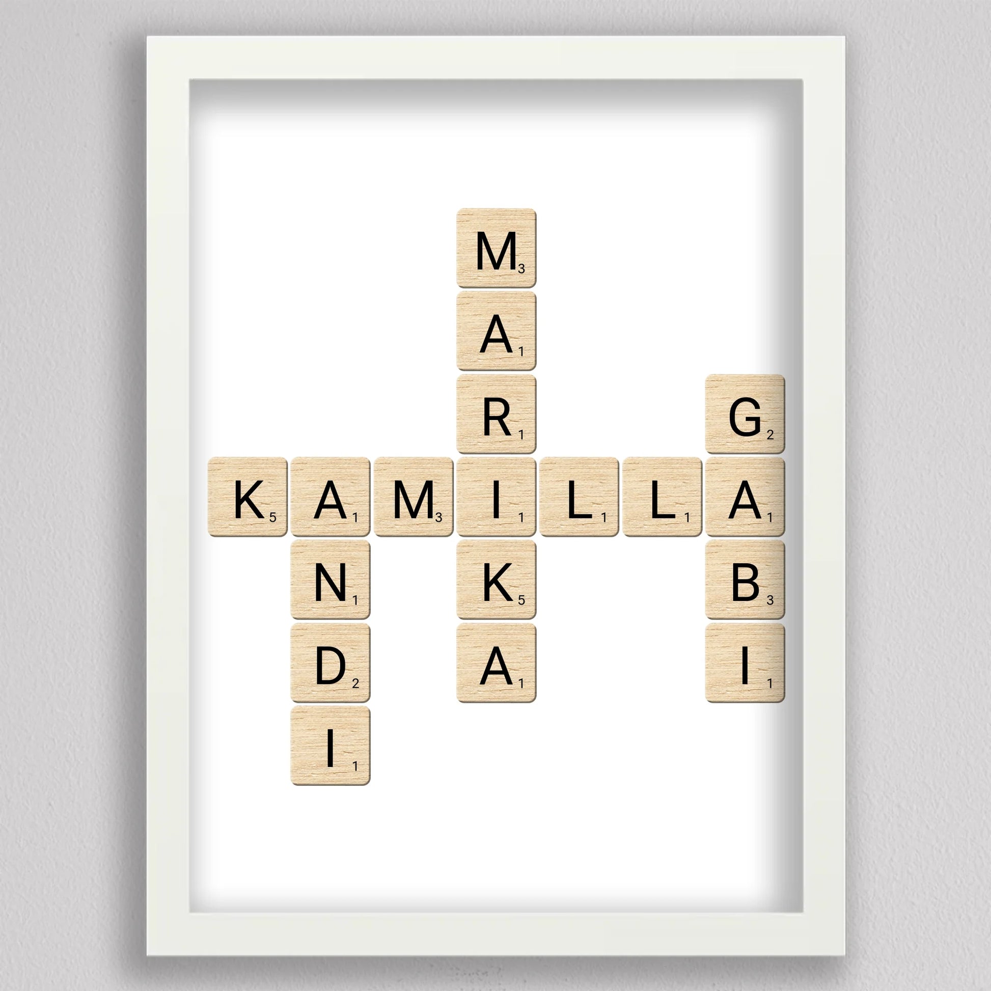 A Családi Scrabble szókirakó #1 egyedi illusztráció tökéletes ajándék minden család számára, akik szeretnék megörökíteni és kifejezni összetartozásukat egy kreatív és játékos módon. A keresztrejtvényszerű kialakítás lehetőséget ad arra, hogy a családtagok neveit egymáshoz illeszkedve jelenítse meg, így egy igazán személyre szabott és különleges dekorációs elem születik. A termék kiváló minőségű nyomtatásban készül, esztétikus kerettel, így bármely otthon dísze lehet. Ideális választás születésnapokra, évfordulókra, karácsonyi ajándékként, vagy bármilyen alkalomra, amikor valami személyeset és különlegeset szeretnél ajándékozni.