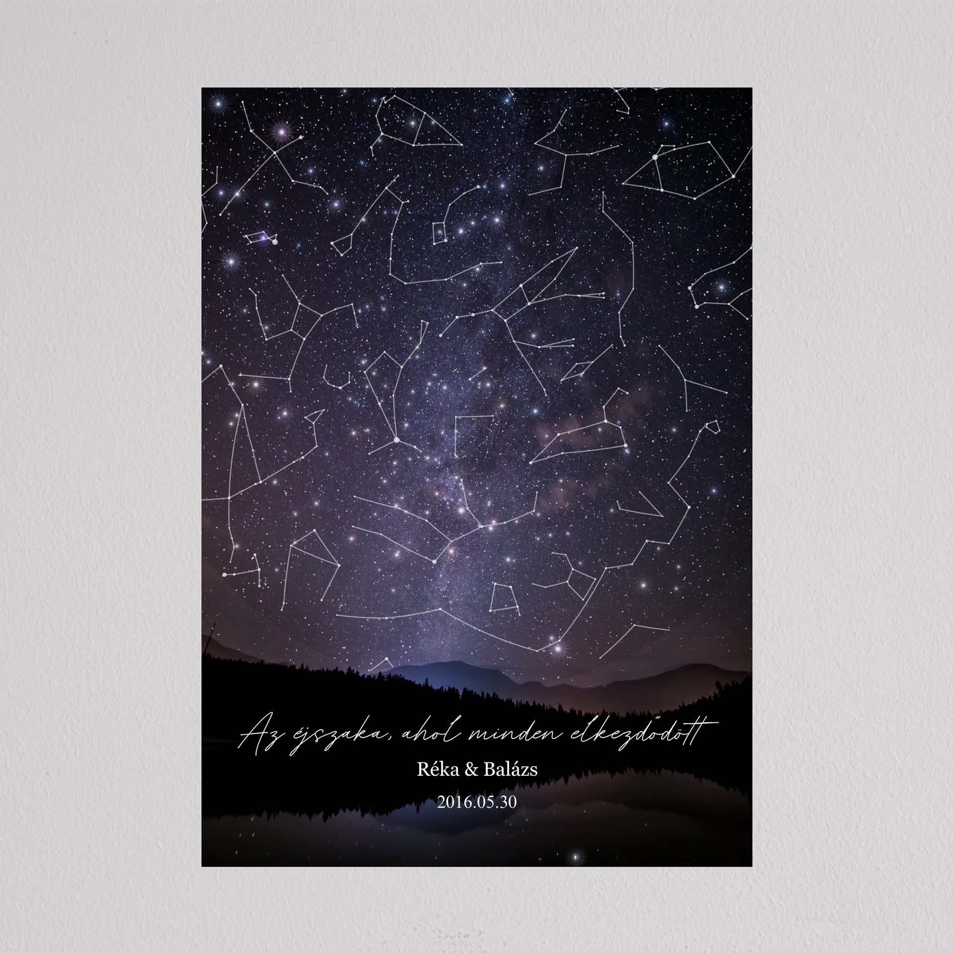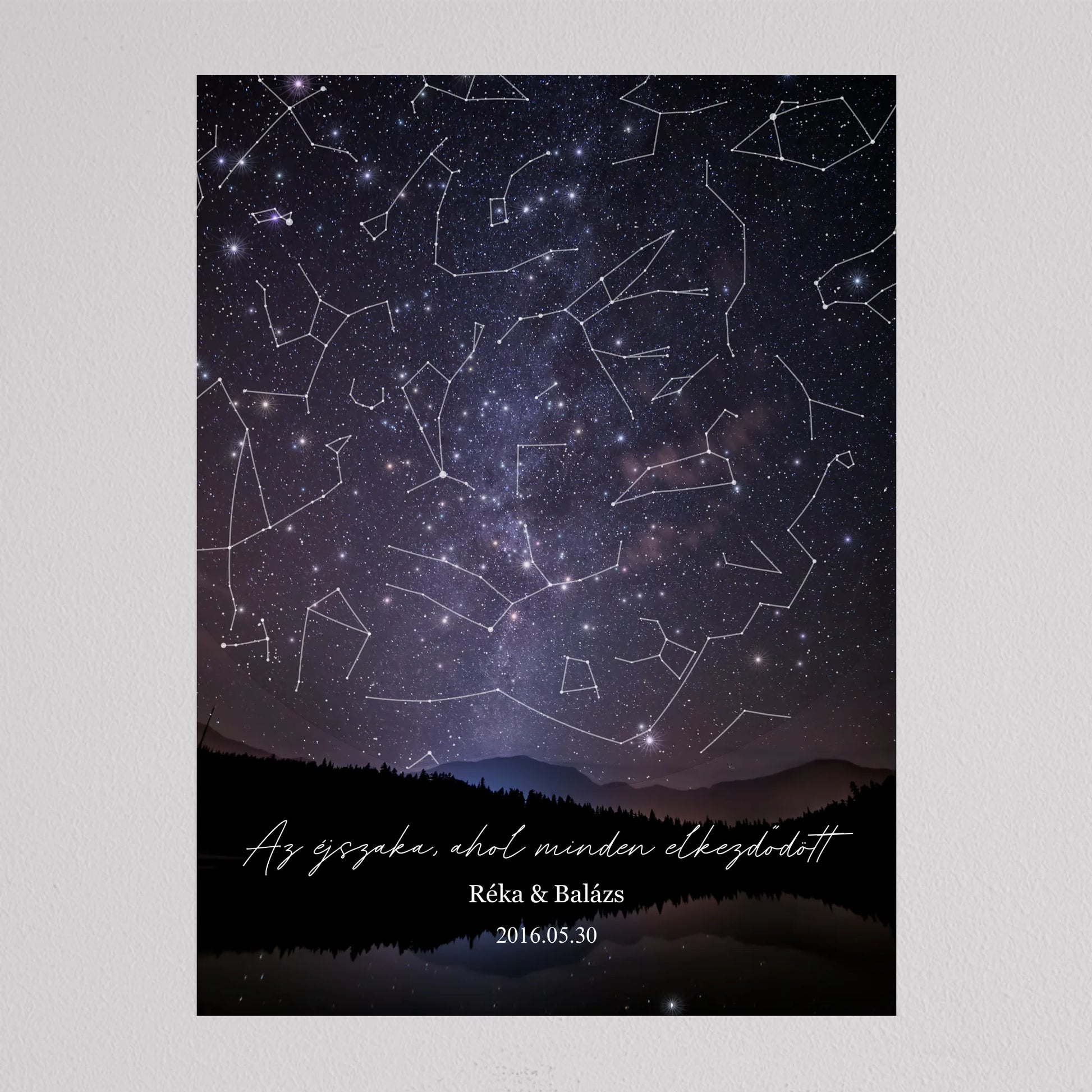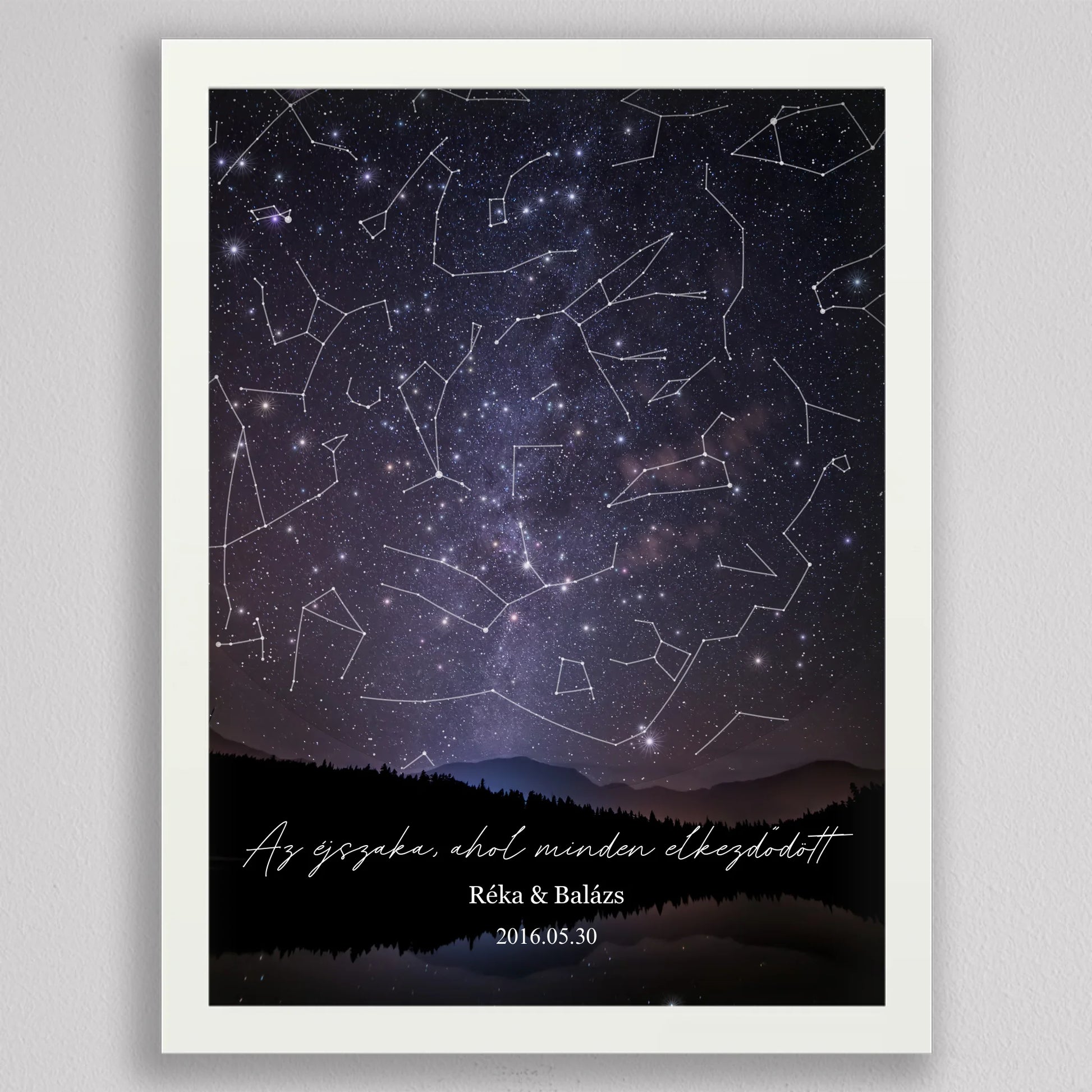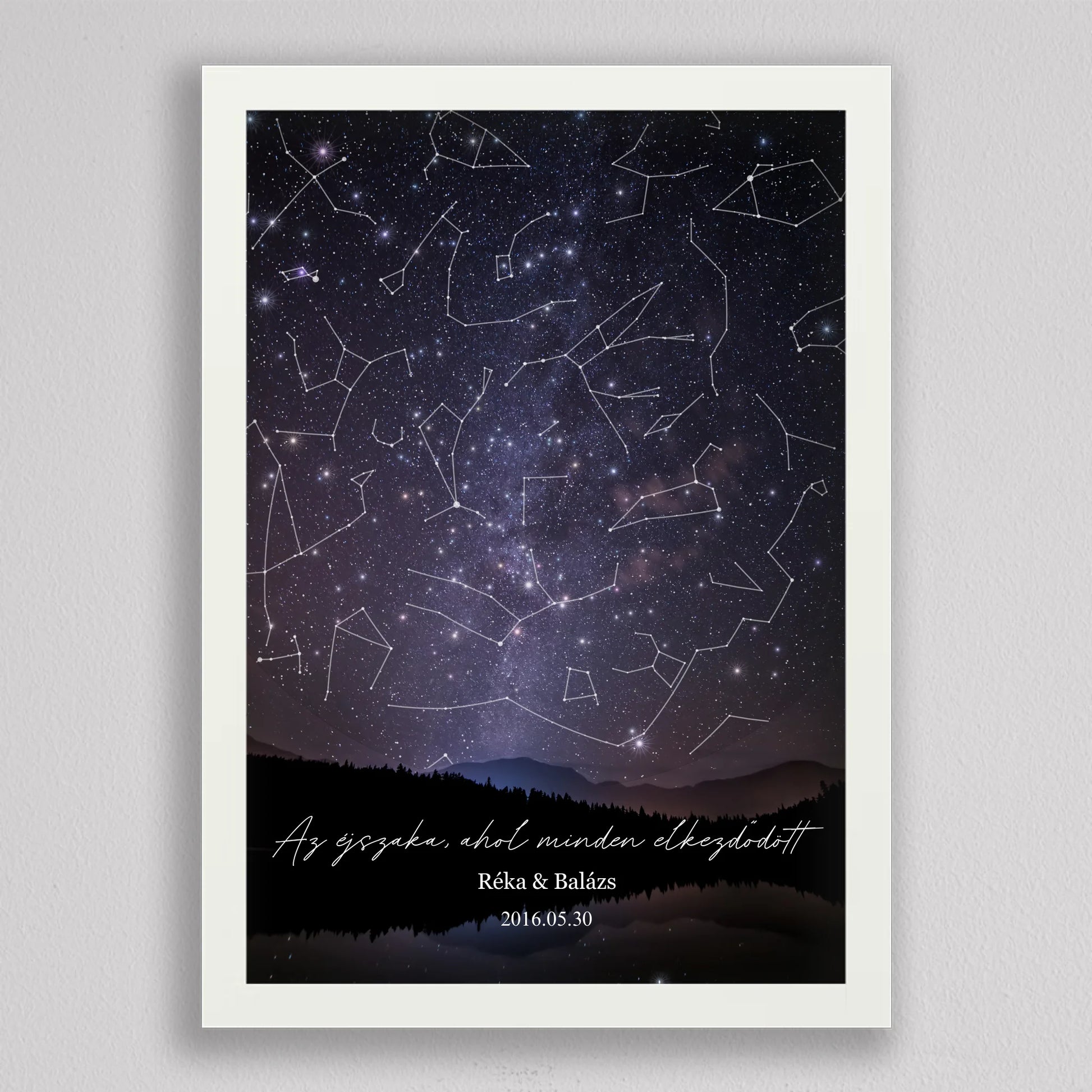A Csillagtérkép tájképes égbolton poszter varázslatos módon örökíti meg azt az éjszakát, amikor minden elkezdődött. Egy adott időpont és hely alapján megrajzolt csillagállás jelenik meg az égen, lenyűgöző hegyvidéki tájjal a háttérben – így válik igazán különlegessé és meghitté az ajándék. Teljesen személyre szabható: megadhatod a nevet, dátumot és helyszínt, hogy a csillagok pontosan azt a pillanatot tükrözzék, ami nektek a legtöbbet jelenti. Tökéletes választás évfordulóra, születésnapra, eljegyzésre vagy akár nászajándékként is. A letisztult dizájn minden enteriőrbe illeszkedik, miközben mély érzelmi értéket hordoz.