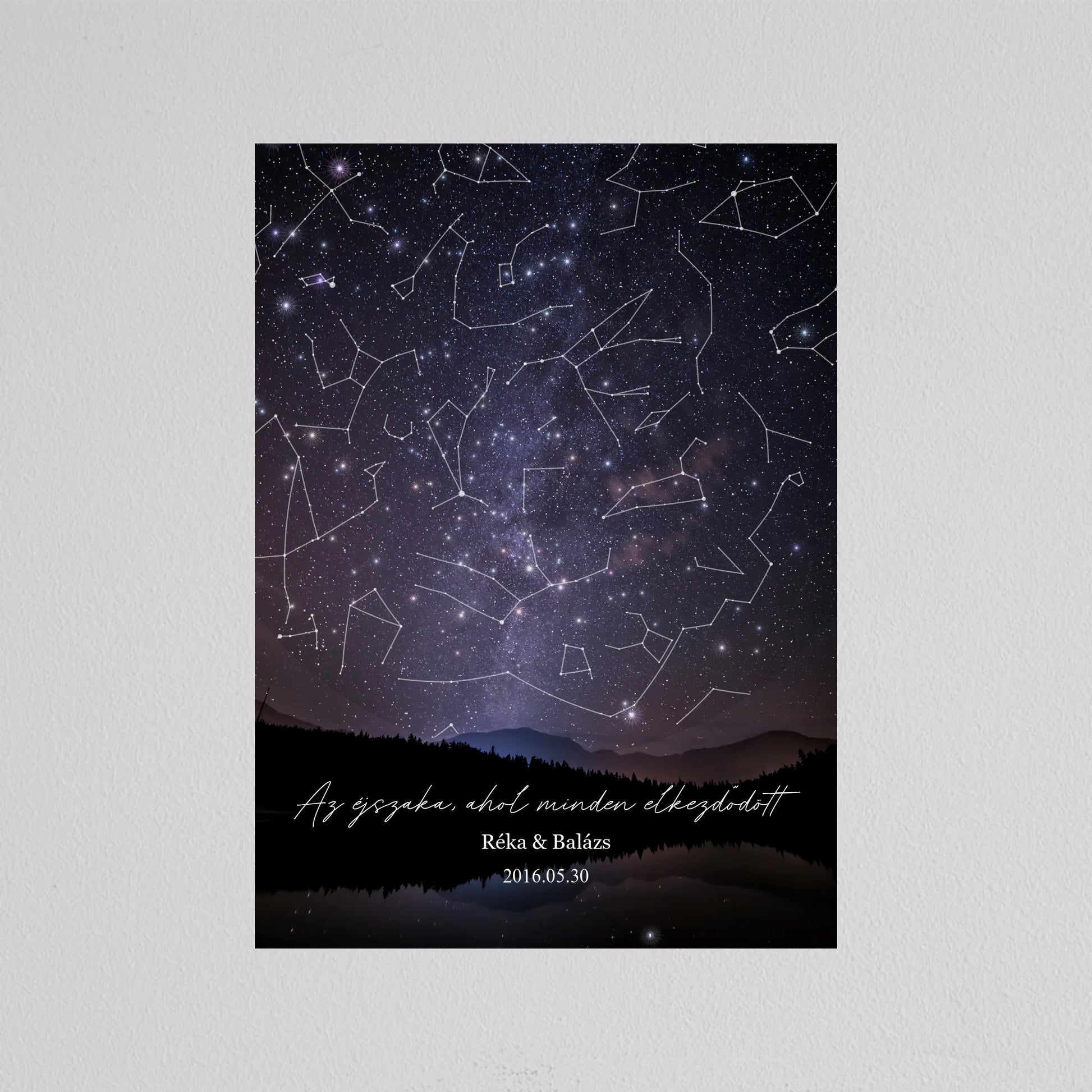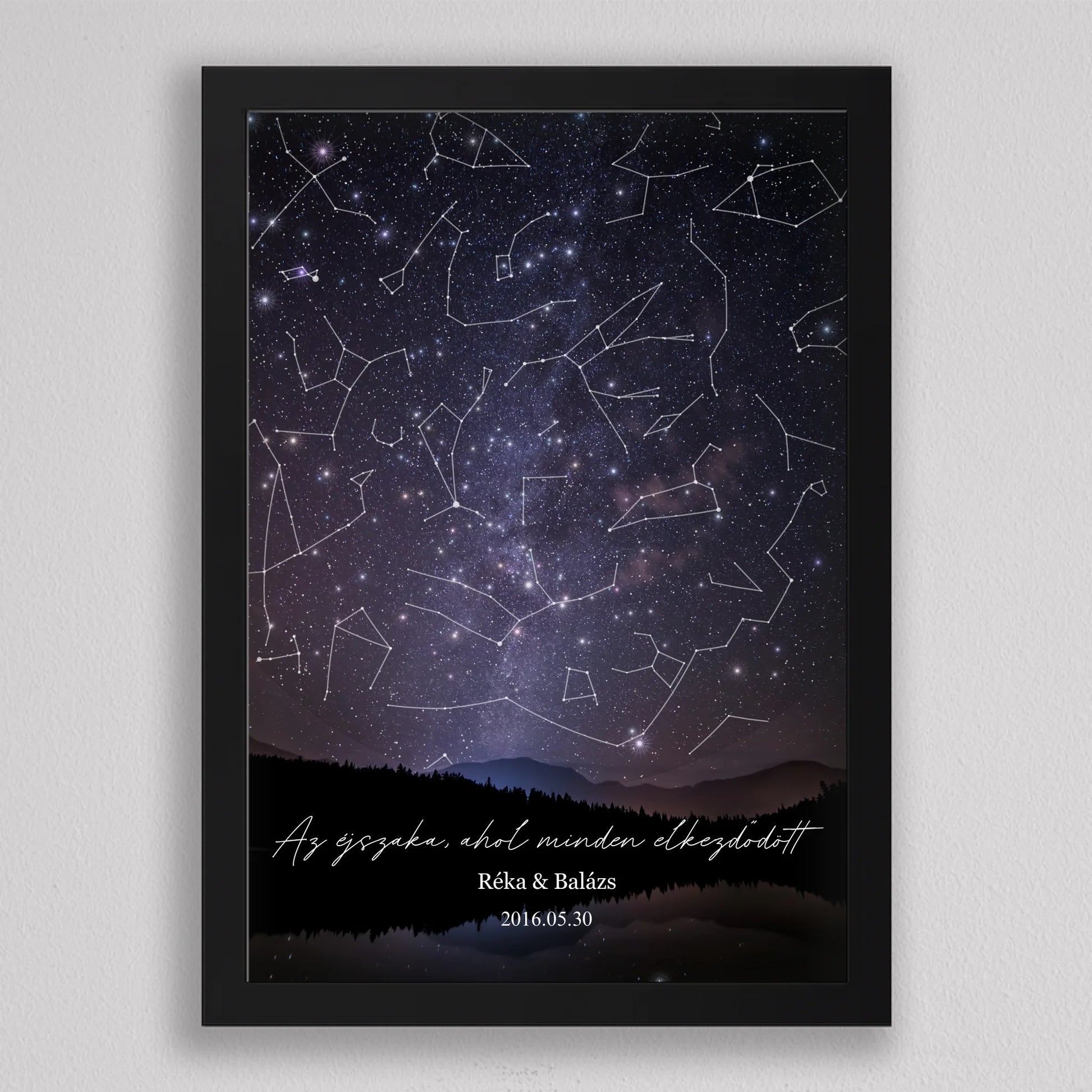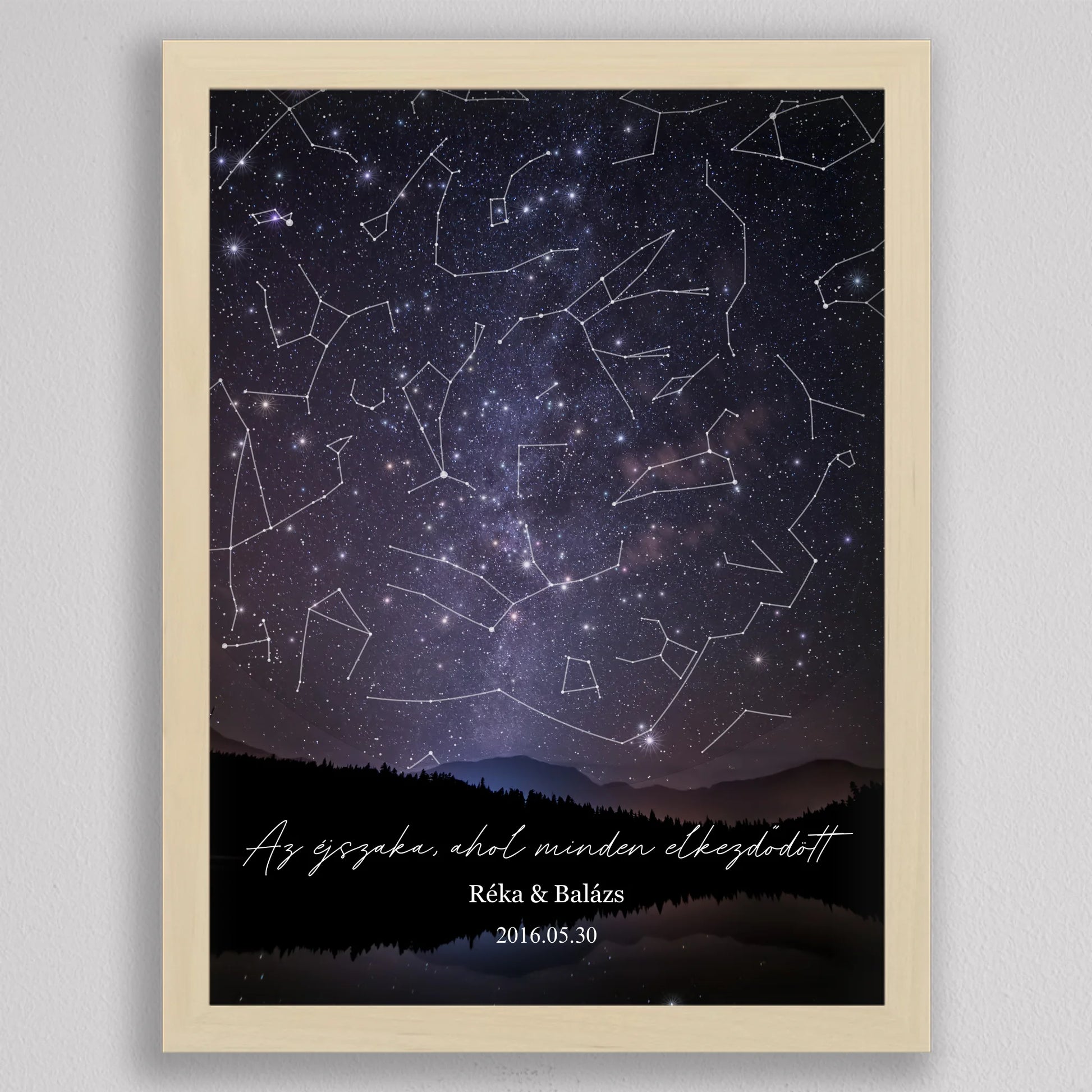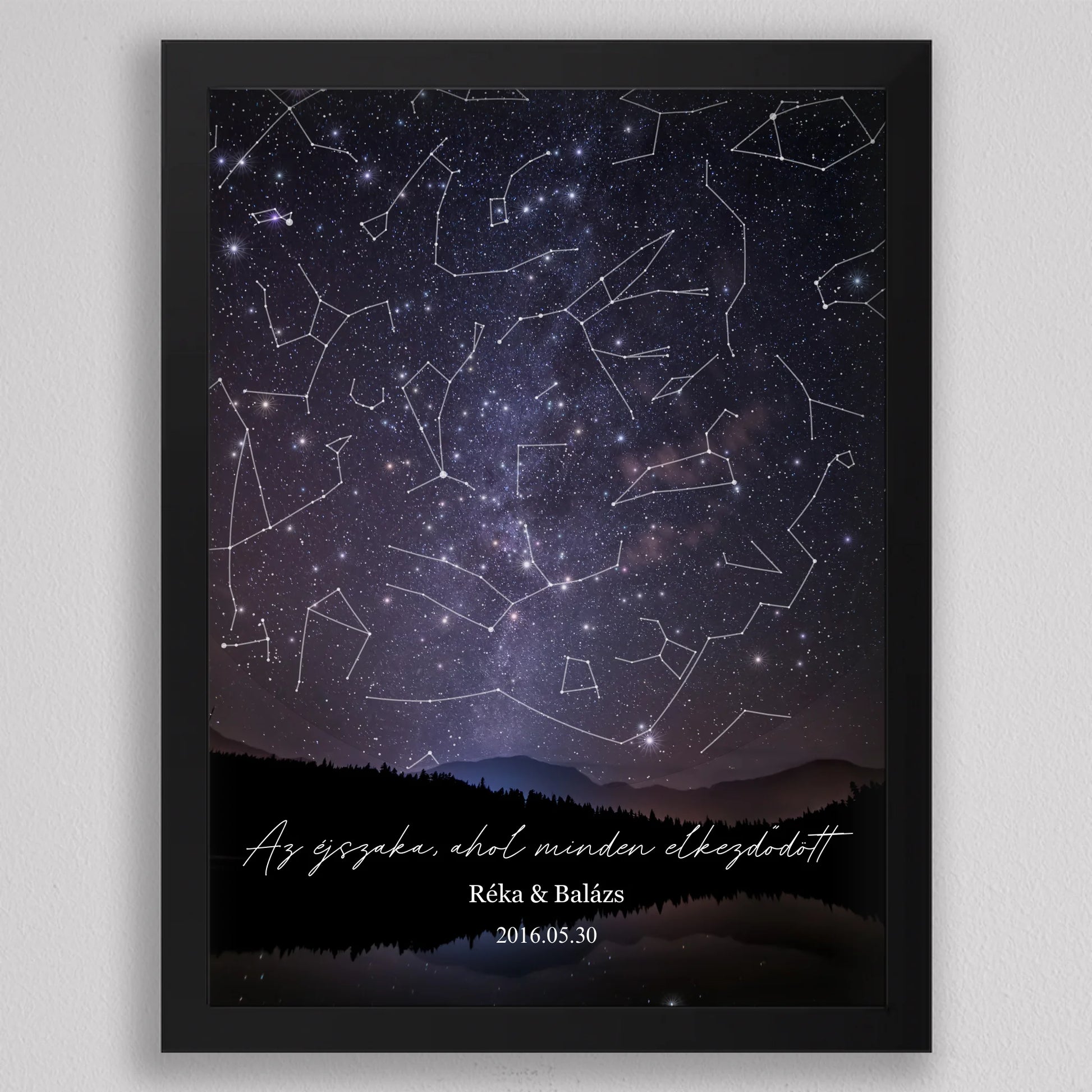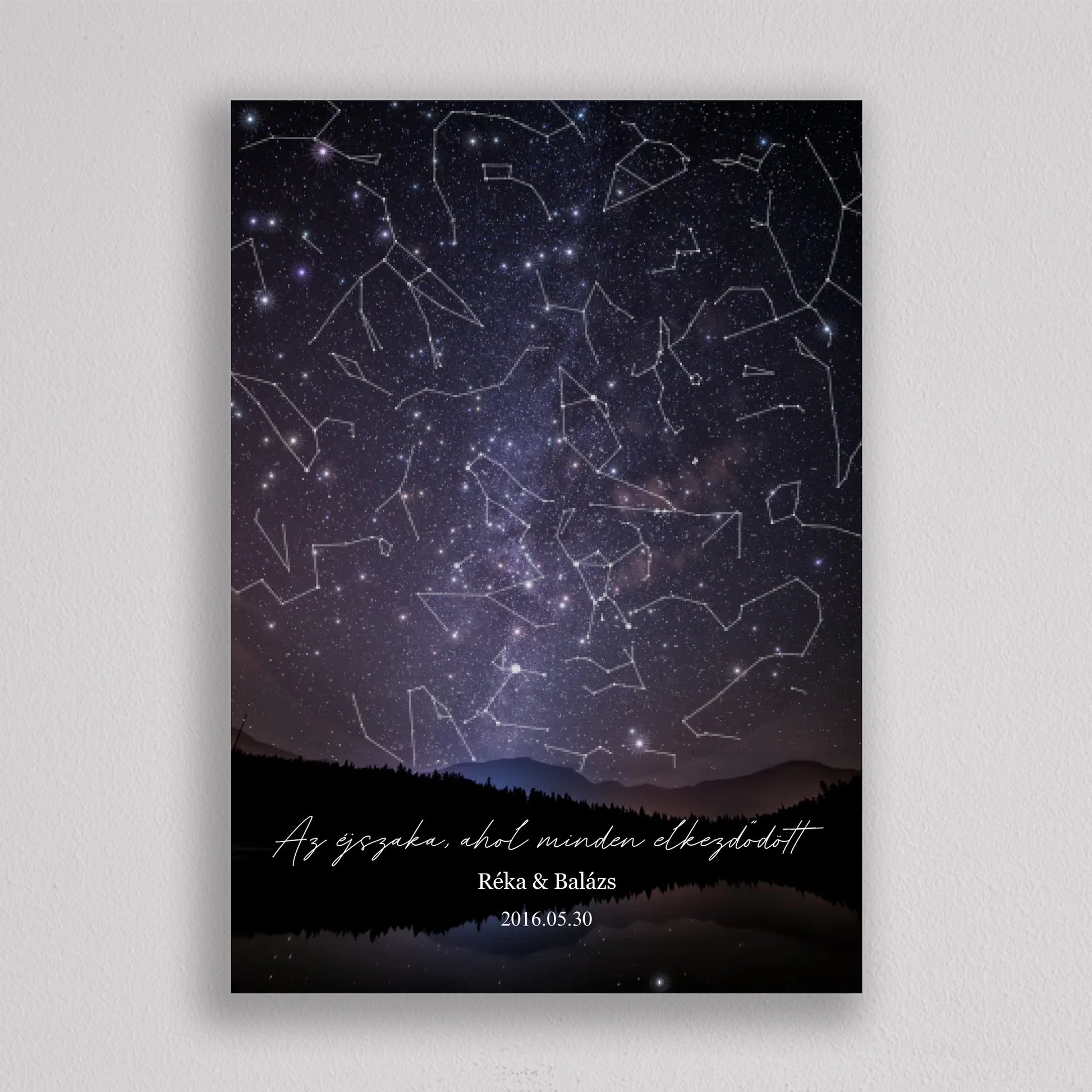 A Csillagtérkép tájképes égbolton poszter varázslatos módon örökíti meg azt az éjszakát, amikor minden elkezdődött. Egy adott időpont és hely alapján megrajzolt csillagállás jelenik meg az égen, lenyűgöző hegyvidéki tájjal a háttérben – így válik igazán különlegessé és meghitté az ajándék. Teljesen személyre szabható: megadhatod a nevet, dátumot és helyszínt, hogy a csillagok pontosan azt a pillanatot tükrözzék, ami nektek a legtöbbet jelenti. Tökéletes választás évfordulóra, születésnapra, eljegyzésre vagy akár nászajándékként is. A letisztult dizájn minden enteriőrbe illeszkedik, miközben mély érzelmi értéket hordoz.