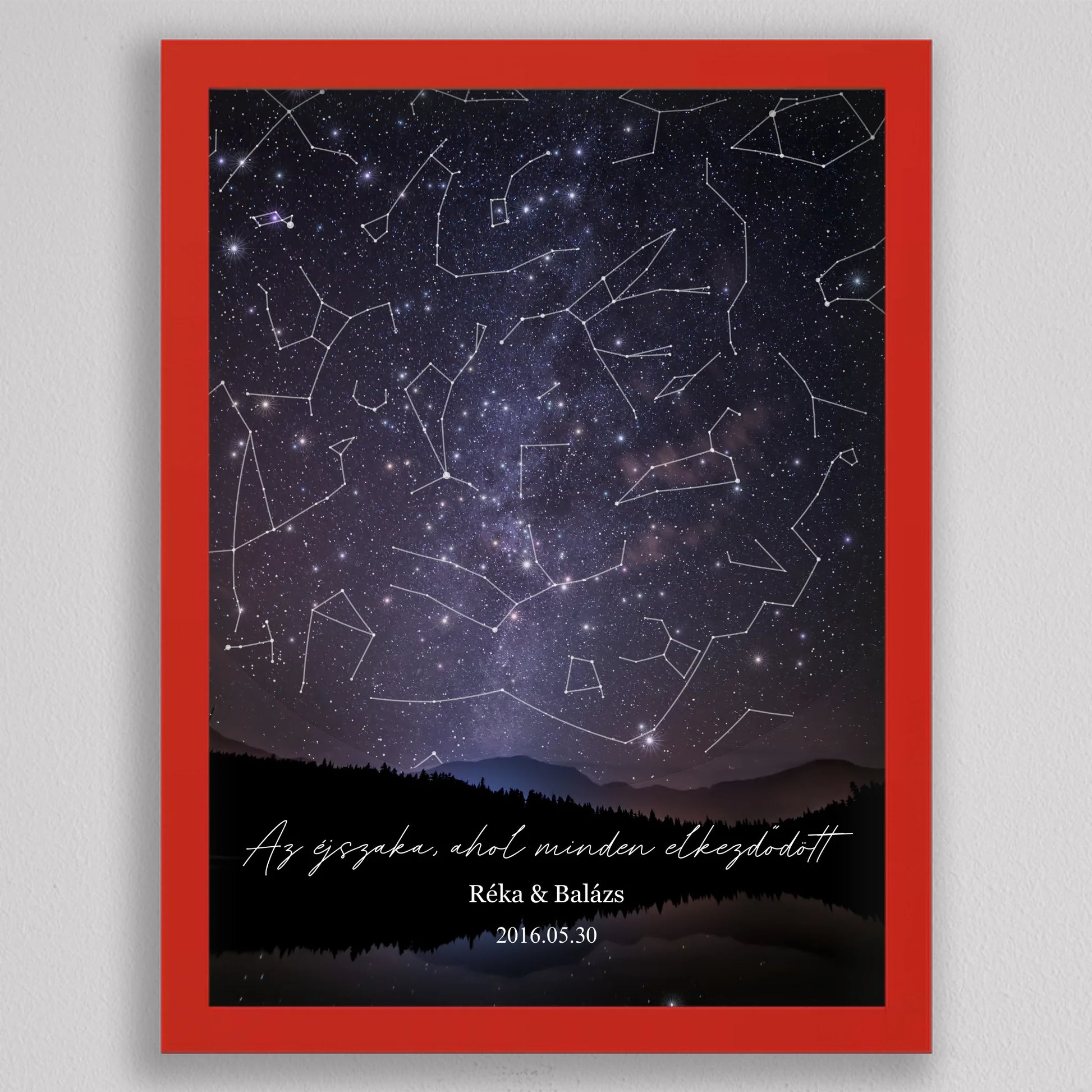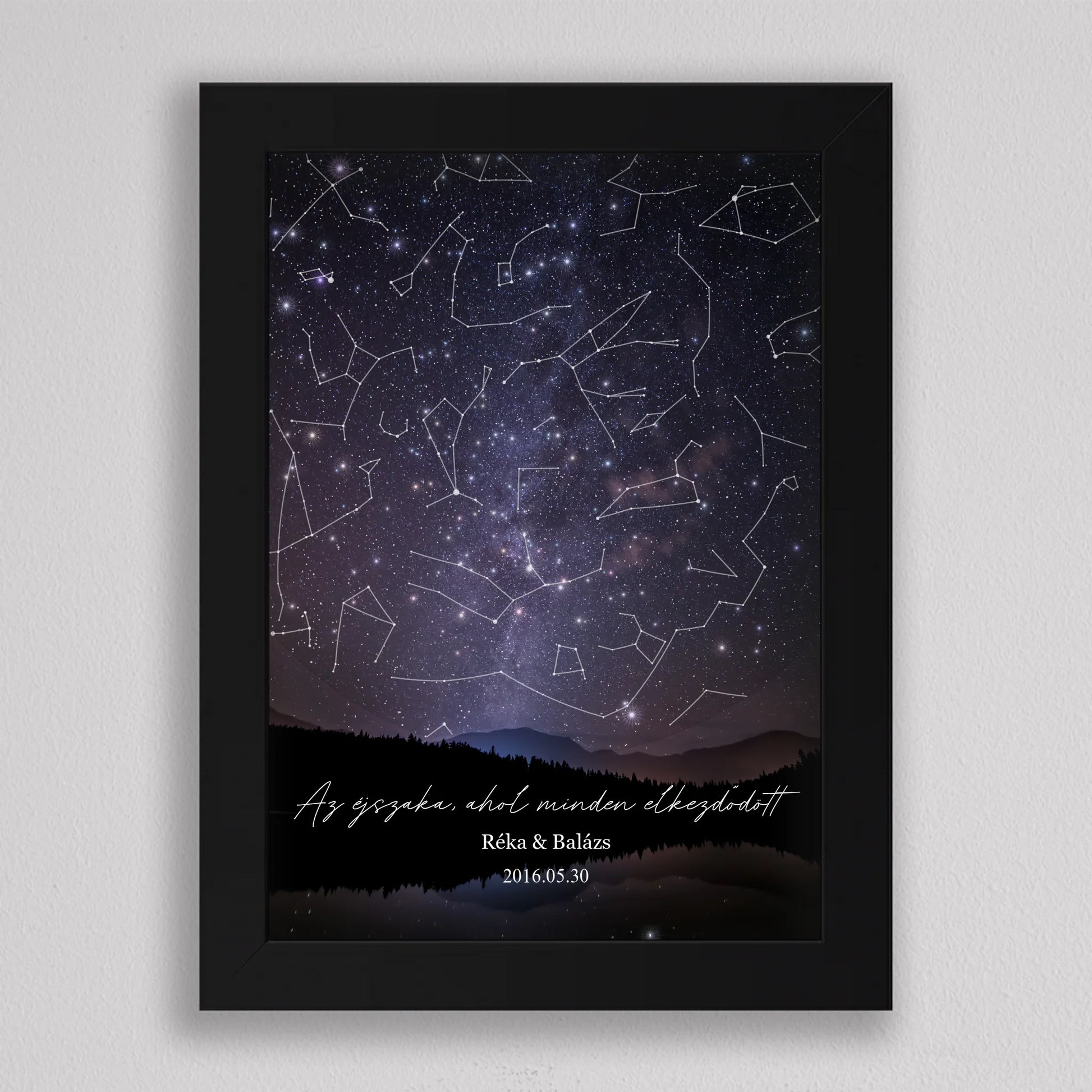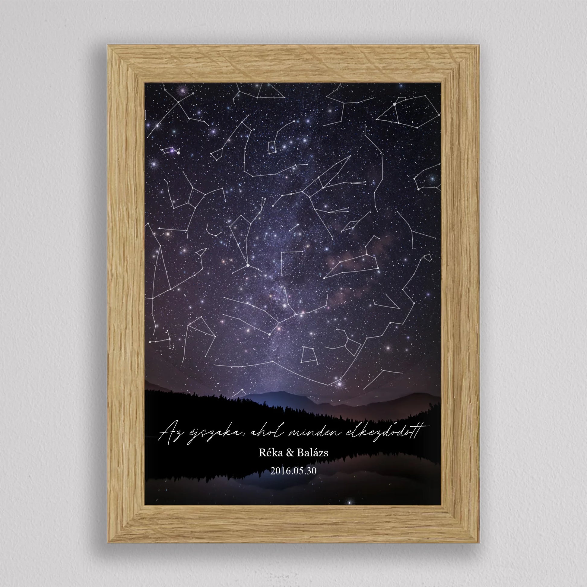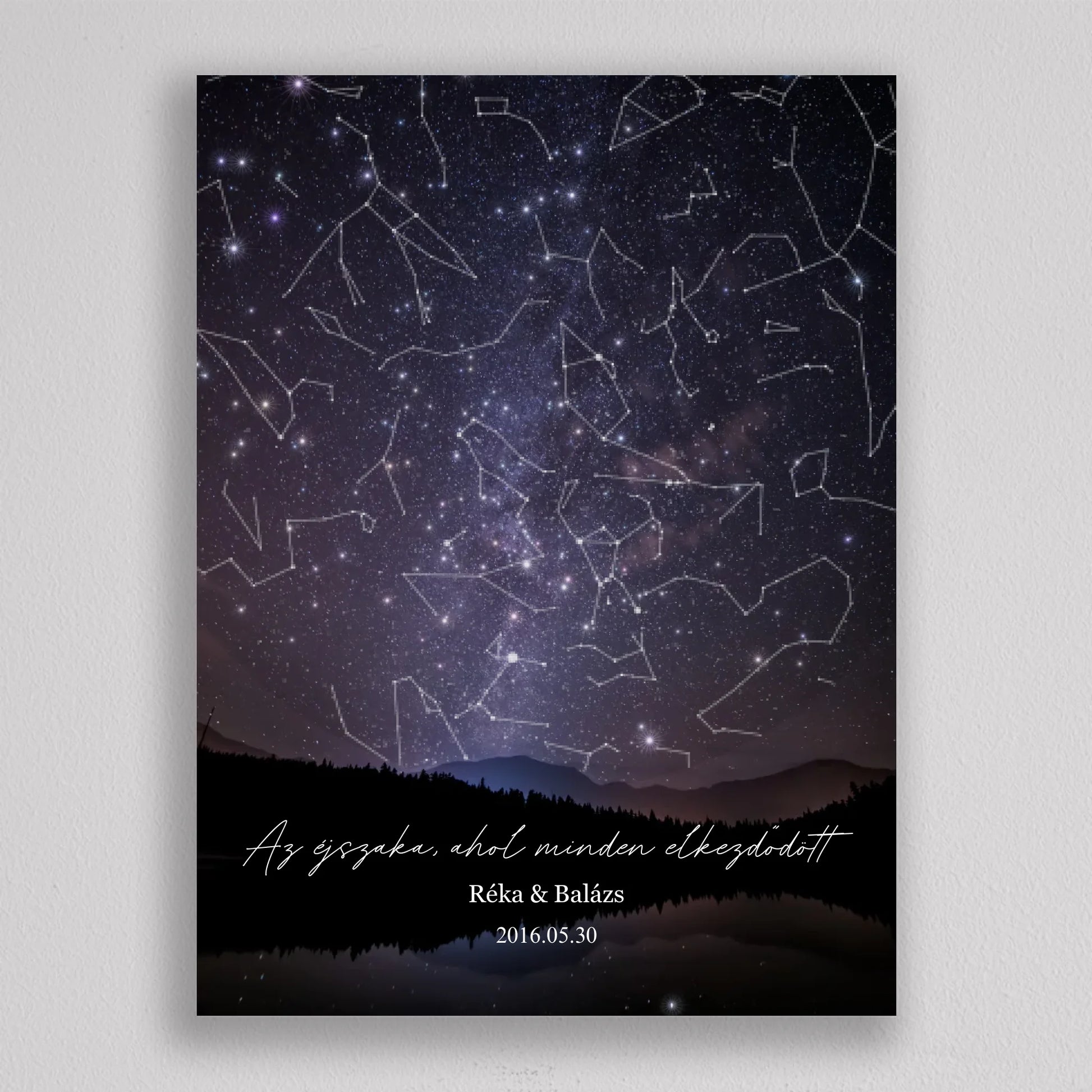 A Csillagtérkép tájképes égbolton poszter varázslatos módon örökíti meg azt az éjszakát, amikor minden elkezdődött. Egy adott időpont és hely alapján megrajzolt csillagállás jelenik meg az égen, lenyűgöző hegyvidéki tájjal a háttérben – így válik igazán különlegessé és meghitté az ajándék. Teljesen személyre szabható: megadhatod a nevet, dátumot és helyszínt, hogy a csillagok pontosan azt a pillanatot tükrözzék, ami nektek a legtöbbet jelenti. Tökéletes választás évfordulóra, születésnapra, eljegyzésre vagy akár nászajándékként is. A letisztult dizájn minden enteriőrbe illeszkedik, miközben mély érzelmi értéket hordoz.