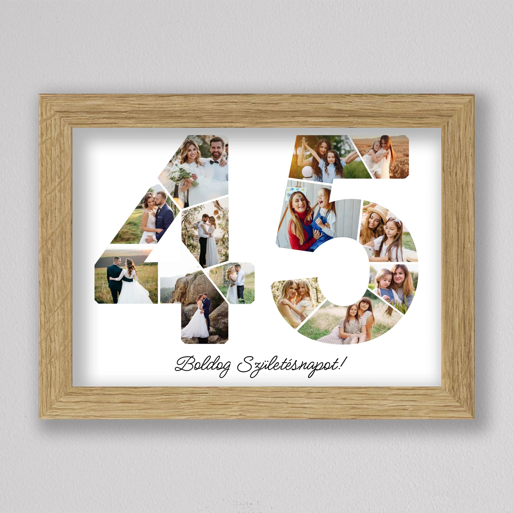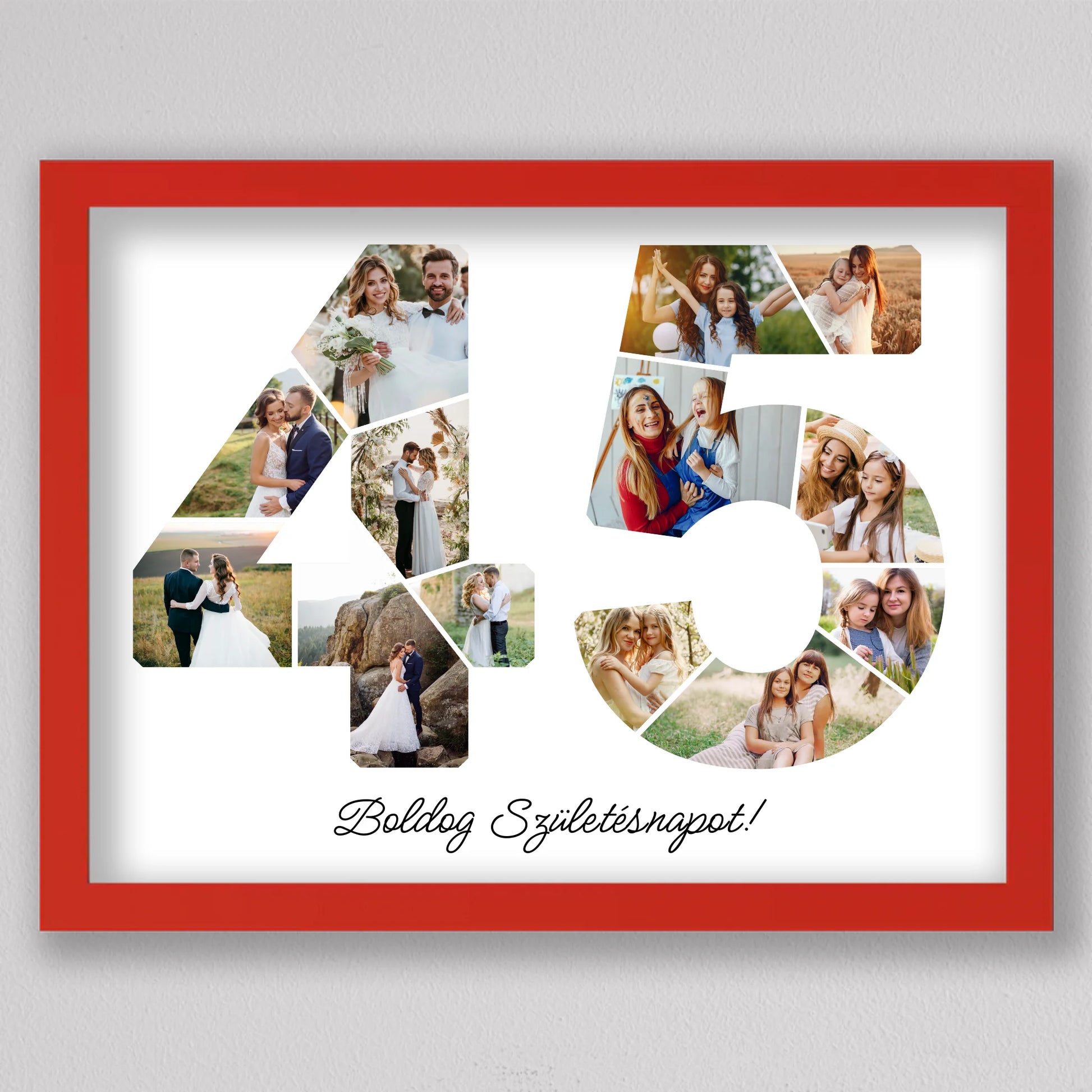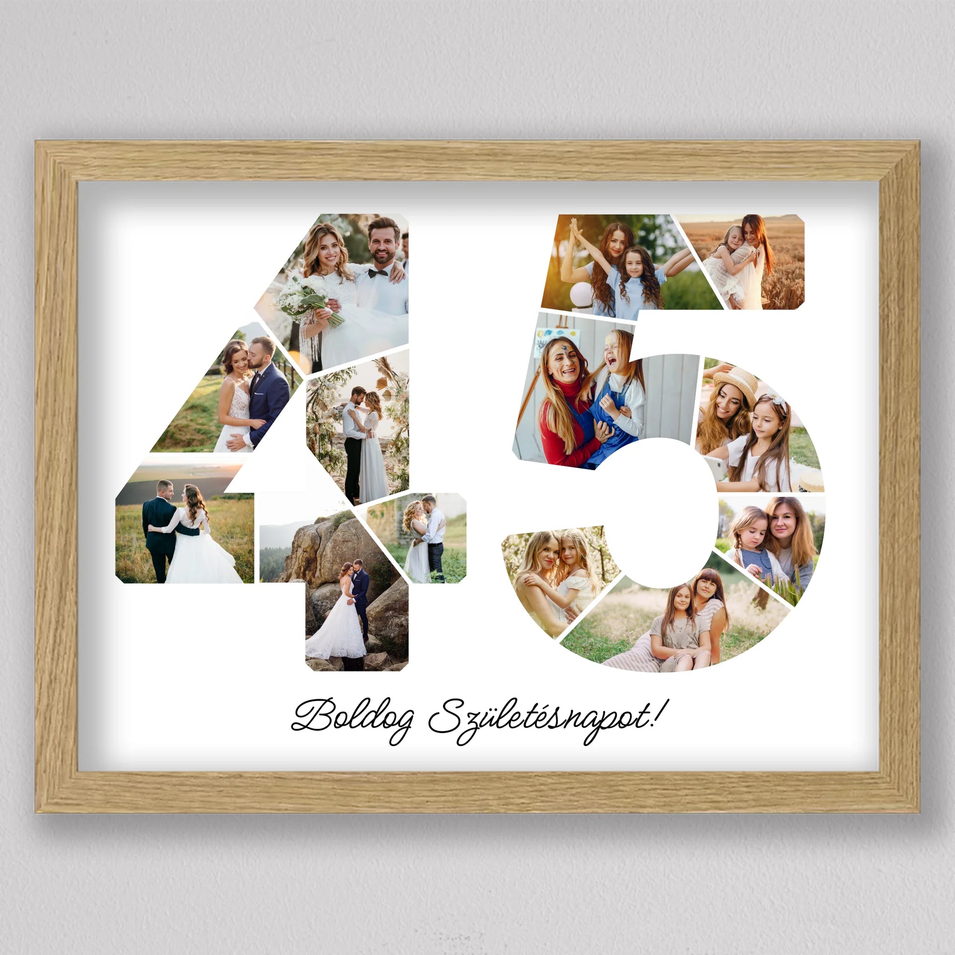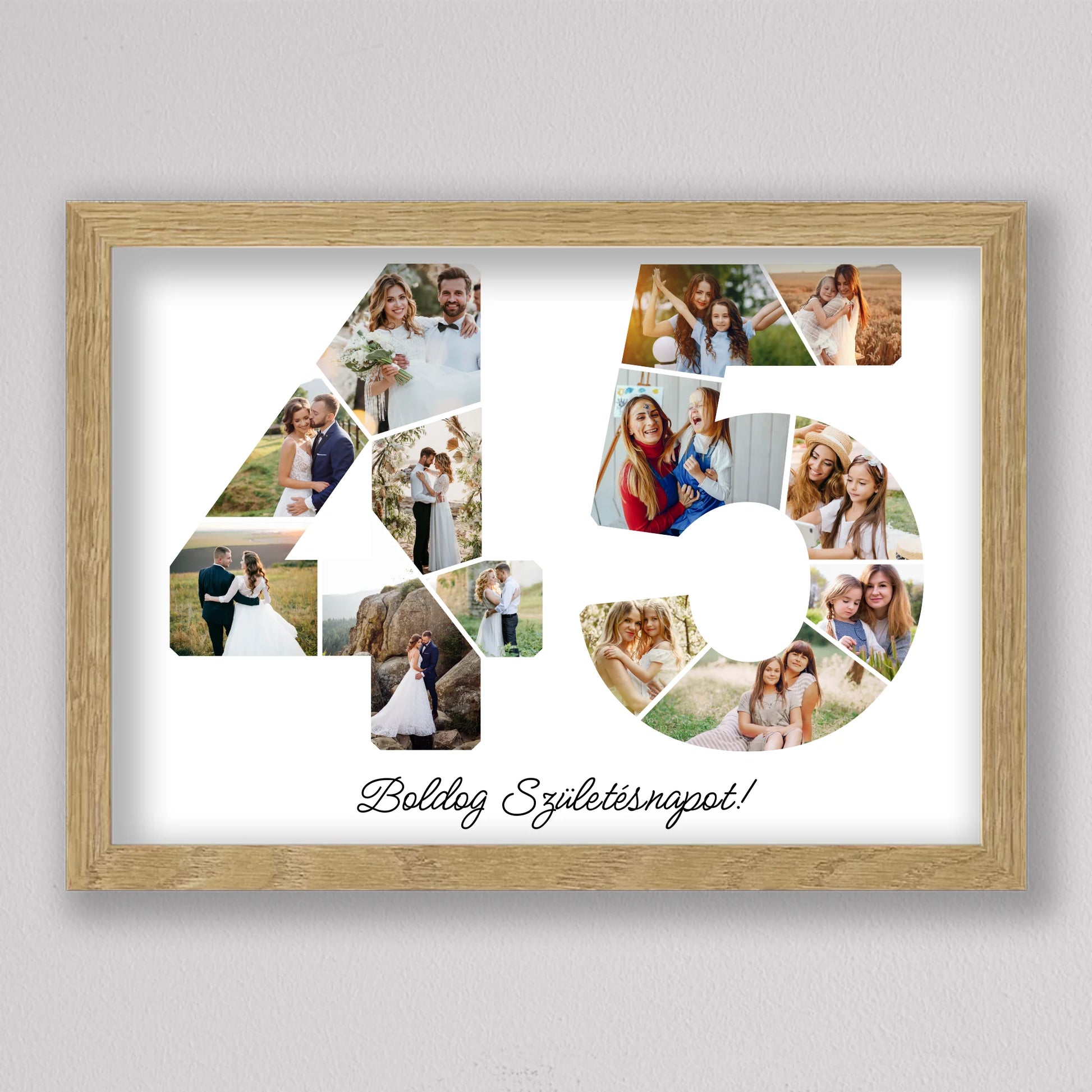 Az Egyedi számos fotó kollázs 45. születésnapra vagy évfordulóra tökéletes ajándék bármilyen különleges alkalomra. Az egyes számok belsejében személyre szabott fényképeket helyezhetünk el, amelyek megörökítik a legkedvesebb emlékeket. Legyen szó 45. születésnapról, házassági évfordulóról, vagy bármilyen mérföldkőről, ez a kollázs méltó módon ünnepli az adott eseményt. Kiváló minőségű nyomtatás és prémium keretezés biztosítja a tartósságot és eleganciát, amely bármelyik otthon dísze lehet. Egyedi hátterek és elrendezések közül választhat, így igazán személyre szabott ajándék készíthető.