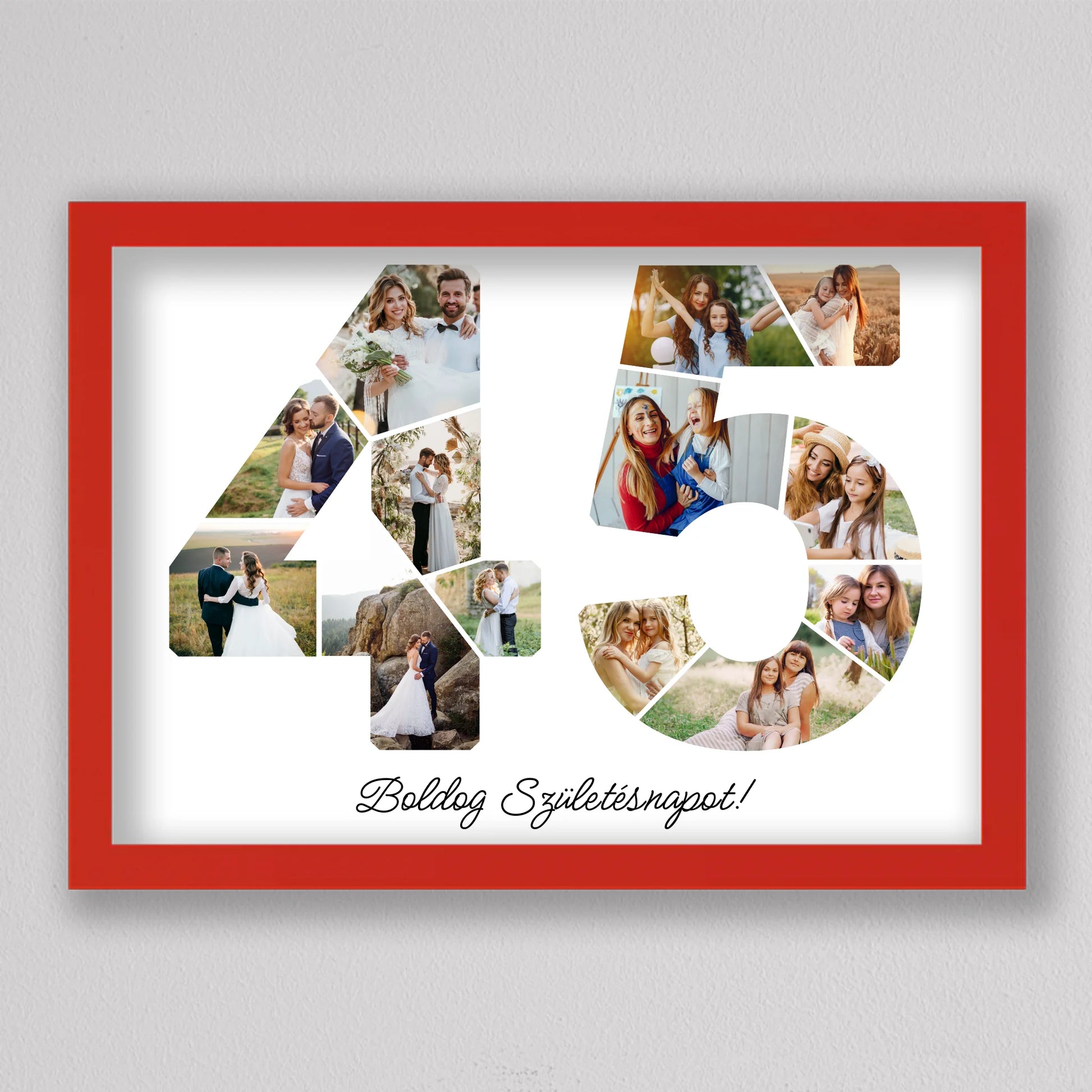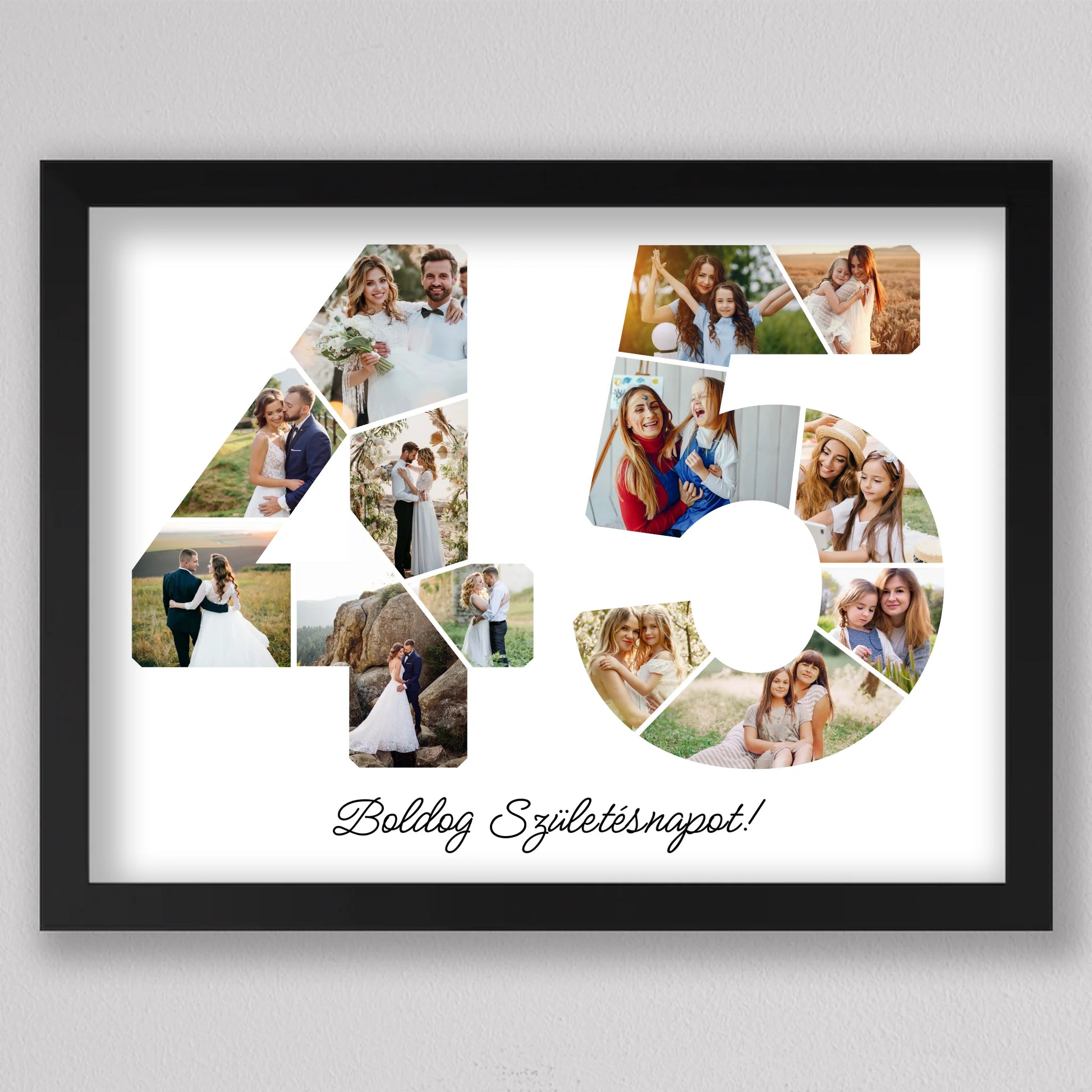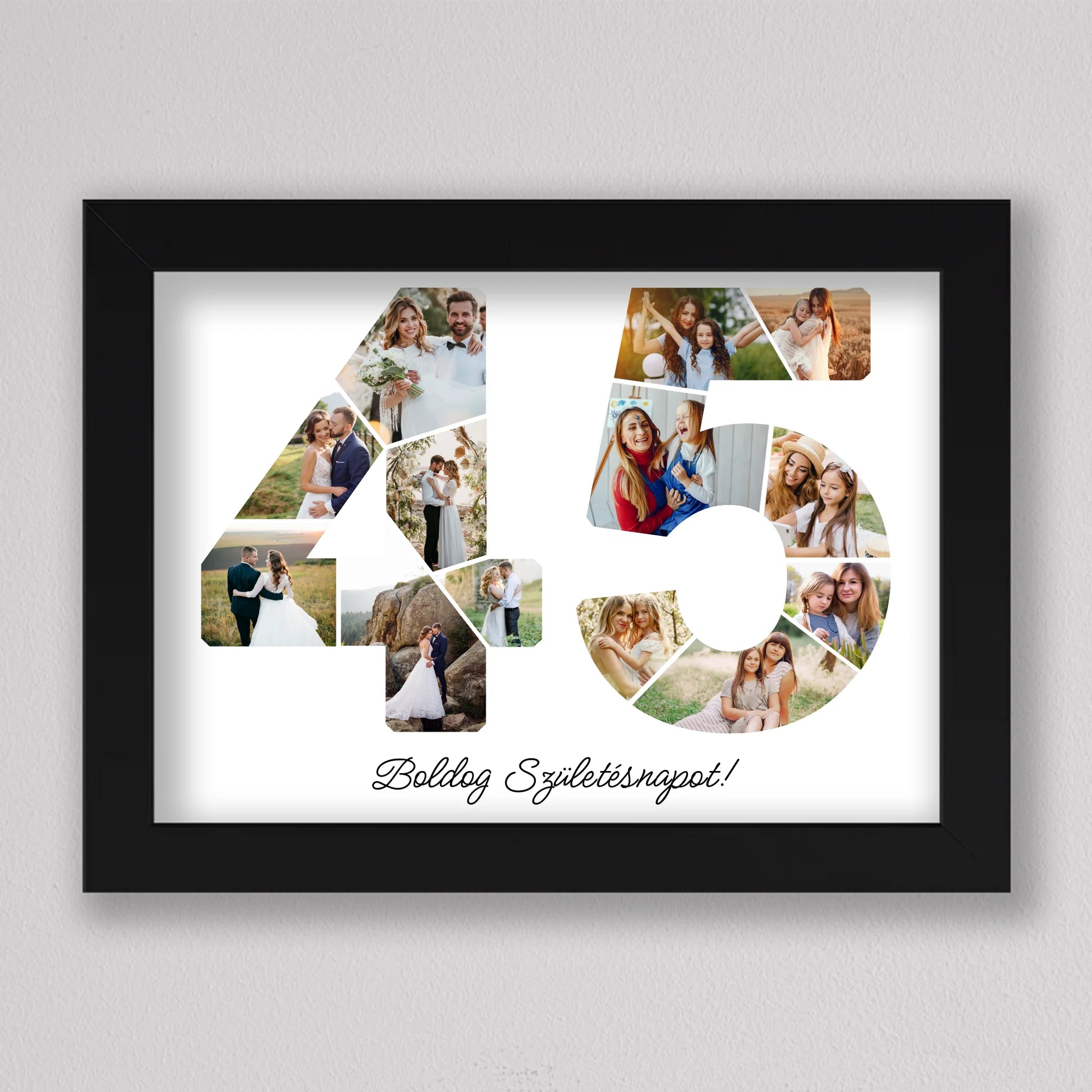 Az Egyedi számos fotó kollázs 45. születésnapra vagy évfordulóra tökéletes ajándék bármilyen különleges alkalomra. Az egyes számok belsejében személyre szabott fényképeket helyezhetünk el, amelyek megörökítik a legkedvesebb emlékeket. Legyen szó 45. születésnapról, házassági évfordulóról, vagy bármilyen mérföldkőről, ez a kollázs méltó módon ünnepli az adott eseményt. Kiváló minőségű nyomtatás és prémium keretezés biztosítja a tartósságot és eleganciát, amely bármelyik otthon dísze lehet. Egyedi hátterek és elrendezések közül választhat, így igazán személyre szabott ajándék készíthető.