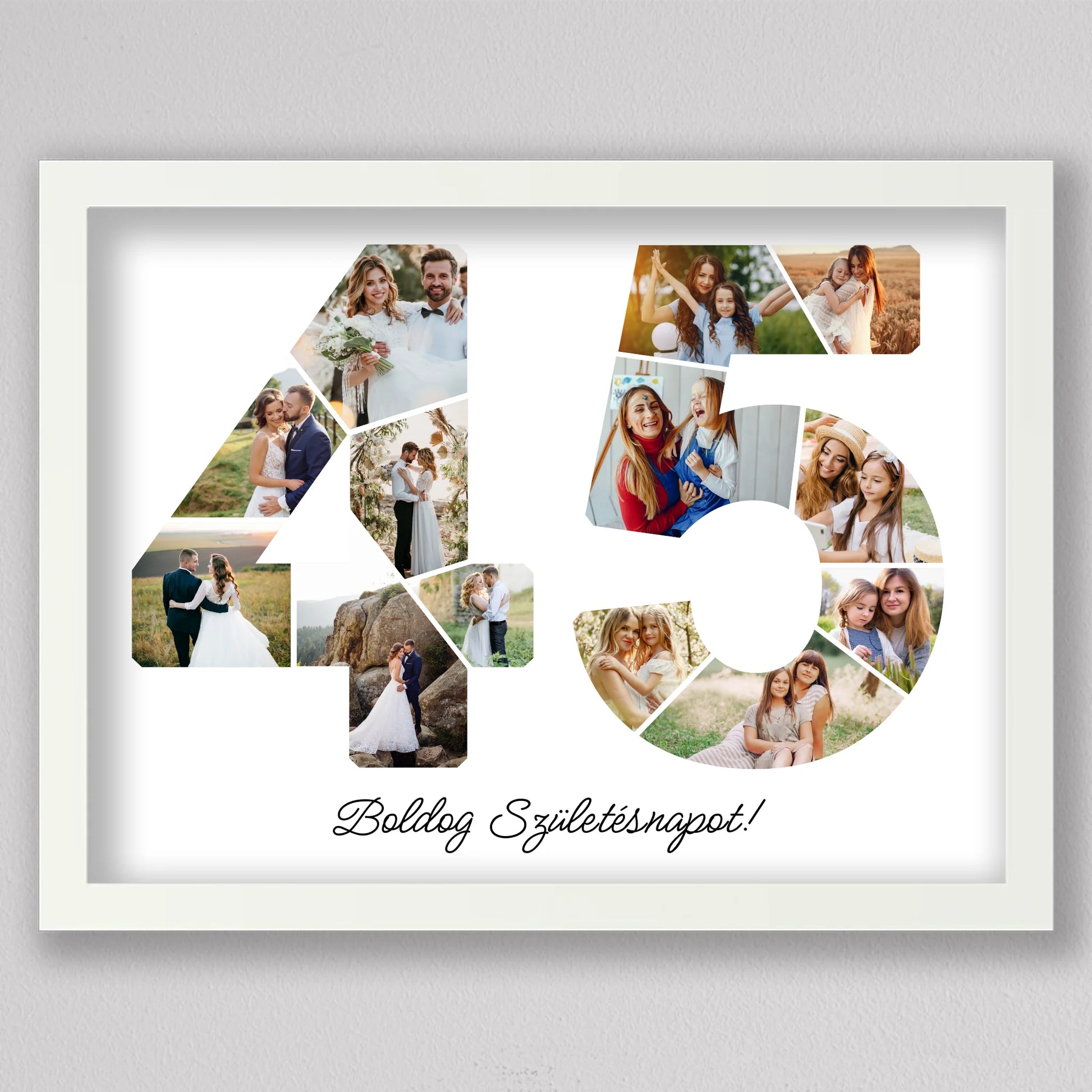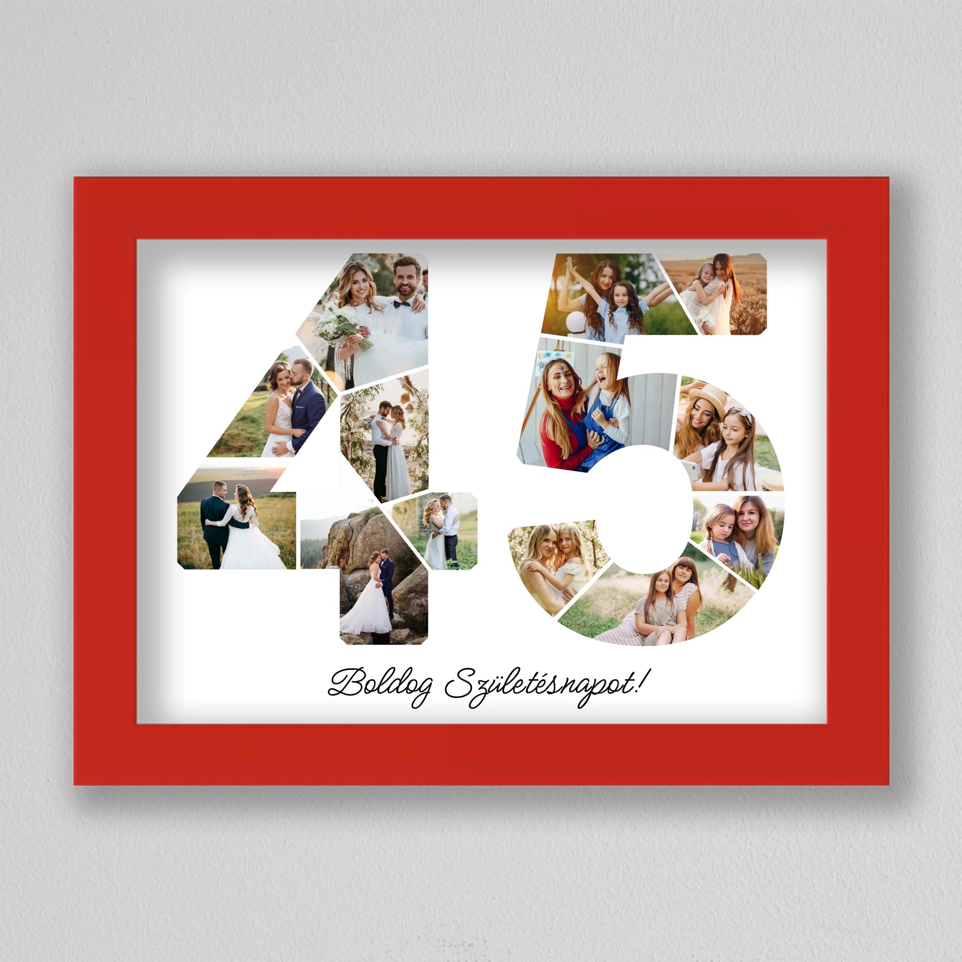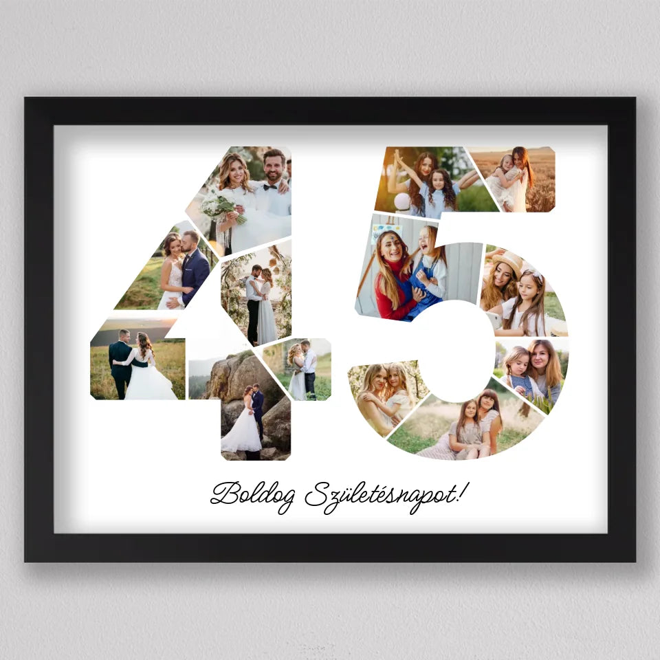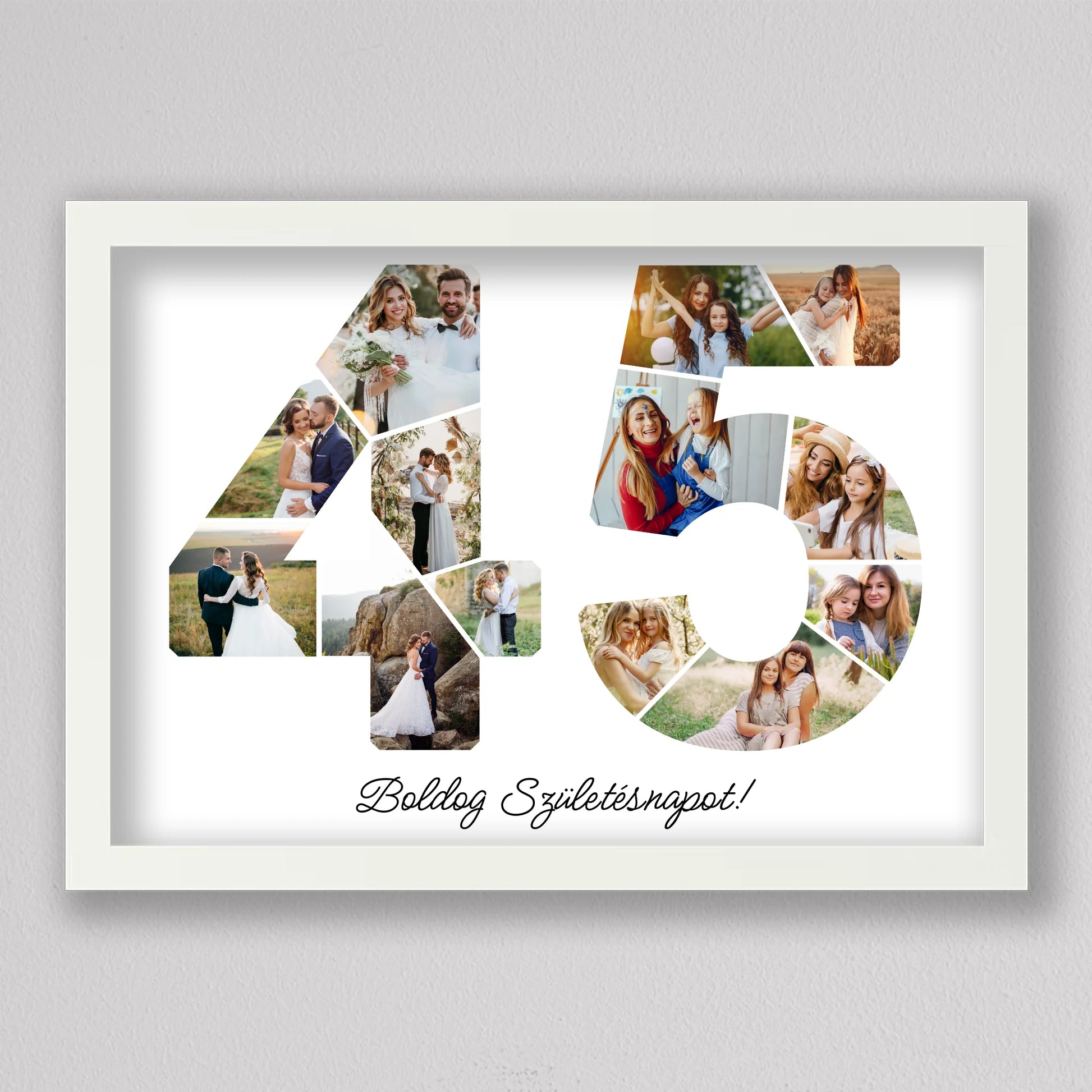 Az Egyedi számos fotó kollázs 45. születésnapra vagy évfordulóra tökéletes ajándék bármilyen különleges alkalomra. Az egyes számok belsejében személyre szabott fényképeket helyezhetünk el, amelyek megörökítik a legkedvesebb emlékeket. Legyen szó 45. születésnapról, házassági évfordulóról, vagy bármilyen mérföldkőről, ez a kollázs méltó módon ünnepli az adott eseményt. Kiváló minőségű nyomtatás és prémium keretezés biztosítja a tartósságot és eleganciát, amely bármelyik otthon dísze lehet. Egyedi hátterek és elrendezések közül választhat, így igazán személyre szabott ajándék készíthető.