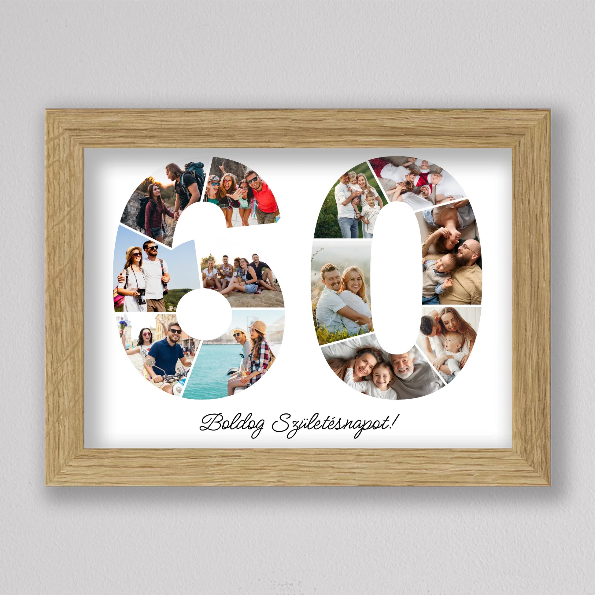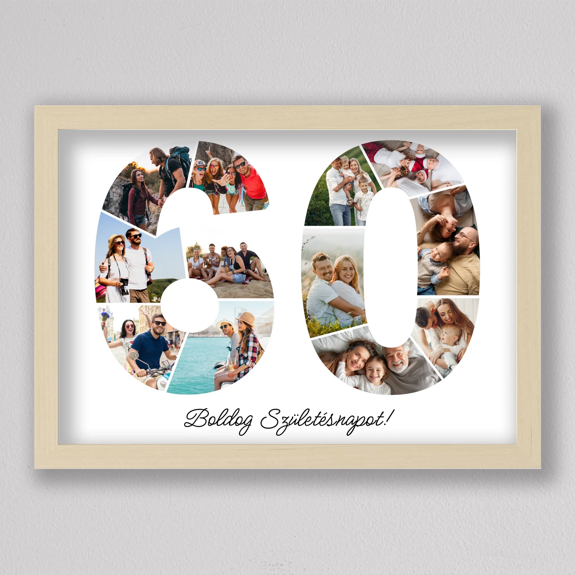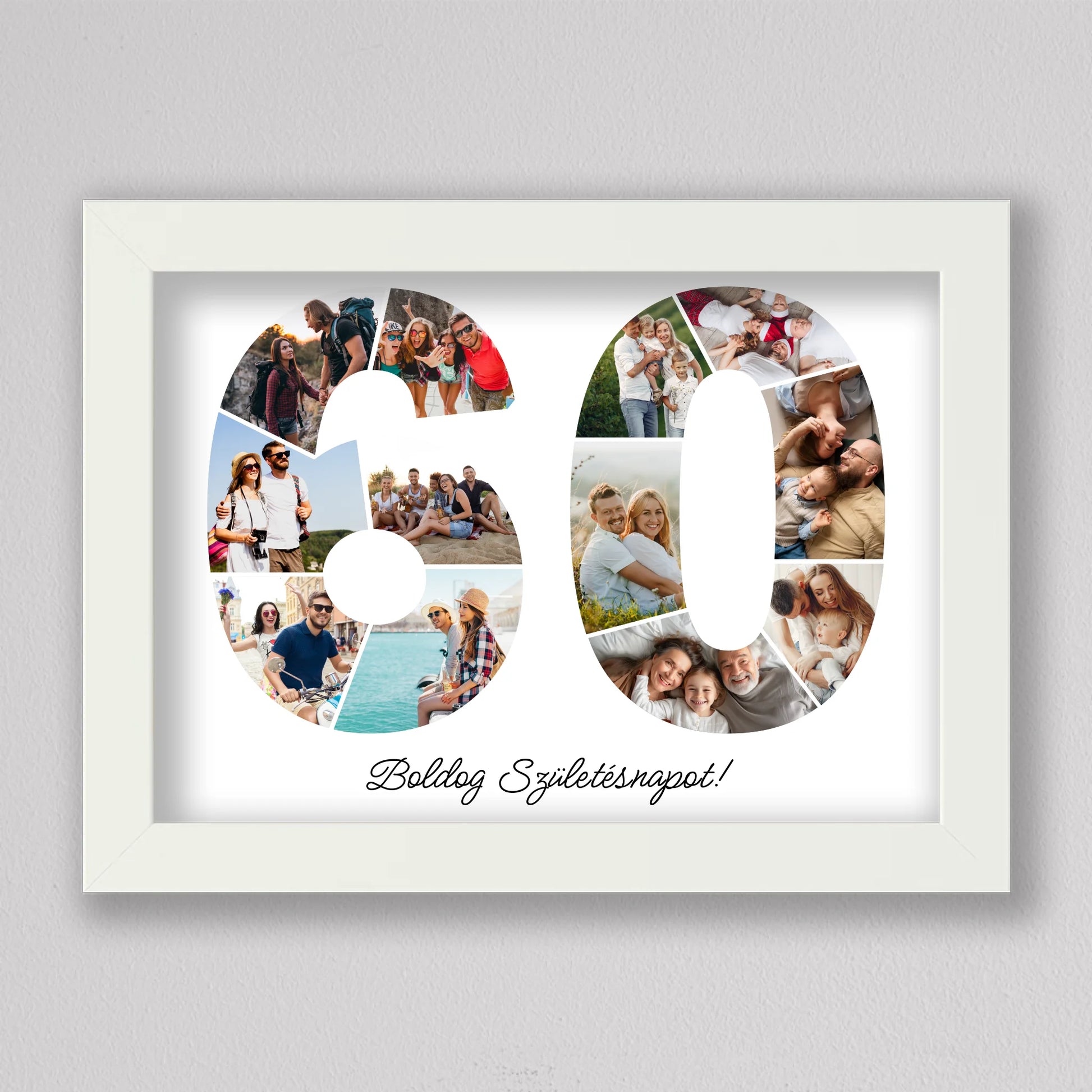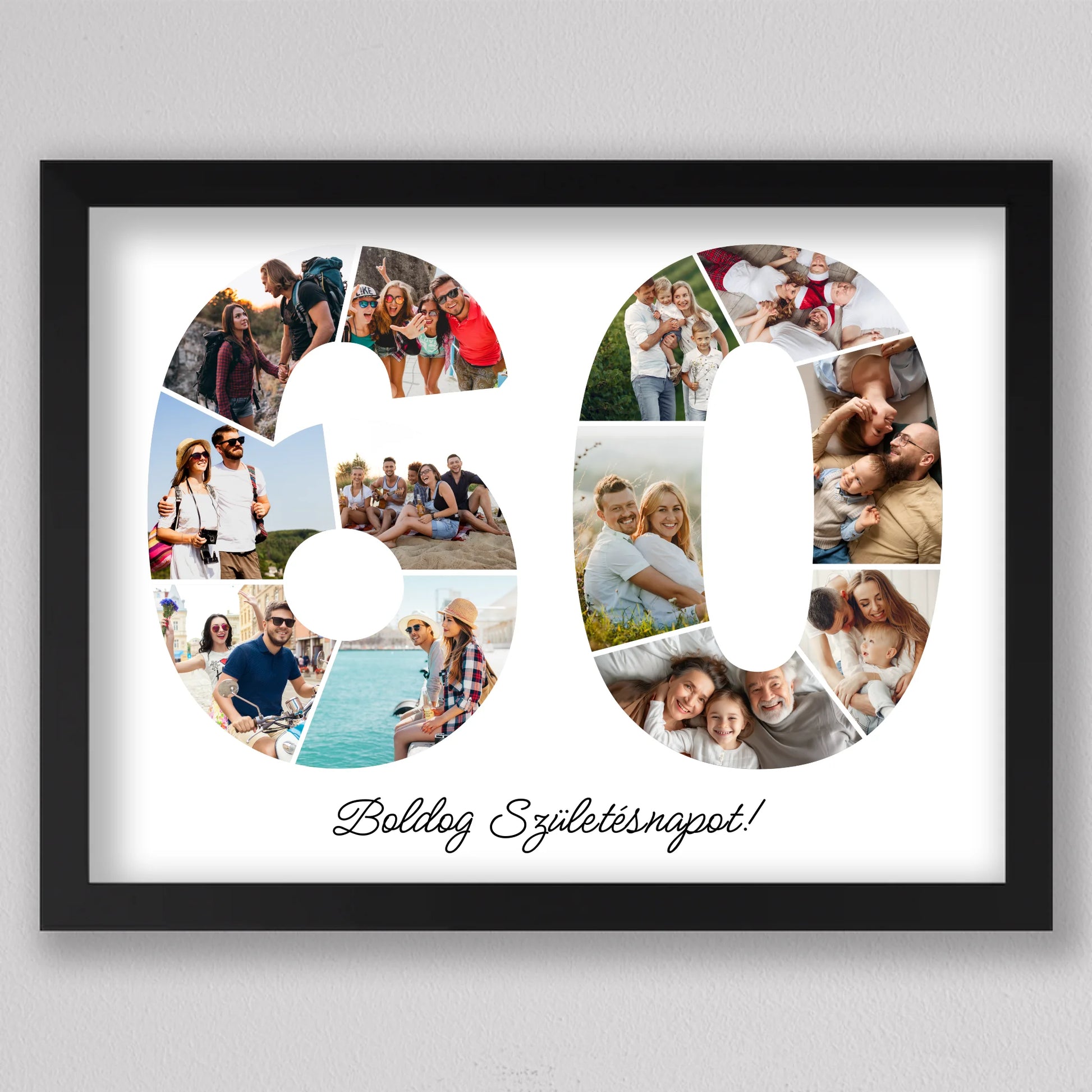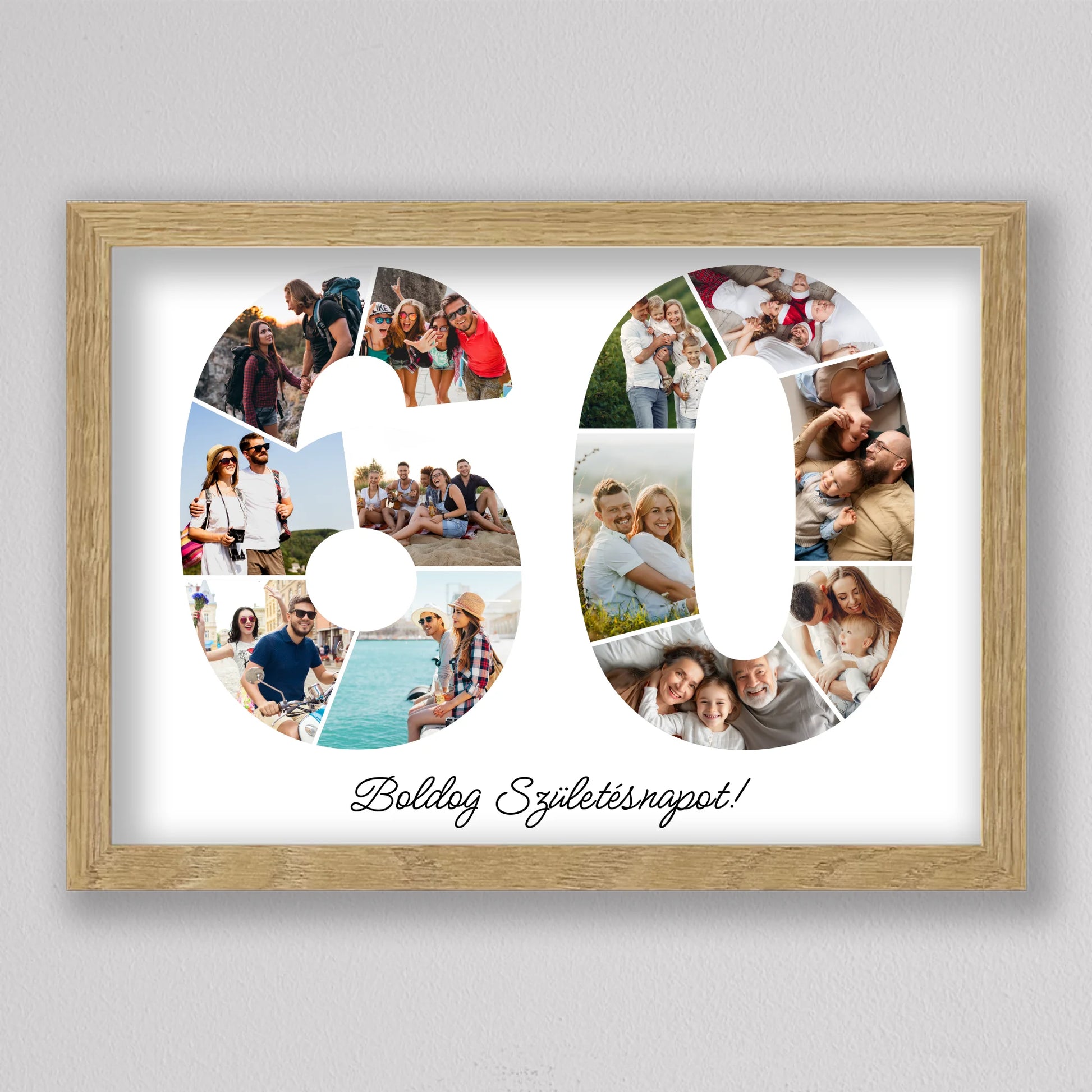 Az Egyedi számos fotó kollázs 60. születésnapra vagy évfordulóra tökéletes ajándék, hogy emlékezetessé tedd szeretteid számára ezt a különleges mérföldkövet. A kollázs minden részlete személyre szabható: az ünnepelt kedvenc fotóiból áll össze a “60” szám, amely az elmúlt évtizedek legszebb pillanatait örökíti meg. Egyedi szövegezéssel is ellátható, így még személyesebb üzenetet közvetíthetsz. Az ajándék nem csak esztétikus, de érzelmi töltetű is, amely örök emlékként díszíti a falakat.