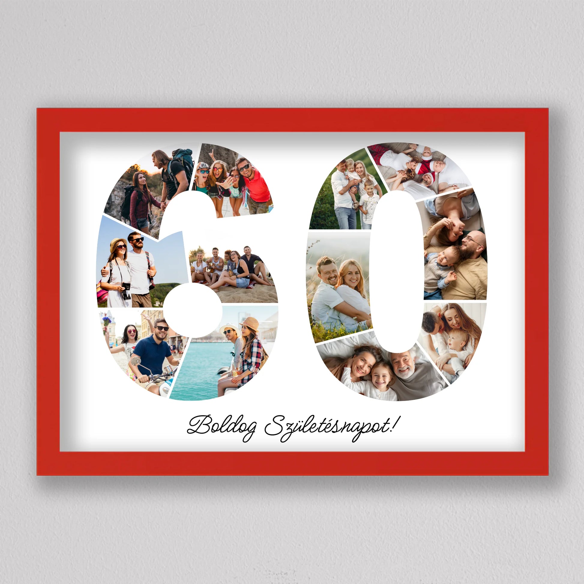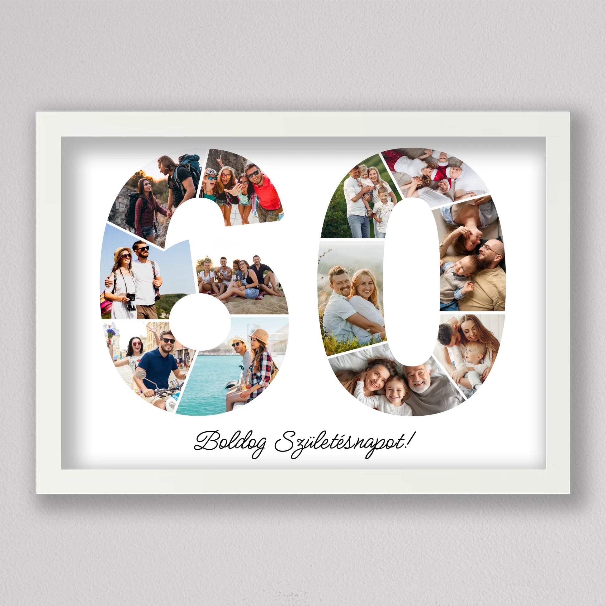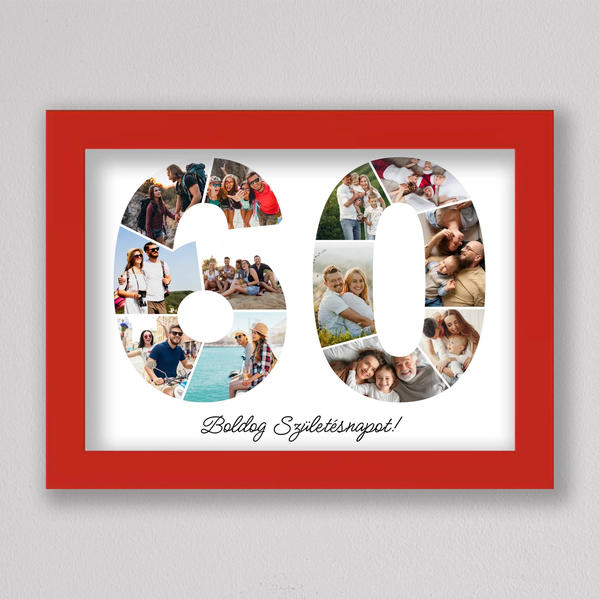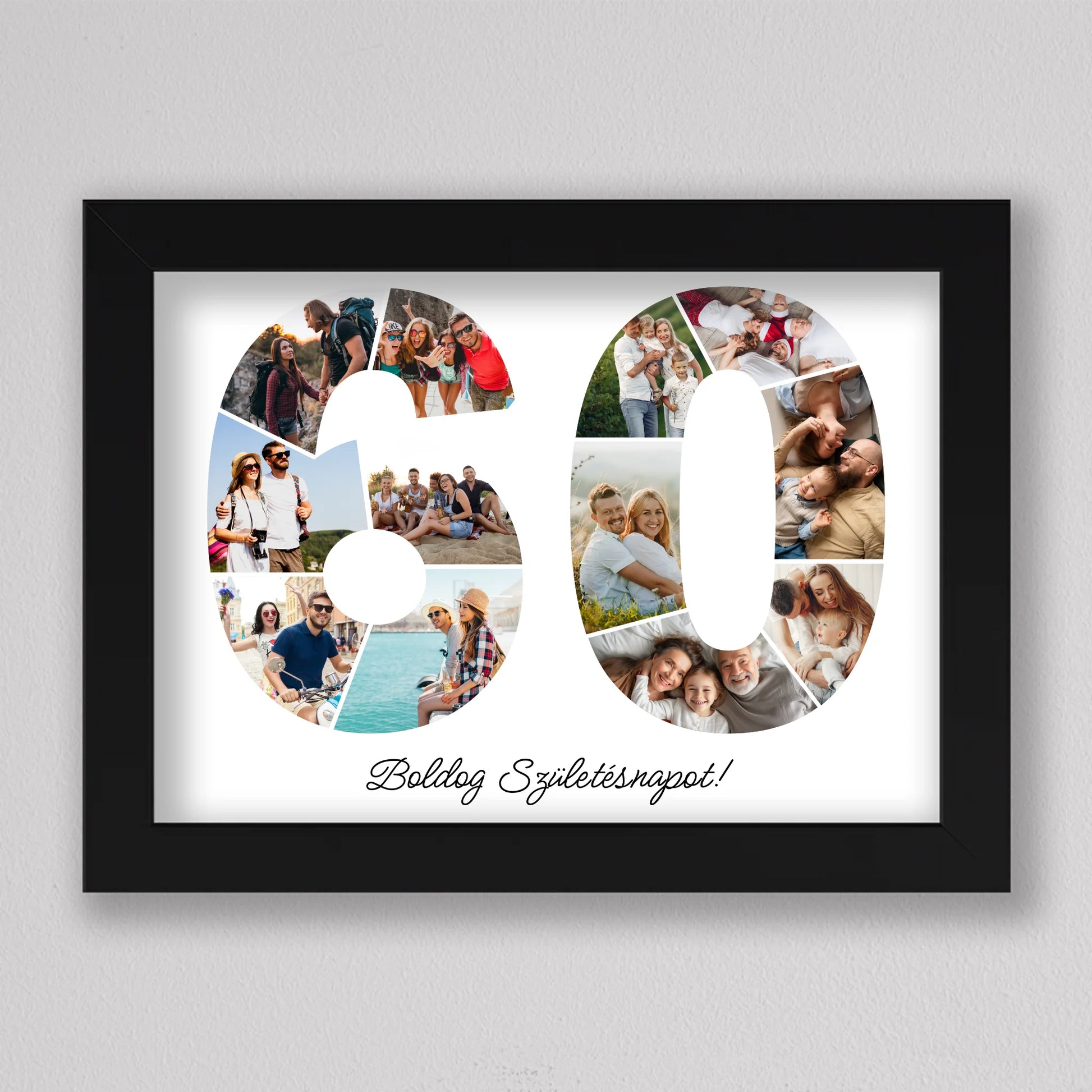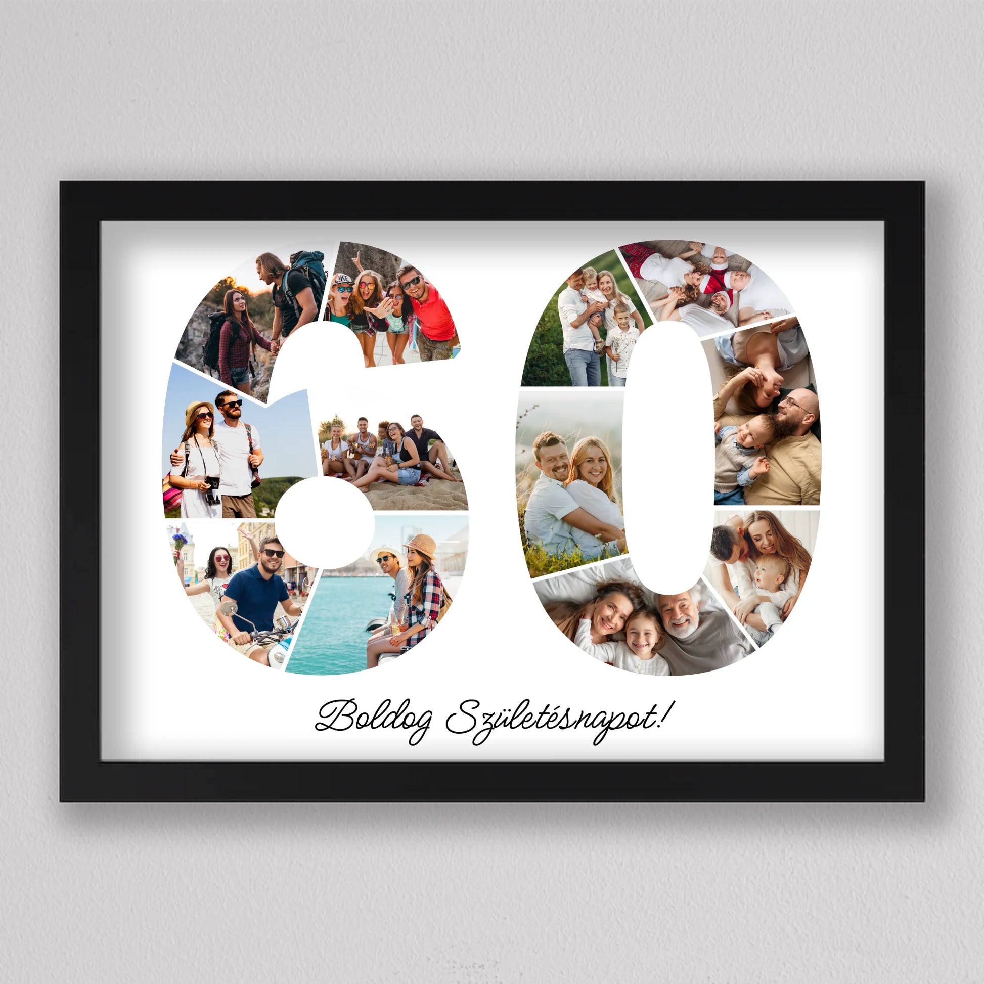 Az Egyedi számos fotó kollázs 60. születésnapra vagy évfordulóra tökéletes ajándék, hogy emlékezetessé tedd szeretteid számára ezt a különleges mérföldkövet. A kollázs minden részlete személyre szabható: az ünnepelt kedvenc fotóiból áll össze a “60” szám, amely az elmúlt évtizedek legszebb pillanatait örökíti meg. Egyedi szövegezéssel is ellátható, így még személyesebb üzenetet közvetíthetsz. Az ajándék nem csak esztétikus, de érzelmi töltetű is, amely örök emlékként díszíti a falakat.