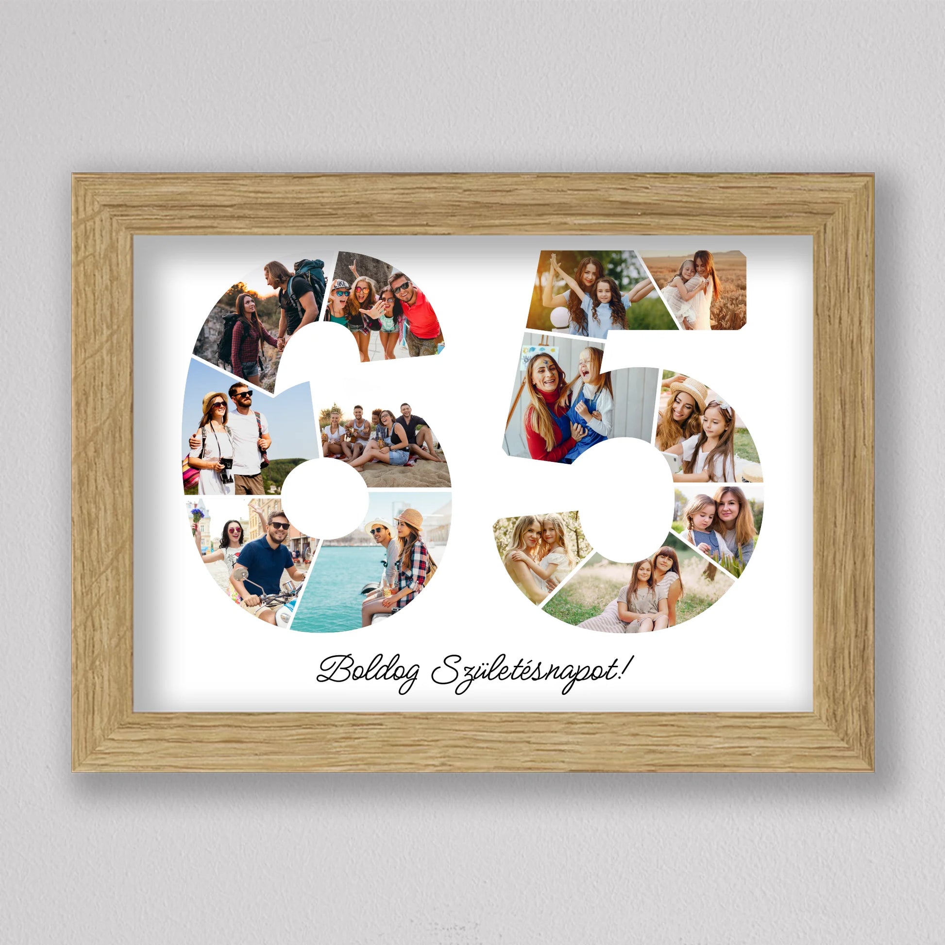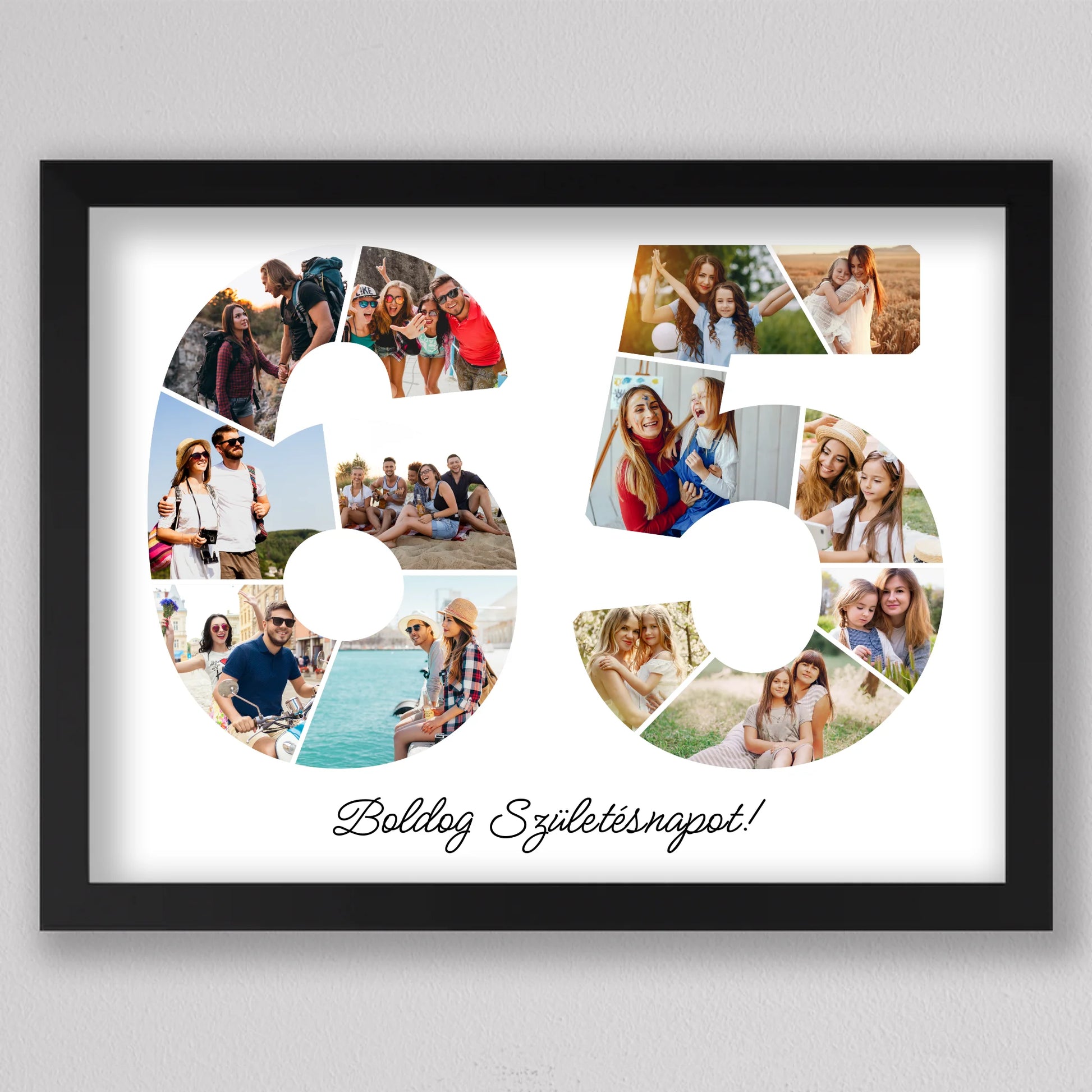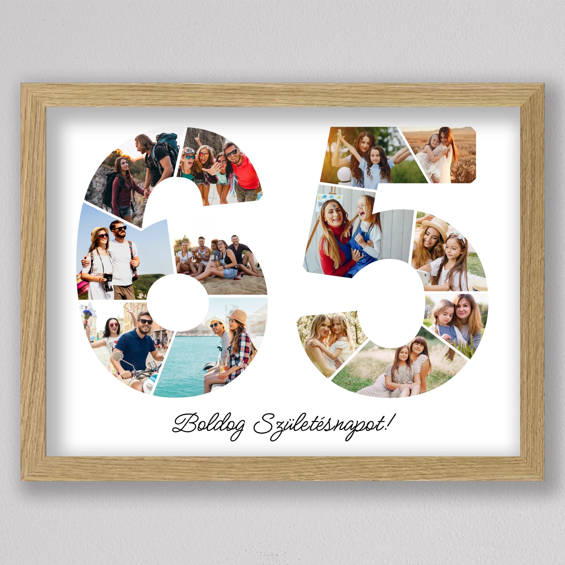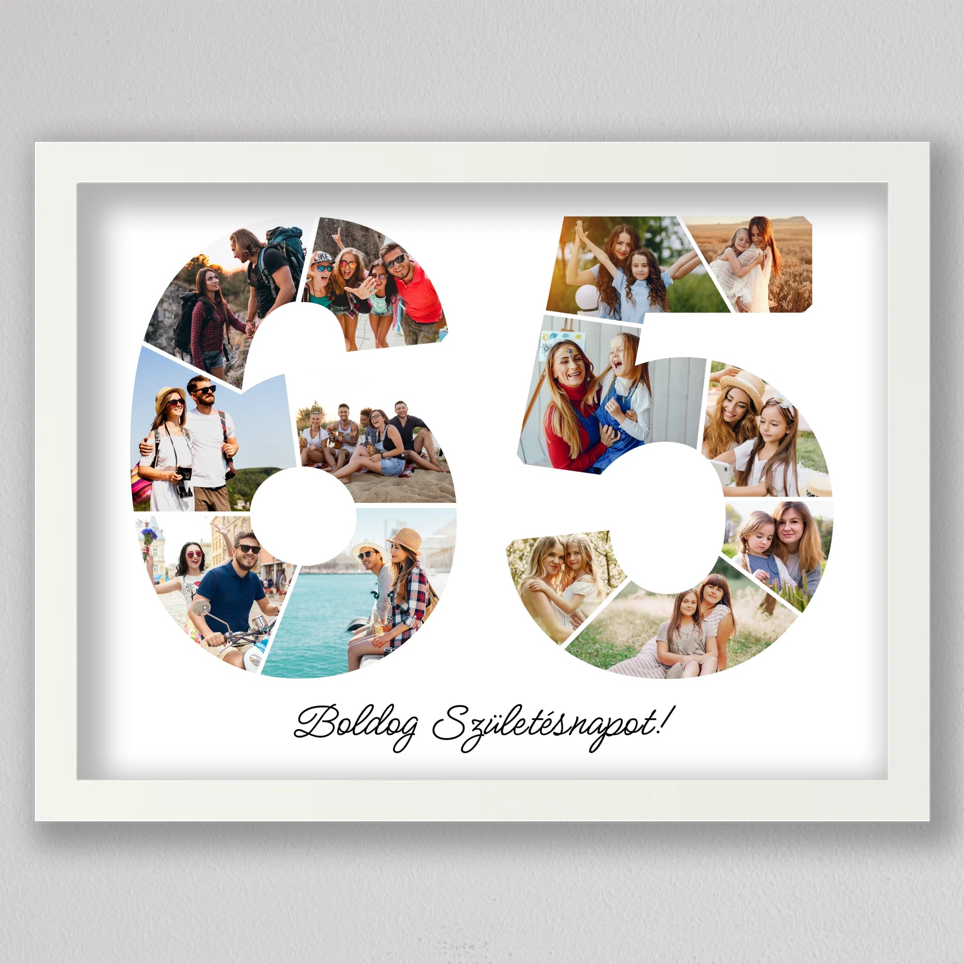Az Egyedi számos fotókollázs 65. születésnapra vagy évfordulóra egy tökéletes és személyre szabott ajándék, amely igazán különlegessé teszi az ünnepet. A kollázs minden része testre szabható, az egyéni fotókból összeállított szám formátum segítségével megörökíthetők a legkedvesebb emlékek. Legyen szó családi eseményekről, baráti pillanatokról vagy egy egész élet emlékeiről, ez az egyedi ajándék érzelmi töltetet visz a falra. Különleges üzenet hozzáadásával még személyesebbé tehető, így az ajándék maradandó élmény marad. Tökéletes választás mindazoknak, akik különleges és érzelmes ajándékot keresnek.