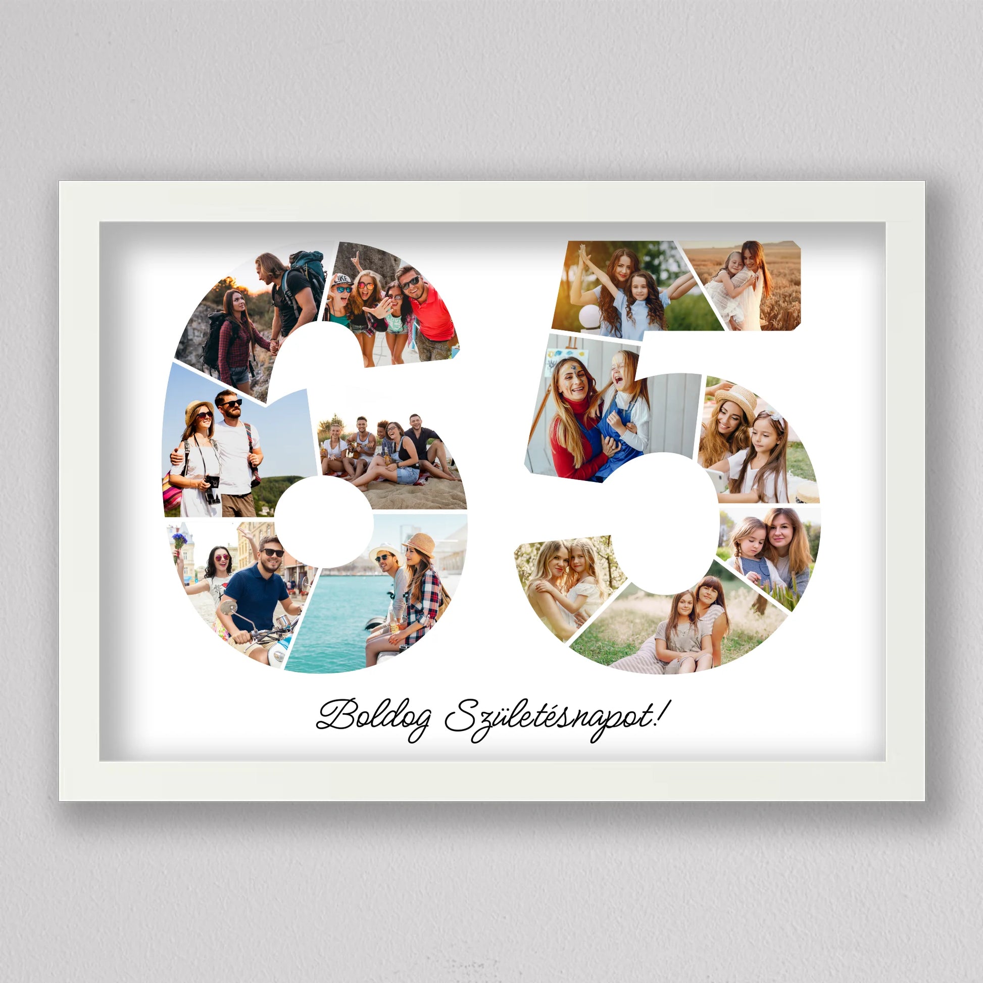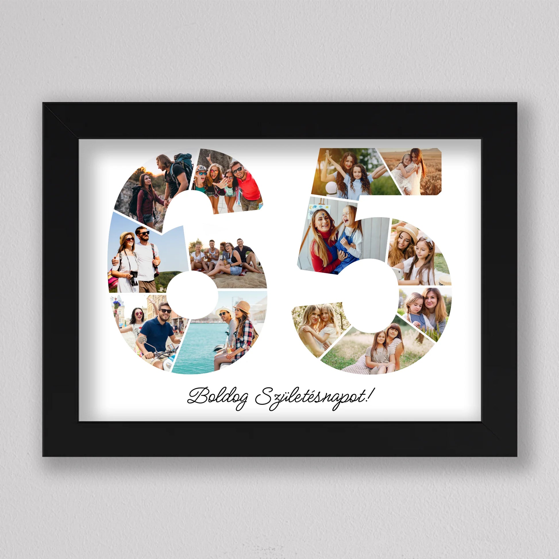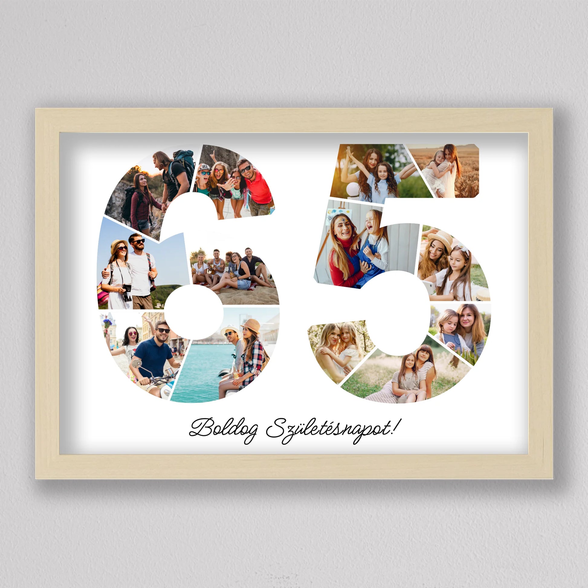 Az Egyedi számos fotókollázs 65. születésnapra vagy évfordulóra egy tökéletes és személyre szabott ajándék, amely igazán különlegessé teszi az ünnepet. A kollázs minden része testre szabható, az egyéni fotókból összeállított szám formátum segítségével megörökíthetők a legkedvesebb emlékek. Legyen szó családi eseményekről, baráti pillanatokról vagy egy egész élet emlékeiről, ez az egyedi ajándék érzelmi töltetet visz a falra. Különleges üzenet hozzáadásával még személyesebbé tehető, így az ajándék maradandó élmény marad. Tökéletes választás mindazoknak, akik különleges és érzelmes ajándékot keresnek.