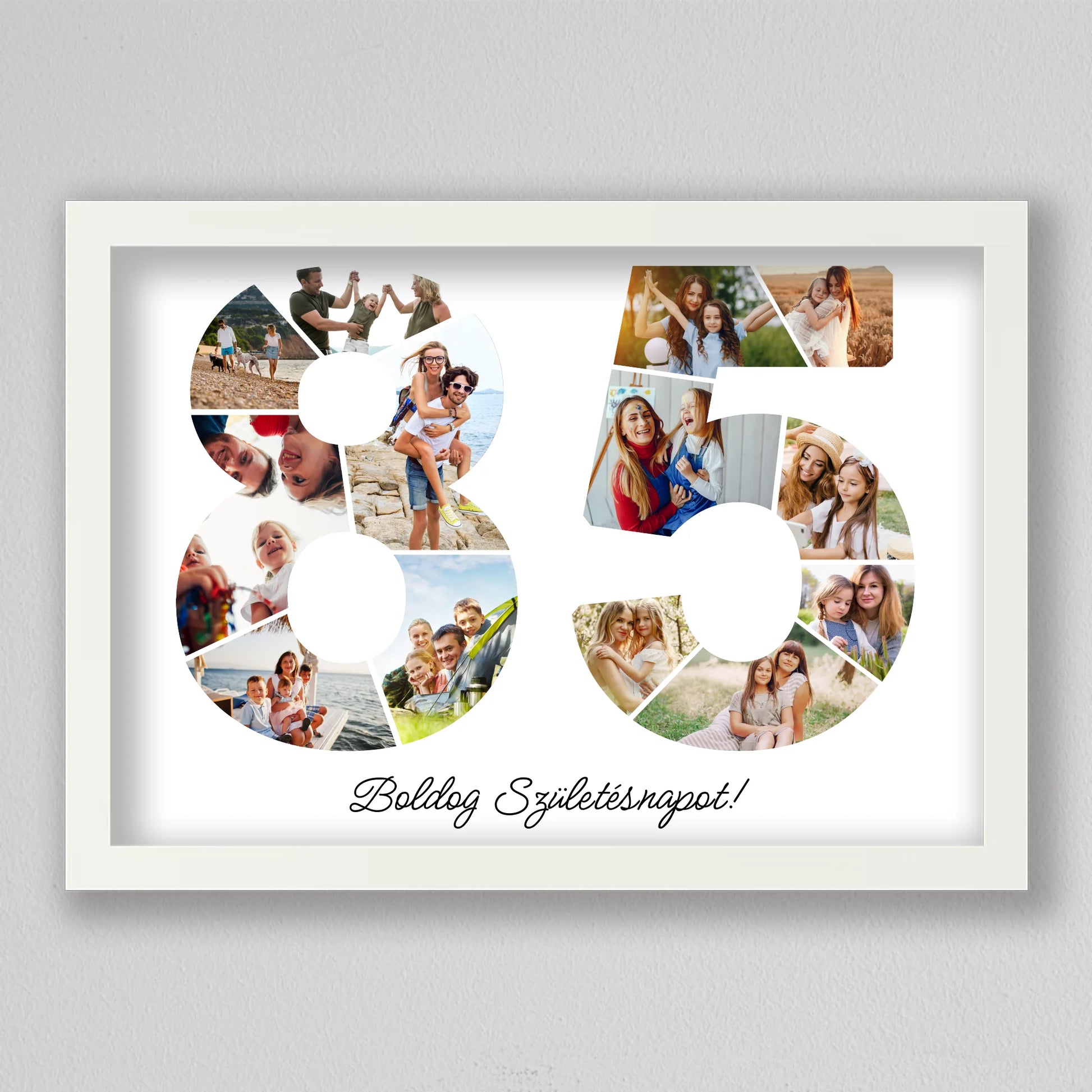 Az Egyedi számos fotókollázs 85. születésnapra vagy évfordulóra a legszemélyesebb ajándék, amely bármely jeles alkalmat felejthetetlenné tesz. Az élet legszebb pillanatait jelenítheted meg egy látványos, “85” formába rendezett kollázsban. A vásárlók saját fotóikból állíthatják össze a kollázst, így igazán egyedi és érzelmi töltetű ajándékot nyújtva. A prémium minőségű kivitel és a személyre szabhatóság gondoskodik arról, hogy ez az emlék ne csak szép, de maradandó is legyen. Tökéletes választás születésnapokra, évfordulókra vagy bármilyen különleges eseményre, amikor az érzelmi kötődés és a személyes ajándék a központi elem.