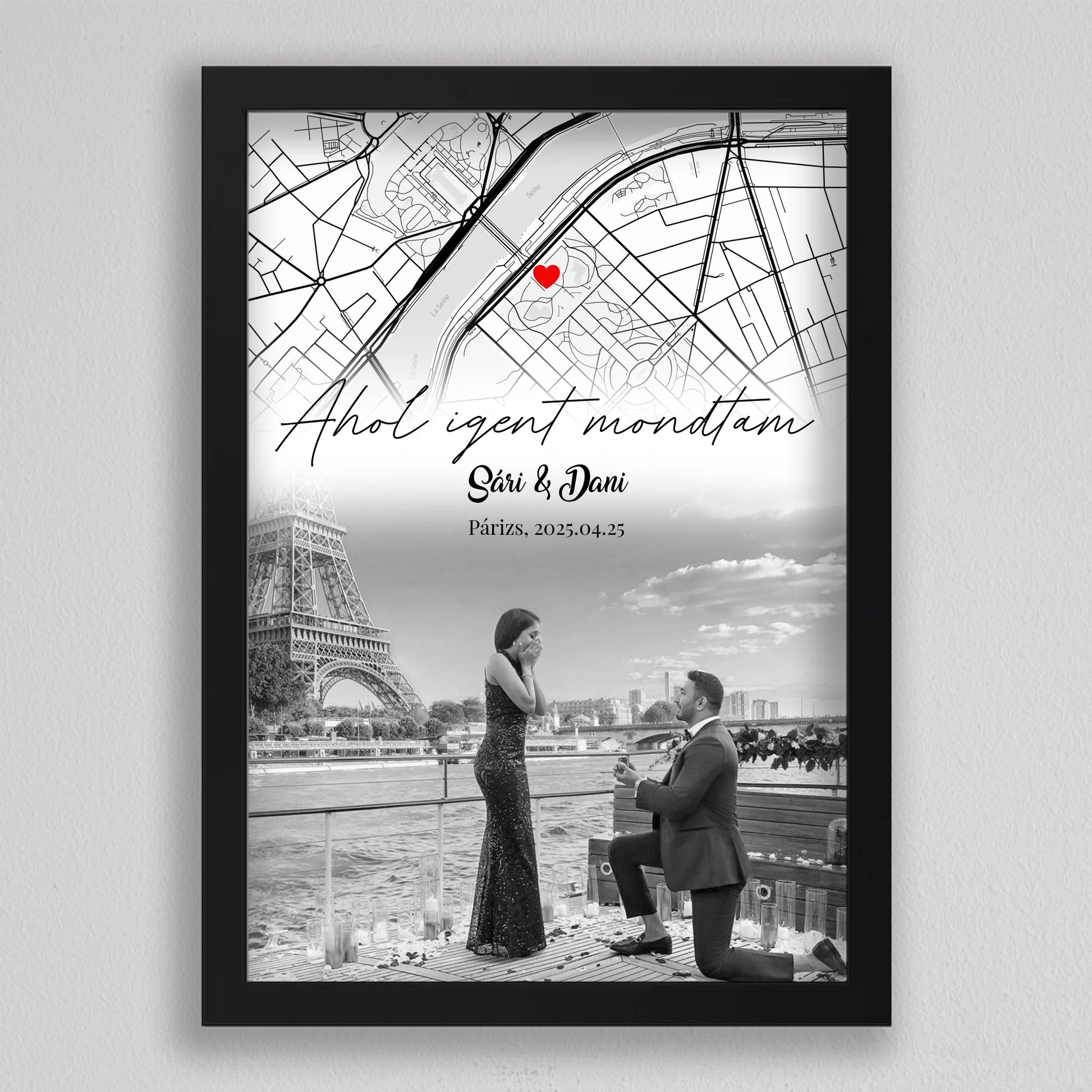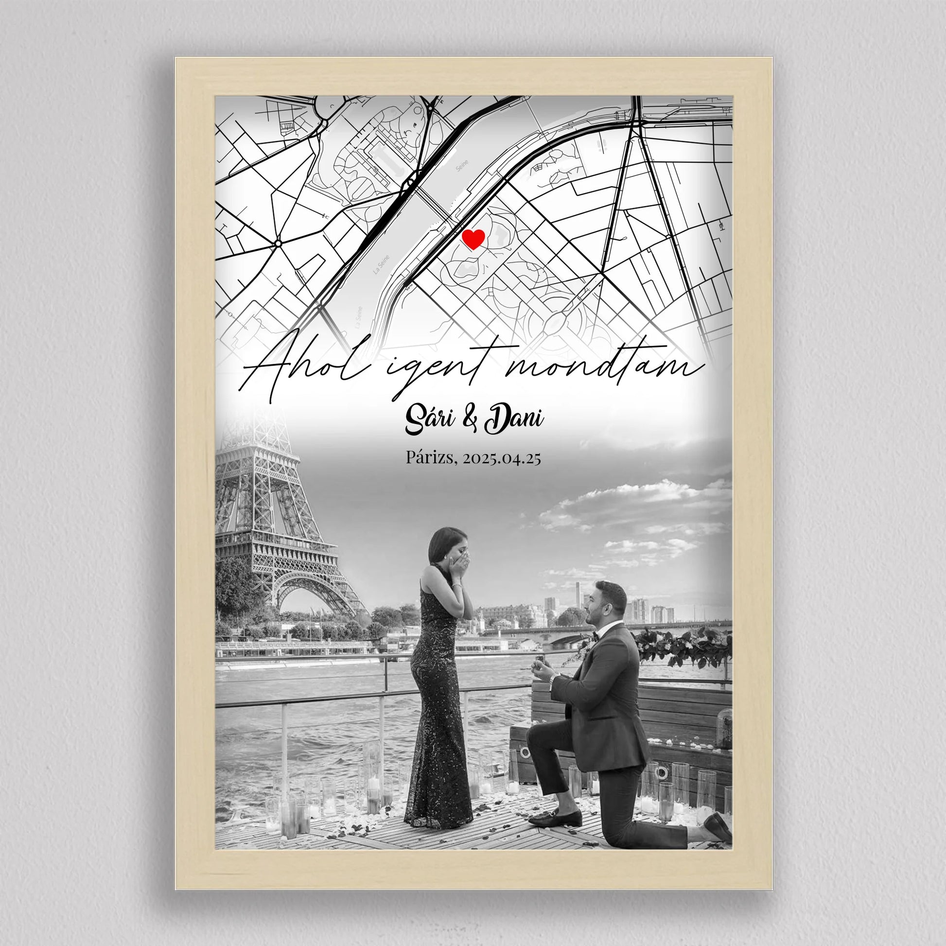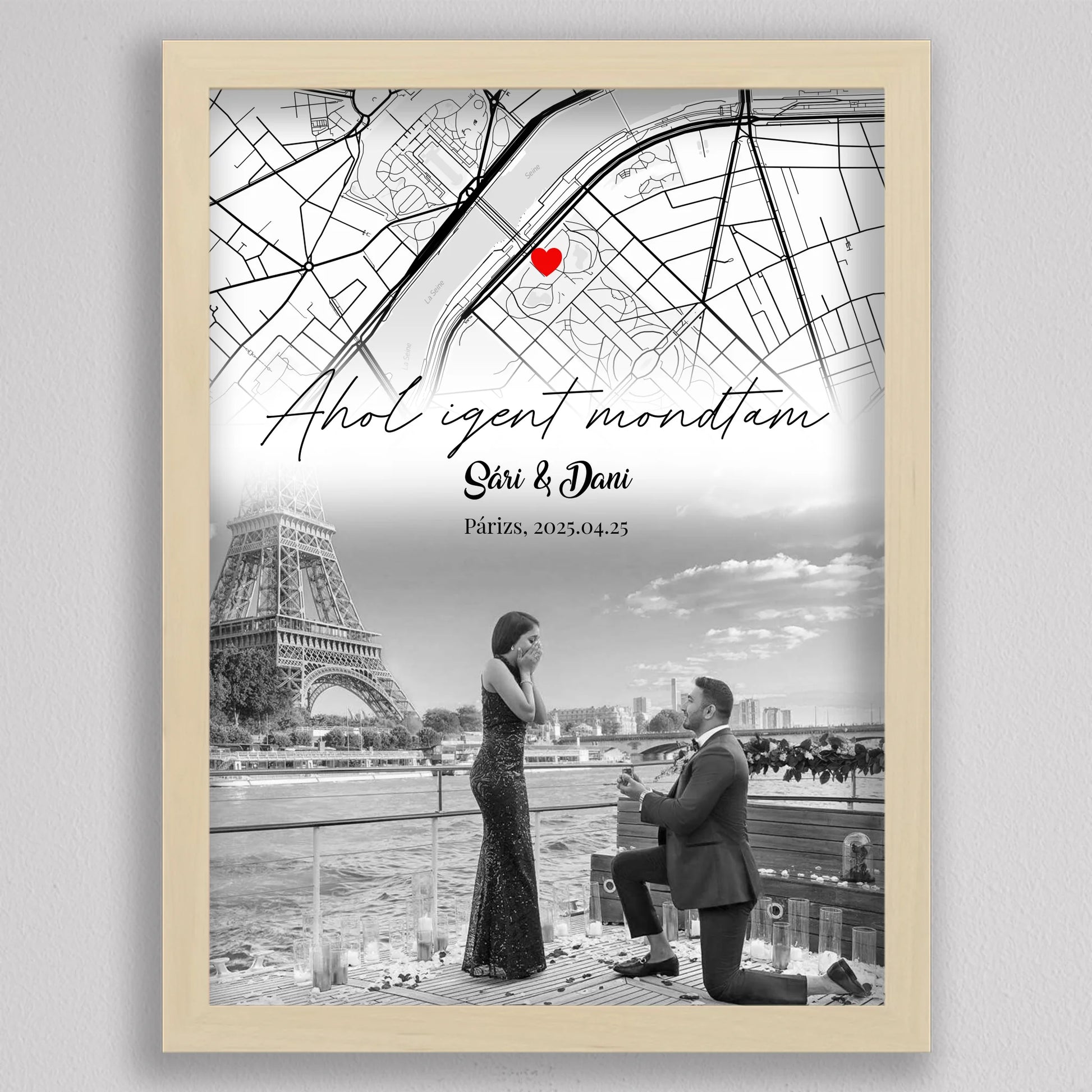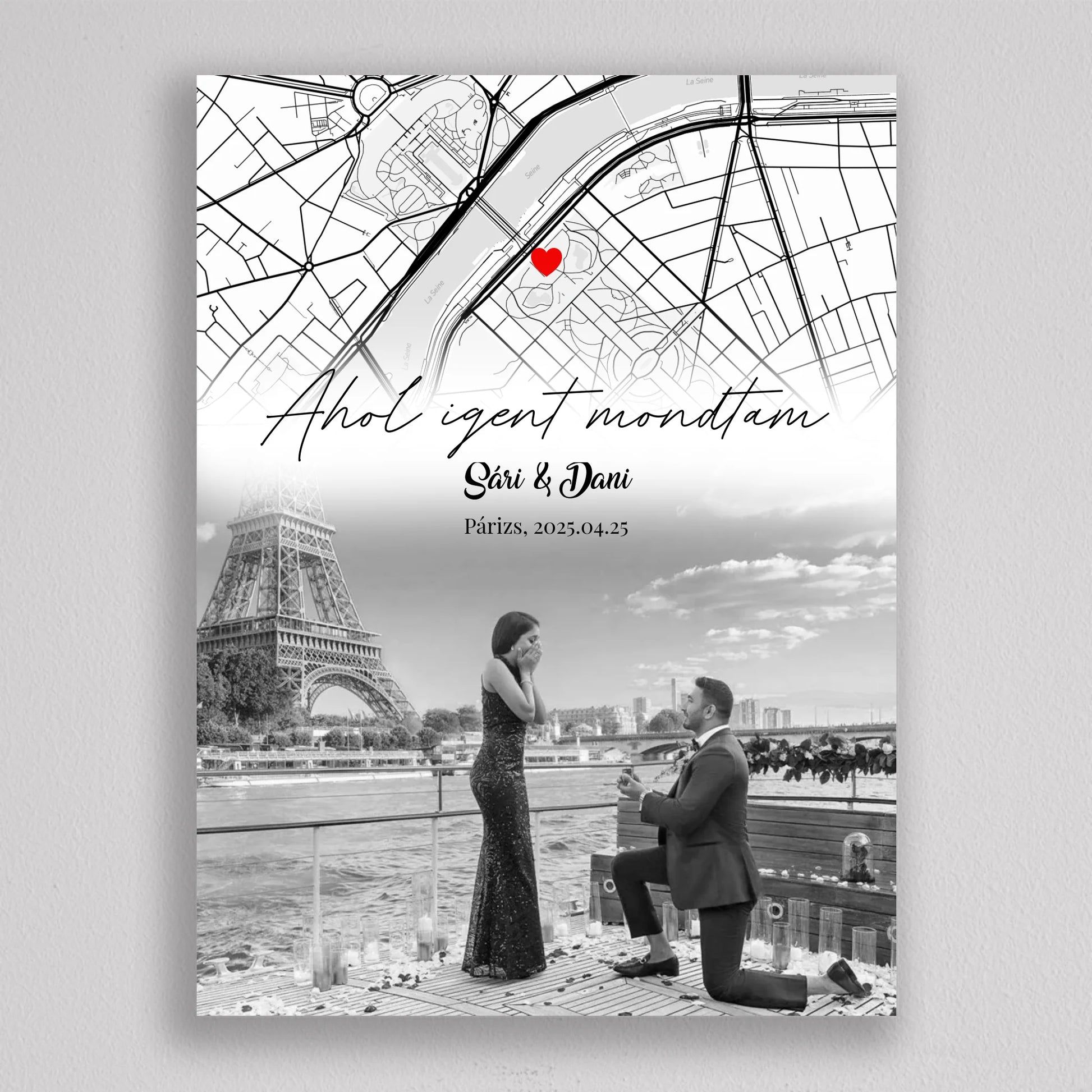 Örökítsd meg azt a pillanatot, amikor kimondtad az igent – stílusosan és maradandó módon! Ez az egyedi eljegyzési emlékkollázs a Ti történetetekről szól: a helyszín térképen, a dátum, a nevek és a megható fotó egy kompozícióban kelnek életre. A letisztult design elegáns, ugyanakkor mélyen személyes – tökéletes ajándék lehet évfordulóra, karácsonyra vagy esküvői dekorációként is. A térkép stílusa és színei teljes mértékben személyre szabhatók, hogy harmonizáljon az otthonod vagy az esemény hangulatával. Egy olyan dekoráció, ami nem csupán szép, de jelentéssel is bír – újra és újra feleleveníti a közös jövőtök kezdetét.