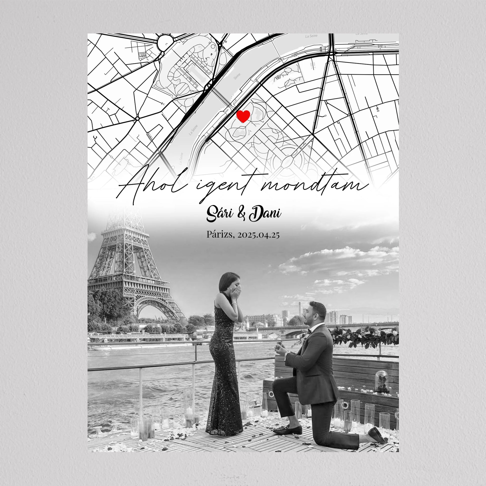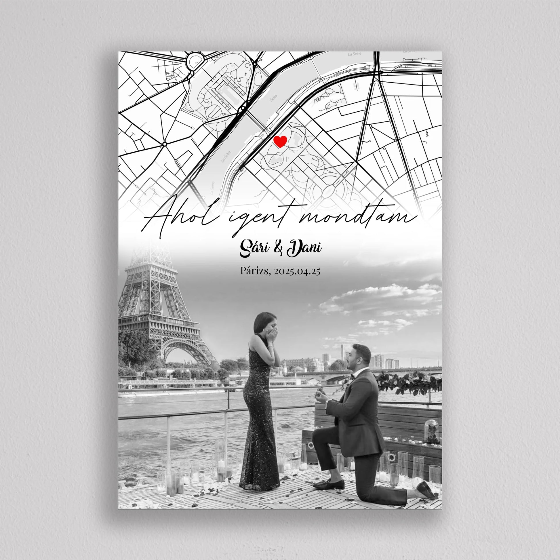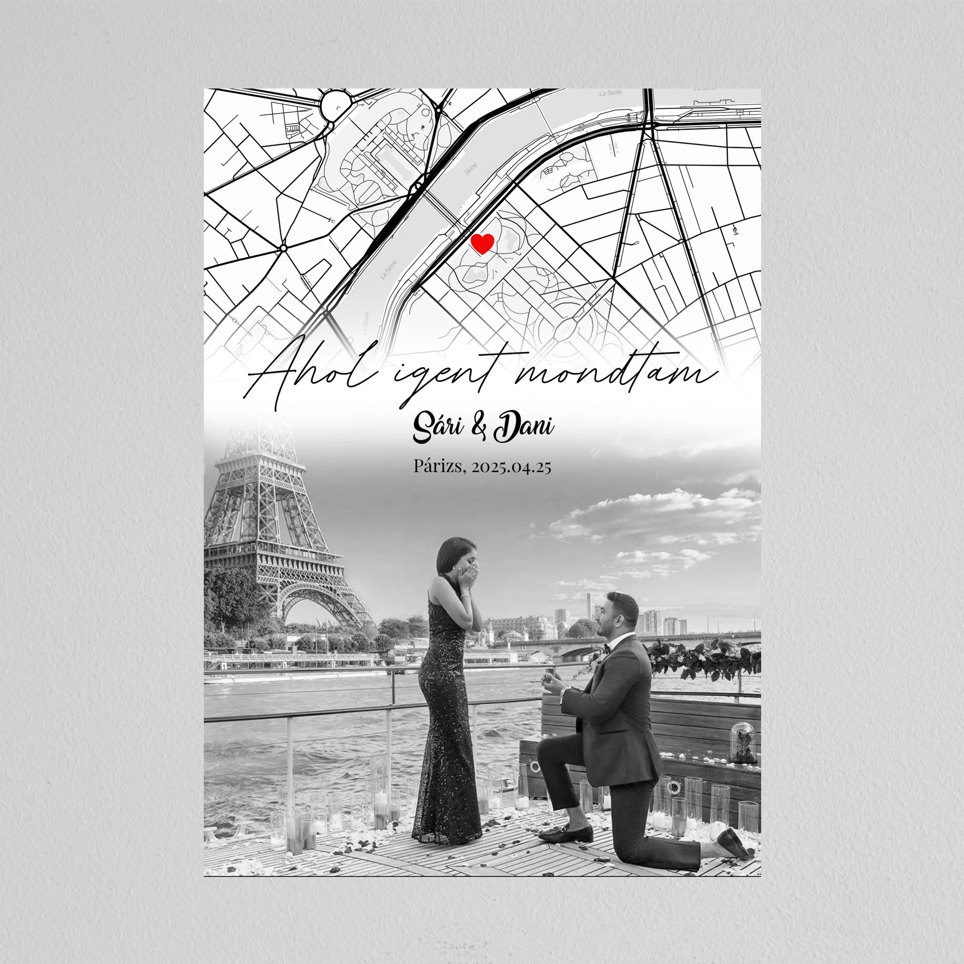 Örökítsd meg azt a pillanatot, amikor kimondtad az igent – stílusosan és maradandó módon! Ez az egyedi eljegyzési emlékkollázs a Ti történetetekről szól: a helyszín térképen, a dátum, a nevek és a megható fotó egy kompozícióban kelnek életre. A letisztult design elegáns, ugyanakkor mélyen személyes – tökéletes ajándék lehet évfordulóra, karácsonyra vagy esküvői dekorációként is. A térkép stílusa és színei teljes mértékben személyre szabhatók, hogy harmonizáljon az otthonod vagy az esemény hangulatával. Egy olyan dekoráció, ami nem csupán szép, de jelentéssel is bír – újra és újra feleleveníti a közös jövőtök kezdetét.