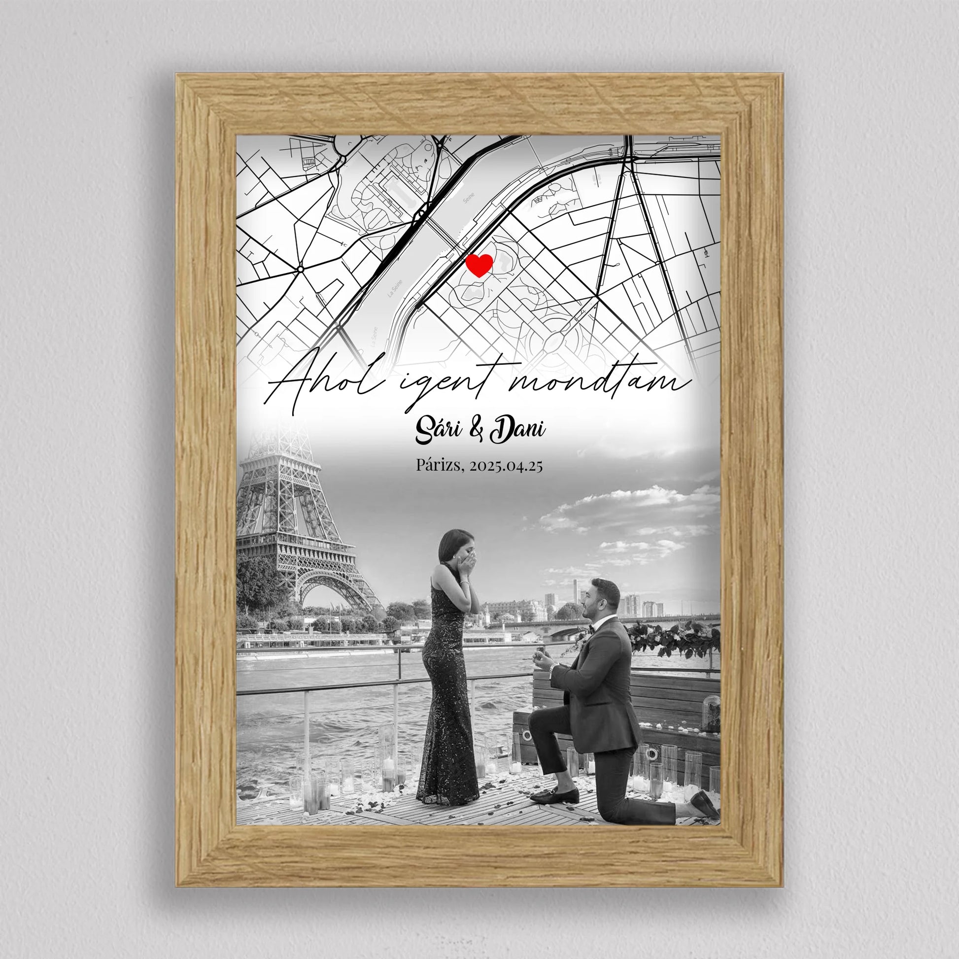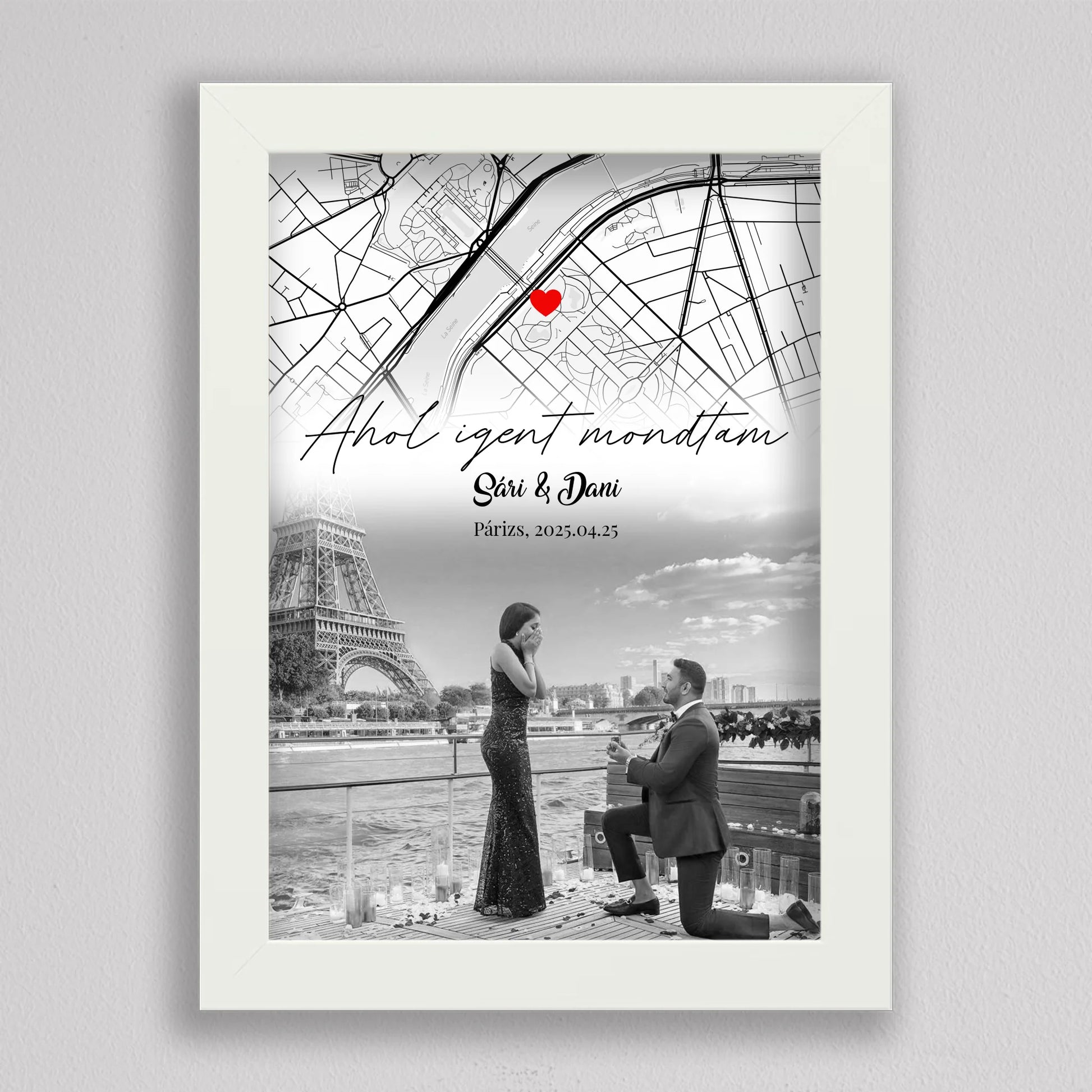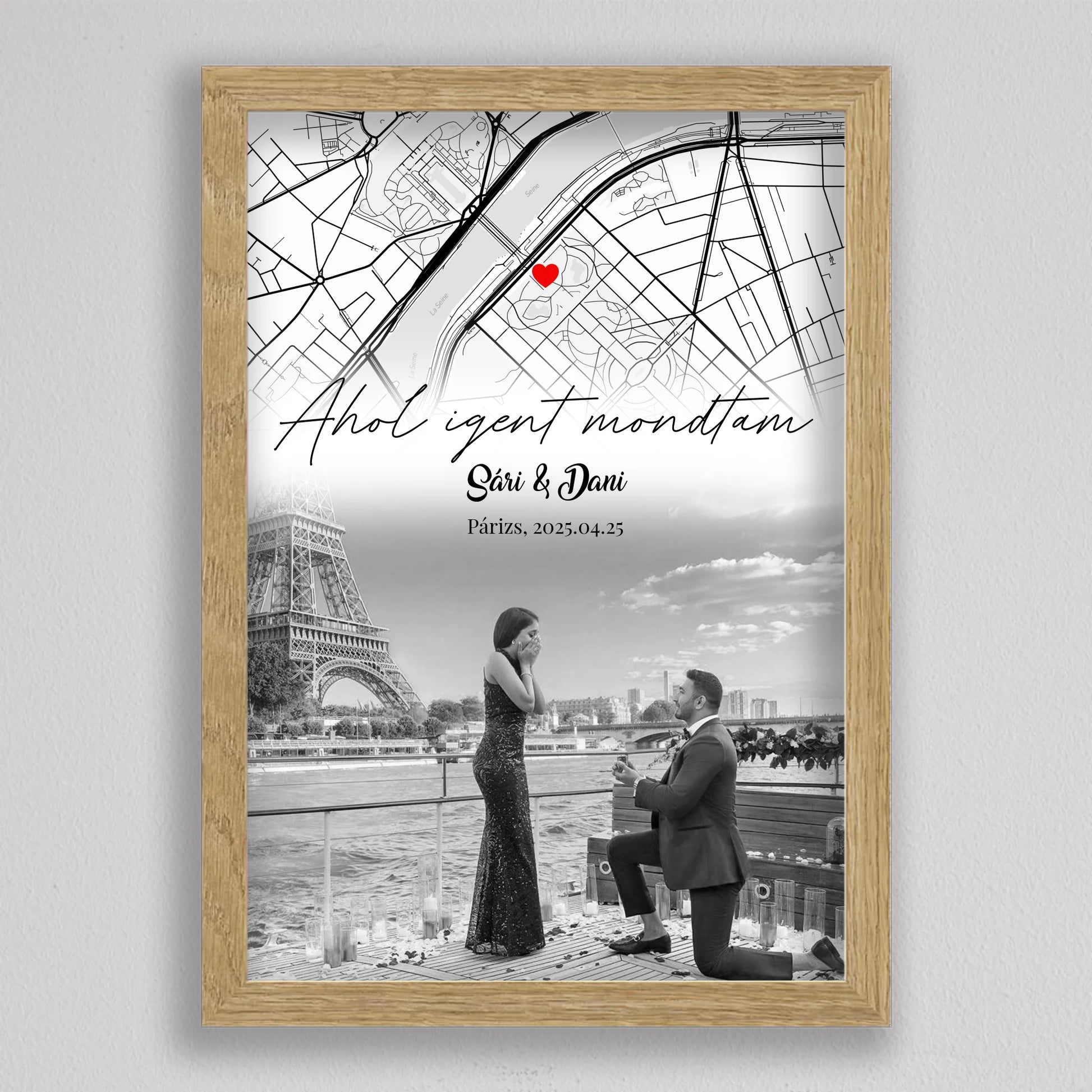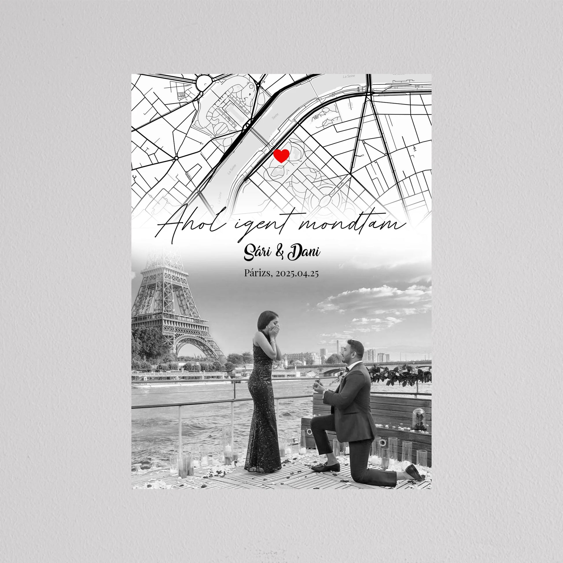 Örökítsd meg azt a pillanatot, amikor kimondtad az igent – stílusosan és maradandó módon! Ez az egyedi eljegyzési emlékkollázs a Ti történetetekről szól: a helyszín térképen, a dátum, a nevek és a megható fotó egy kompozícióban kelnek életre. A letisztult design elegáns, ugyanakkor mélyen személyes – tökéletes ajándék lehet évfordulóra, karácsonyra vagy esküvői dekorációként is. A térkép stílusa és színei teljes mértékben személyre szabhatók, hogy harmonizáljon az otthonod vagy az esemény hangulatával. Egy olyan dekoráció, ami nem csupán szép, de jelentéssel is bír – újra és újra feleleveníti a közös jövőtök kezdetét.