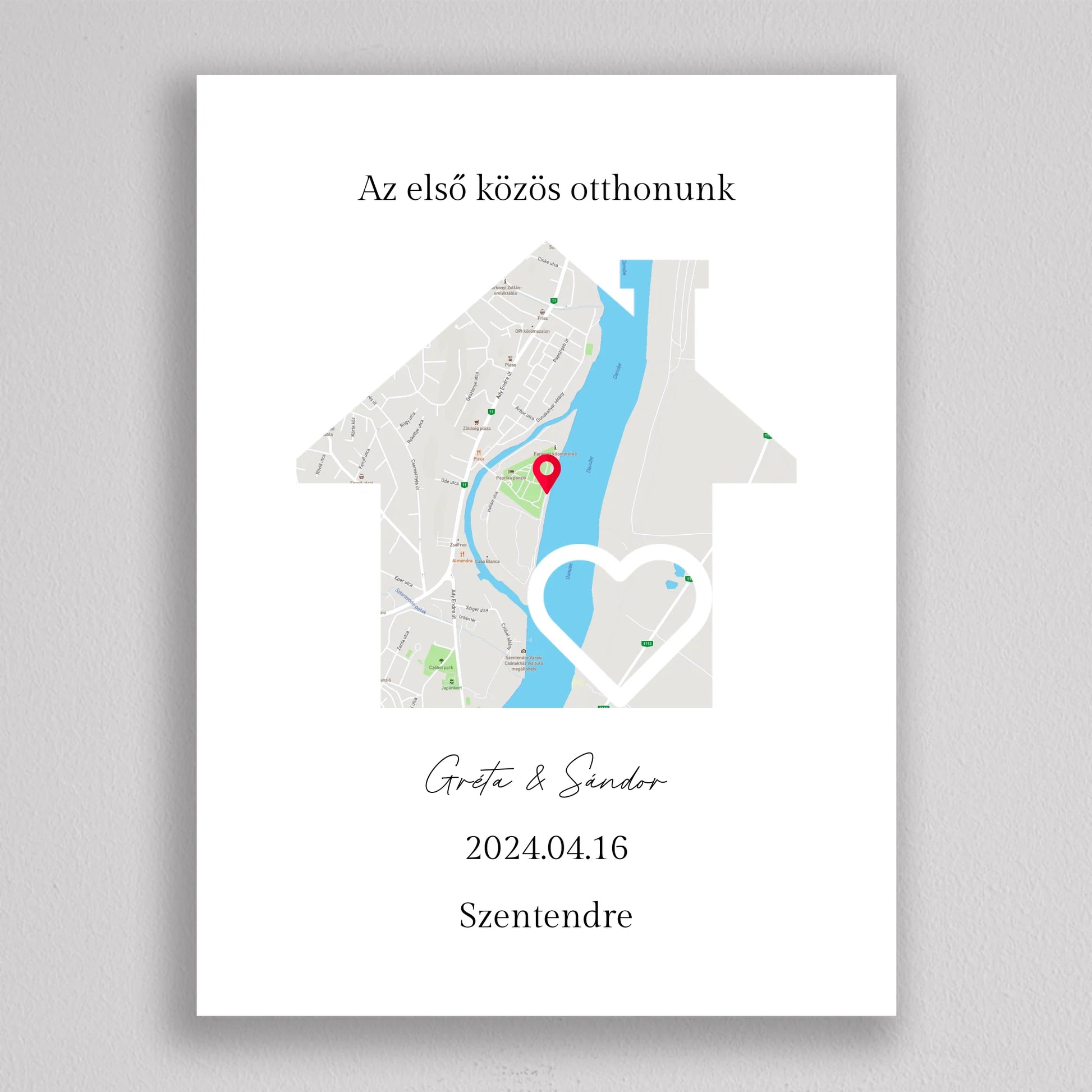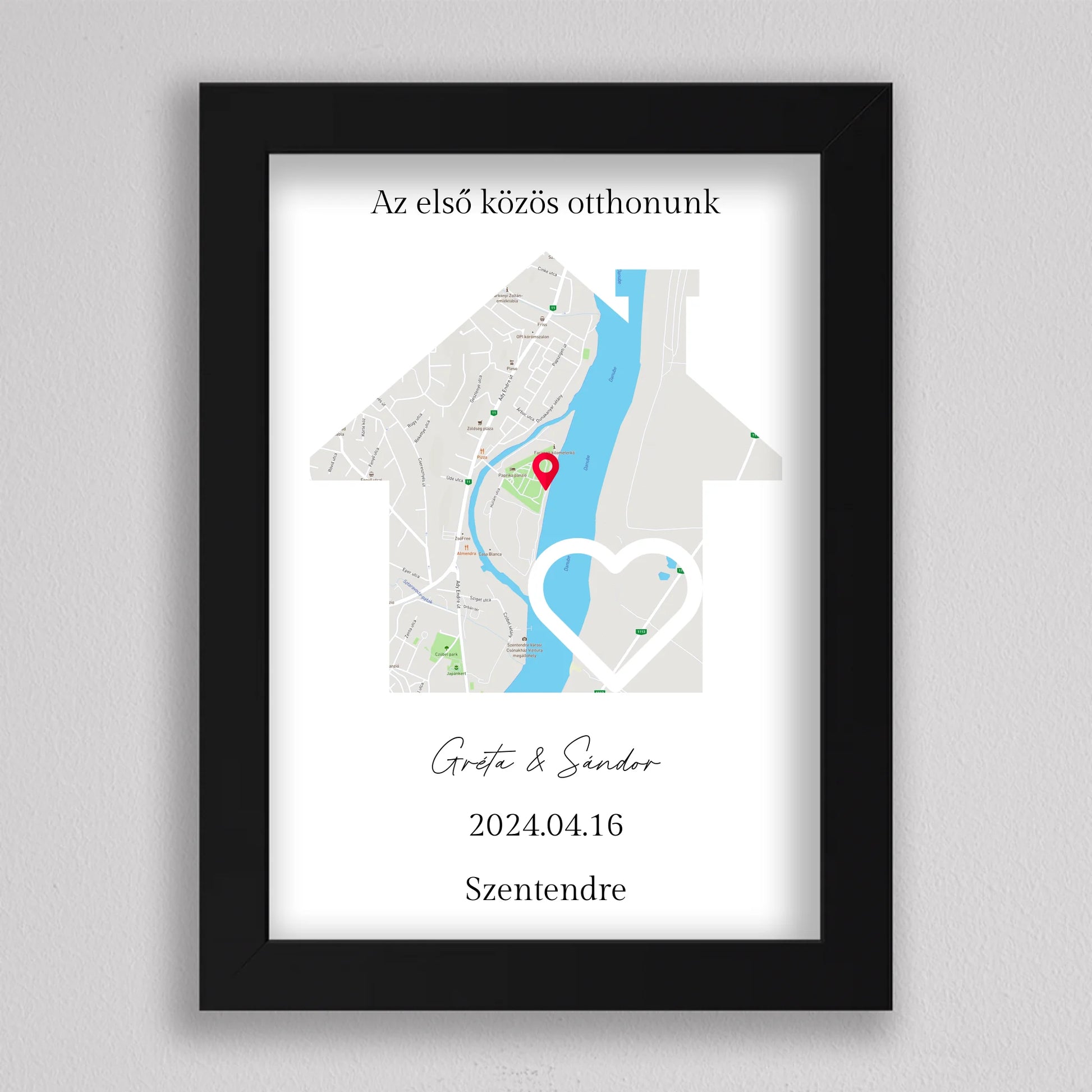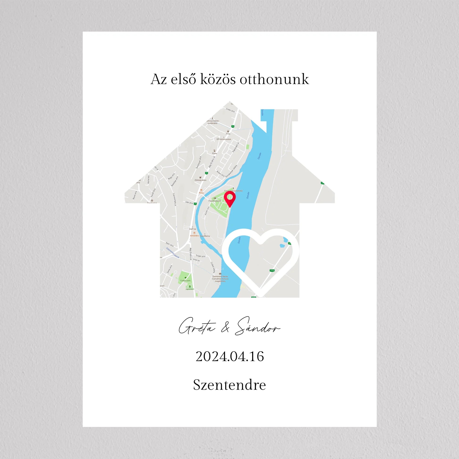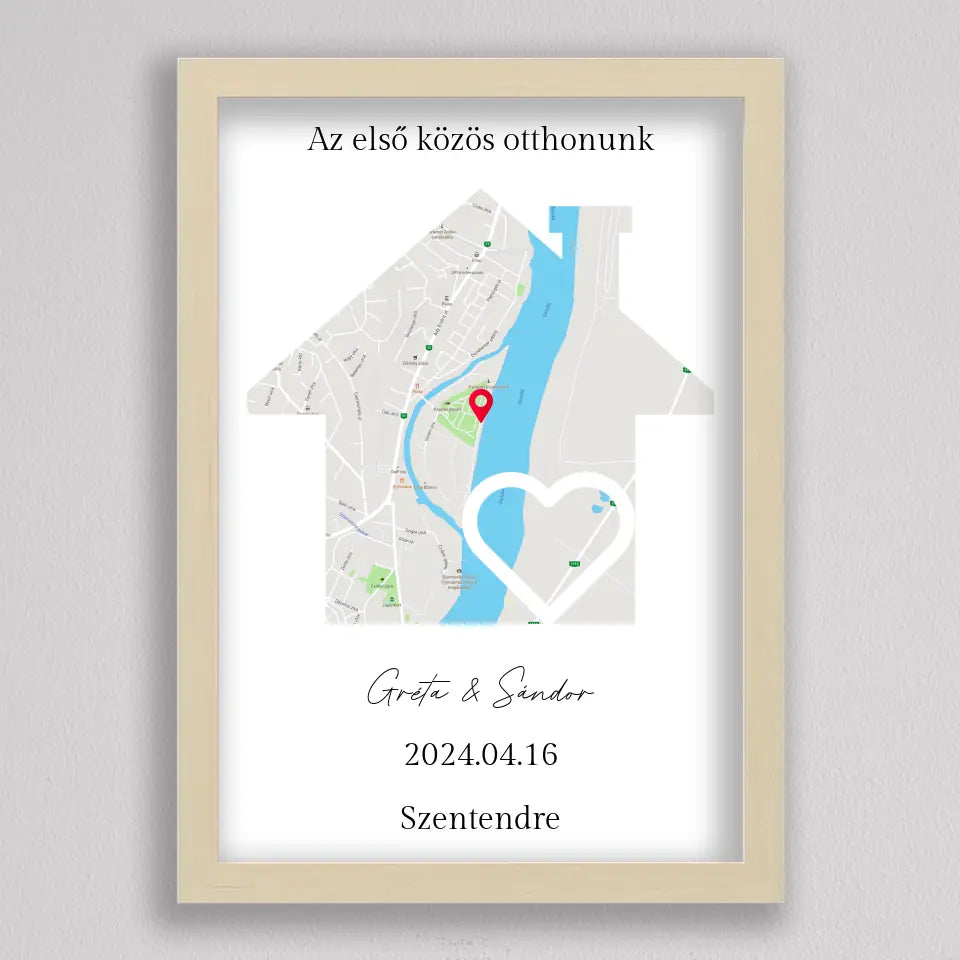 Az Első közös otthonunk térkép kollázs különleges és személyre szabható dekoráció, amely egyedi módon örökíti meg azt a helyszínt, ahol közös életetek kezdődött. A térképen pontosan megjelölheted a helyet, ahol első otthonotokat megteremtettétek, és még a dátumot is hozzáadhatod, hogy örökre emlékezetes maradjon. Ez a modern és stílusos térkép egy gyönyörű szív alakú útvonalat is tartalmaz, amely még szimbolikusabbá teszi a dekorációt. Tökéletes ajándék lehet évfordulókra, házavatóra, vagy akár nászajándéknak is. Az egyszerű, de elegáns dizájn minden enteriőrbe könnyedén illeszkedik, miközben személyes jelentőséggel bír.