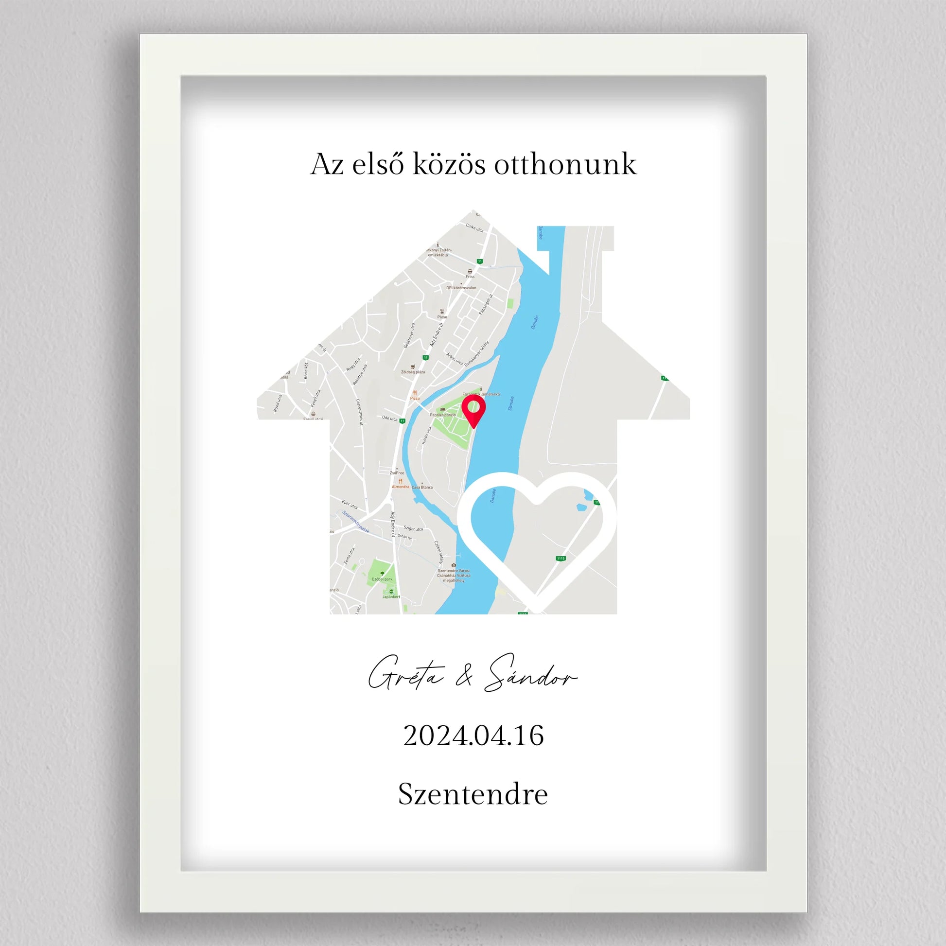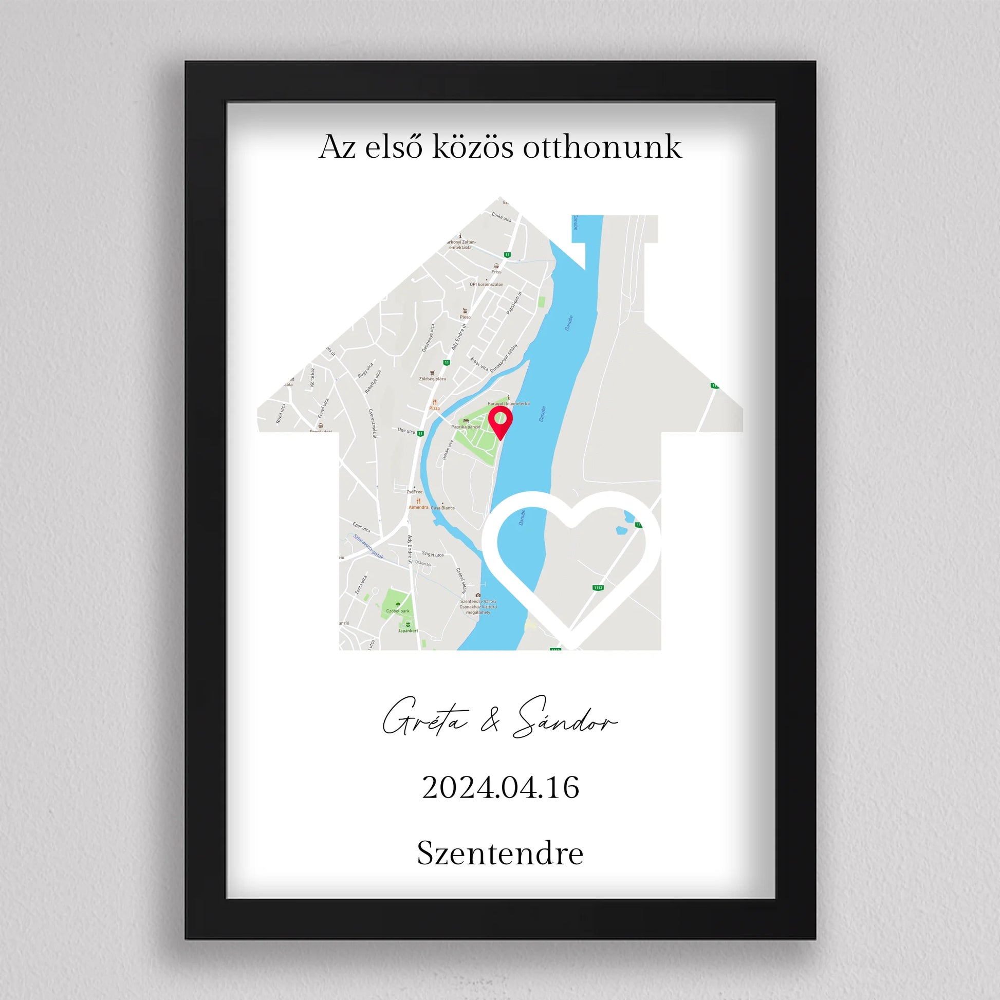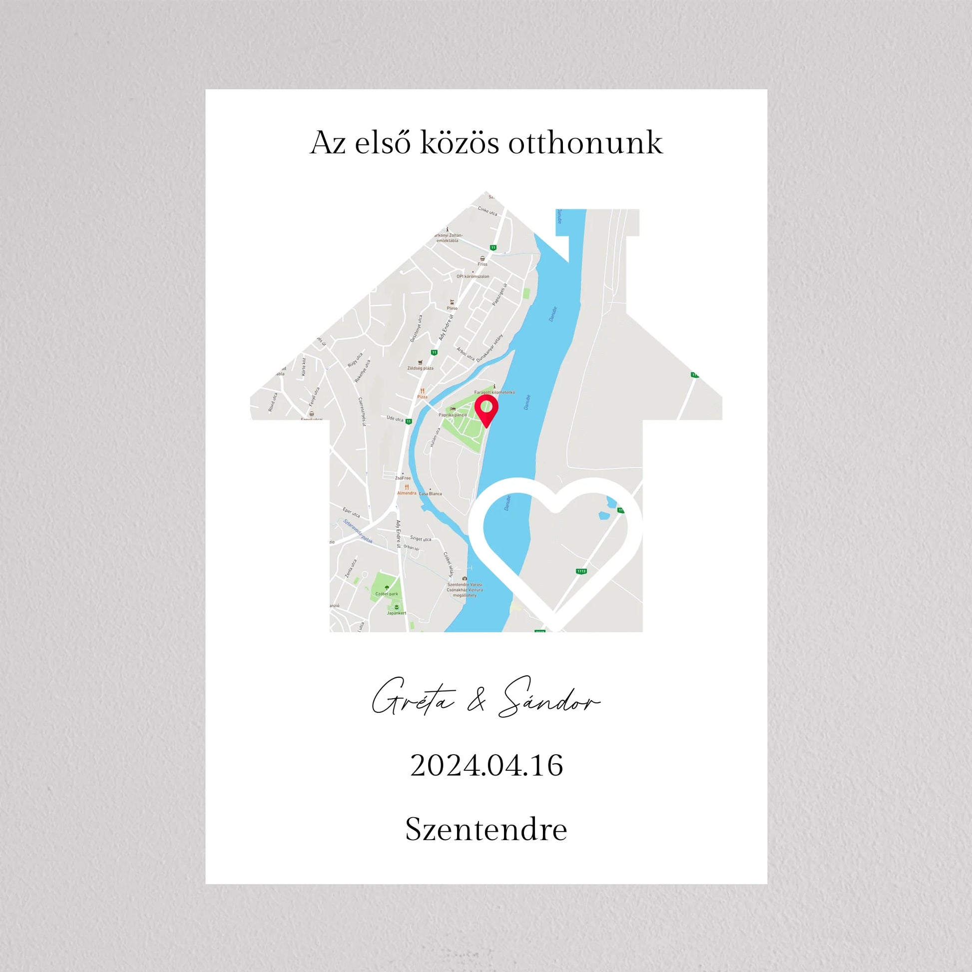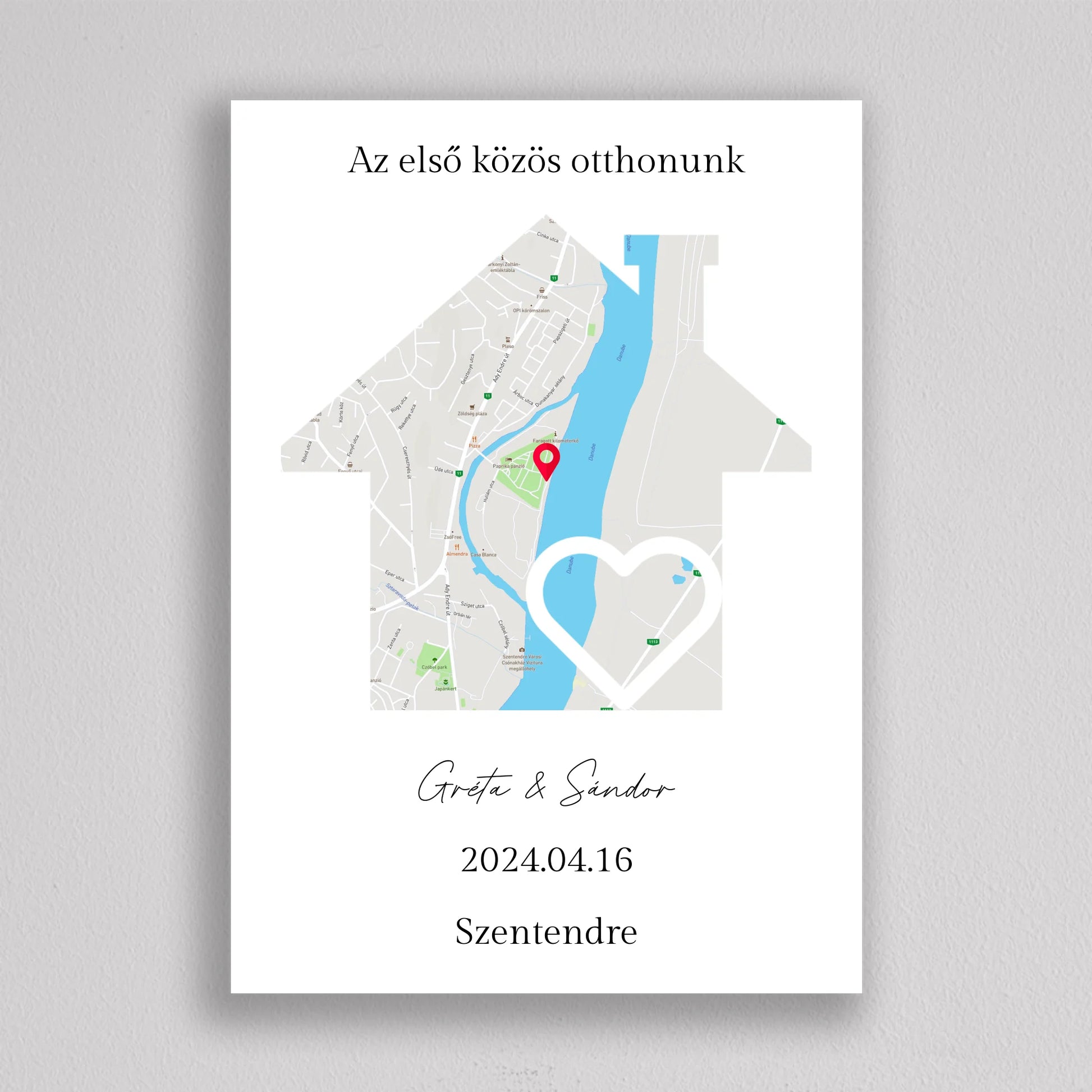 Az Első közös otthonunk térkép kollázs különleges és személyre szabható dekoráció, amely egyedi módon örökíti meg azt a helyszínt, ahol közös életetek kezdődött. A térképen pontosan megjelölheted a helyet, ahol első otthonotokat megteremtettétek, és még a dátumot is hozzáadhatod, hogy örökre emlékezetes maradjon. Ez a modern és stílusos térkép egy gyönyörű szív alakú útvonalat is tartalmaz, amely még szimbolikusabbá teszi a dekorációt. Tökéletes ajándék lehet évfordulókra, házavatóra, vagy akár nászajándéknak is. Az egyszerű, de elegáns dizájn minden enteriőrbe könnyedén illeszkedik, miközben személyes jelentőséggel bír.