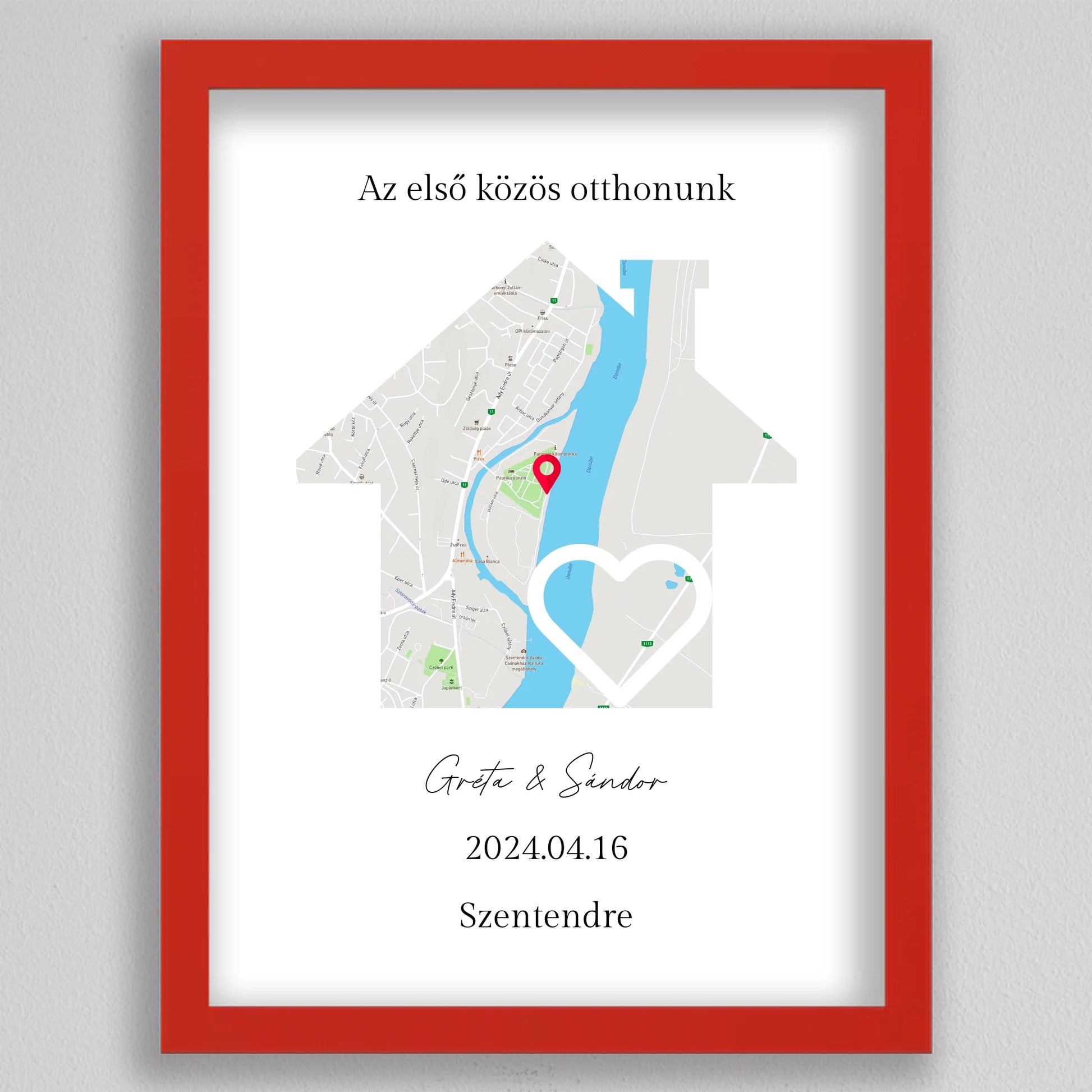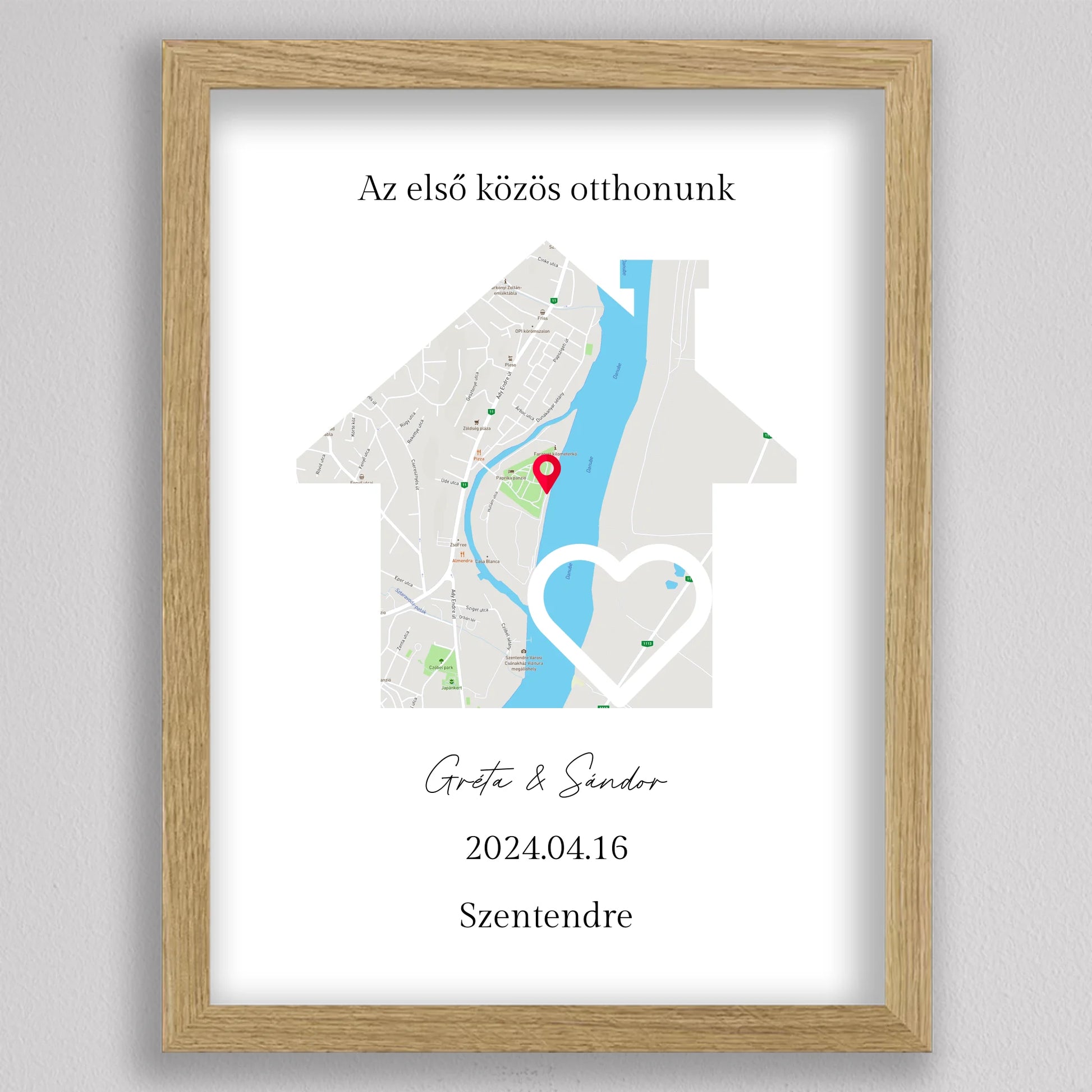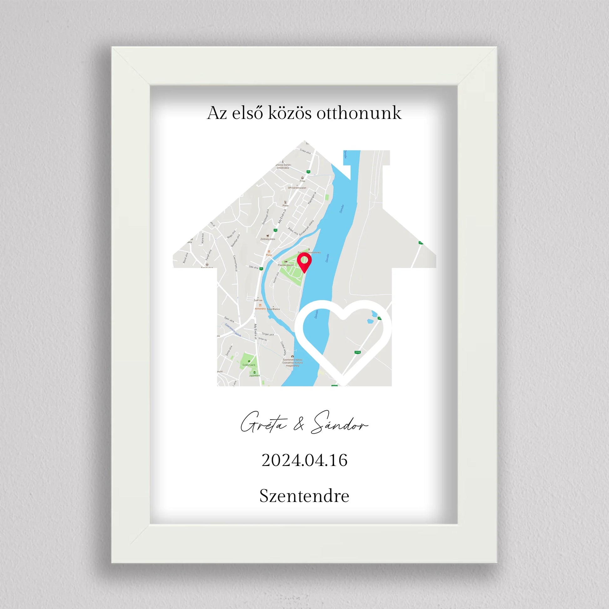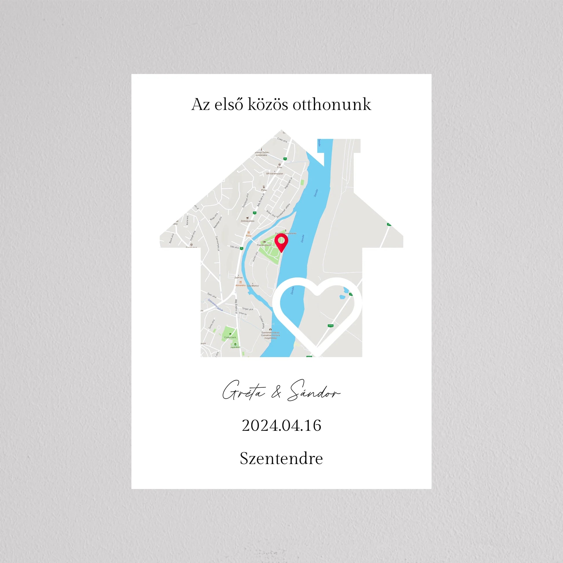 Az Első közös otthonunk térkép kollázs különleges és személyre szabható dekoráció, amely egyedi módon örökíti meg azt a helyszínt, ahol közös életetek kezdődött. A térképen pontosan megjelölheted a helyet, ahol első otthonotokat megteremtettétek, és még a dátumot is hozzáadhatod, hogy örökre emlékezetes maradjon. Ez a modern és stílusos térkép egy gyönyörű szív alakú útvonalat is tartalmaz, amely még szimbolikusabbá teszi a dekorációt. Tökéletes ajándék lehet évfordulókra, házavatóra, vagy akár nászajándéknak is. Az egyszerű, de elegáns dizájn minden enteriőrbe könnyedén illeszkedik, miközben személyes jelentőséggel bír.