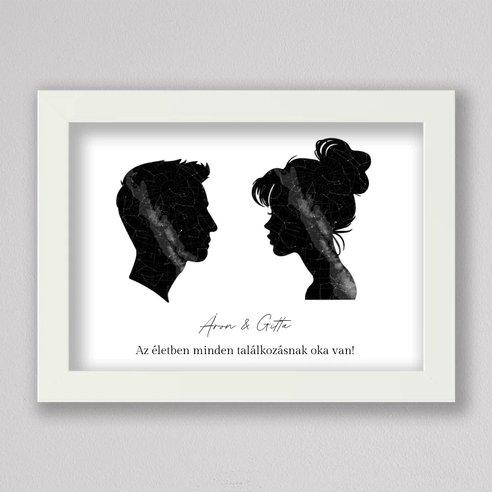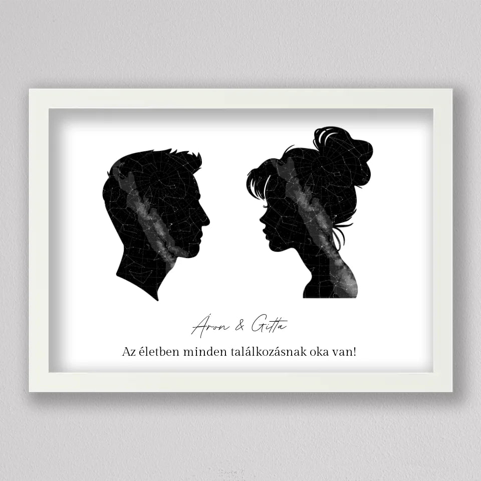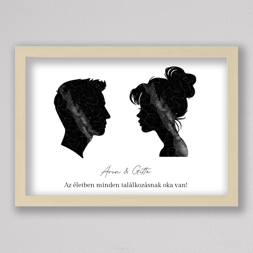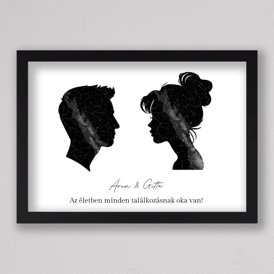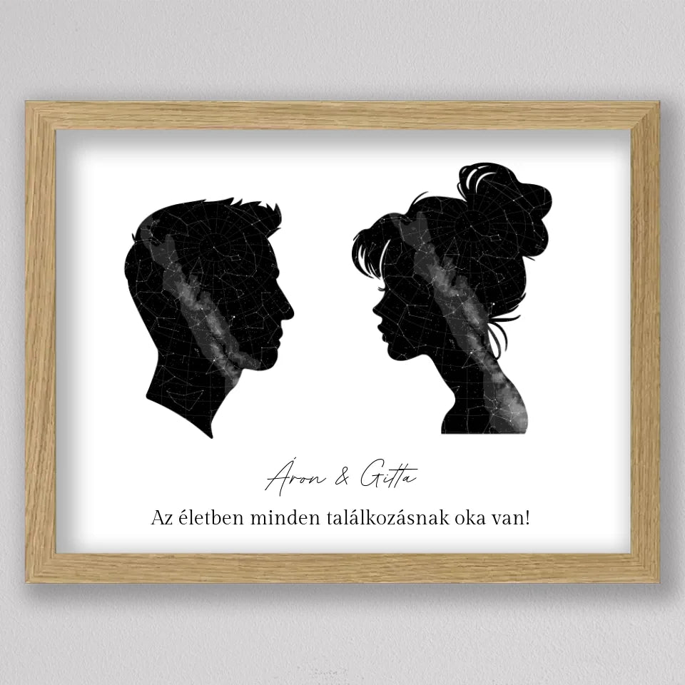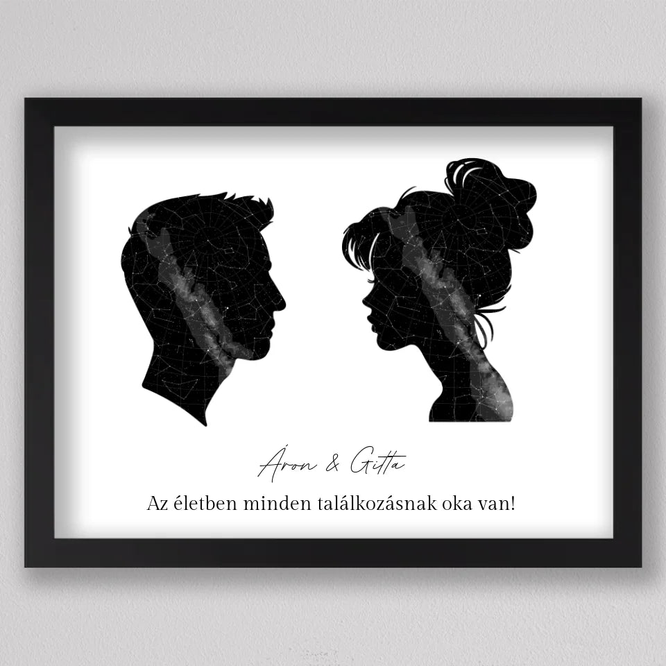A Szerelmes pár csillagtérkép - többszínű egy különleges és romantikus ajándék, amely személyre szabható, így tökéletes lehet évfordulóra, eljegyzésre vagy bármilyen különleges alkalomra. A csillagtérképen az adott pillanat égboltjának pontos csillagállása jelenik meg a pár sziluettjén belül, amely egyedülállóan tükrözi az érzelmi kötődést és a közös élményeket. Ez a modern és esztétikus dizájn bármely otthon díszévé válhat, és örök emléket állít a szerelmesek közötti különleges pillanatoknak. A termék prémium minőségű nyomtatással készül, és elegáns keretben érkezik, készen állva arra, hogy örömöt szerezzen a megajándékozottnak.