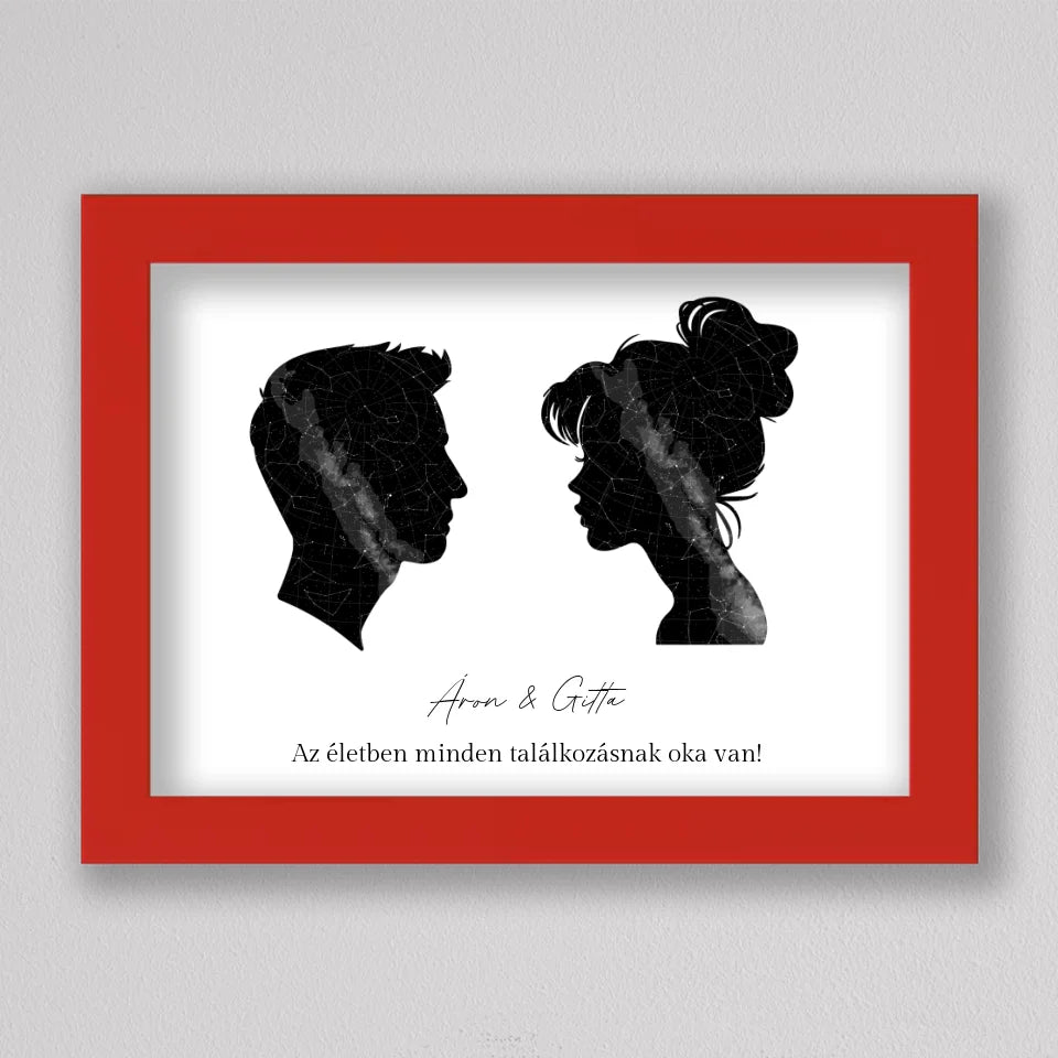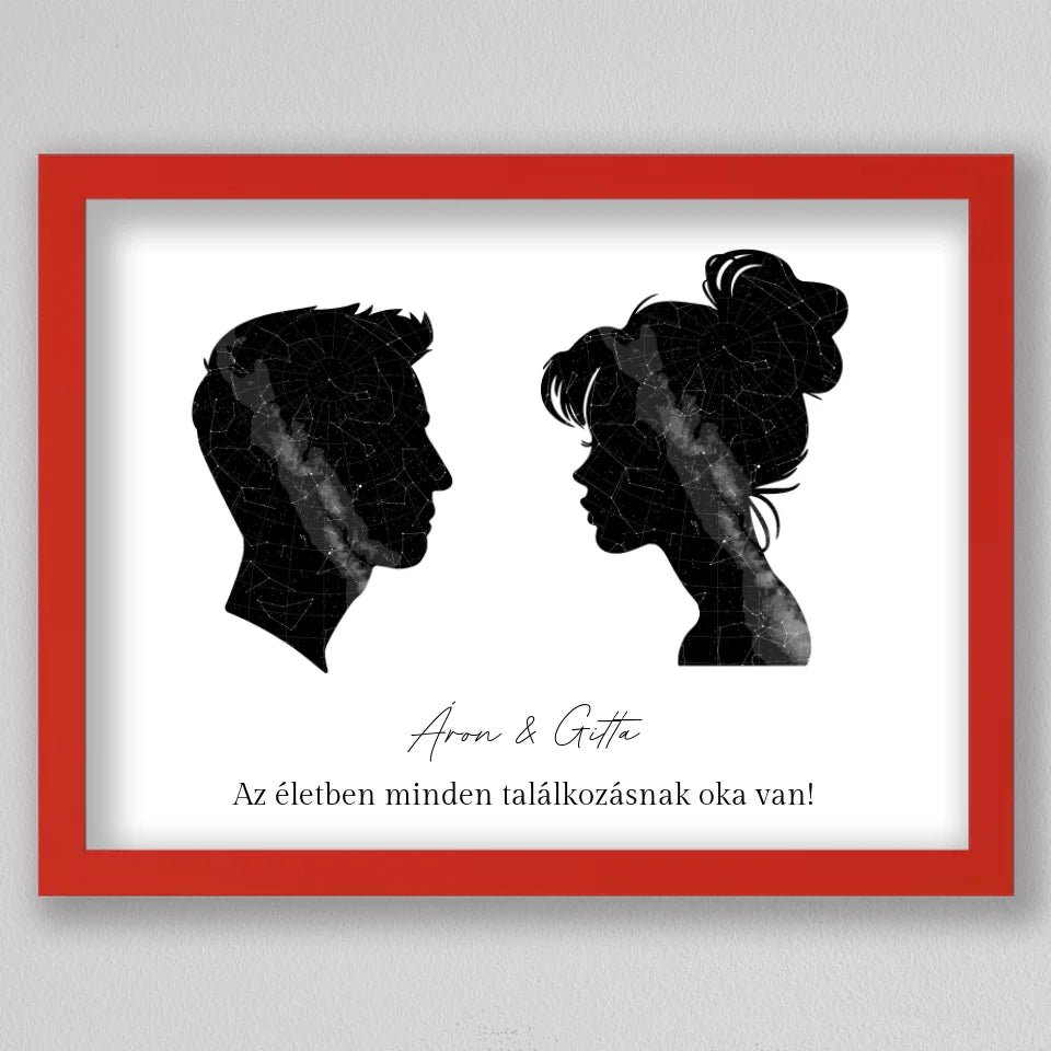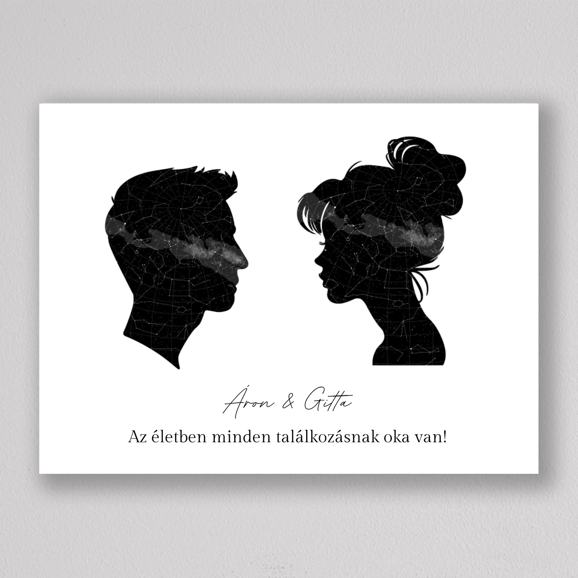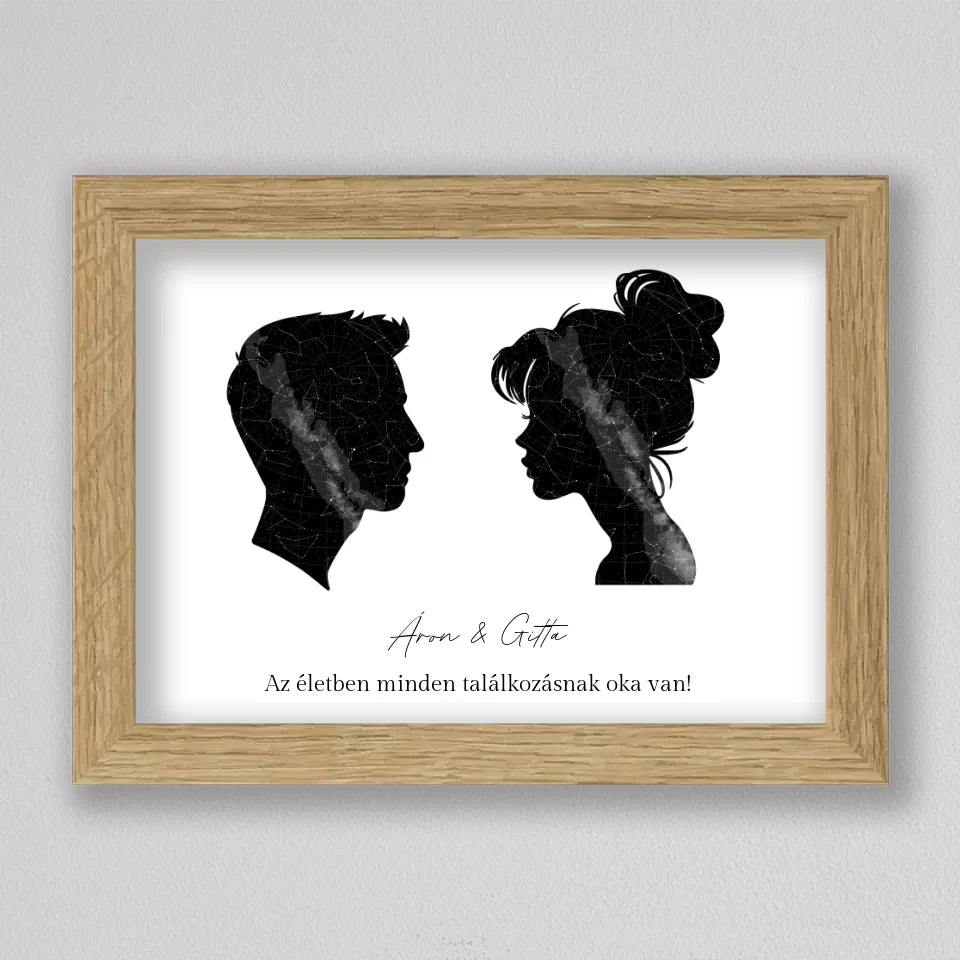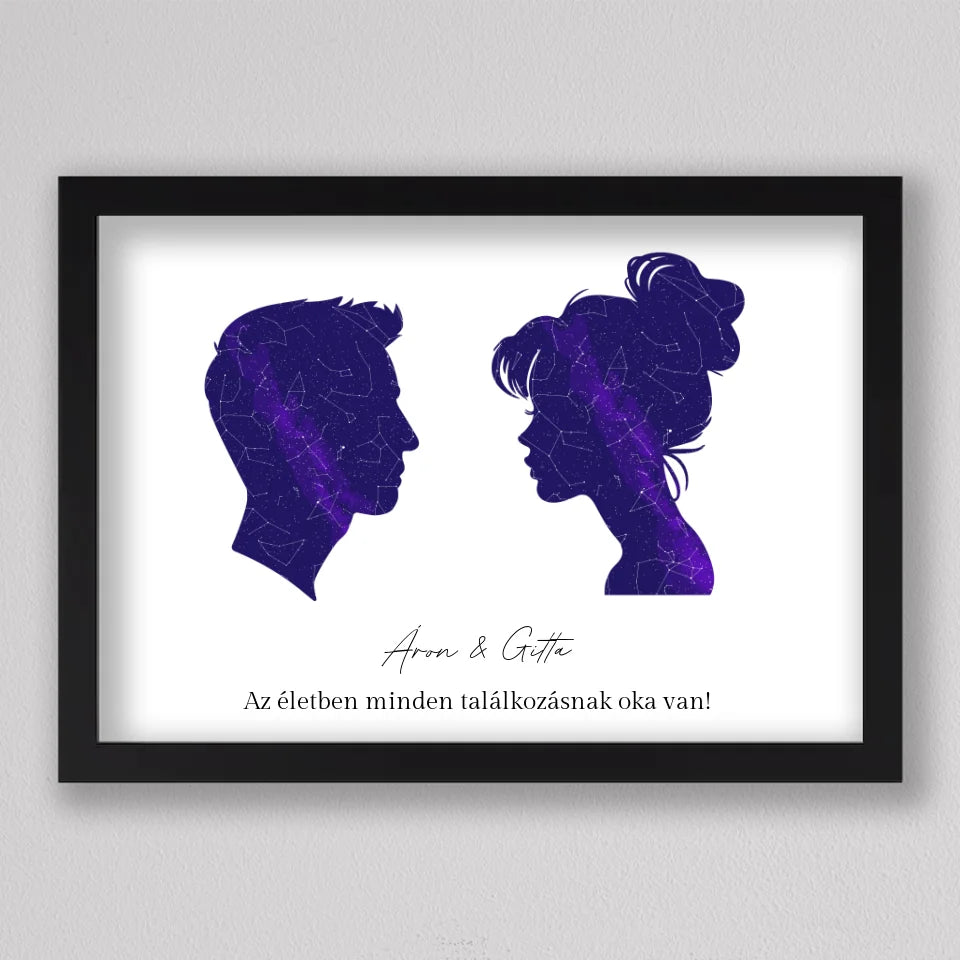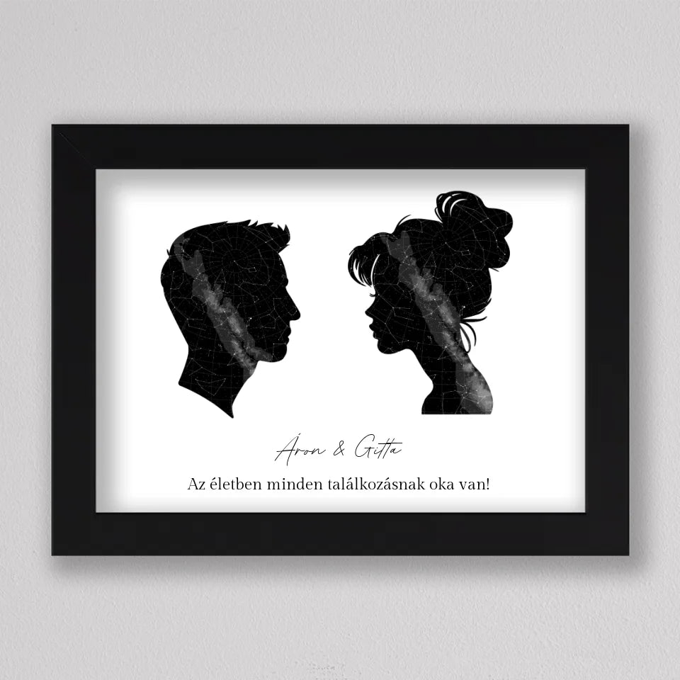 A Szerelmes pár csillagtérkép - többszínű egy különleges és romantikus ajándék, amely személyre szabható, így tökéletes lehet évfordulóra, eljegyzésre vagy bármilyen különleges alkalomra. A csillagtérképen az adott pillanat égboltjának pontos csillagállása jelenik meg a pár sziluettjén belül, amely egyedülállóan tükrözi az érzelmi kötődést és a közös élményeket. Ez a modern és esztétikus dizájn bármely otthon díszévé válhat, és örök emléket állít a szerelmesek közötti különleges pillanatoknak. A termék prémium minőségű nyomtatással készül, és elegáns keretben érkezik, készen állva arra, hogy örömöt szerezzen a megajándékozottnak.
