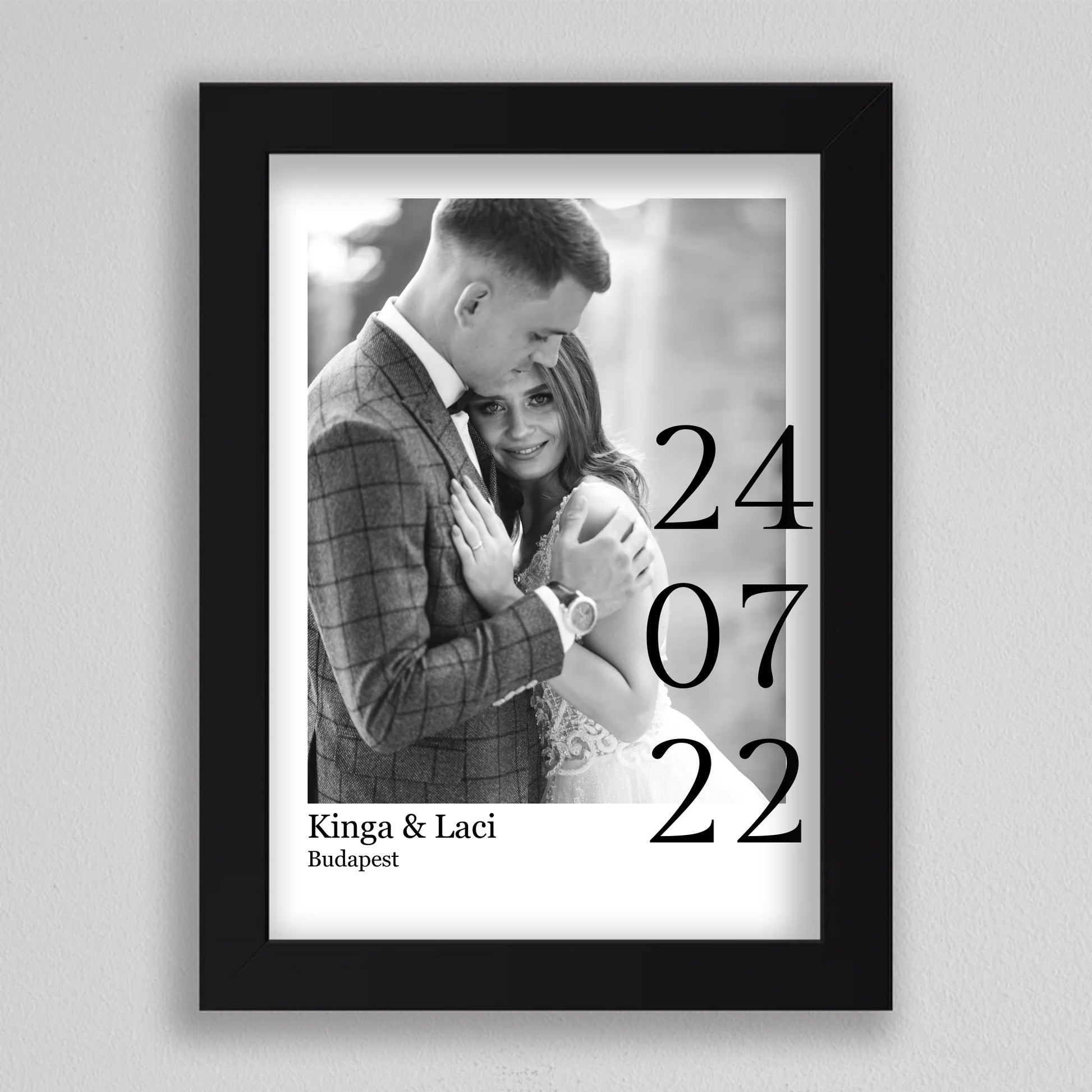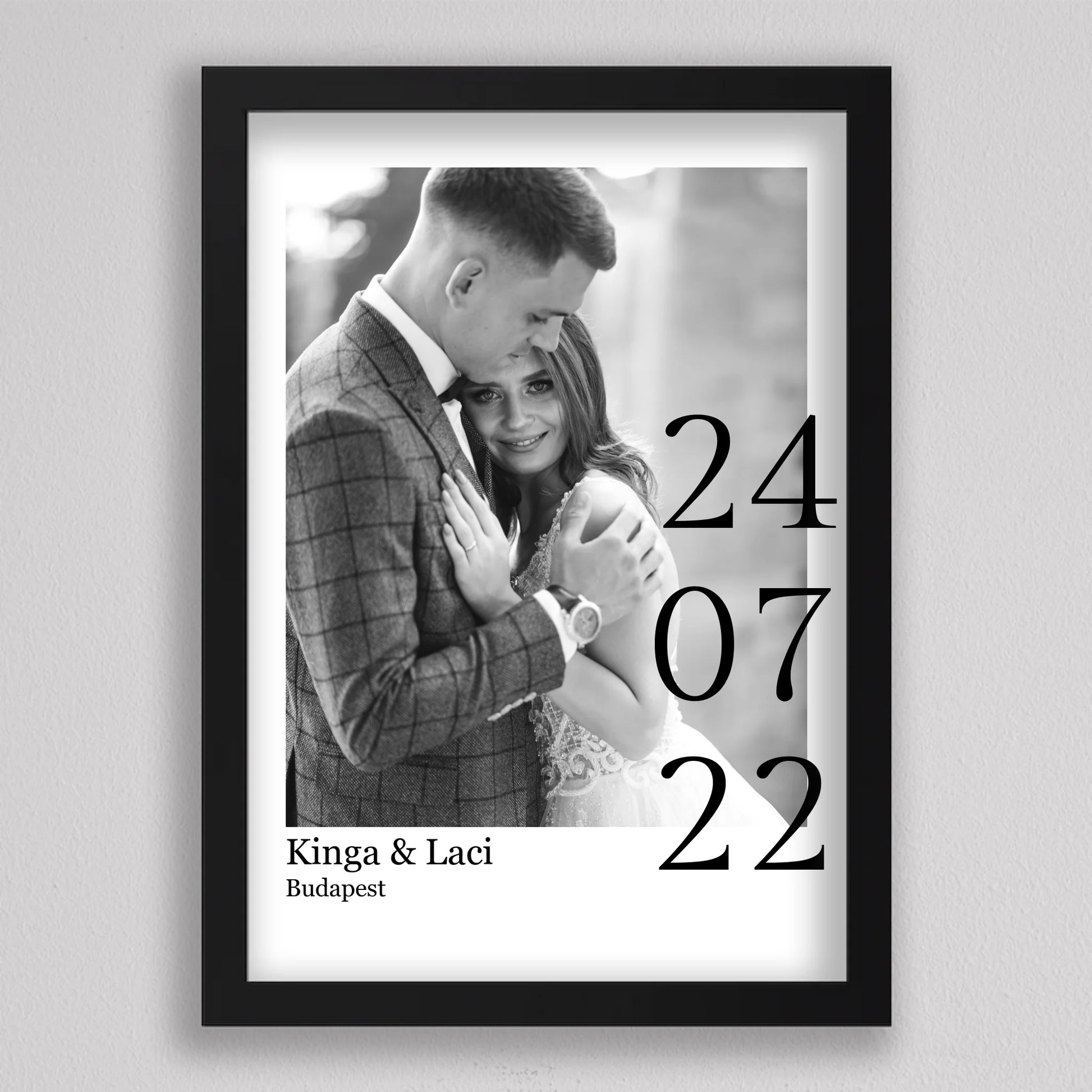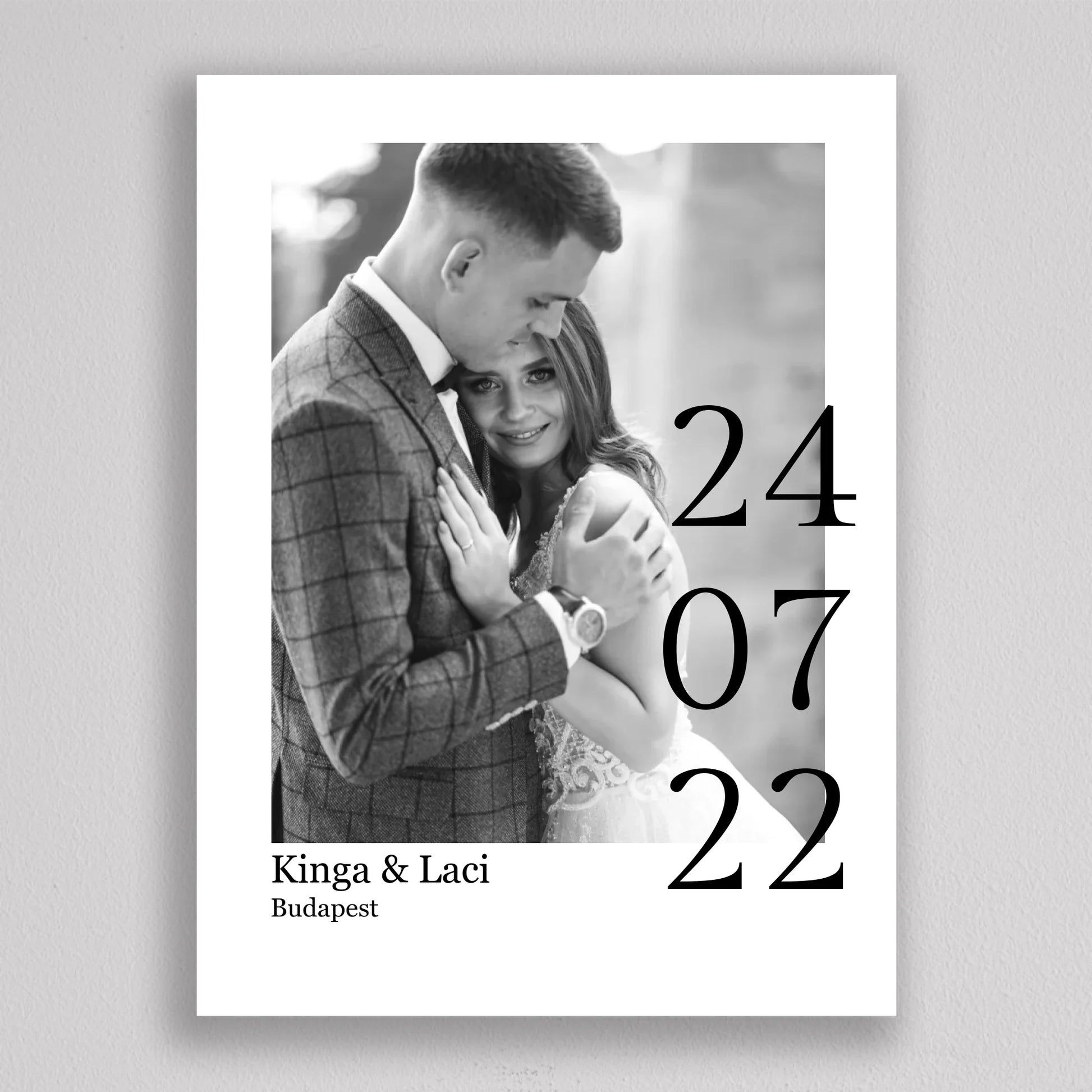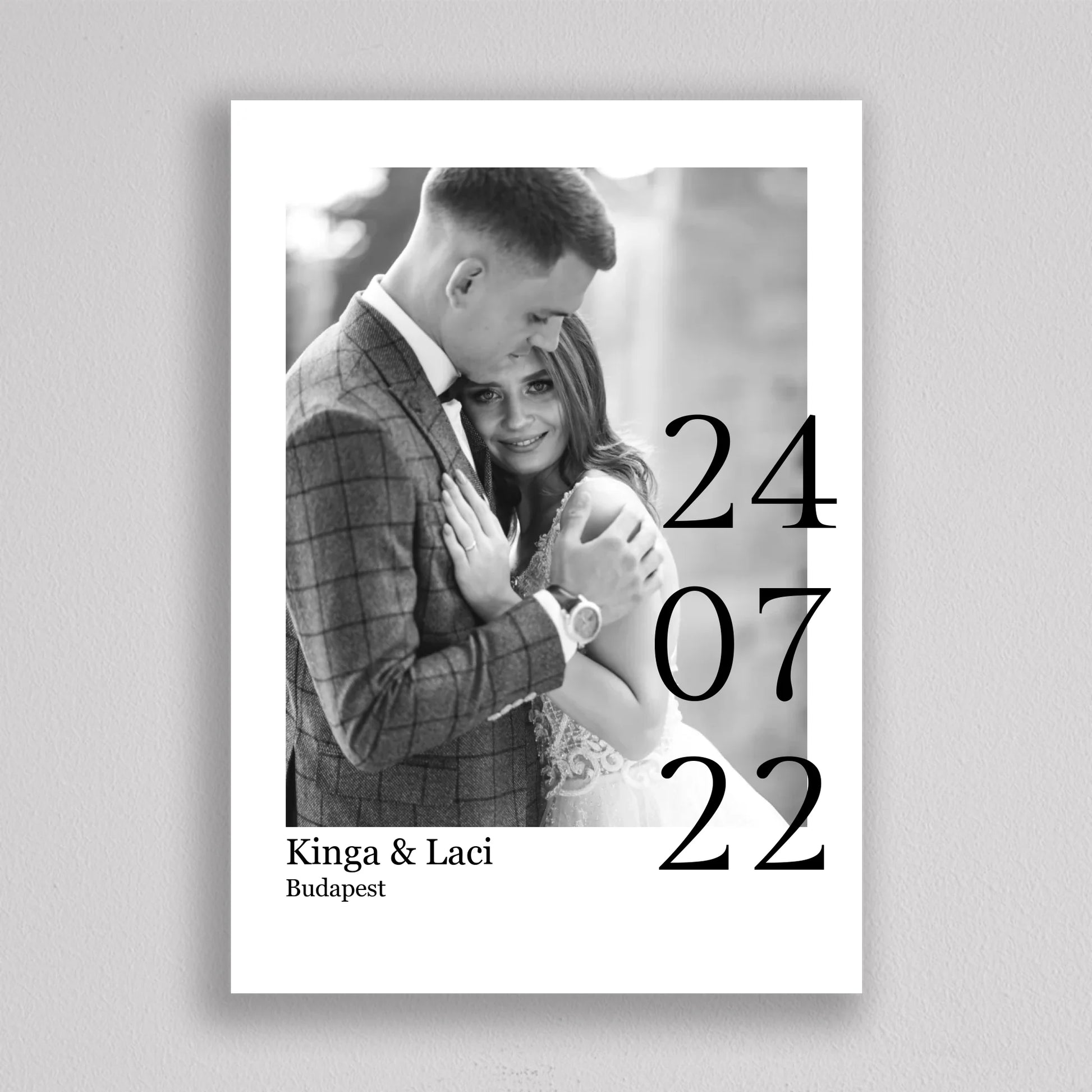 Örökítsd meg életed egyik legszebb napját stílusos és személyre szabott falikép formájában! Ez az elegáns, fekete-fehér dizájnú esküvői emlékőrző kép tökéletes ajándék lehet házastársadnak évfordulóra, vagy meglepetésként egy friss házaspárnak. A kép különlegessége, hogy a saját fényképedet, neveteket, helyszínt és dátumot is feltüntetjük rajta – így válik igazán egyedivé és személyessé. A modern, minimalista tipográfia időtálló eleganciát kölcsönöz, ami bármilyen enteriőrben gyönyörűen mutat. Nagyfelbontású nyomtatásban, prémium minőségű papíron vagy akár keretezve is kérhető, így készen áll arra, hogy méltó helyet kapjon otthonotok falán. A szerelmetek történetét mostantól stílusosan is megőrizheted!