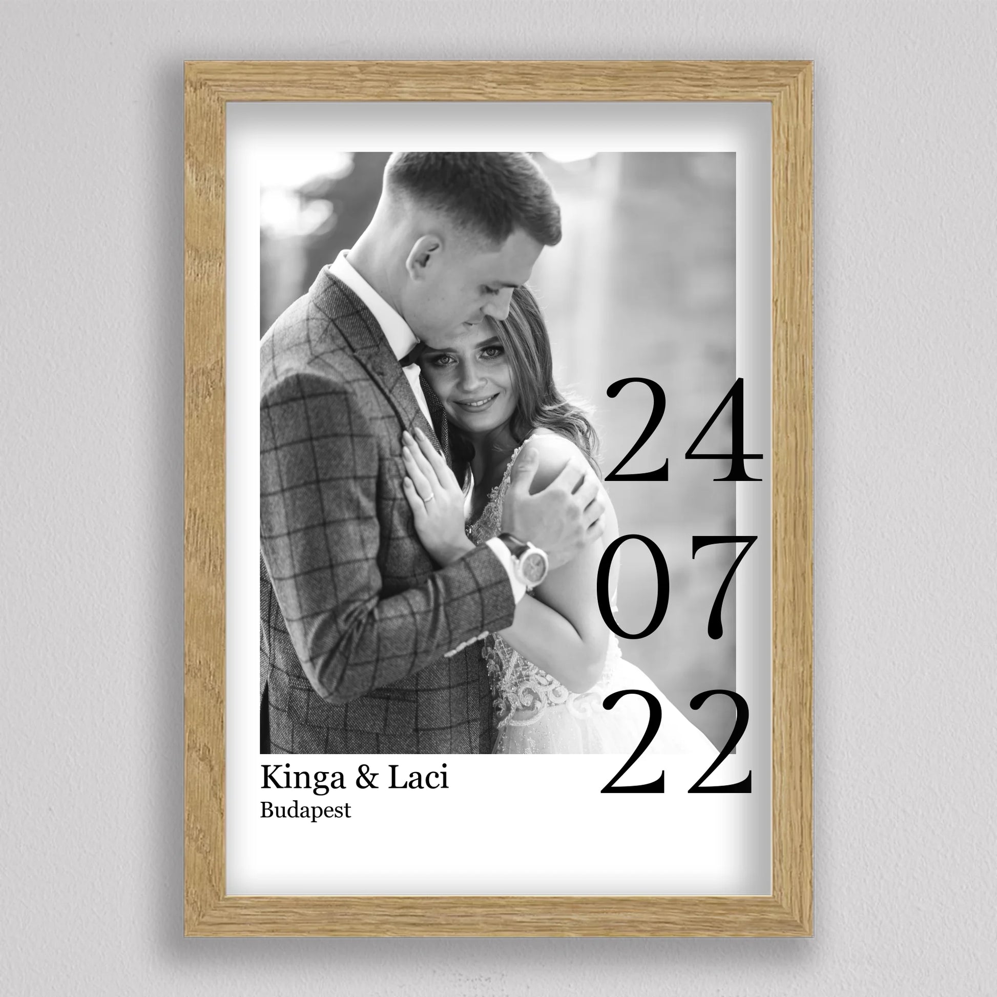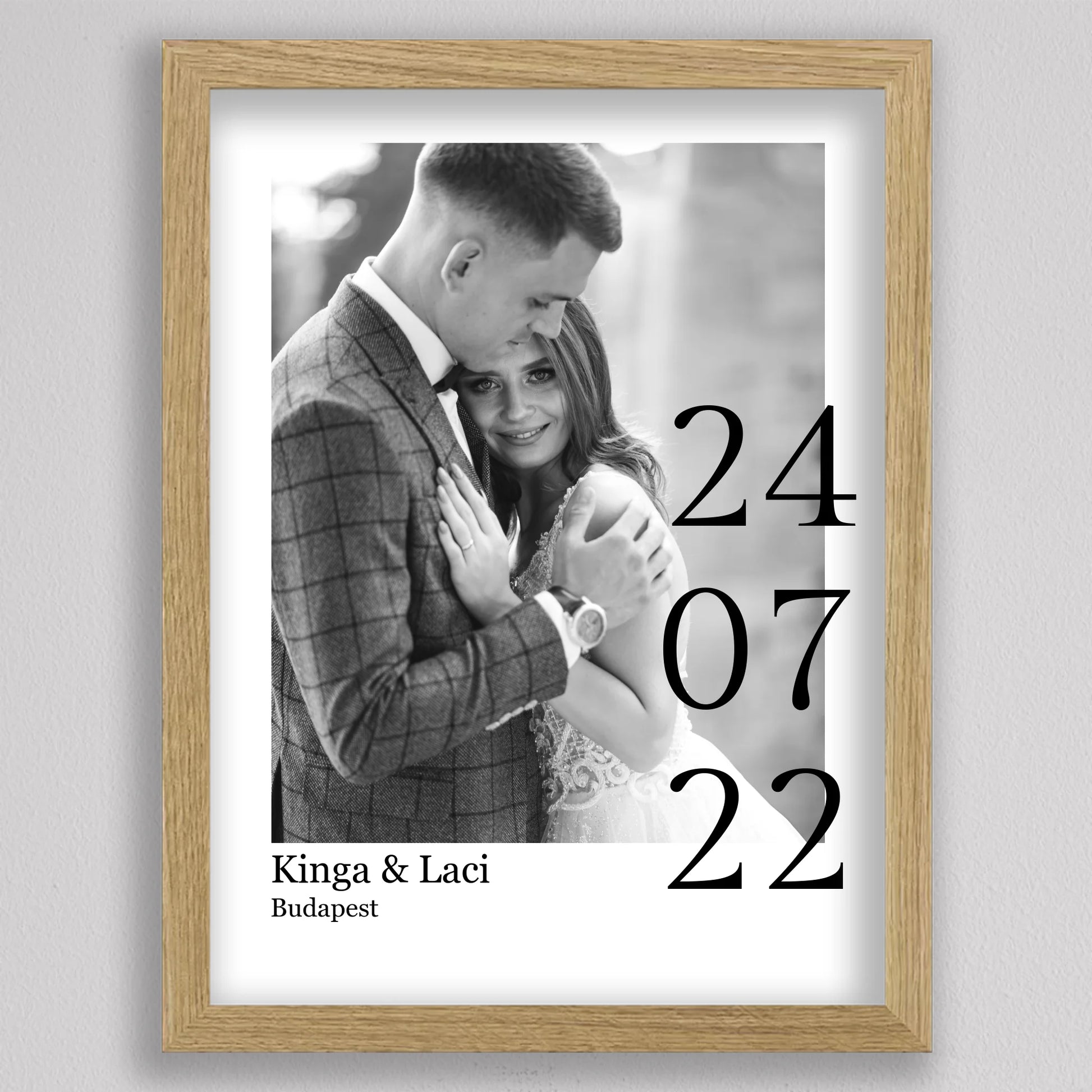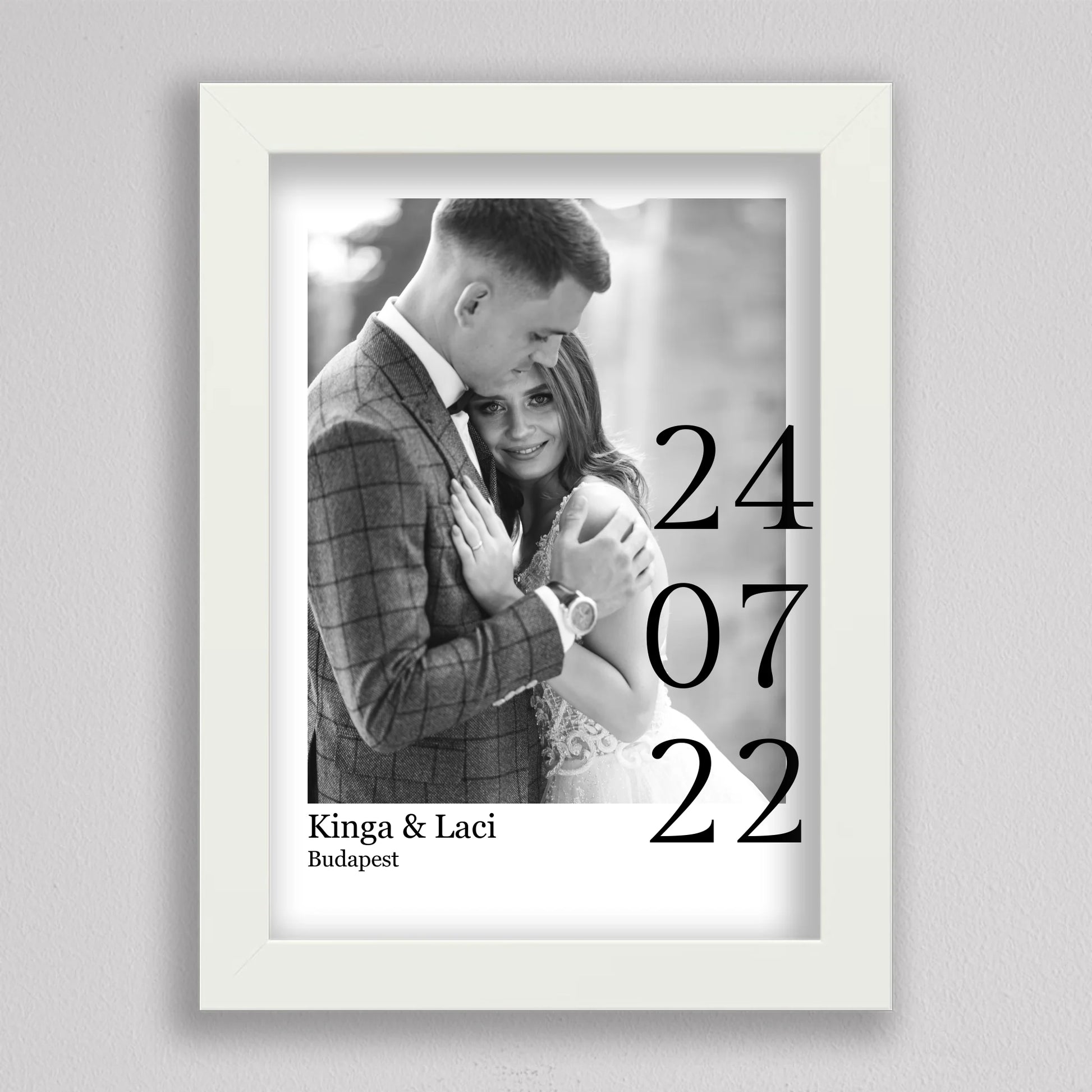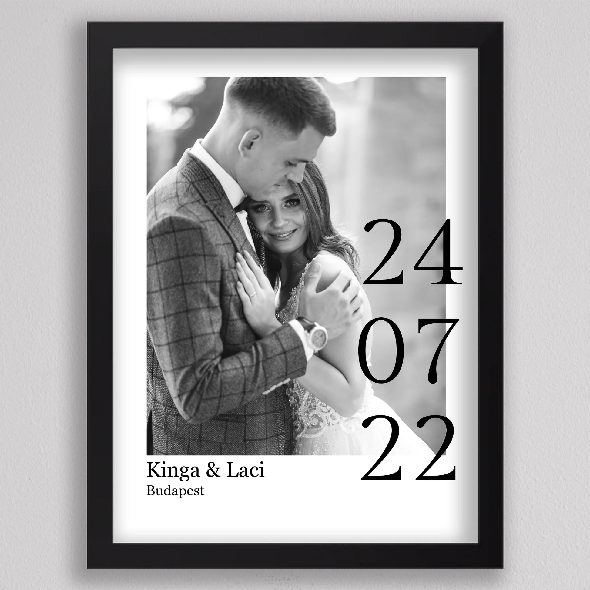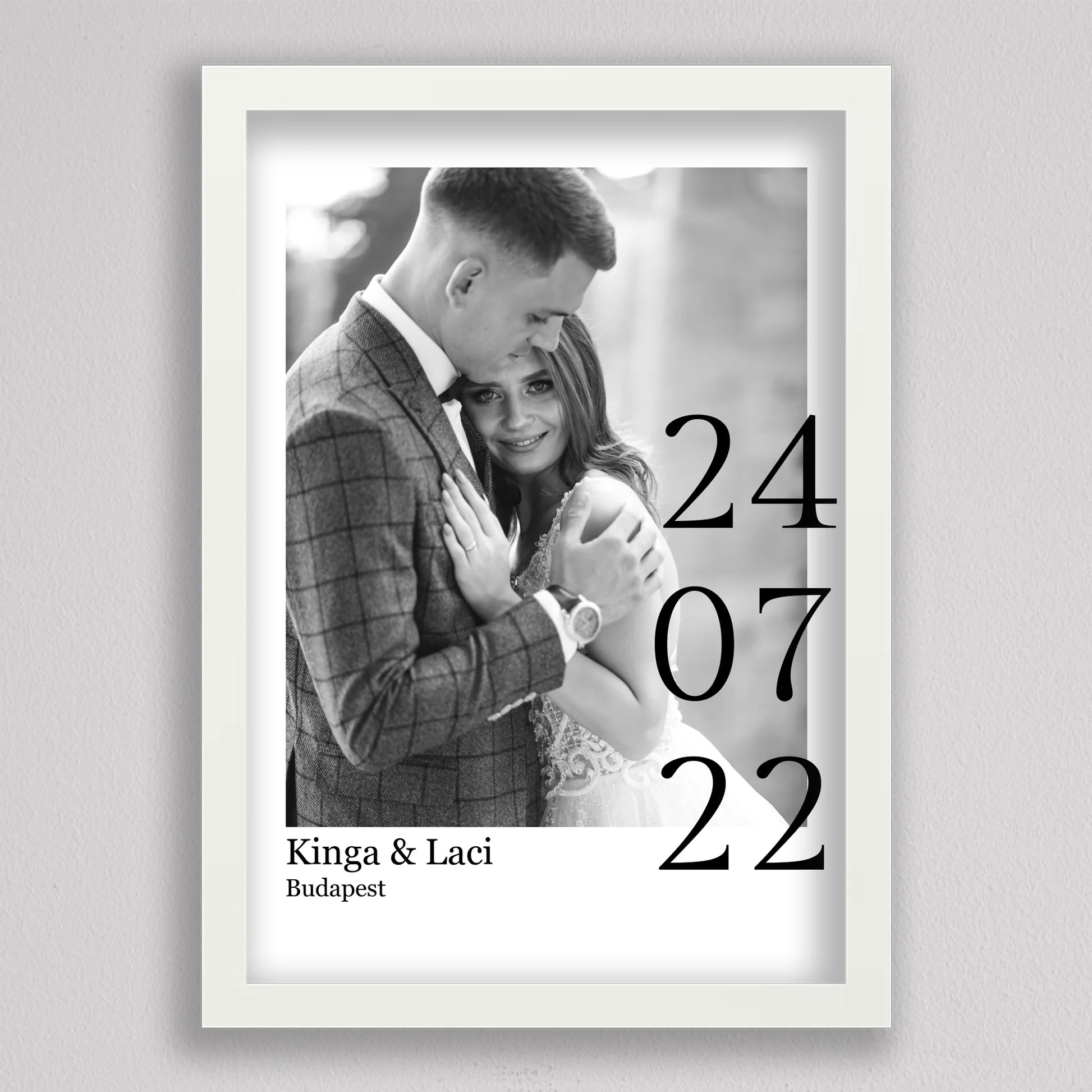 Örökítsd meg életed egyik legszebb napját stílusos és személyre szabott falikép formájában! Ez az elegáns, fekete-fehér dizájnú esküvői emlékőrző kép tökéletes ajándék lehet házastársadnak évfordulóra, vagy meglepetésként egy friss házaspárnak. A kép különlegessége, hogy a saját fényképedet, neveteket, helyszínt és dátumot is feltüntetjük rajta – így válik igazán egyedivé és személyessé. A modern, minimalista tipográfia időtálló eleganciát kölcsönöz, ami bármilyen enteriőrben gyönyörűen mutat. Nagyfelbontású nyomtatásban, prémium minőségű papíron vagy akár keretezve is kérhető, így készen áll arra, hogy méltó helyet kapjon otthonotok falán. A szerelmetek történetét mostantól stílusosan is megőrizheted!
