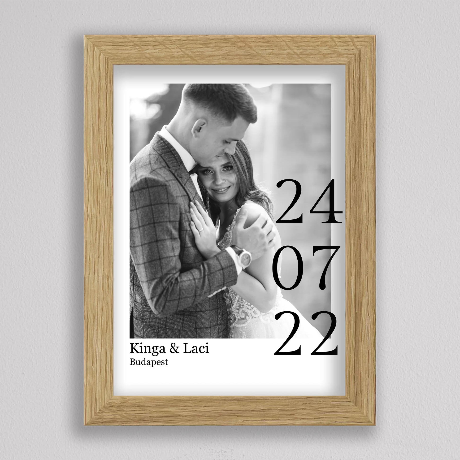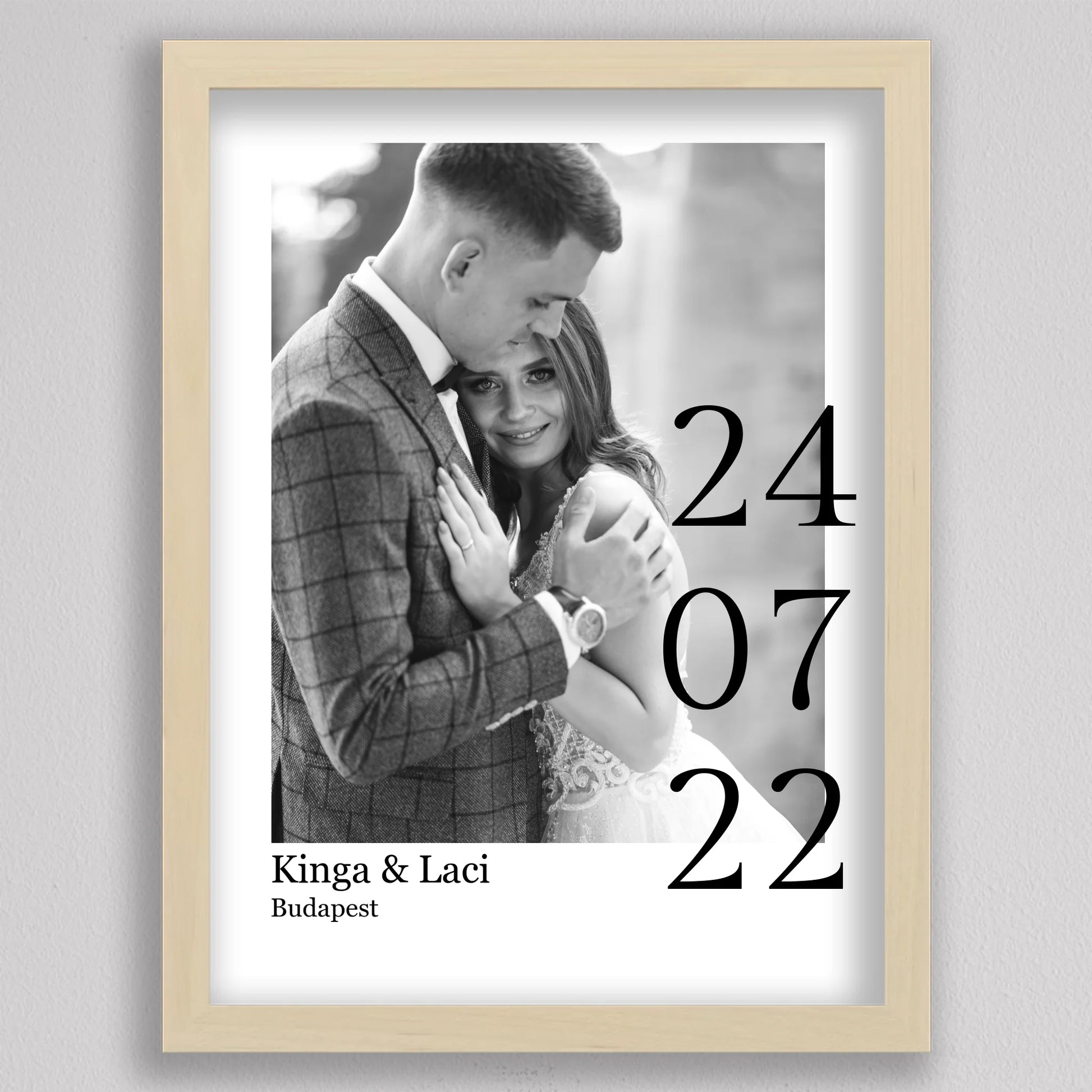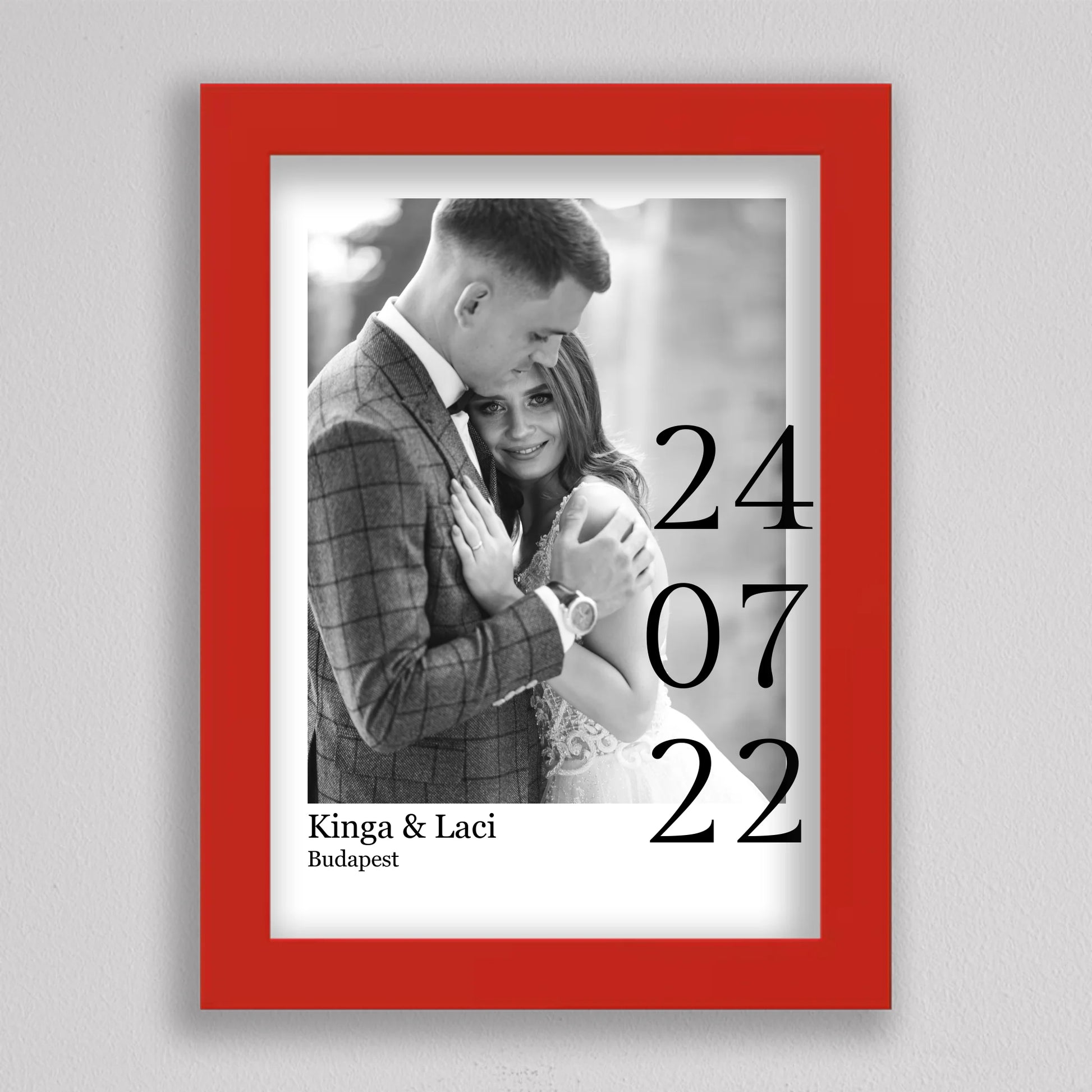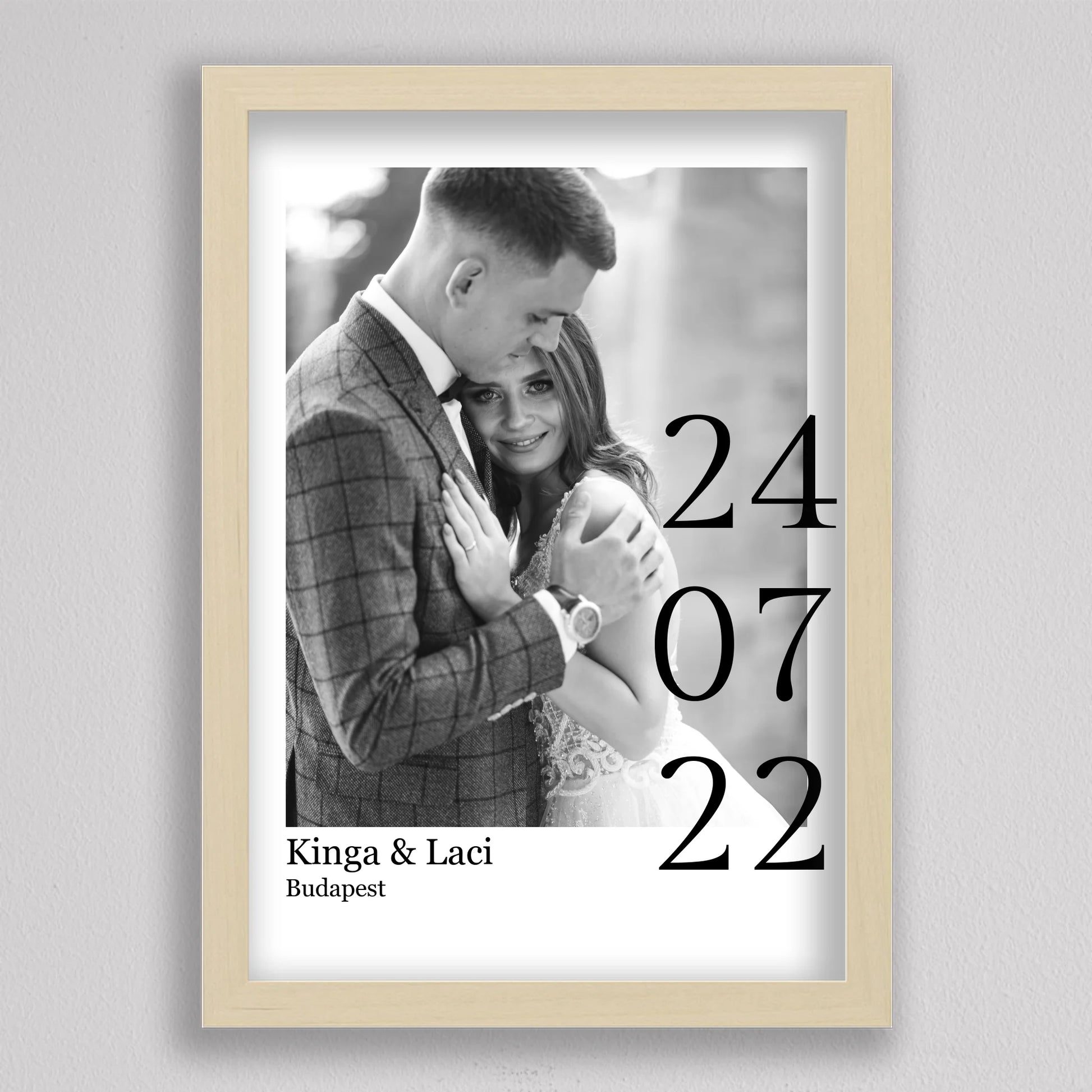 Örökítsd meg életed egyik legszebb napját stílusos és személyre szabott falikép formájában! Ez az elegáns, fekete-fehér dizájnú esküvői emlékőrző kép tökéletes ajándék lehet házastársadnak évfordulóra, vagy meglepetésként egy friss házaspárnak. A kép különlegessége, hogy a saját fényképedet, neveteket, helyszínt és dátumot is feltüntetjük rajta – így válik igazán egyedivé és személyessé. A modern, minimalista tipográfia időtálló eleganciát kölcsönöz, ami bármilyen enteriőrben gyönyörűen mutat. Nagyfelbontású nyomtatásban, prémium minőségű papíron vagy akár keretezve is kérhető, így készen áll arra, hogy méltó helyet kapjon otthonotok falán. A szerelmetek történetét mostantól stílusosan is megőrizheted!