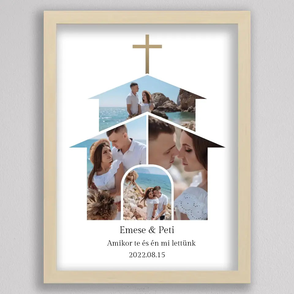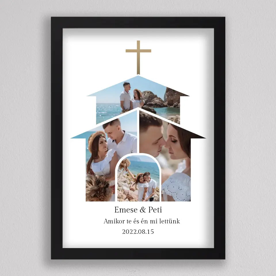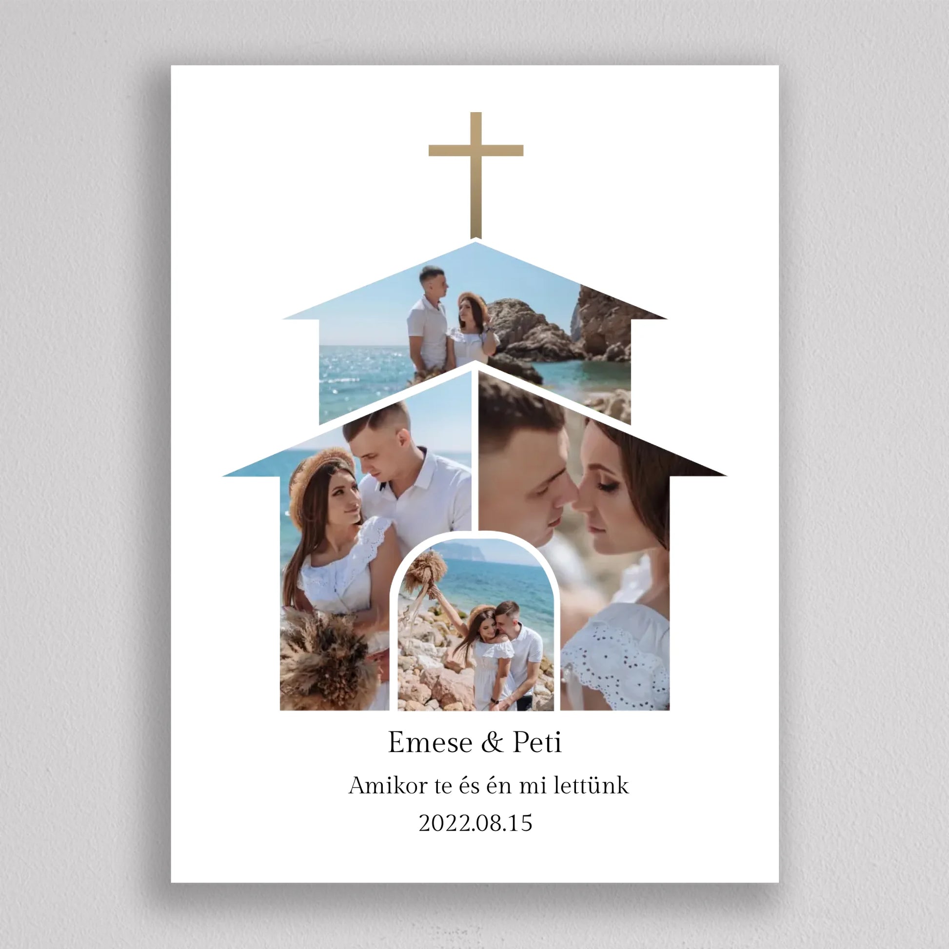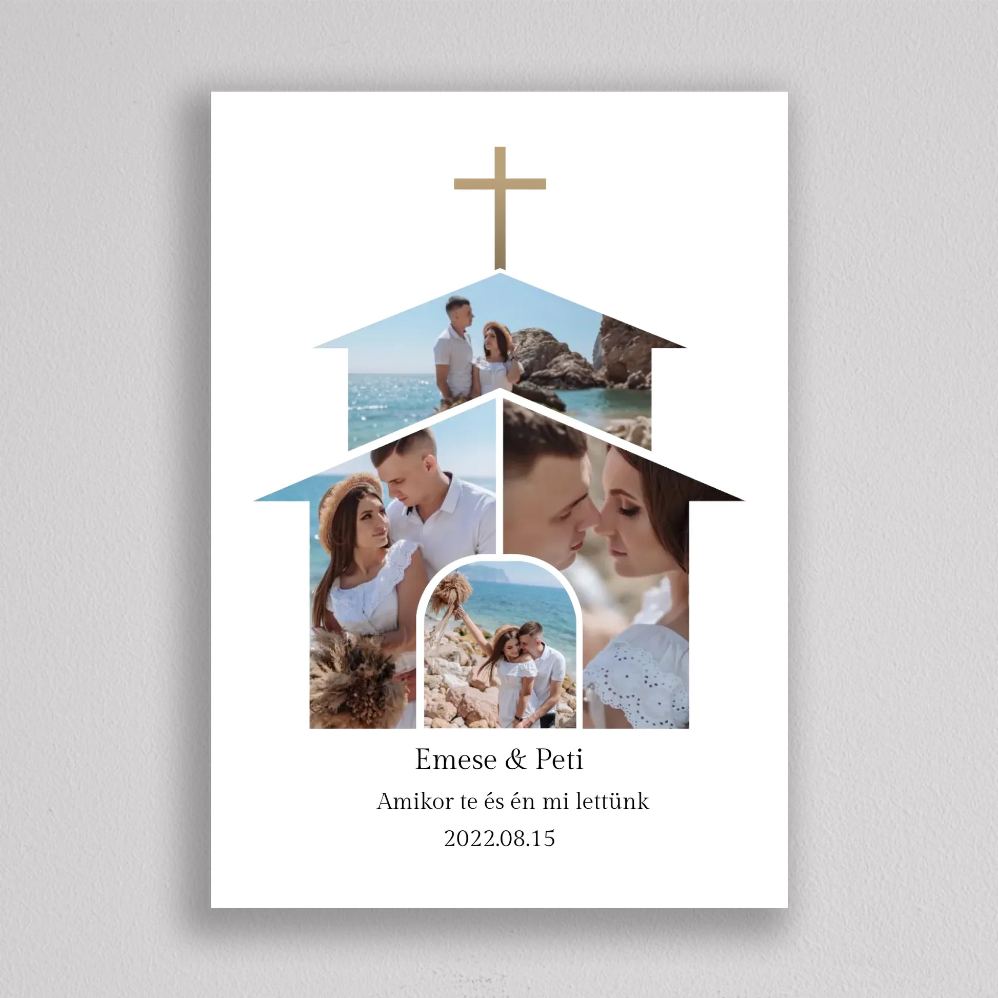Az Örök Igen Esküvőre ajándék fotó kollázs egyedi módon örökíti meg az esküvőtök legfontosabb pillanatait, egy olyan formatervben, amely a szentség és a szerelem helyét szimbolizálja. Ez a kollázs tökéletes ajándék a nászajándéként vagy a házastársatok számára, amelyet egyedi fényképekkel és személyre szabott szövegekkel alakíthattok ki. A templom sziluettje köré rendezett fotók harmonikus egységet alkotnak, amelyek az esküvői napotok meghitt és boldog pillanatait idézik fel. A kollázs teljes mértékben testreszabható, így minden egyes alkotás garantáltan egyedülálló, és hosszan tartó emlék marad.