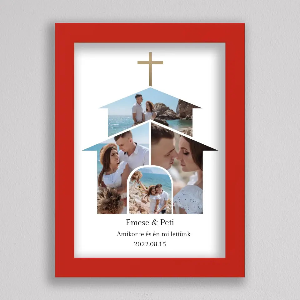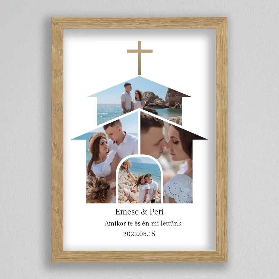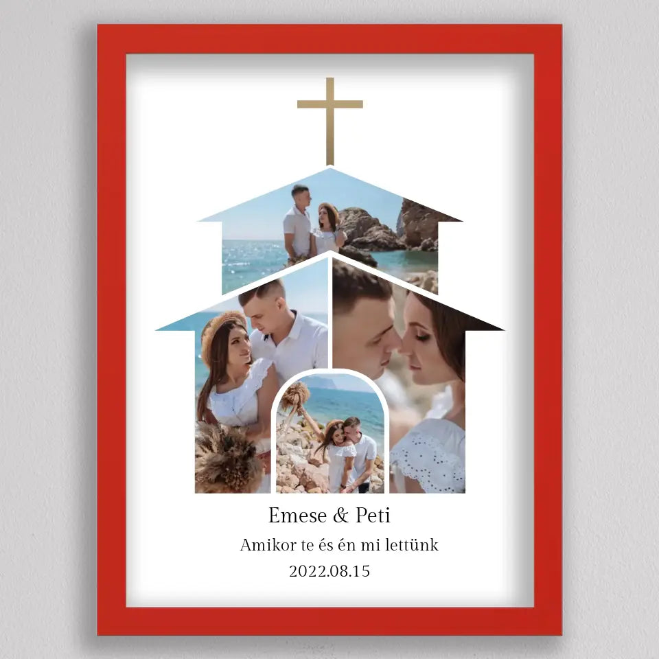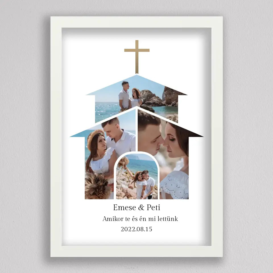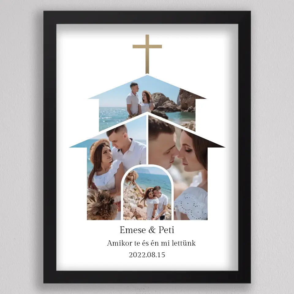 Az Örök Igen Esküvőre ajándék fotó kollázs egyedi módon örökíti meg az esküvőtök legfontosabb pillanatait, egy olyan formatervben, amely a szentség és a szerelem helyét szimbolizálja. Ez a kollázs tökéletes ajándék a nászajándéként vagy a házastársatok számára, amelyet egyedi fényképekkel és személyre szabott szövegekkel alakíthattok ki. A templom sziluettje köré rendezett fotók harmonikus egységet alkotnak, amelyek az esküvői napotok meghitt és boldog pillanatait idézik fel. A kollázs teljes mértékben testreszabható, így minden egyes alkotás garantáltan egyedülálló, és hosszan tartó emlék marad.